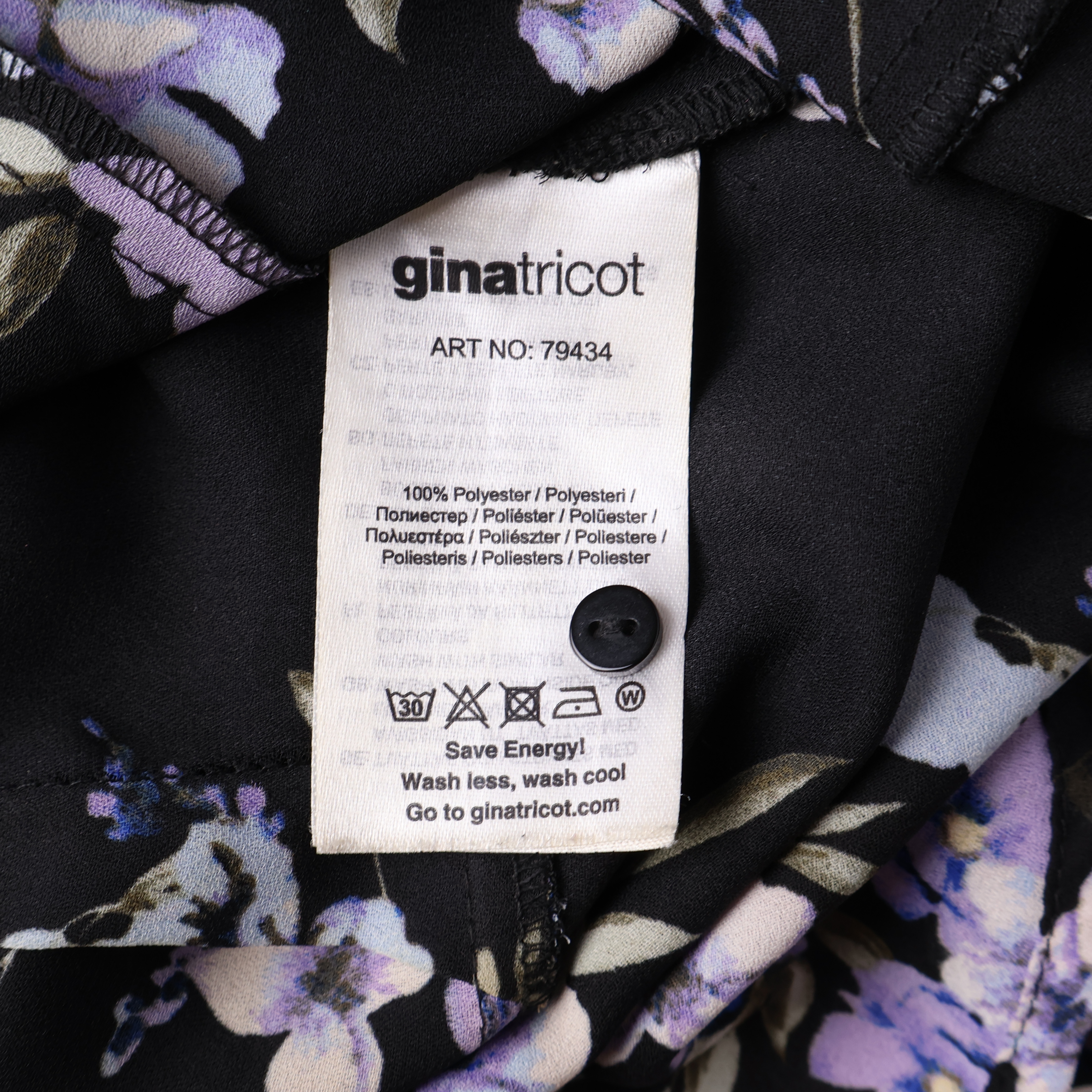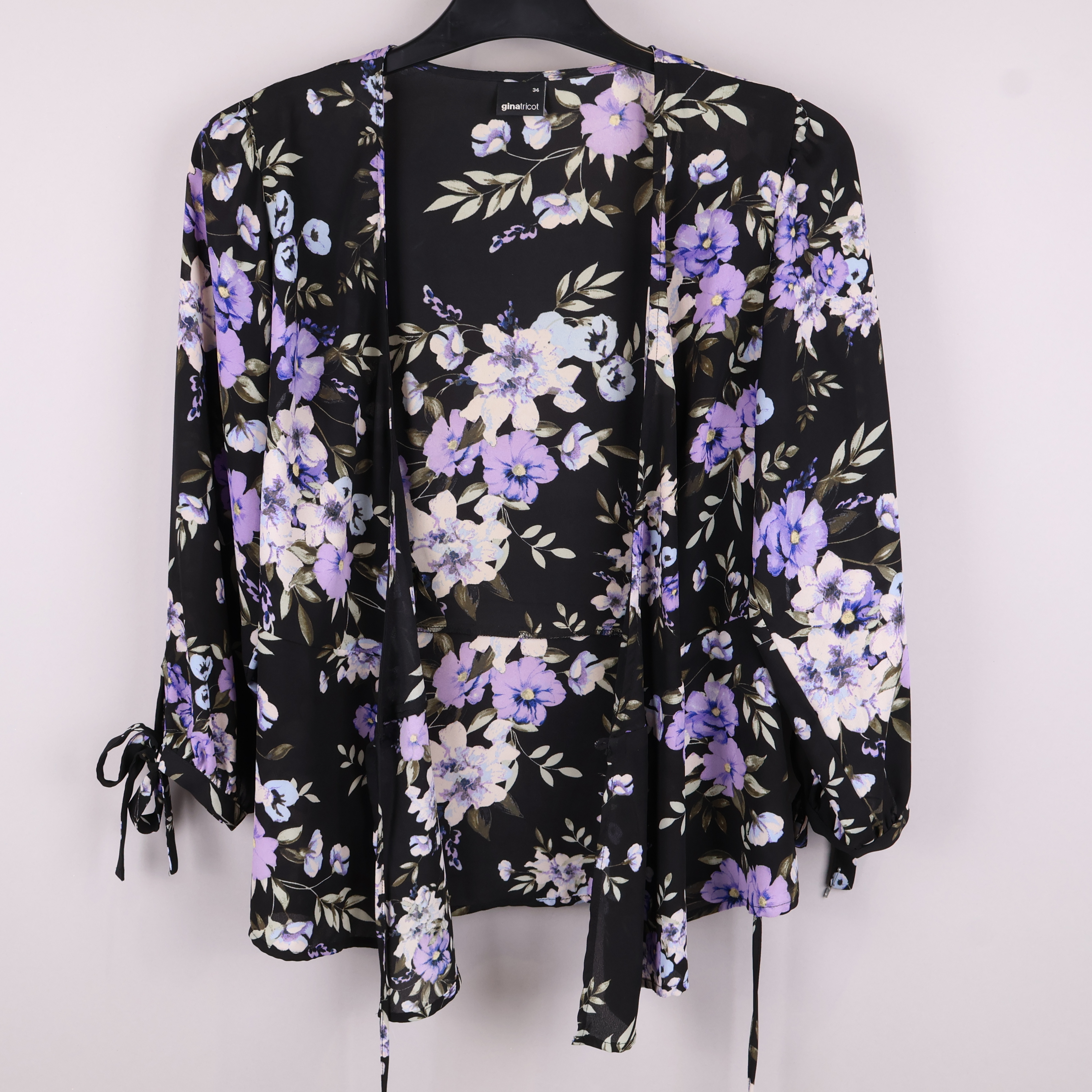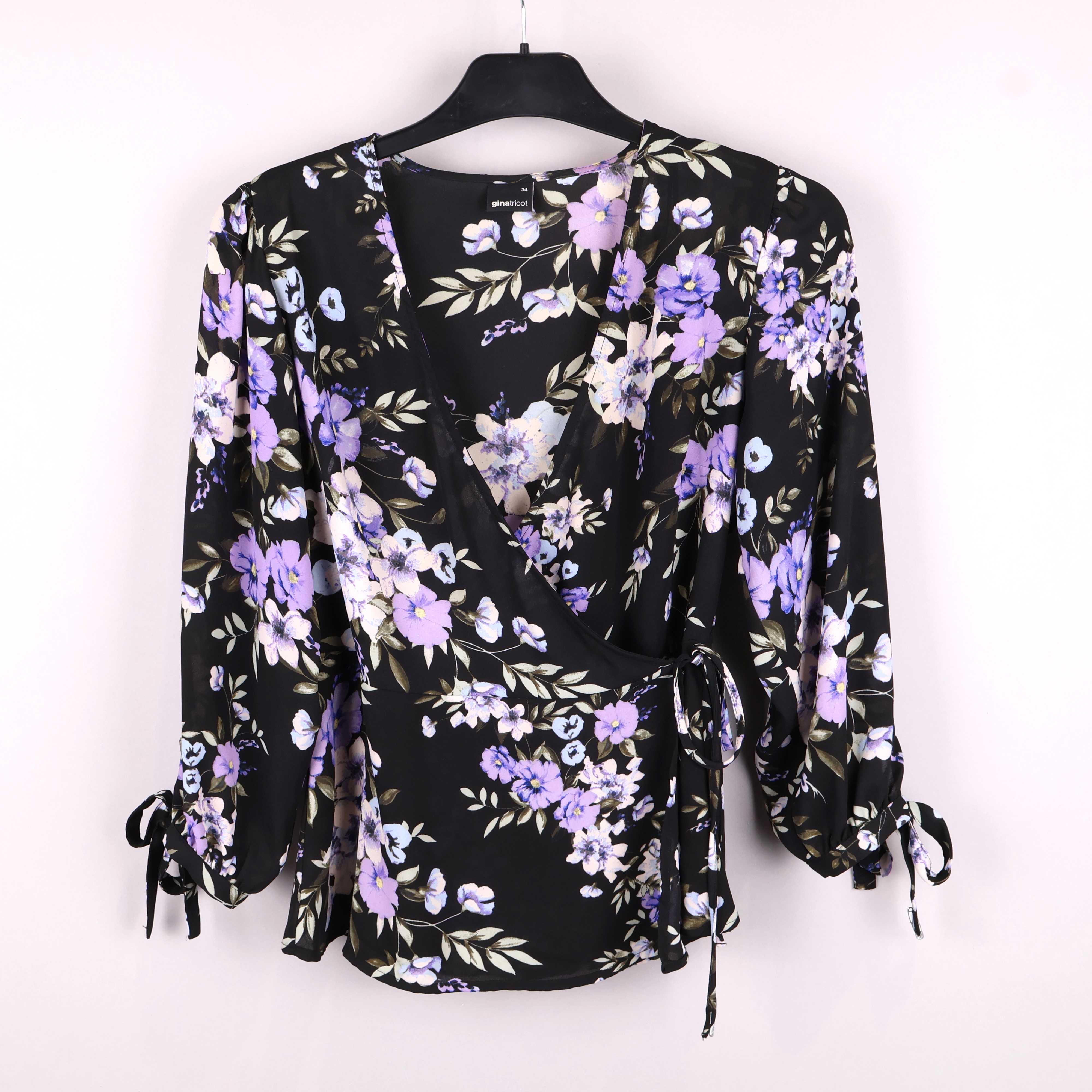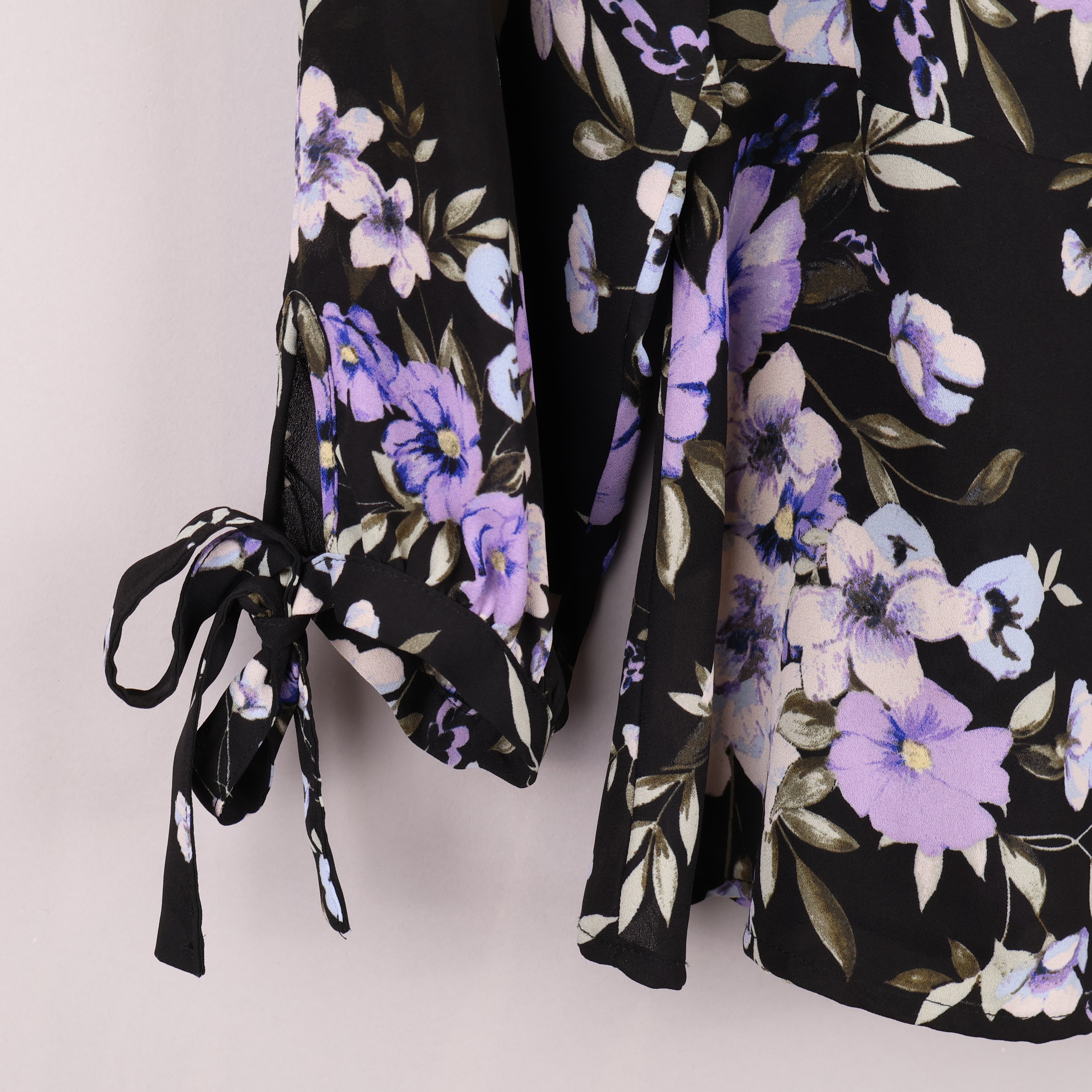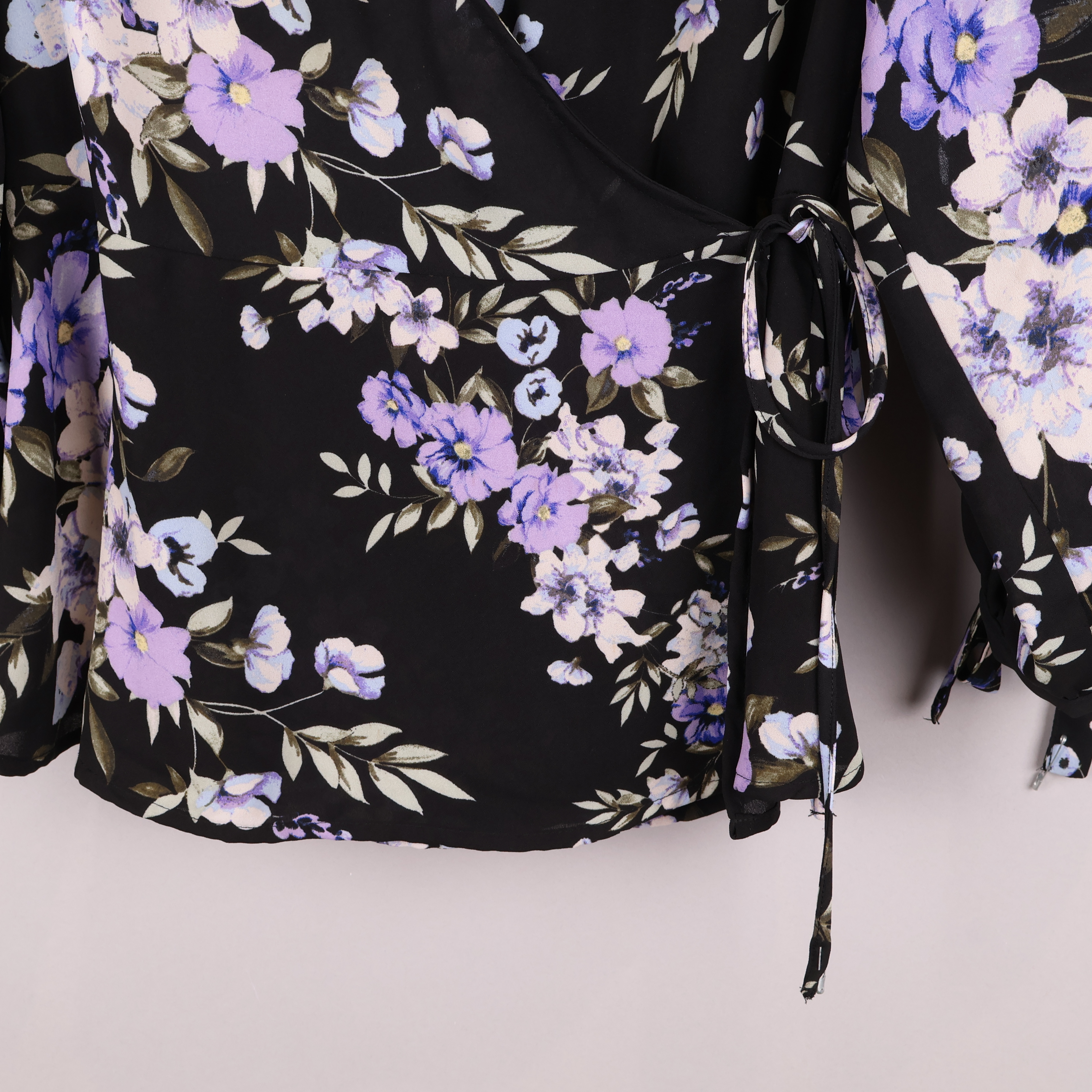 Elegant omlottblus med blommigt mönster i lila och vita nyanser mot en svart bakgrund. Den har knytbara detaljer vid ärmsluten för en justerbar passform och en omlottöppning fram som ger en smickrande silhuett.