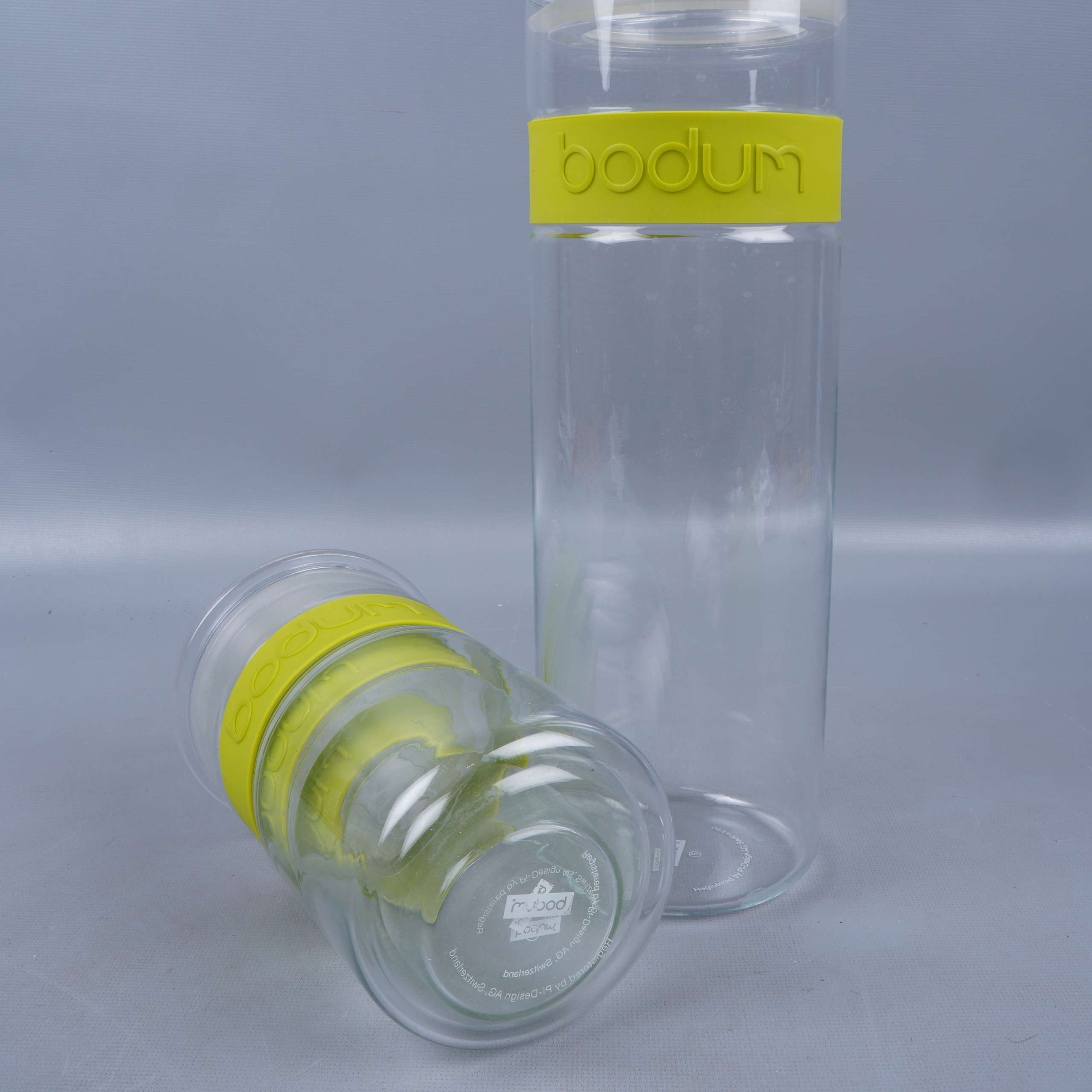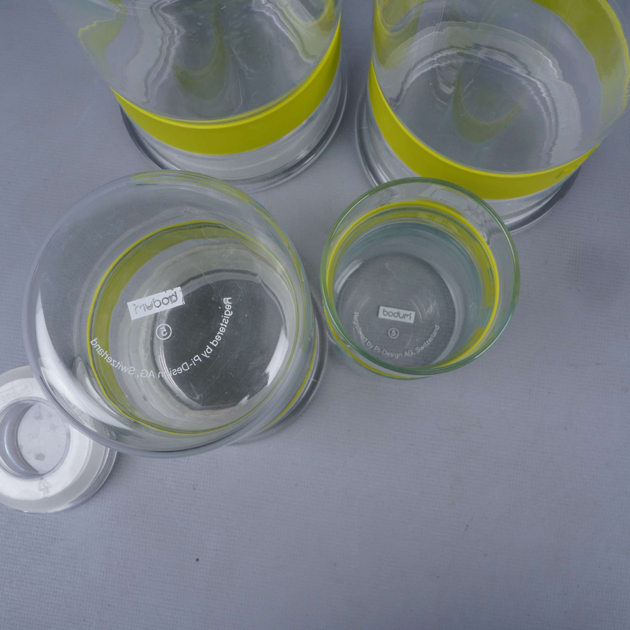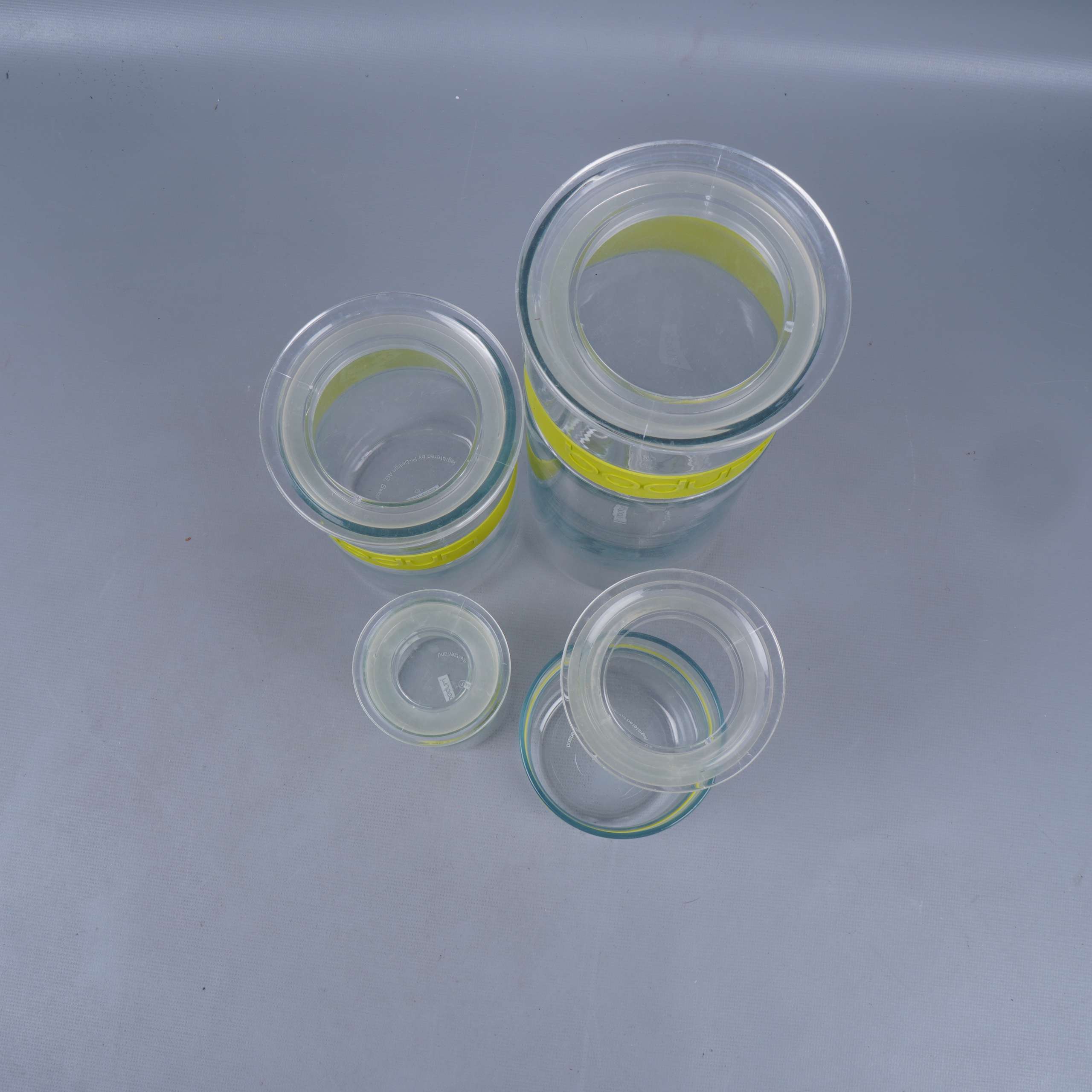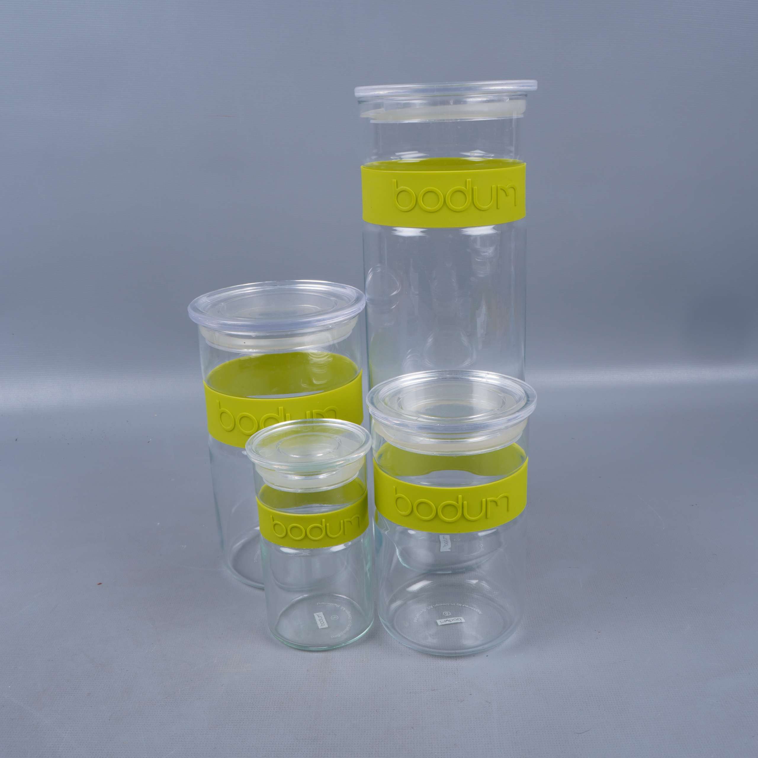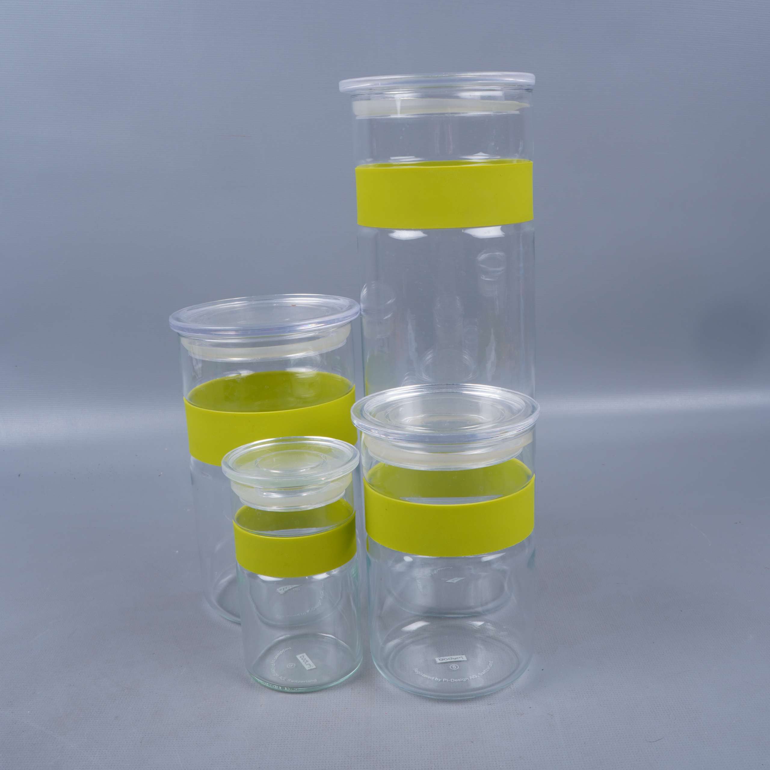 Set med fyra transparenta glasburkar med matchande gula silikonband från Bodum. Varje burk har en modern, stilren design med tydliga proportioner och praktiska lock som håller tätt. Perfekt för dig som gillar en enkel och clean look i köket.