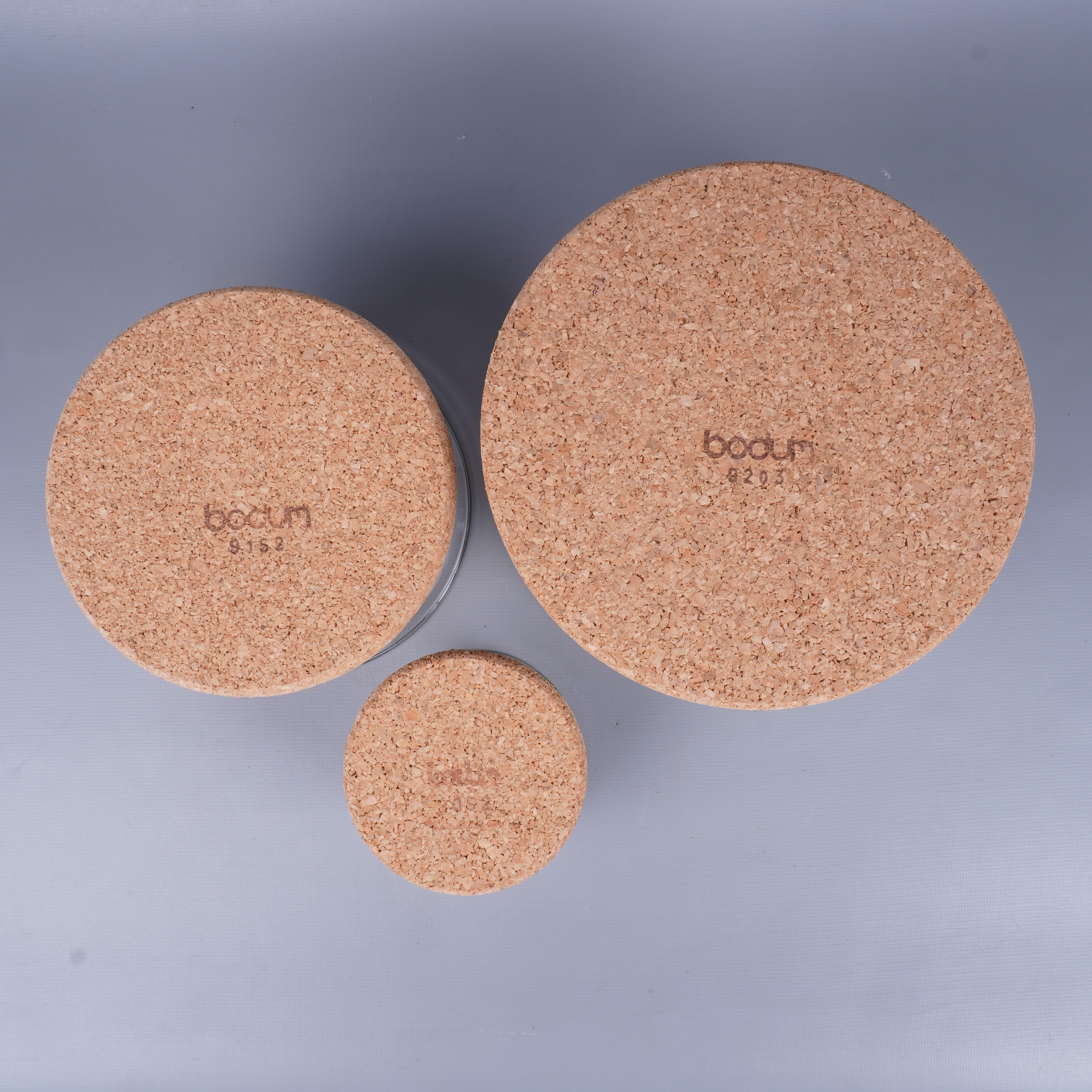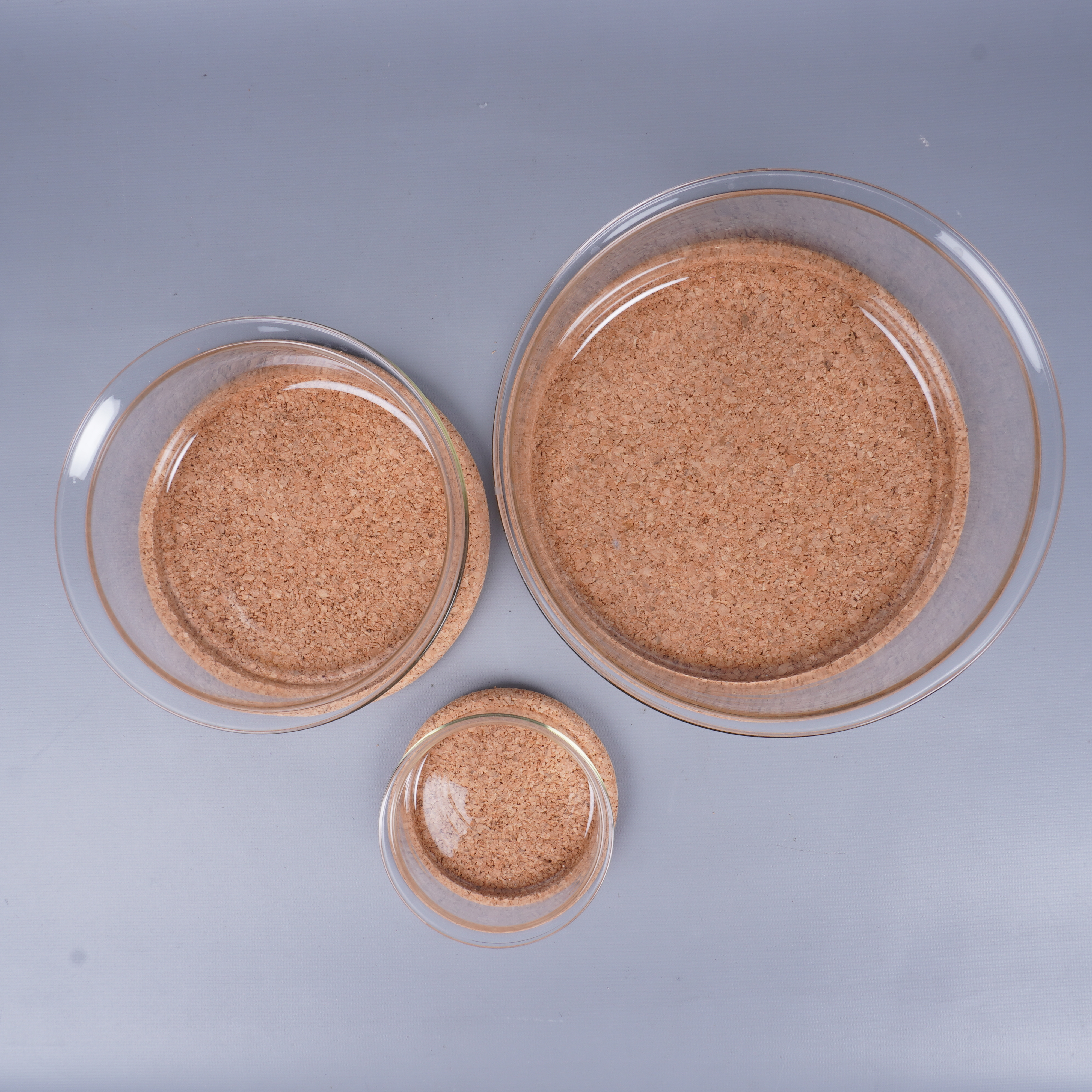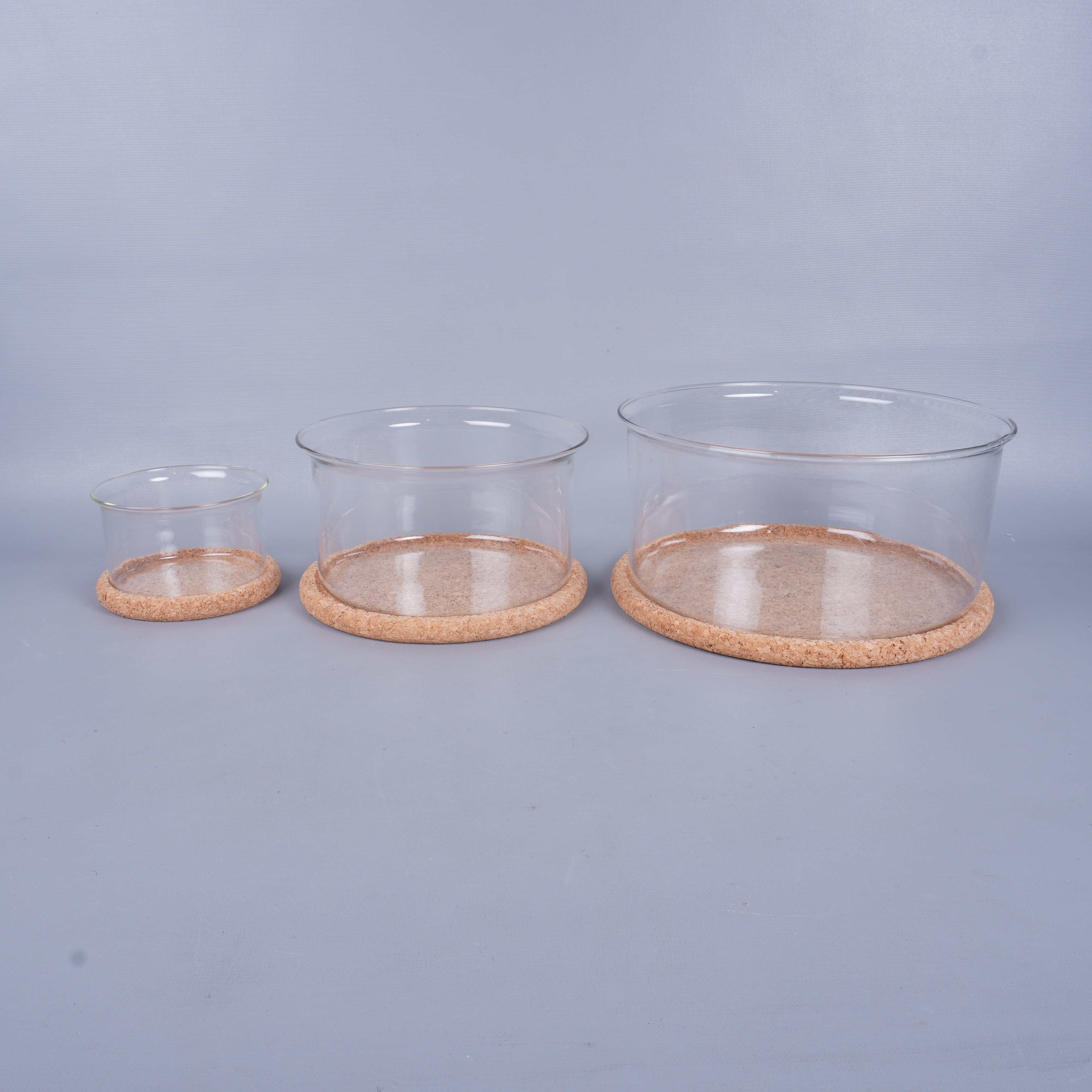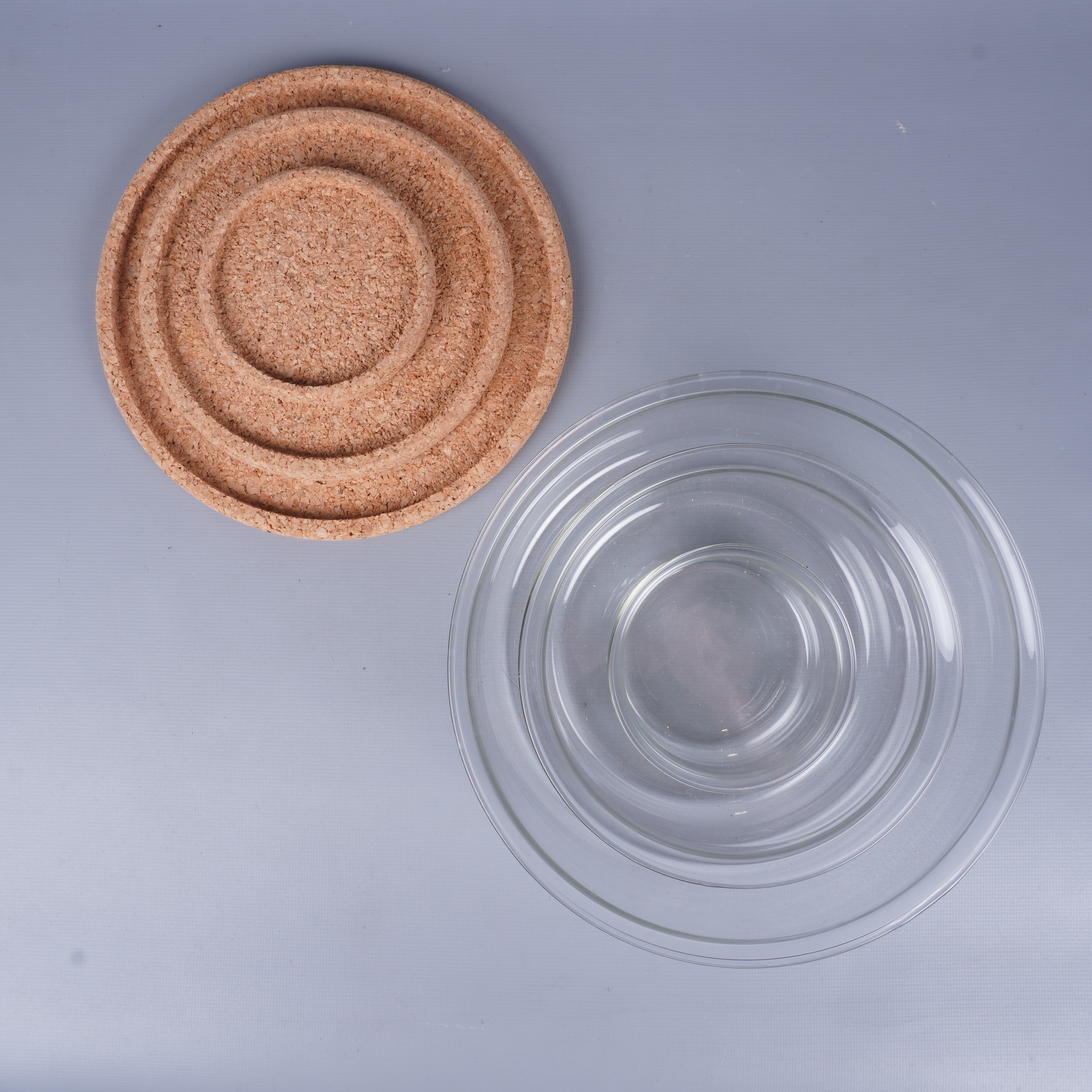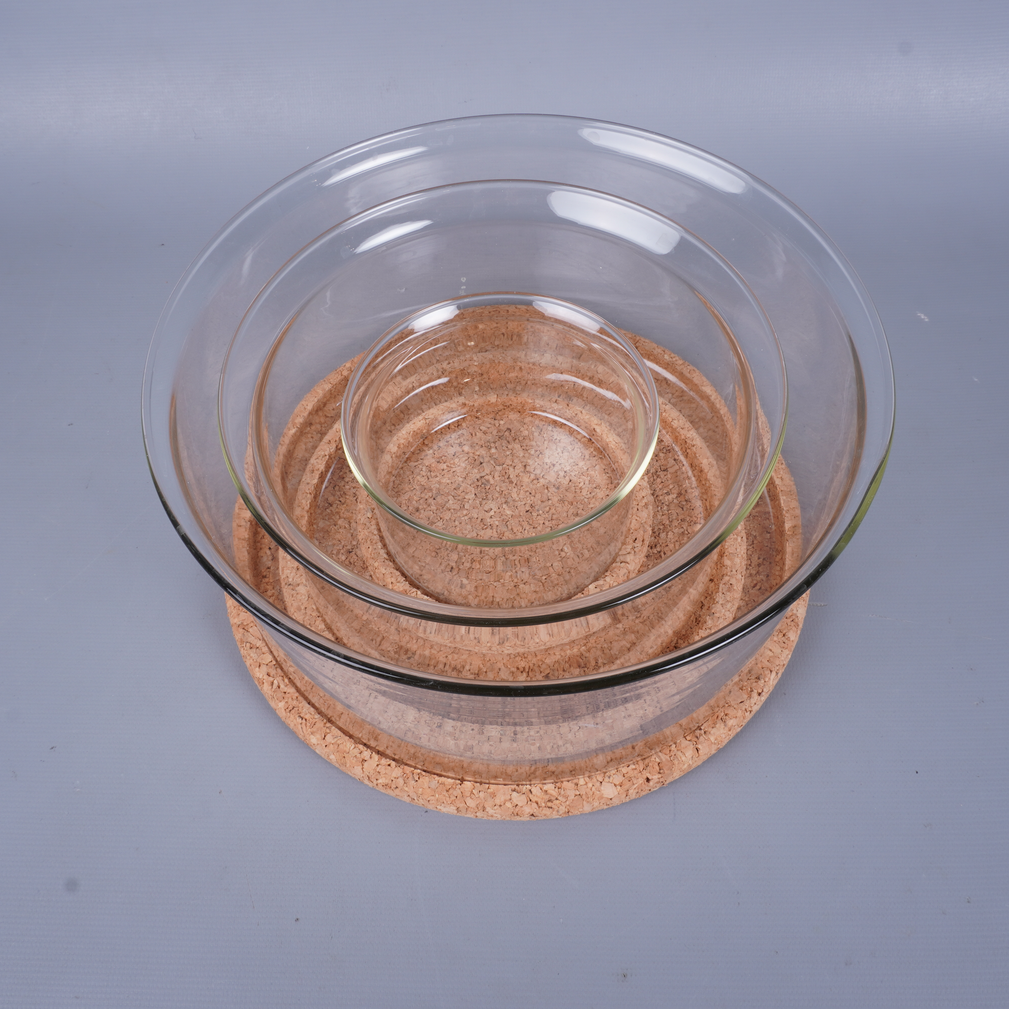 Ett praktiskt set med tre transparenta glasskålar i olika storlekar och tillhörande runda korkunderlägg. Den stilrena designen och den naturliga känslan från korkdetaljerna ger ett modernt intryck – perfekt för dig som gillar clean och funktionell stil.