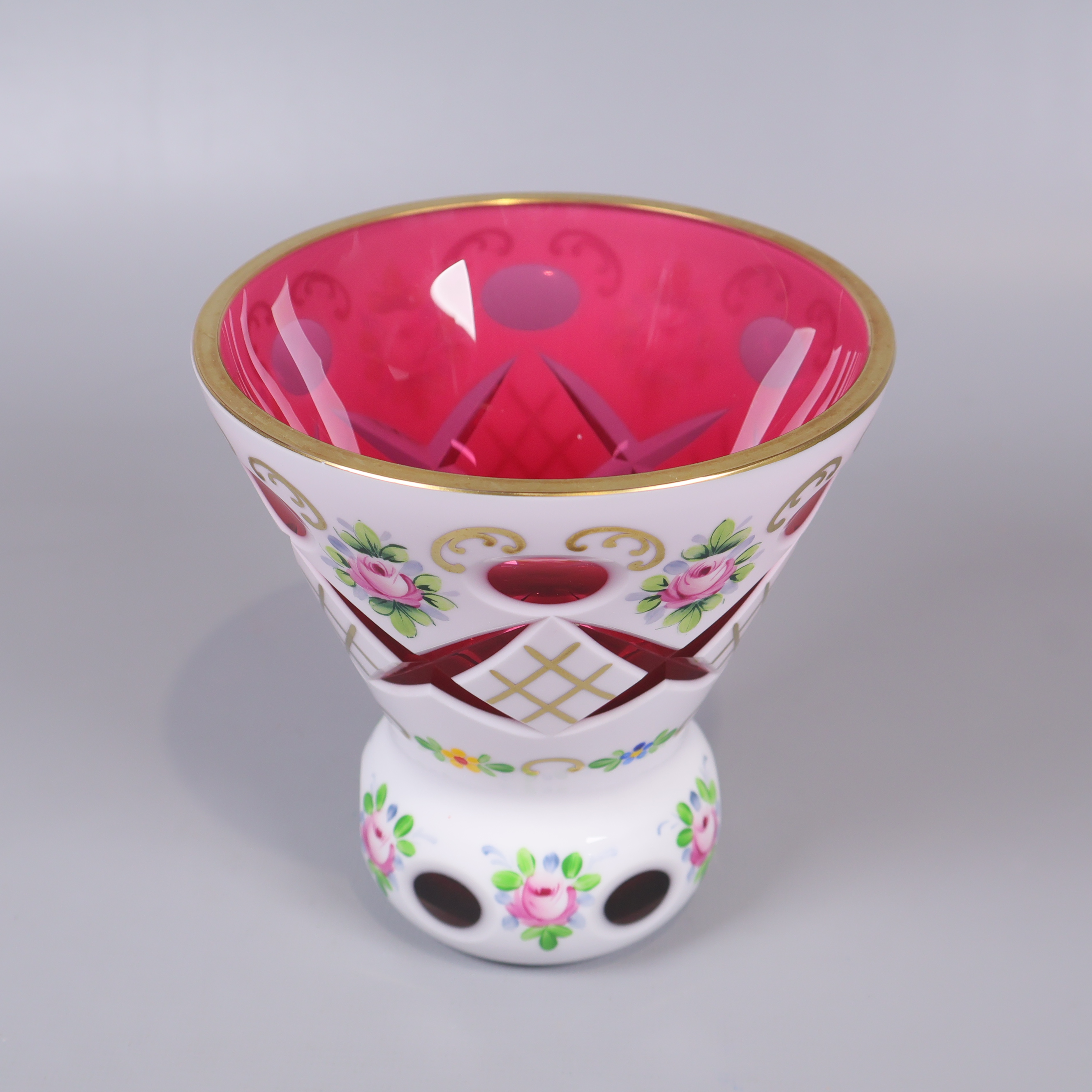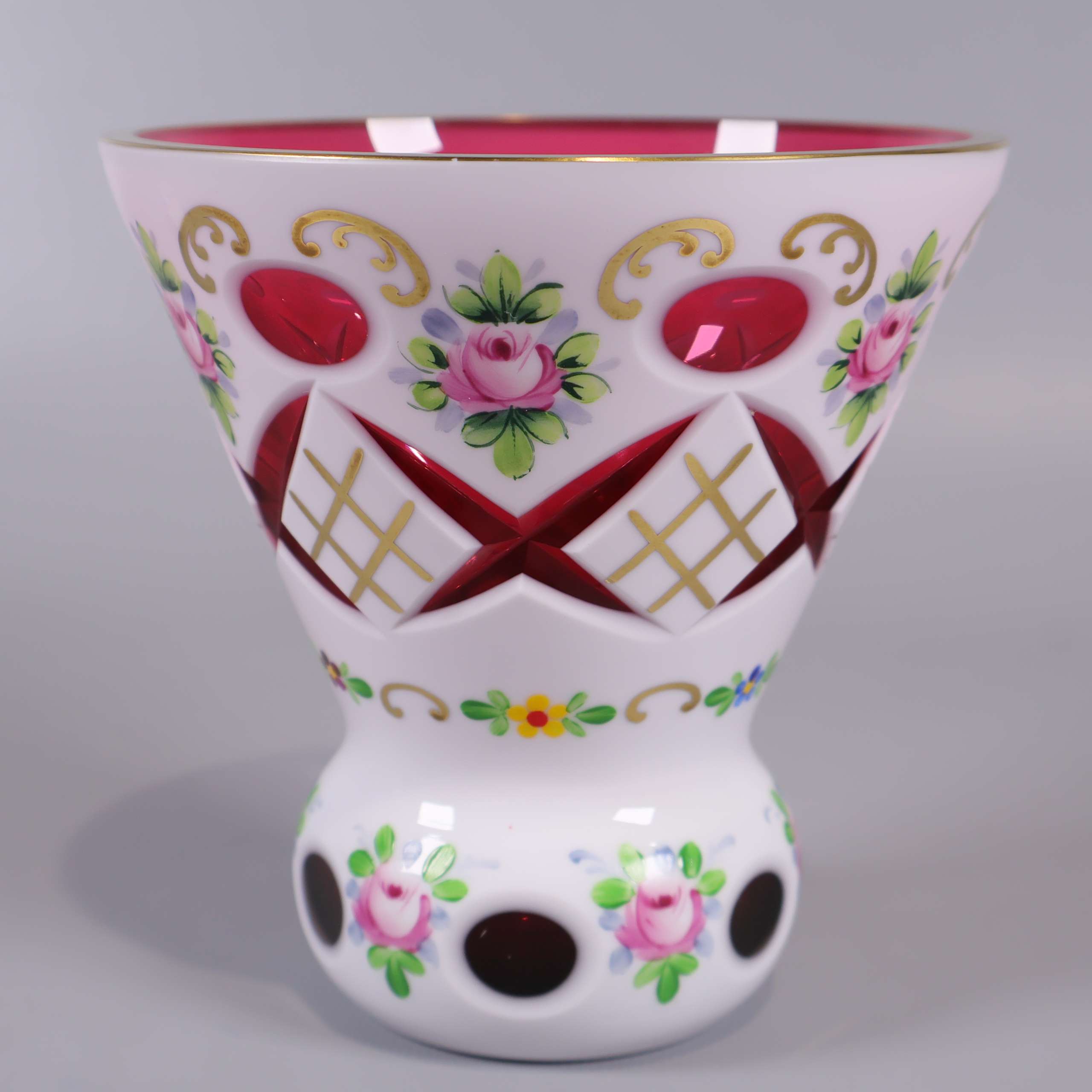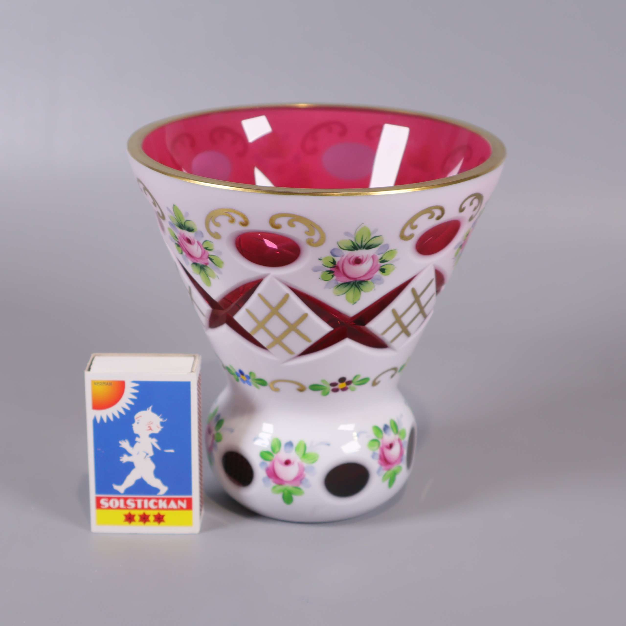 En lekfull och färgstark vas i glas med handmålat blommotiv, fina guldinslag och härlig kontrastrik design. Utsidan är dekorativt utskuren och insidan har en djup rosa ton som ger en unik känsla.