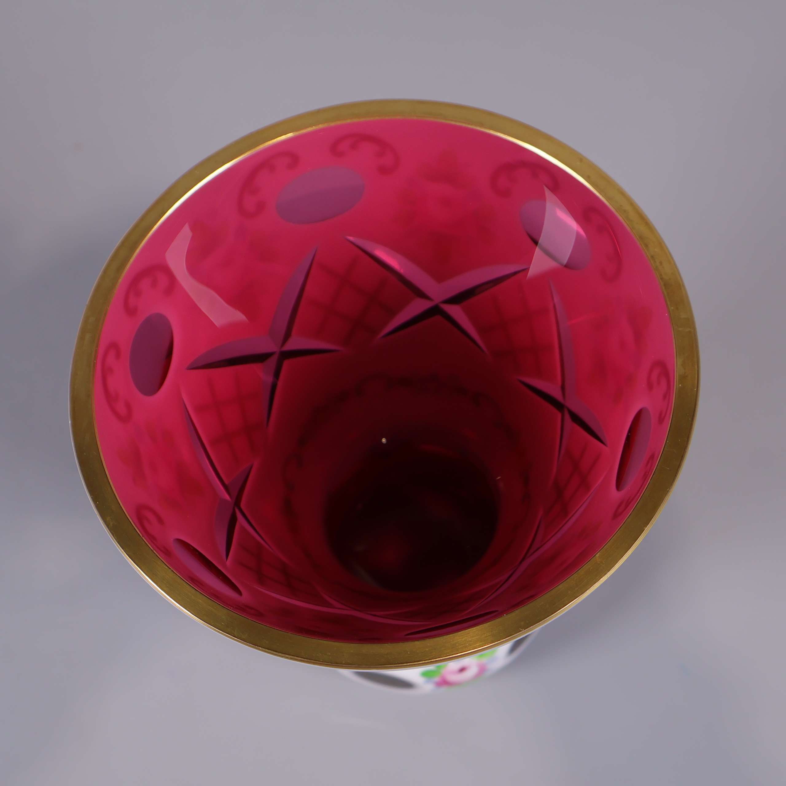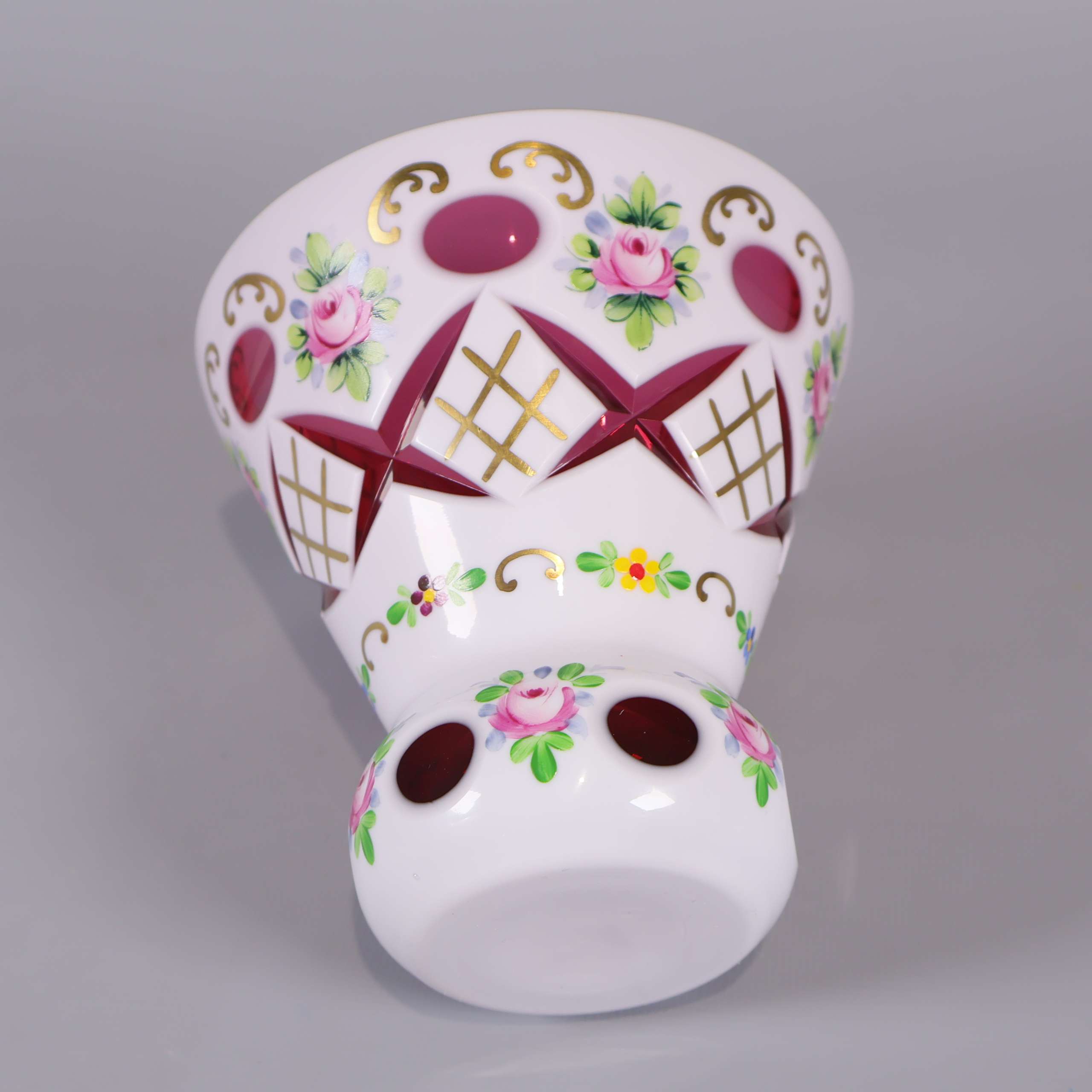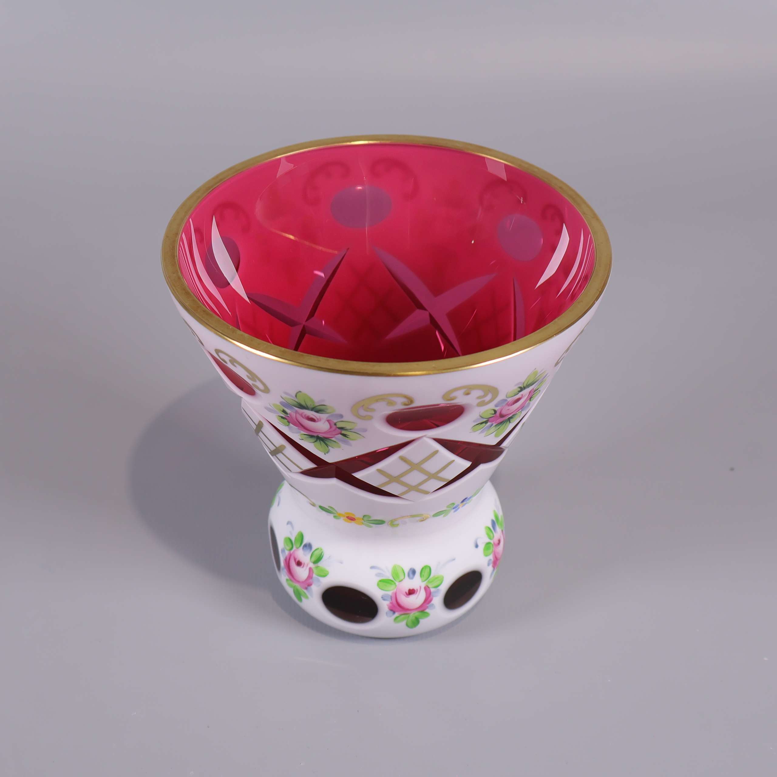 En lekfull och färgstark vas i glas med handmålat blommotiv, fina guldinslag och härlig kontrastrik design. Utsidan är dekorativt utskuren och insidan har en djup rosa ton som ger en unik känsla.