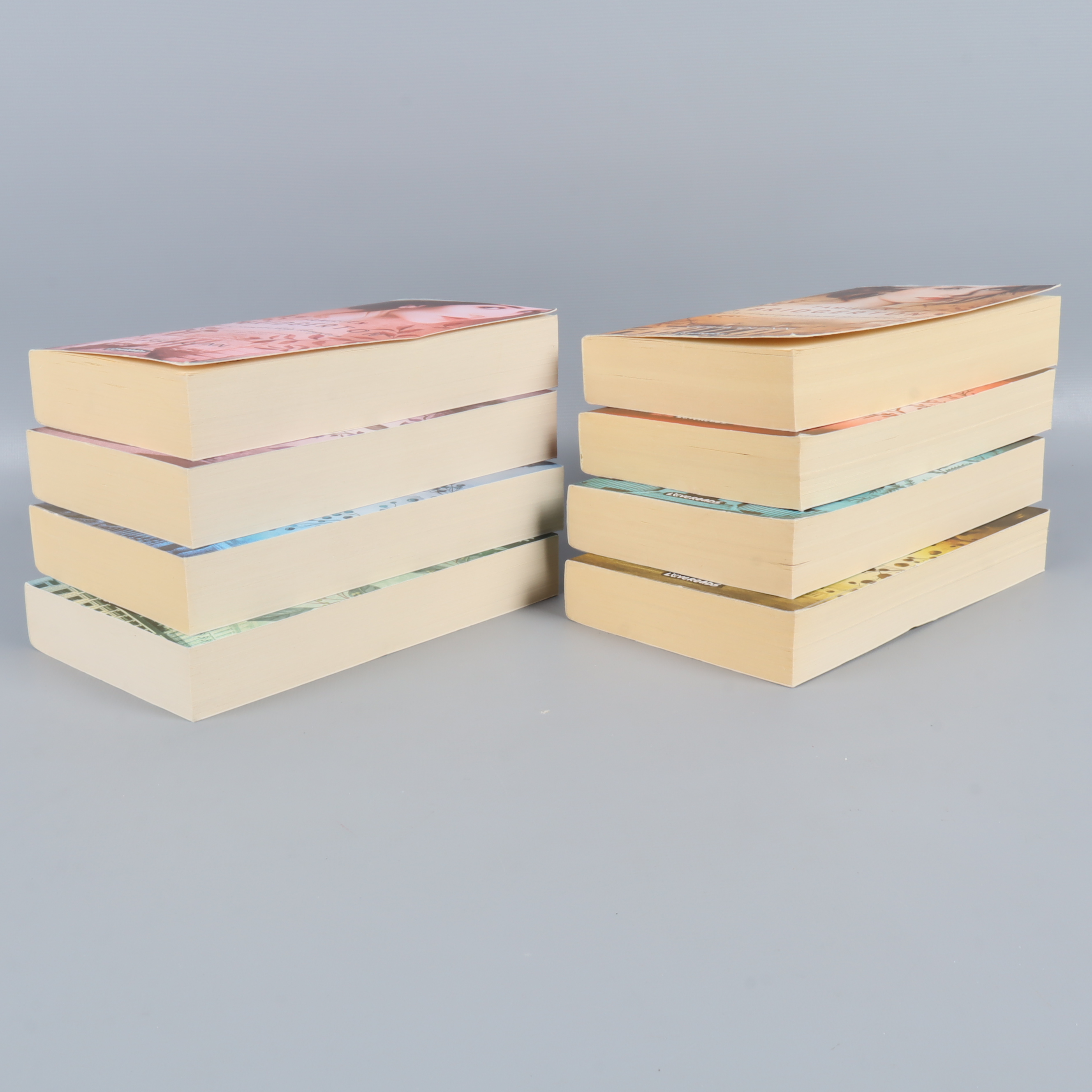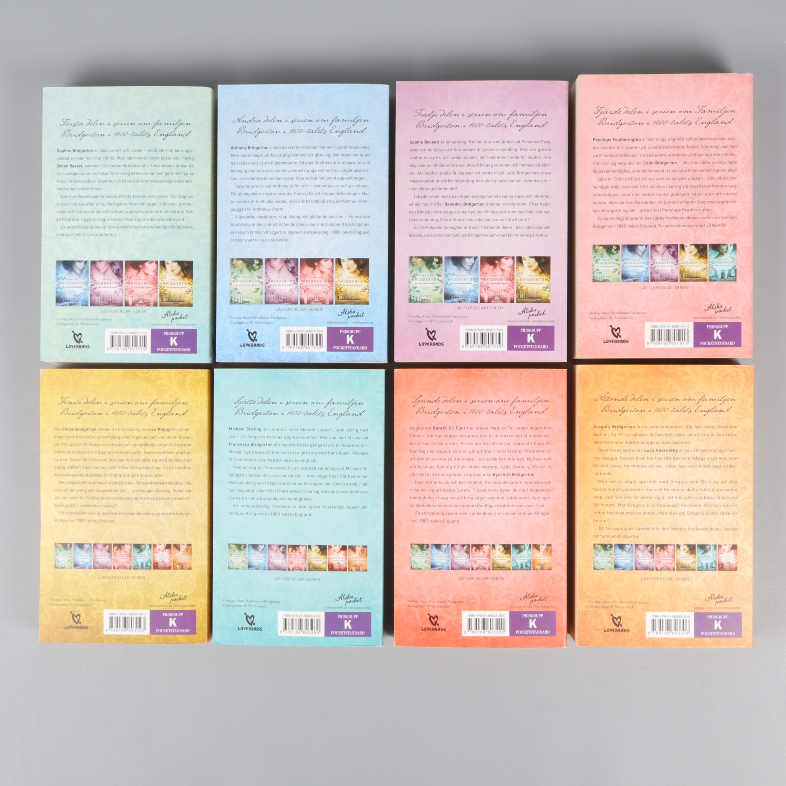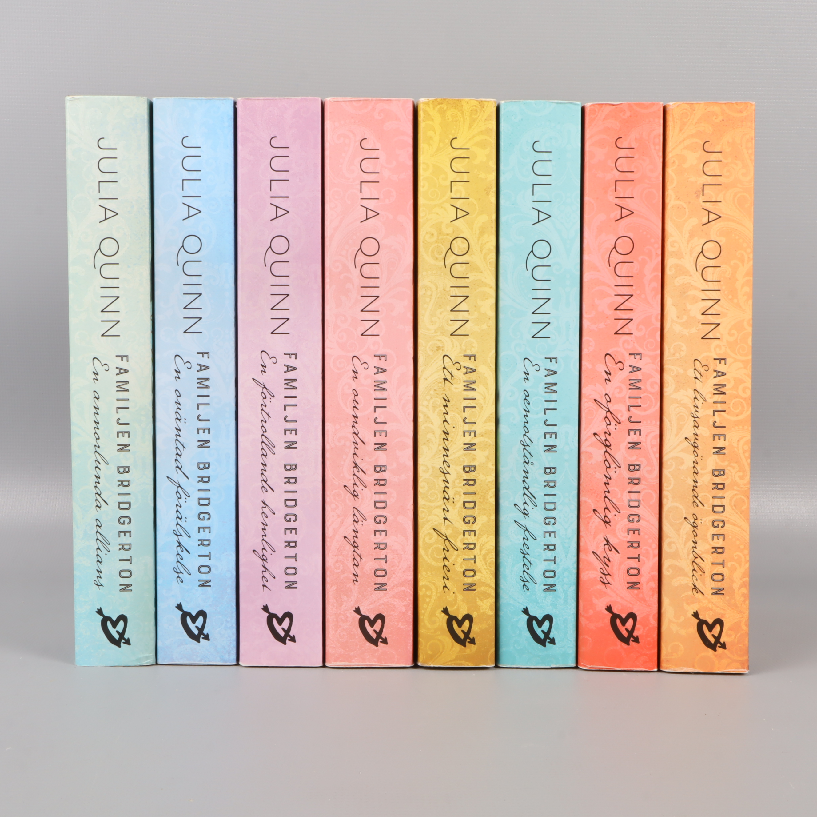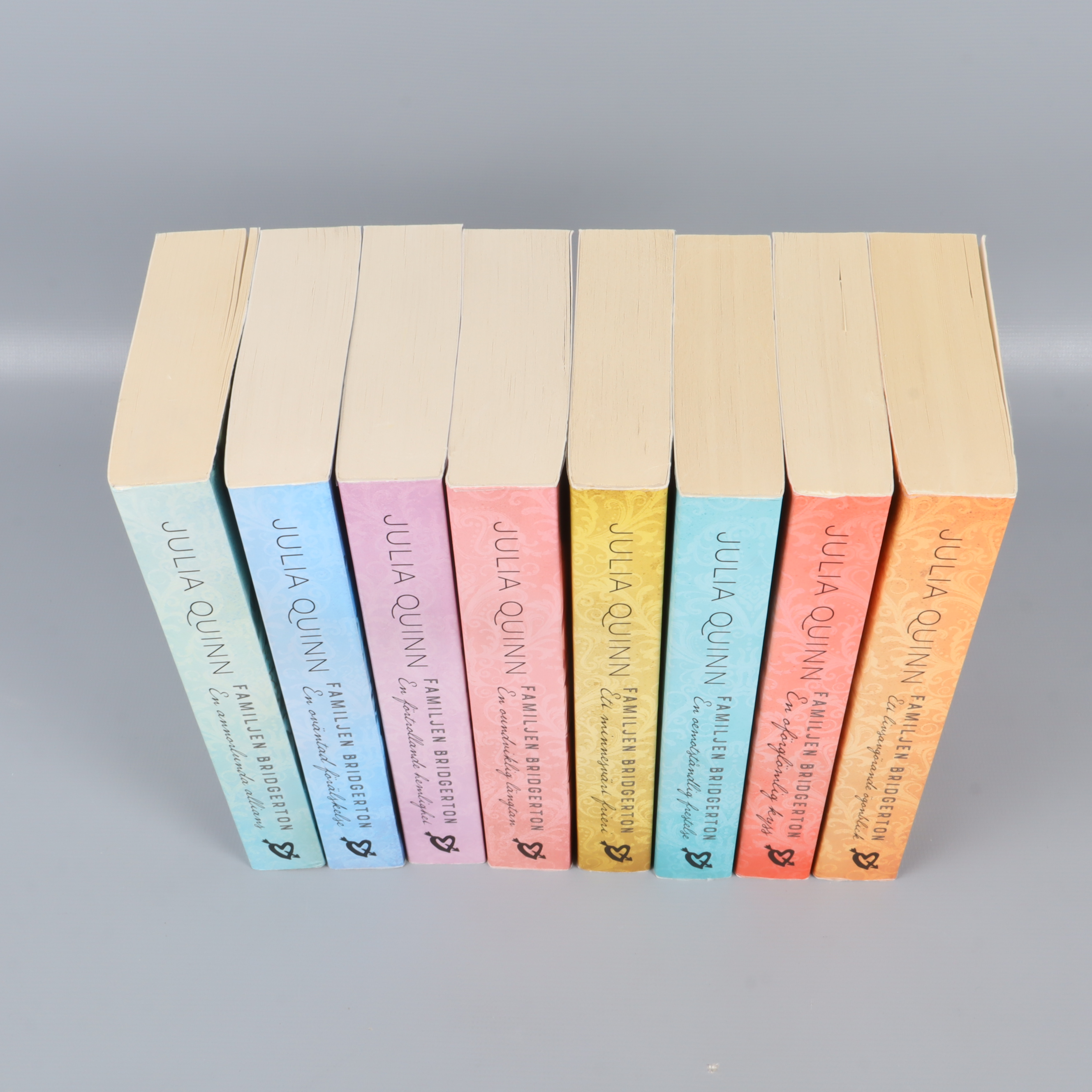 Här får du ett färgstarkt bokpaket med åtta pocketböcker ur serien Familjen Bridgerton av Julia Quinn. Böckerna har vackra omslag i mjuka pasteller med porträtt och eleganta detaljer, och ger en modern romance-känsla. Lätta pocketformatet gör dem smidiga att ta med och de är i mycket gott skick – perfekt för dig som vill uppleva hela serien!
