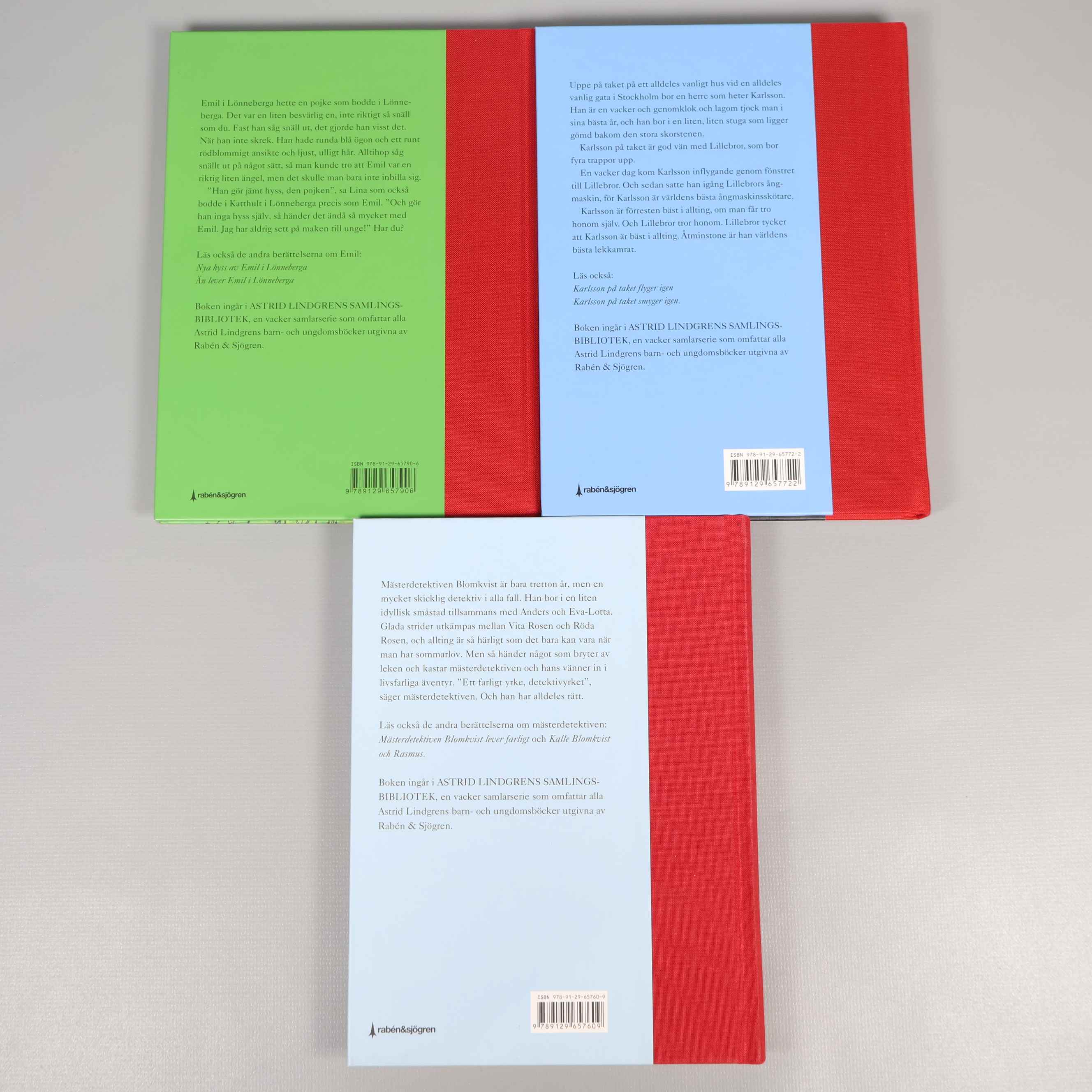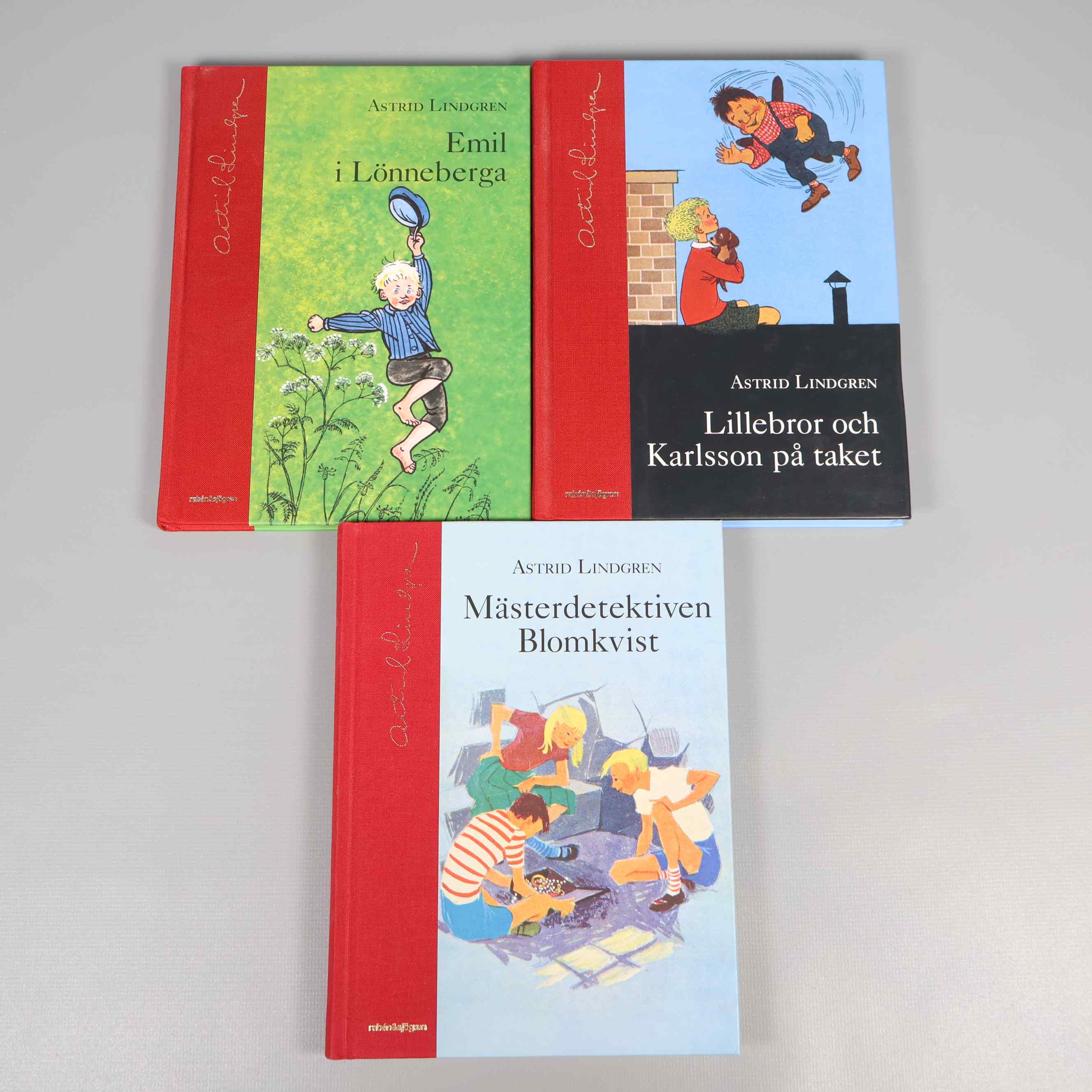 Bokpaket - Astrid Lindgren - Tre olika klassiker 199 kr Product variation Antal st Beskrivning Upptäck tre av Astrid Lindgrens mest älskade berättelser i detta bokpaket med vackra inbundna utgåvor. Visa all beskrivning Detaljer Övrigt: xxx Boktitel Emil i Lönneberga, Lillebror och Karlsson på taket, Mästerdetektiven Blomkvist Författare Astrid Lindgren ISBN 978-91-29-65790-6, 978-91-29-65772-2, 978-91-29-65760-9 Skick Mycket gott skick Produkten är sparsamt använd, är av fin kvalitet och ska inte ha några skador eller förslitningar. Läs mer om hur vi bedömer