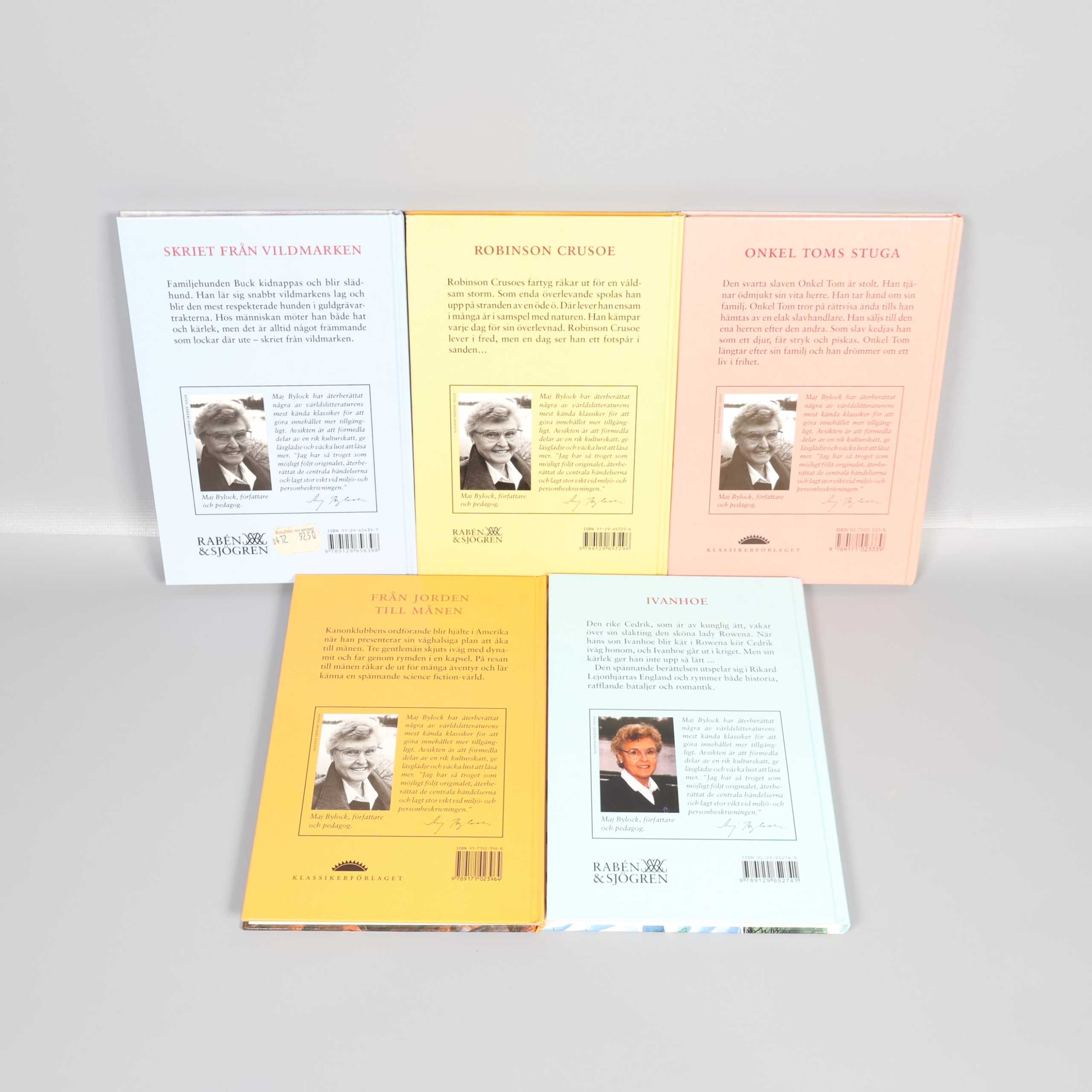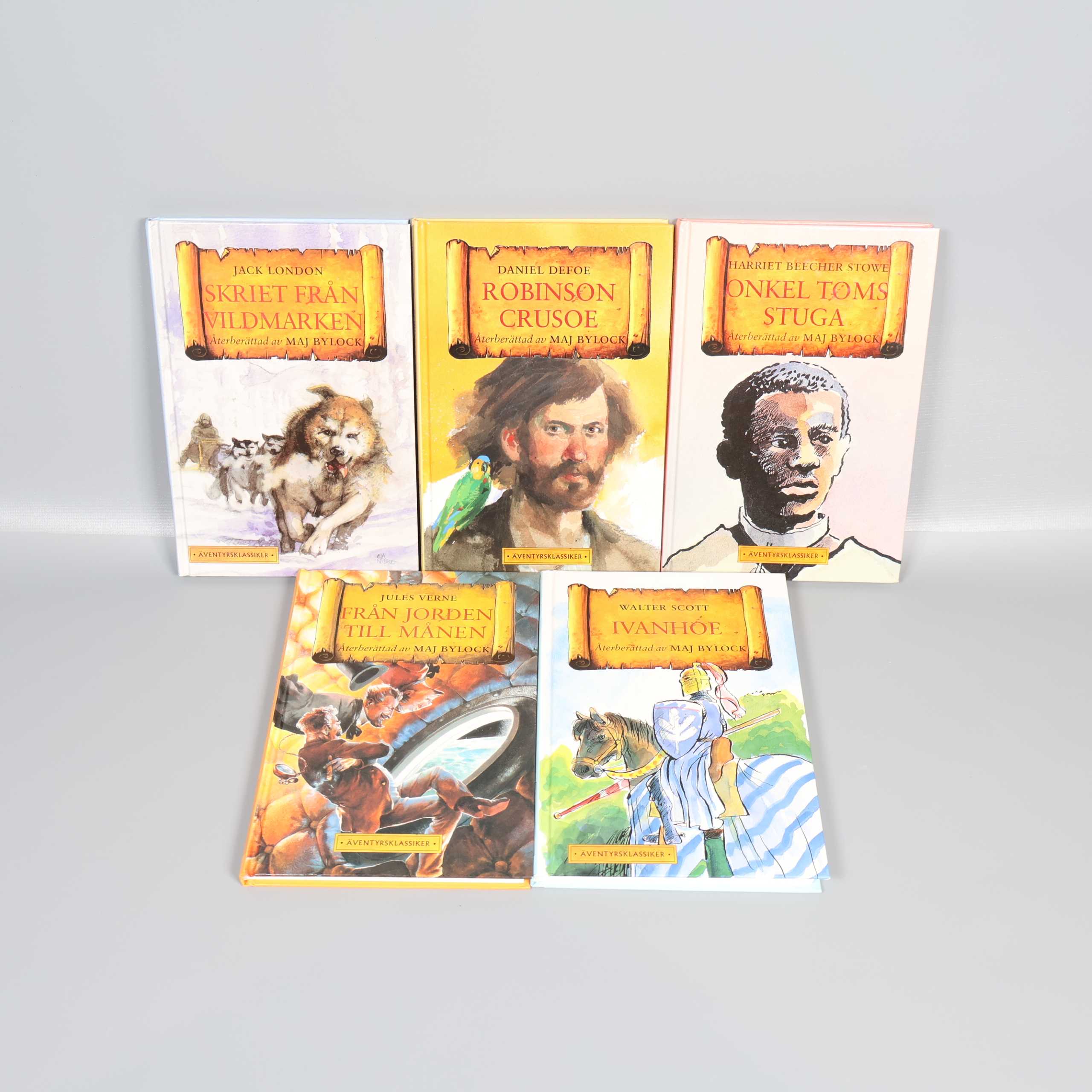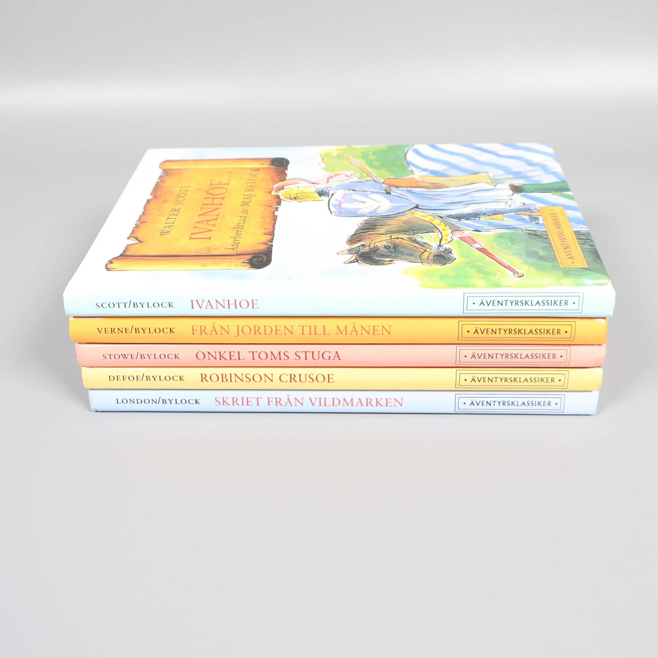 Bokpaket – Äventyrsklassiker - 5 st 249 kr Product variation Antal st Beskrivning Upptäck fem spännande äventyrsklassiker i detta färgstarka bokpaket, perfekt för dig som gillar klassiska berättelser med vacker illustration. Visa all beskrivning Boktitel Skriet från vildmarken, Robinson Crusoe, Onkel Toms stuga, Från jorden till månen, Ivanhoe ISBN 91-29-65639-7, 91-29-65729-6, 91-7102-333-X, 91-7102-396-8, 91-29-65724-X Skick Mycket gott skick Produkten är sparsamt använd, är av fin kvalitet och ska inte ha några skador eller förslitningar. Läs mer om hur vi bedömer