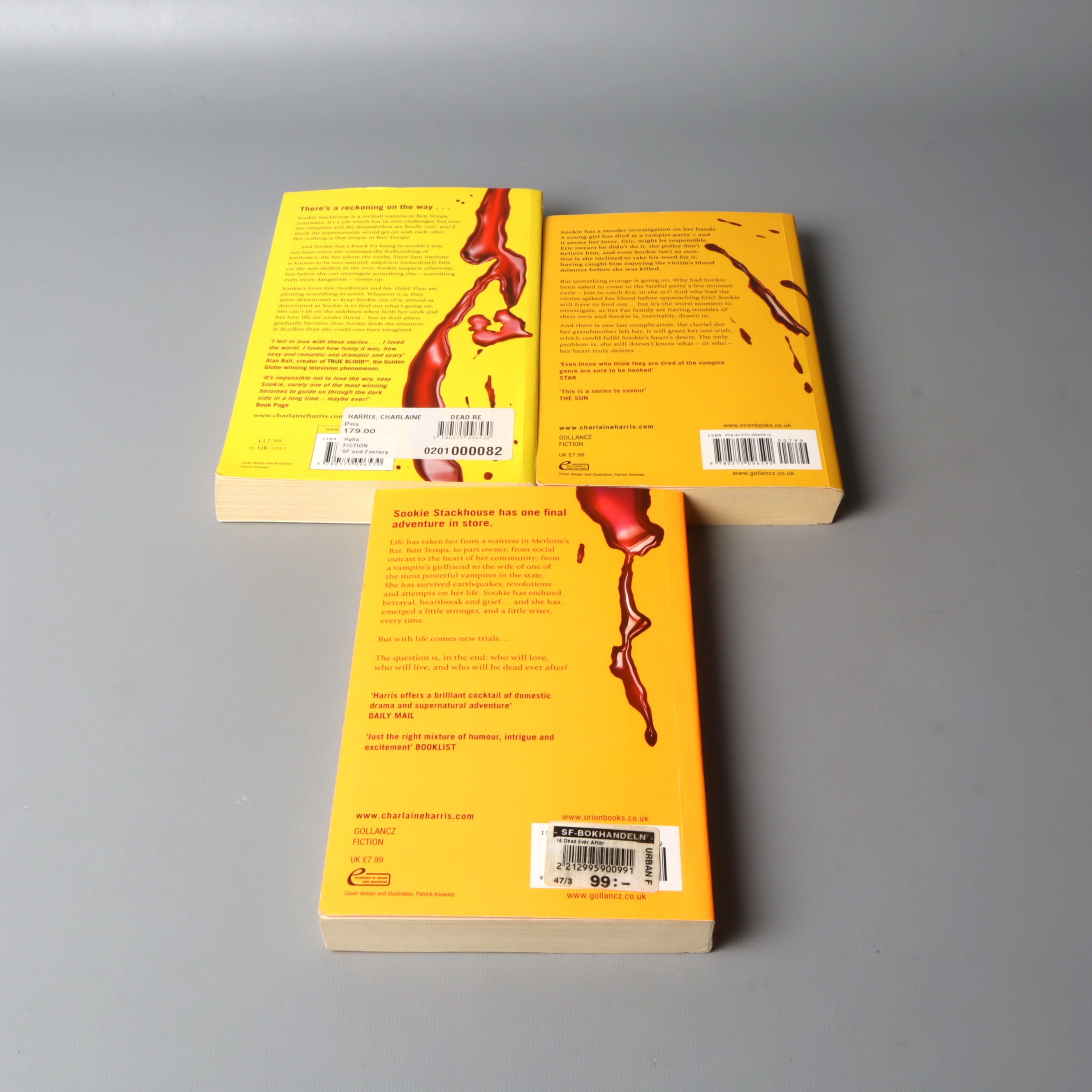 Bokpaket - Charlaine Harris - Sookie Stackhousedel del 11-13 249 kr Product variation Antal st Beskrivning Upptäck tre delar ur Sookie Stackhouse serien av Charlaine Harris i detta färgstarka bokpaket. Perfekt för dig som vill fördjupa dig i fängslande fantasy på engelska. Visa all beskrivning Boktitel Dead Reckoning, Deadlocked, Dead Ever After Författare Charlaine Harris ISBN 978-0-575-10084-6, 978-0-575-10086-0, 978-0-575-10088-4 Skick Mycket gott skick Produkten är sparsamt använd, är av fin kvalitet och ska inte ha några skador eller förslitningar. Läs mer om hur vi bedömer