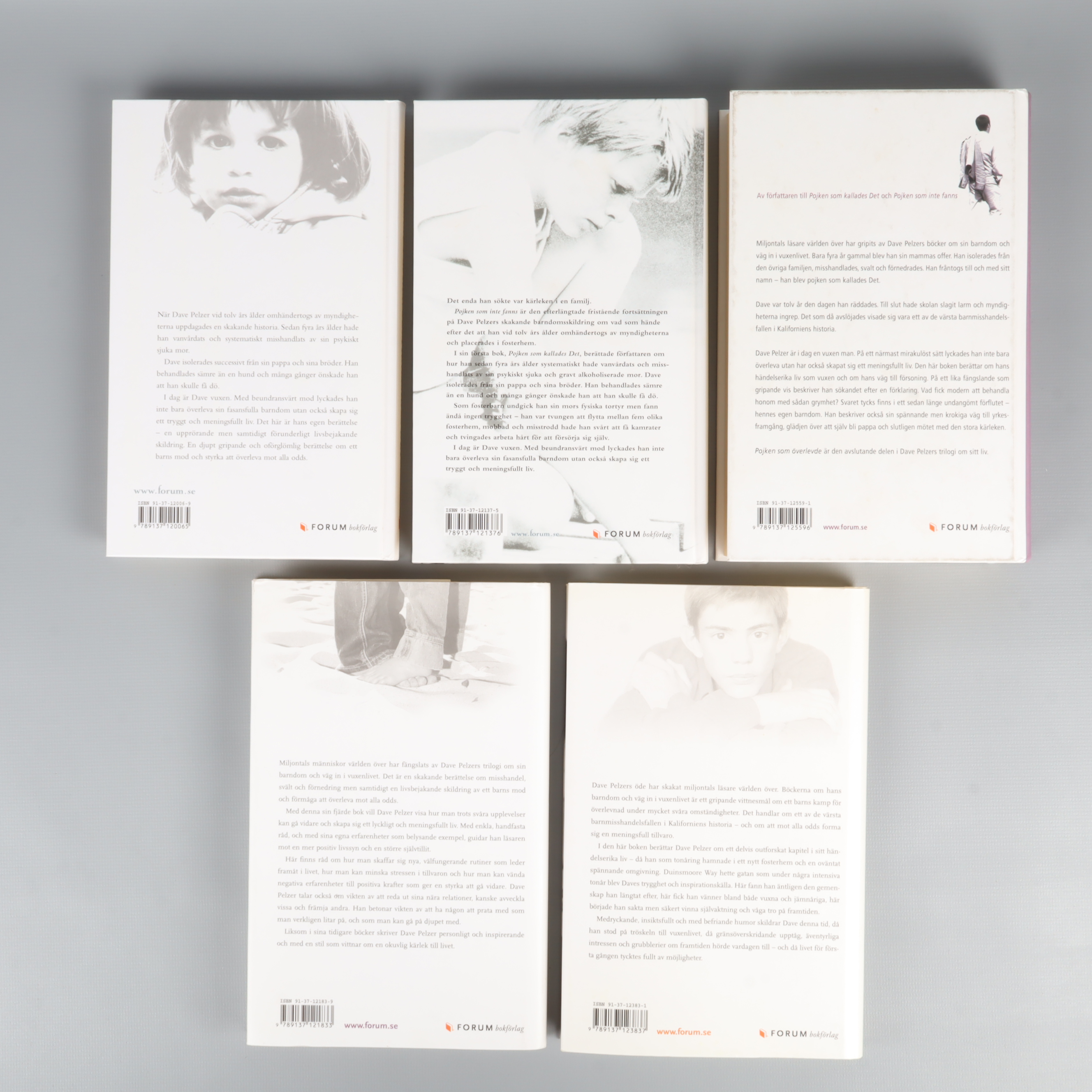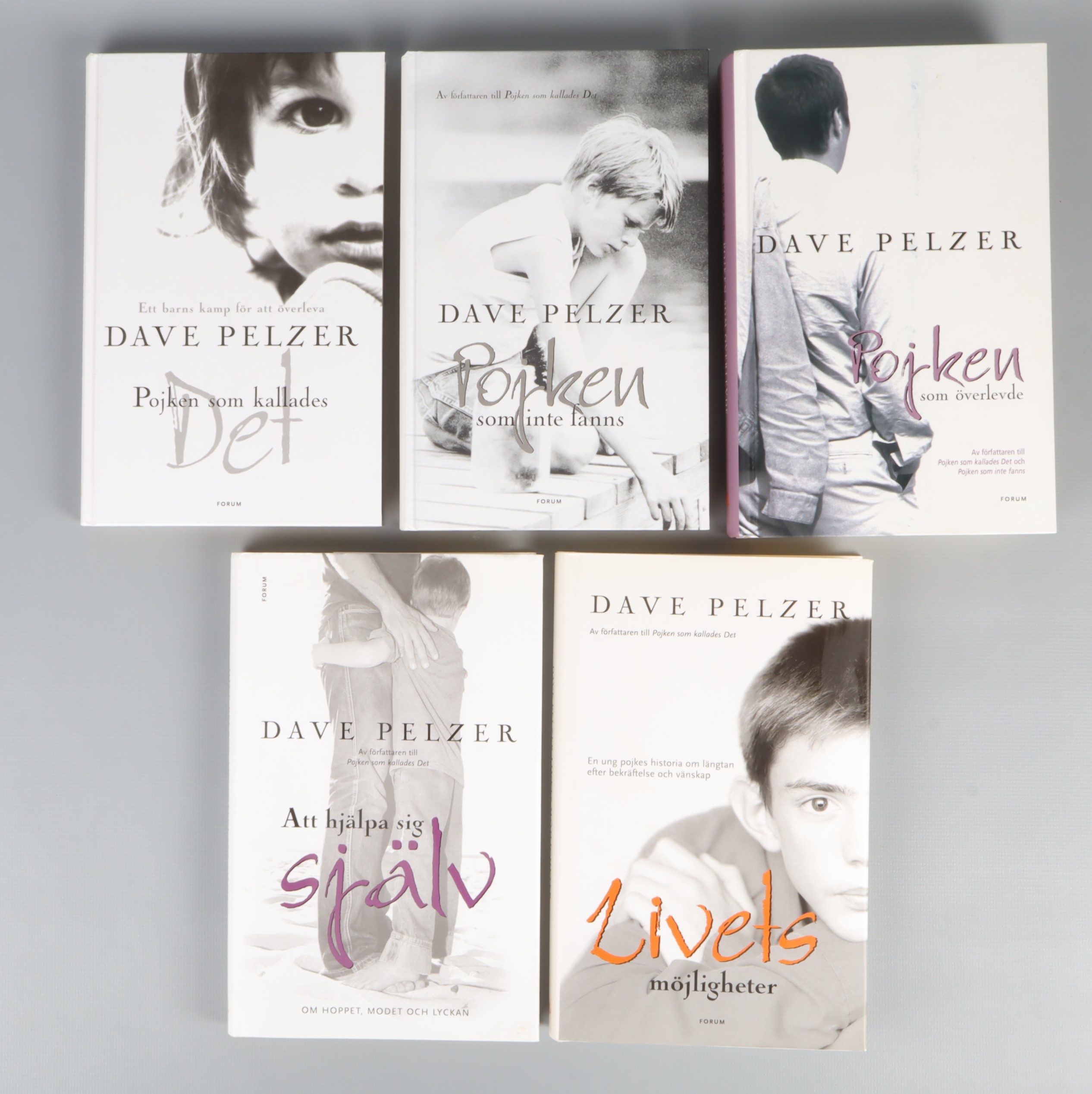 Bokpaket Dave Pelzer - 5 böcker 149 kr Product variation Antal st Beskrivning Upptäck ett komplett set med fem inspirerande böcker av Dave Pelzer på svenska. Samlingen bjuder på stilrena omslag i svartvitt och mjuka färginslag. Visa all beskrivning Detaljer Språk: Svenska Boktitel Pojken som kallades Det, Pojken som inte fanns, Pojken som överlevde, Att hjälpa sig själv, Livets möjligheter Författare Dave Pelzer Skick Gott skick Produkten har använts men är av fin kvalitet och ska inte ha några skador eller förslitningar. Läs mer om hur vi bedömer