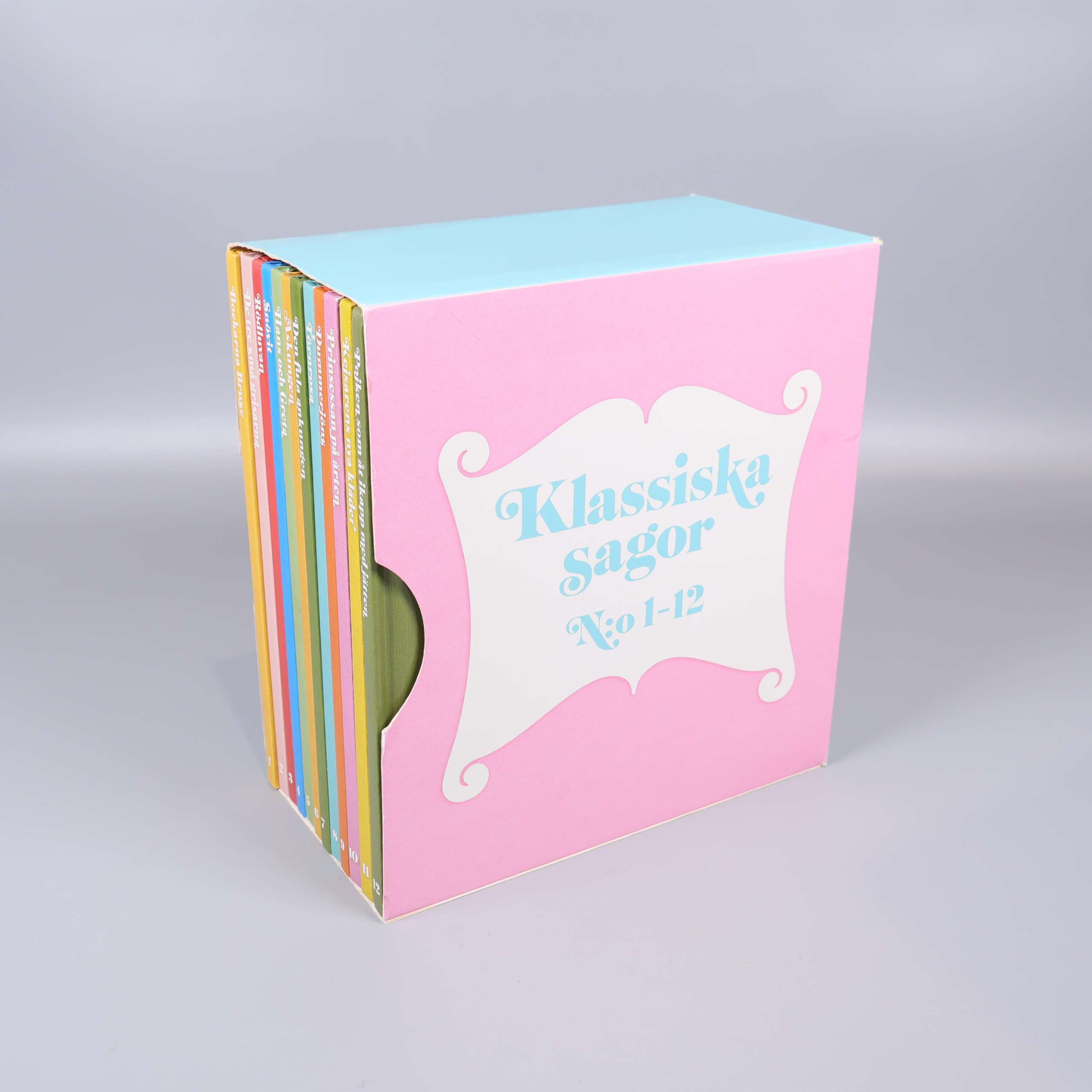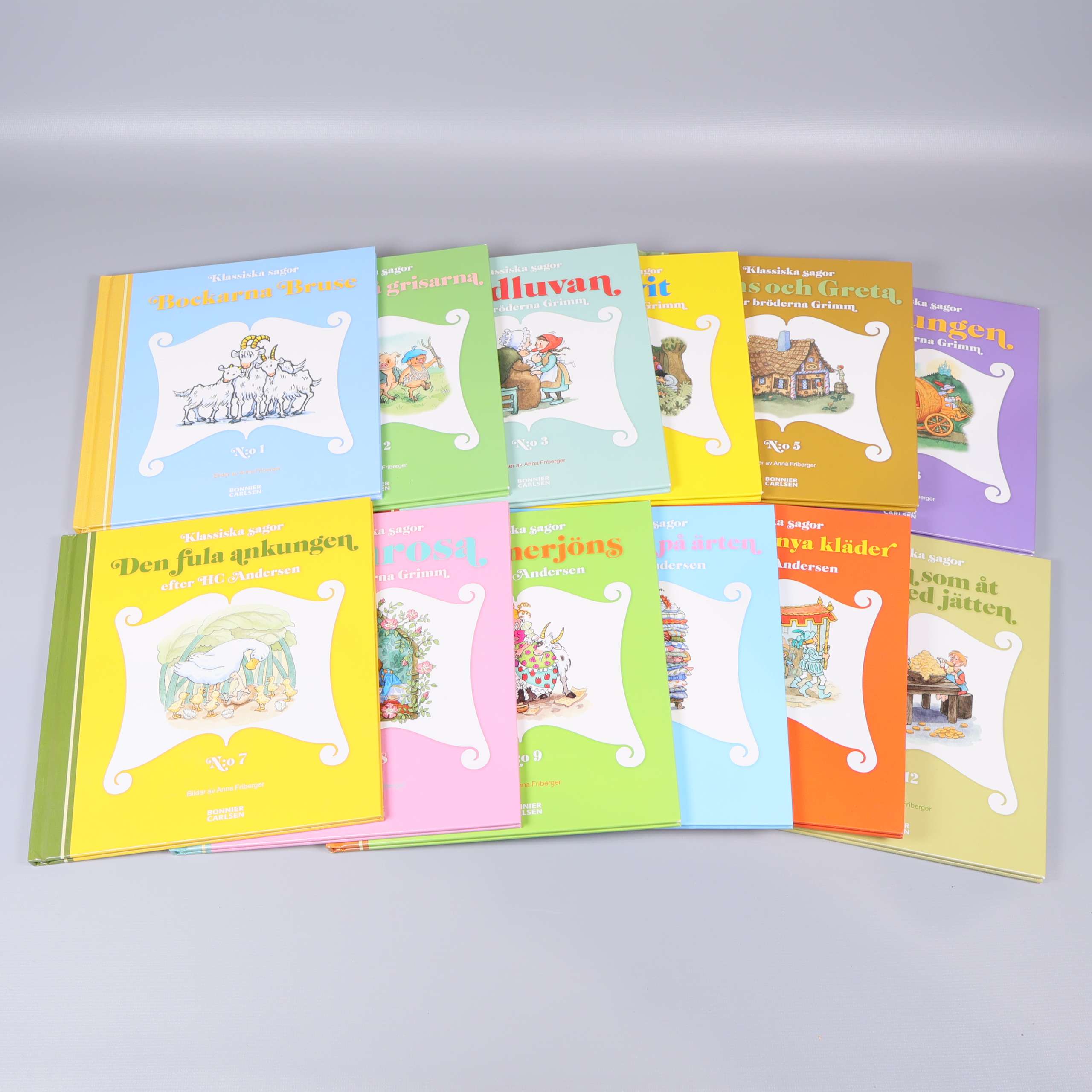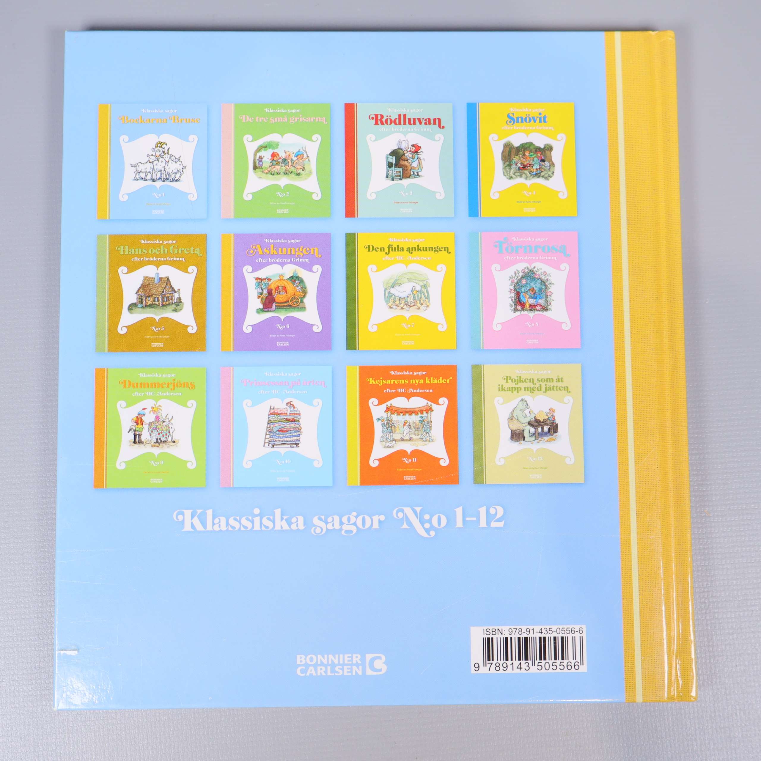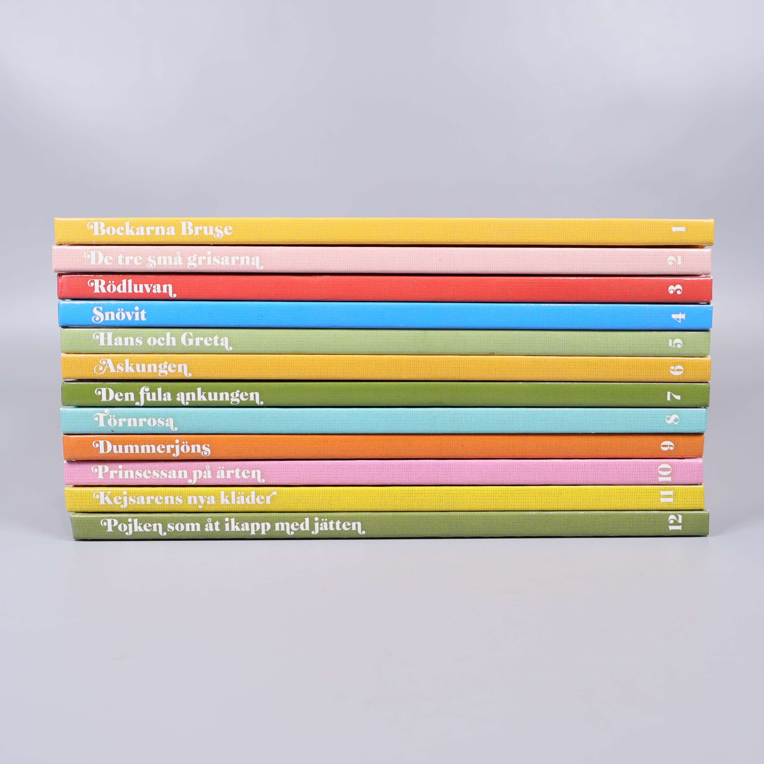 Upptäck ett färgstarkt bokpaket med tolv klassiska sagor i en fin box. Det finns skador på Bockarna Bruse, skrift på De tre små grisarna och två fläckar i Snövit.