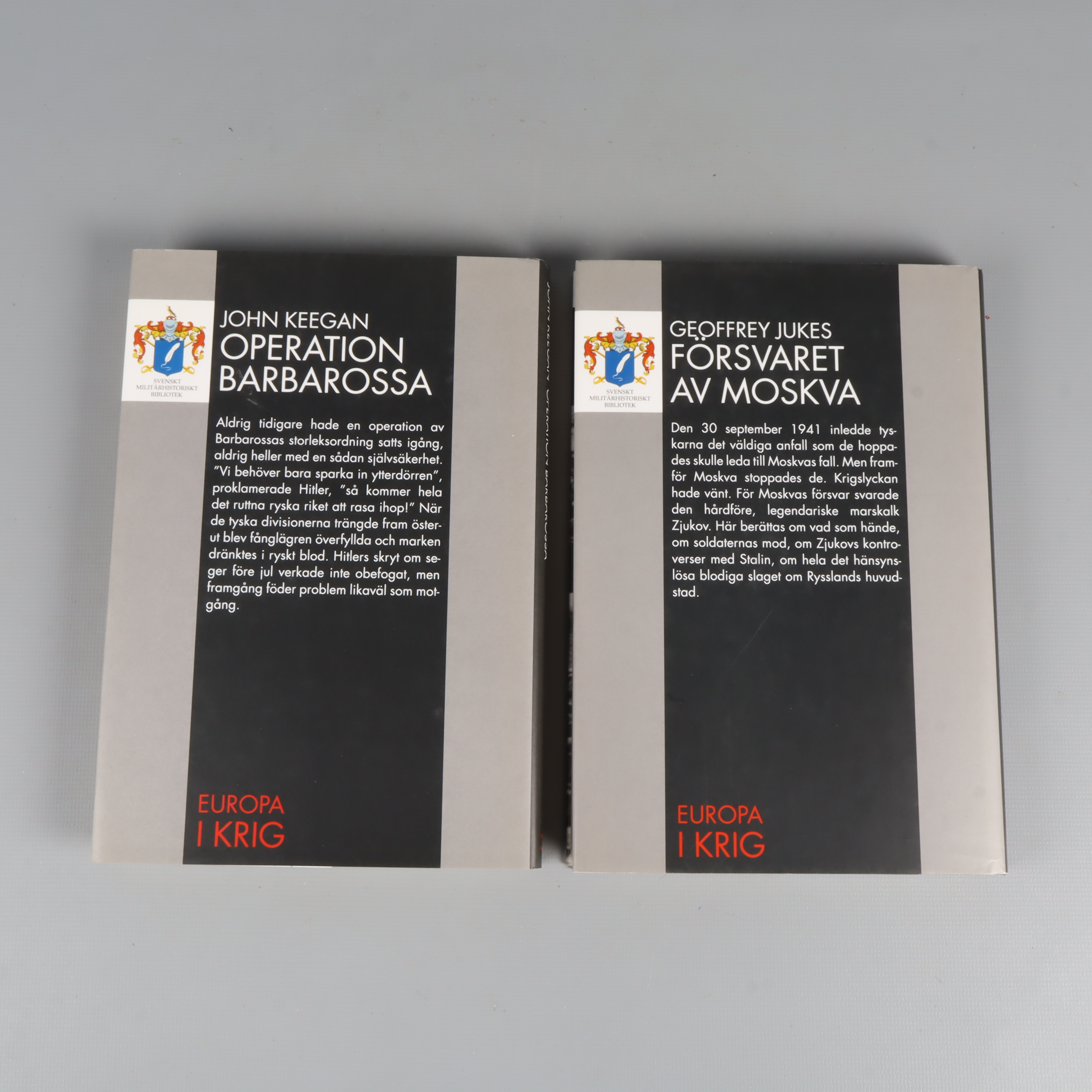Bokpaket - John Keegan, Geoffrey Jukes - Europa i krig 3 & 4 – Operation Barbarossa & Försvaret av Moskva 179 kr Product variation Antal st Beskrivning Två inspirerande böcker med svartvita fotografier som tar dig direkt till andra världskrigets dramatiska ögonblick. Visa all beskrivning Boktitel Operation Barbarossa, Försvaret av Moskva Författare John Keegan, Geoffrey Jukes Skick Mycket gott skick Produkten är sparsamt använd, är av fin kvalitet och ska inte ha några skador eller förslitningar. Läs mer om hur vi bedömer