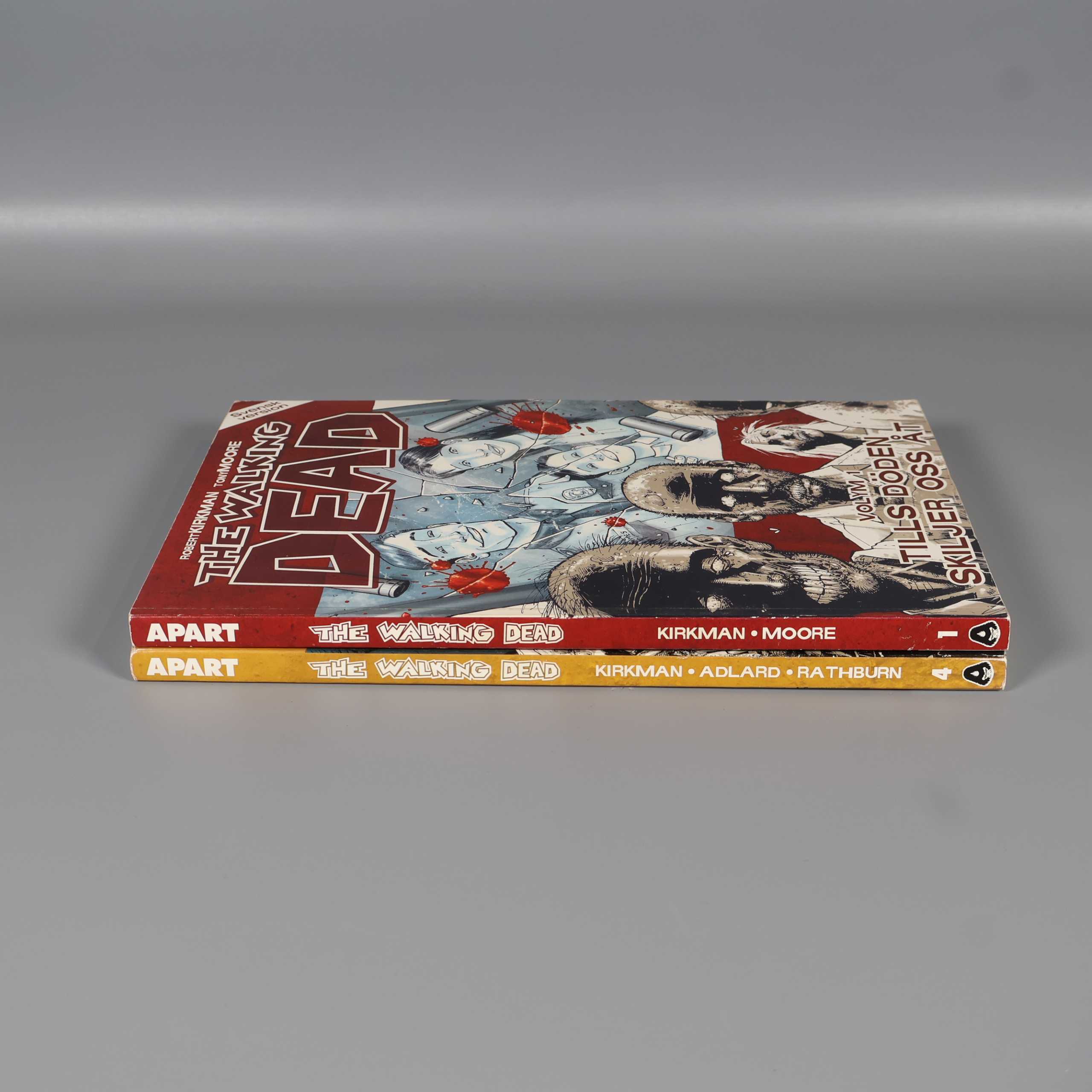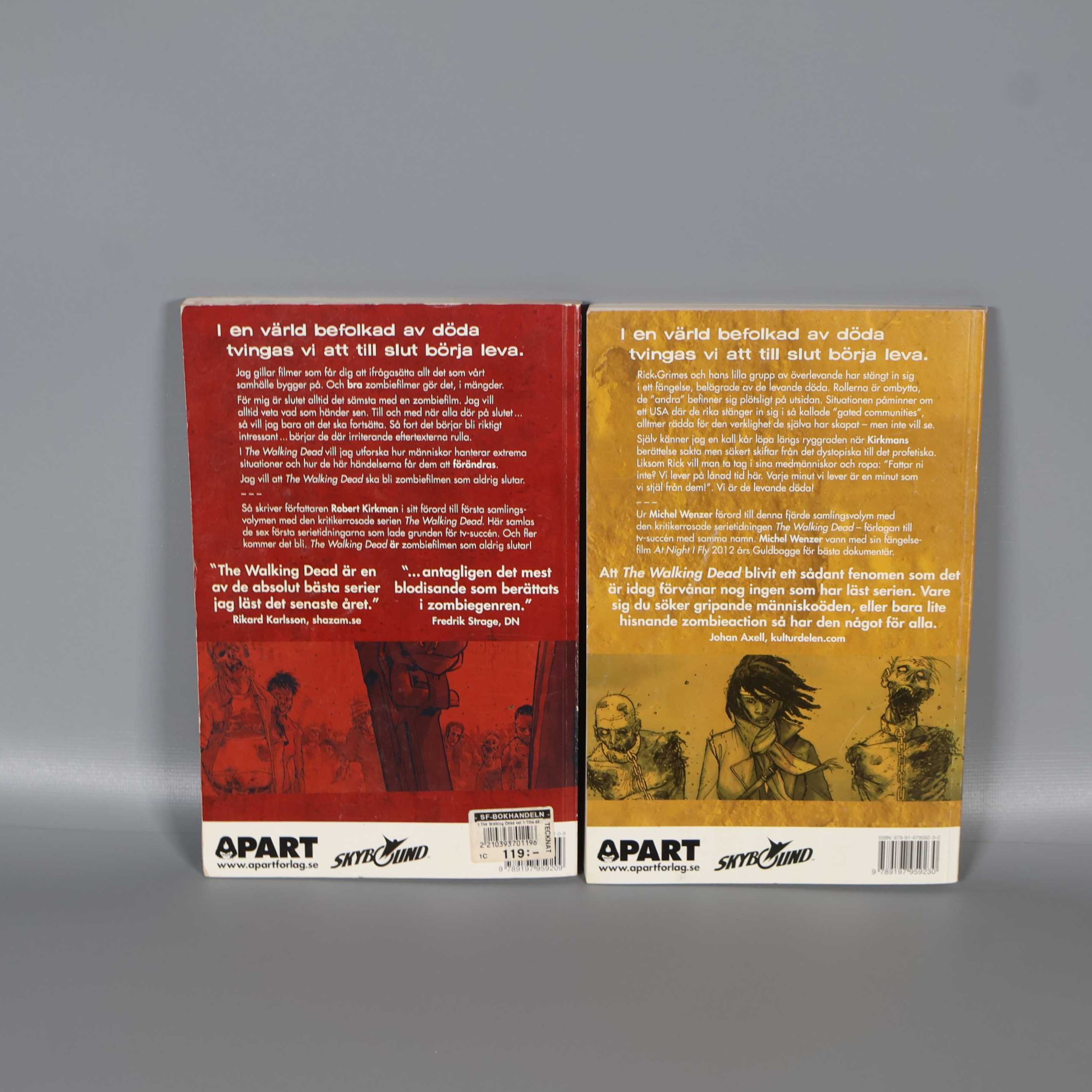 Två serieböcker i The Walking Dead-serien – volym 1 och 4 – med omslag i starka färger och svartvit inlaga som bjuder på klassiska zombies och spännande teckningar.