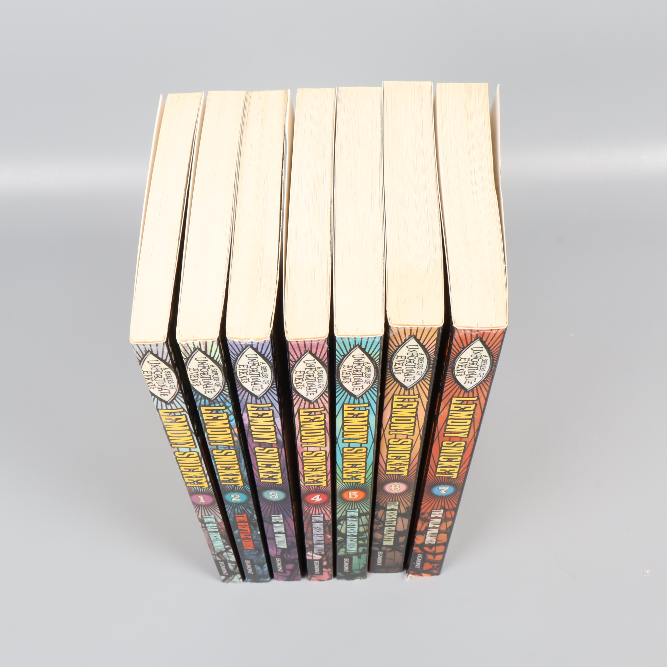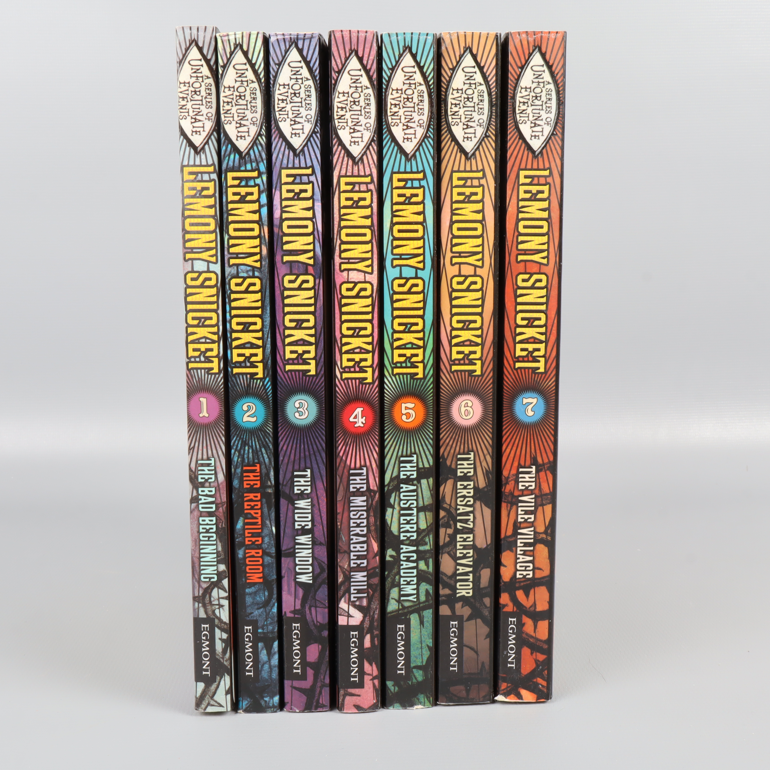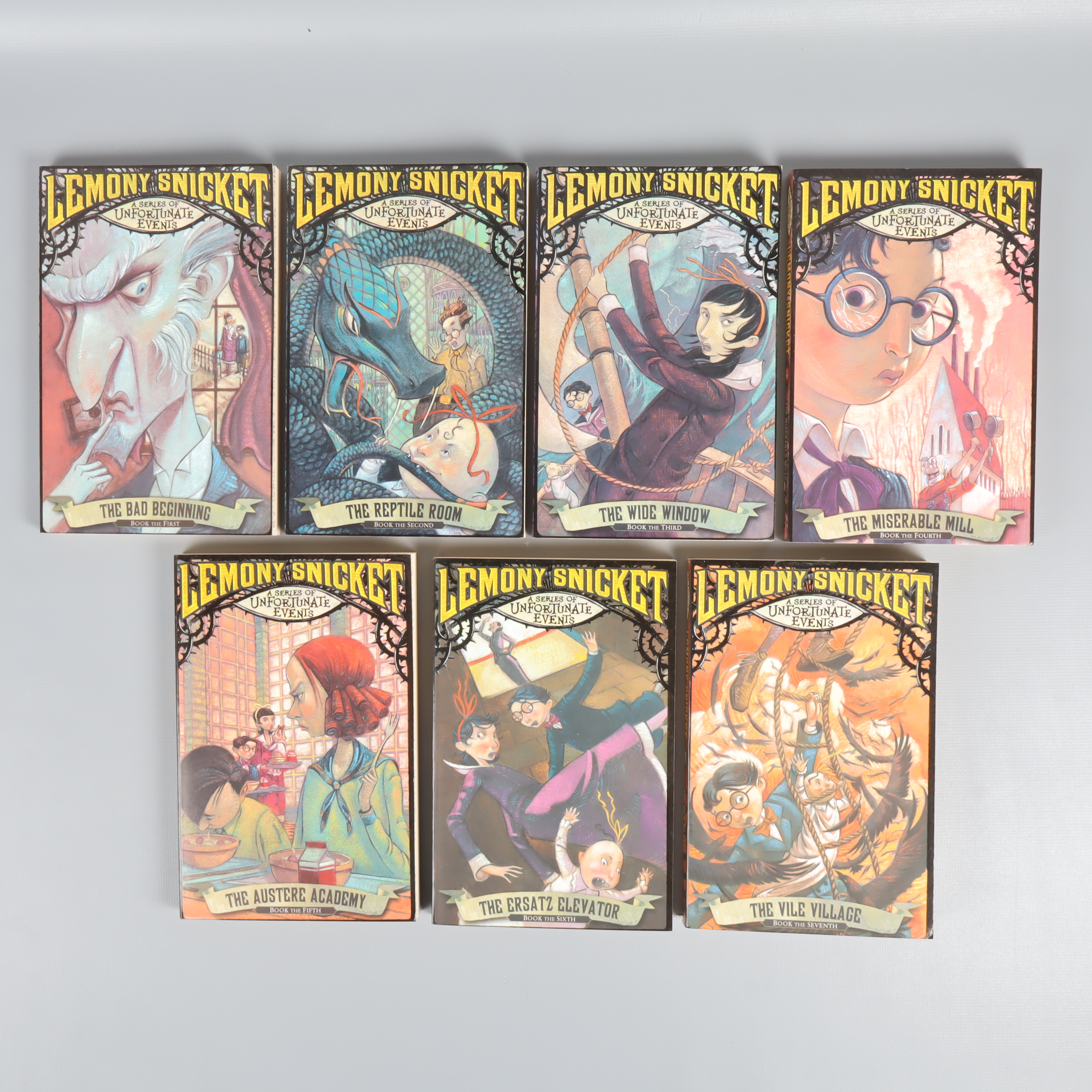 Upplev de sju första böckerna i Lemony Snickets magiskt illustrerade serie 'A series of unfortunate events'. Böckerna har färgstarka omslag, softcover och bjuder på en quirky, vintage vibe. Perfekt för dig som gillar mystiska äventyr med karaktärsfull design och tydliga engelsktextade titlar på framsidan. En eye-catcher i bokhyllan, oavsett om du är barn, ungdom eller vuxen.