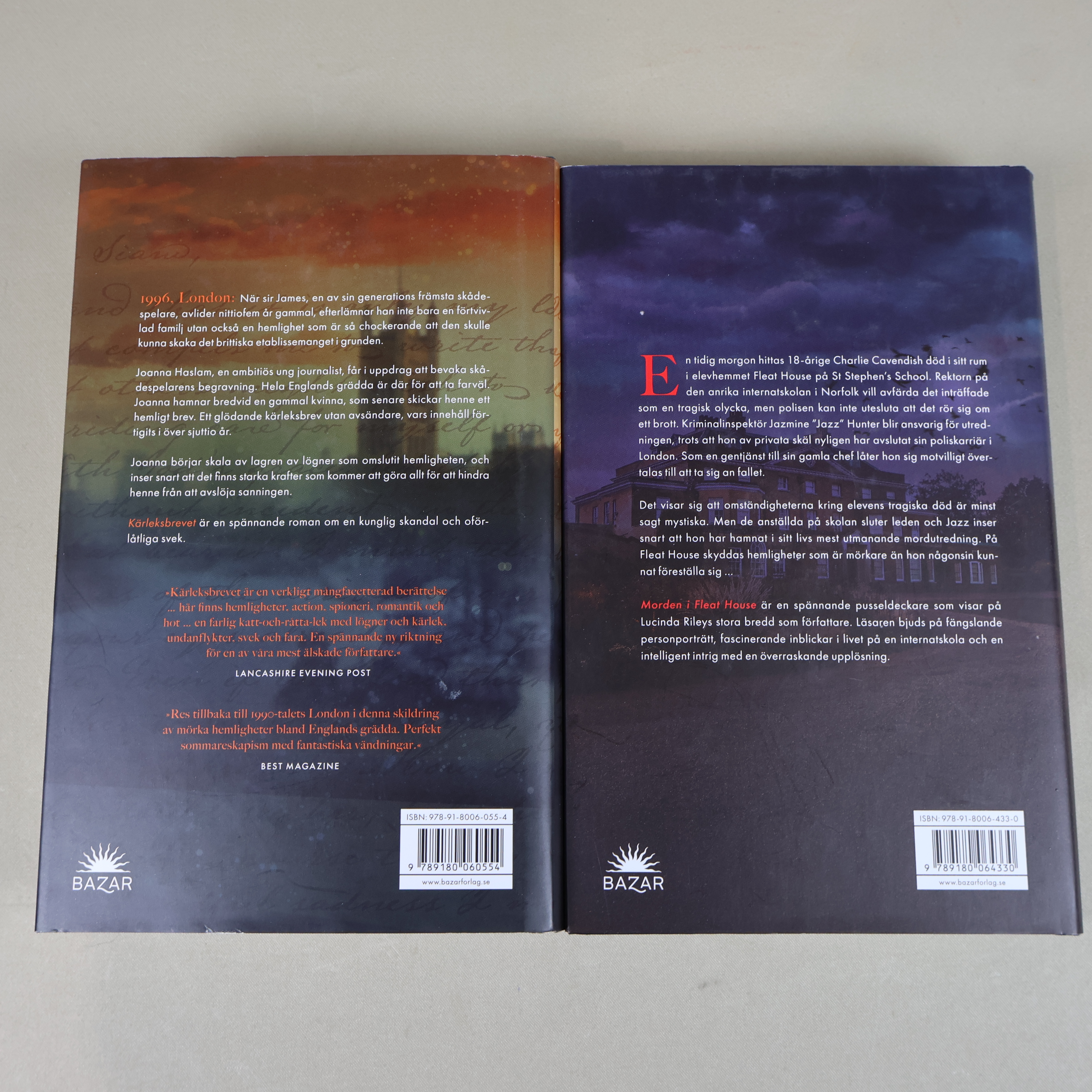 Få två spännande romaner av Lucinda Riley i ett och samma paket! Både Kärleksbrevet och Morden i Fleat House bjuder på starka berättelser, vackra omslag och inbundet format som känns lyxigt i bokhyllan. Perfekt när du vill ha både drama och kriminalmysterium på svenska i riktigt fint skick.