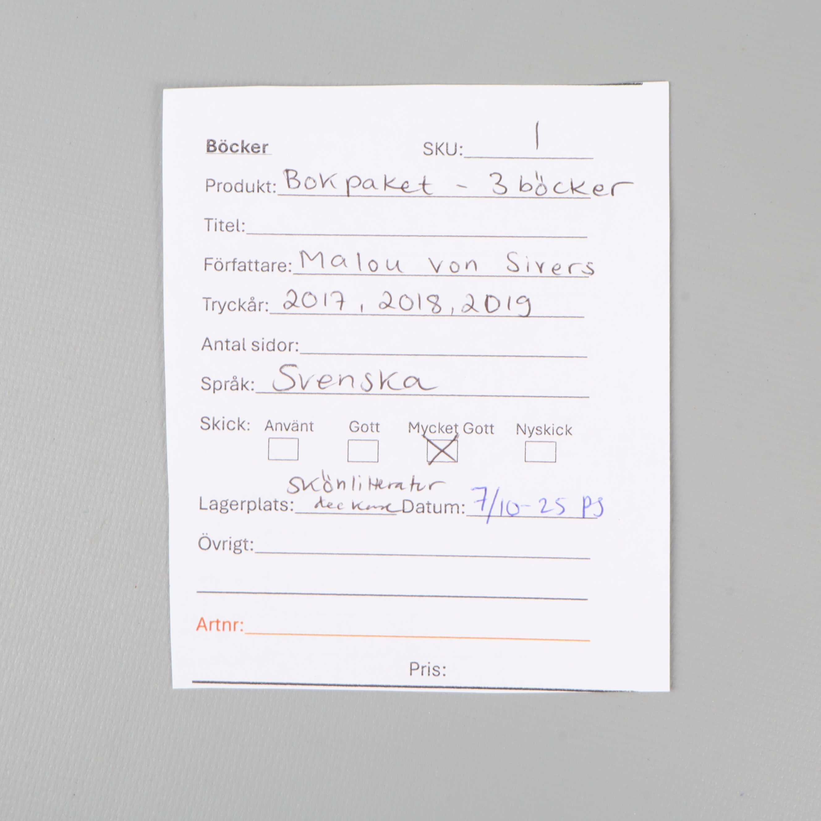 Upptäck tre gripande romaner av Malou von Sivers i detta snygga paket. Böckerna har vackra omslag och är inbundna i robust kvalitet som gör sig fint i bokhyllan. Perfekt för dig som gillar svensk samtida skönlitteratur med djup och känsla. En fin mix av estetiskt tilltalande design och starka berättelser.