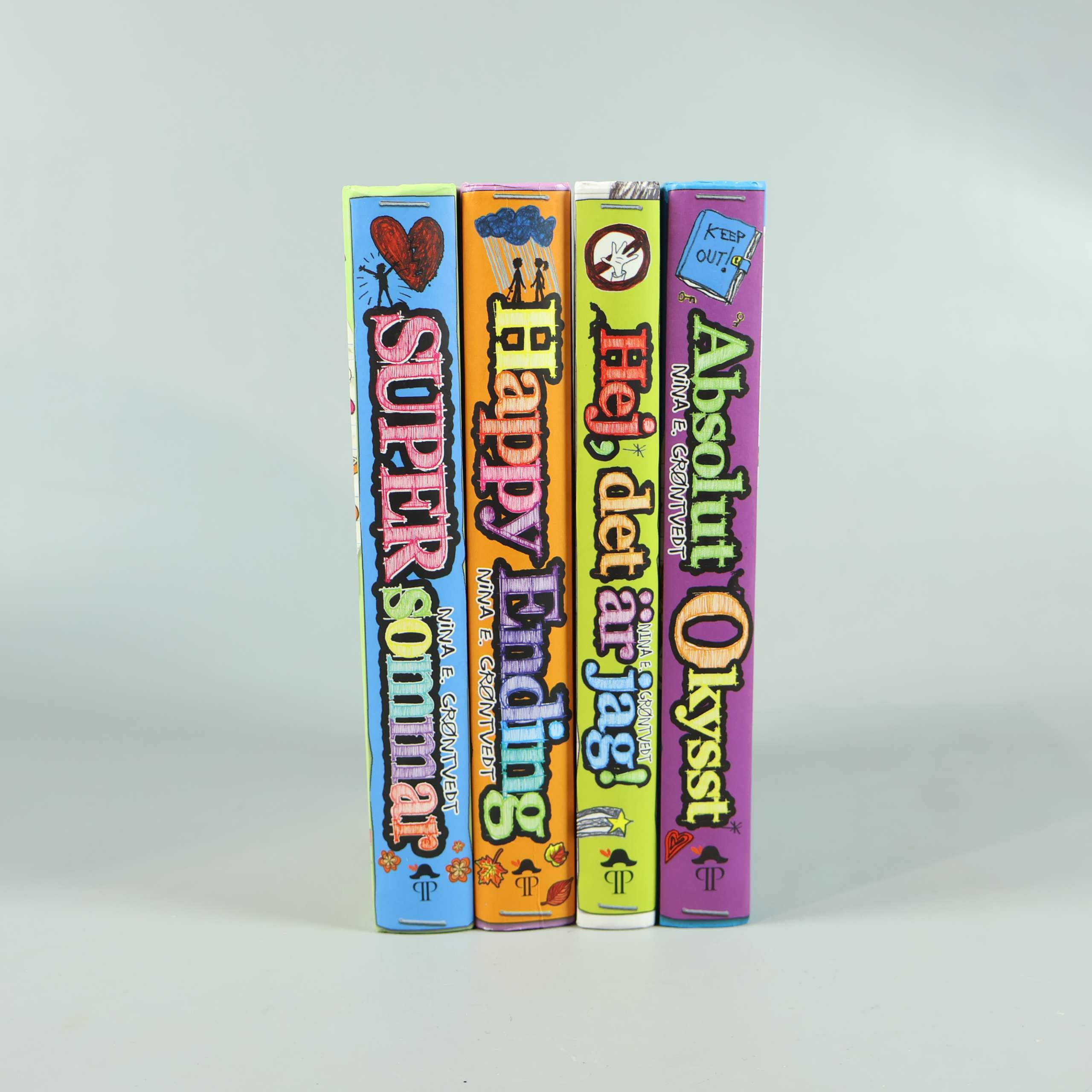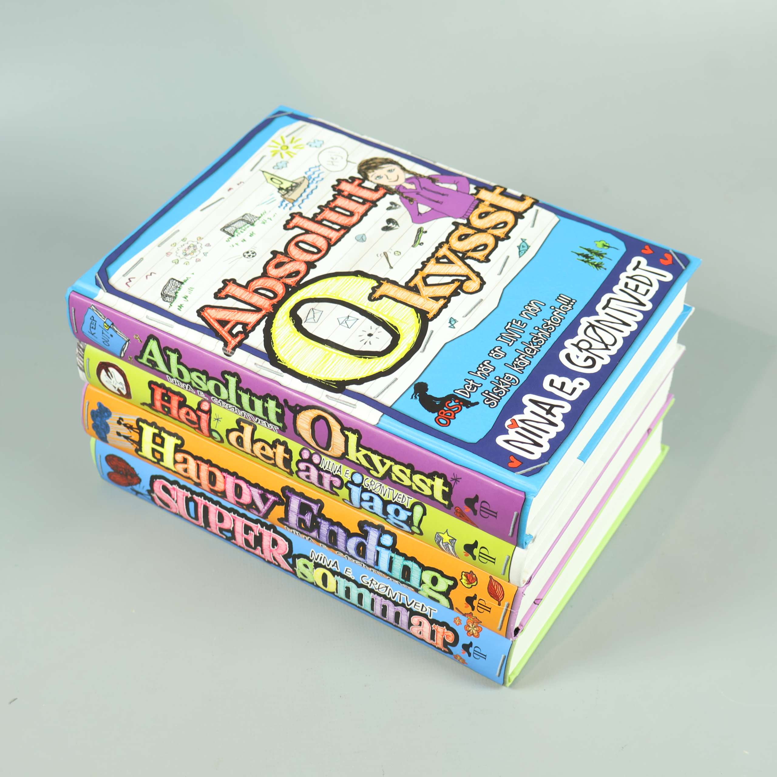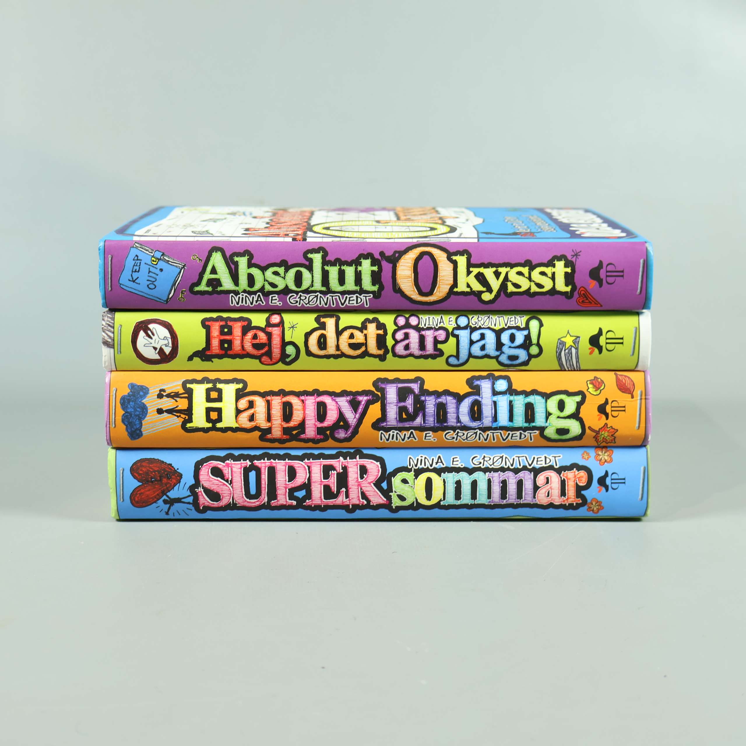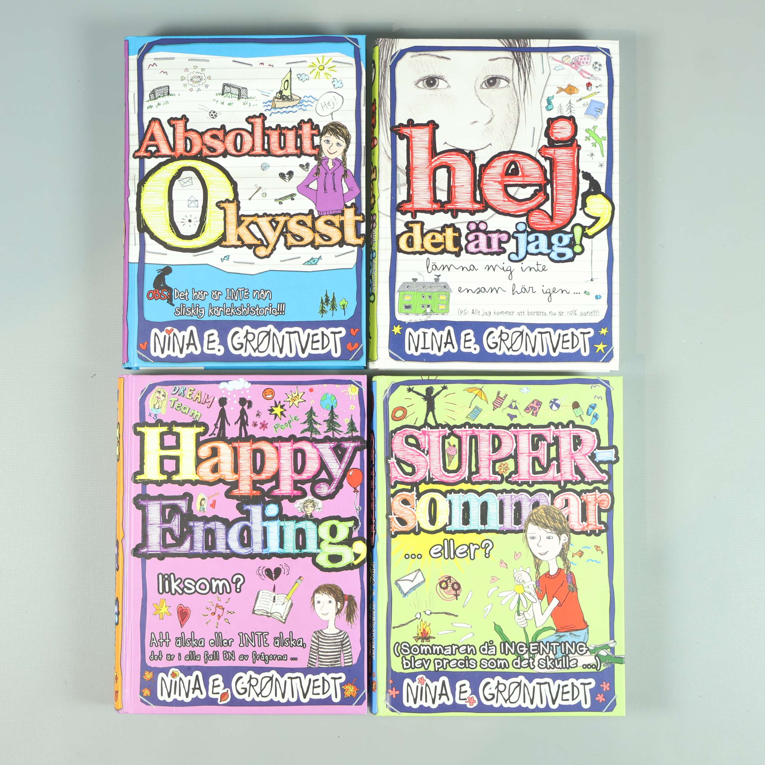 Fyrpack böcker med livliga omslag och lekfulla illustrationer av Nina E. Grøntvedt. Serien bjuder på handskrivna texter och skisser som ger en dagbokskänsla med härlig ton och mycket humor. Passar dig som gillar färg, personliga berättelser och lättillgänglig läsning. Böckerna har hardcovers och tydliga titlar på ryggarna för enkel översikt.
