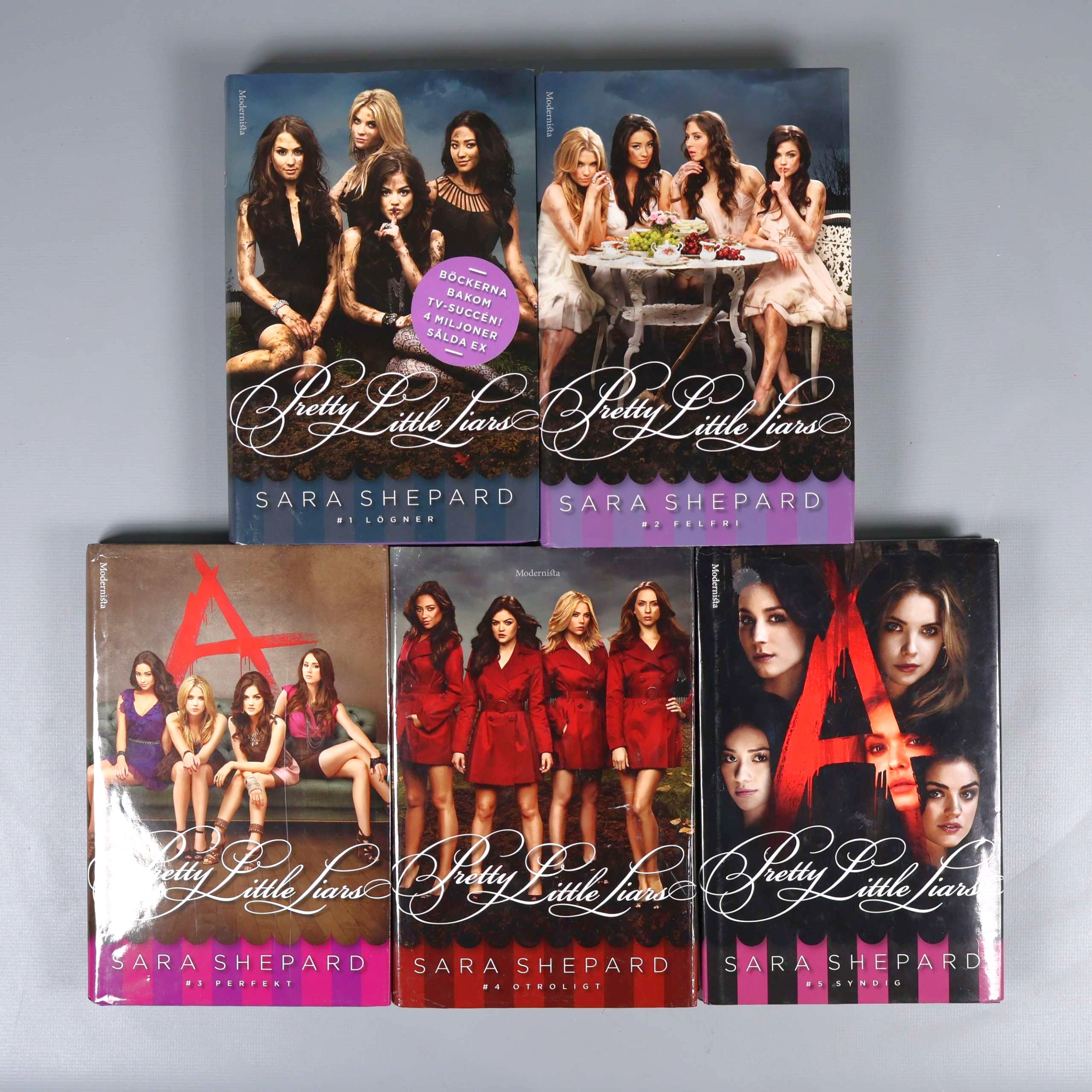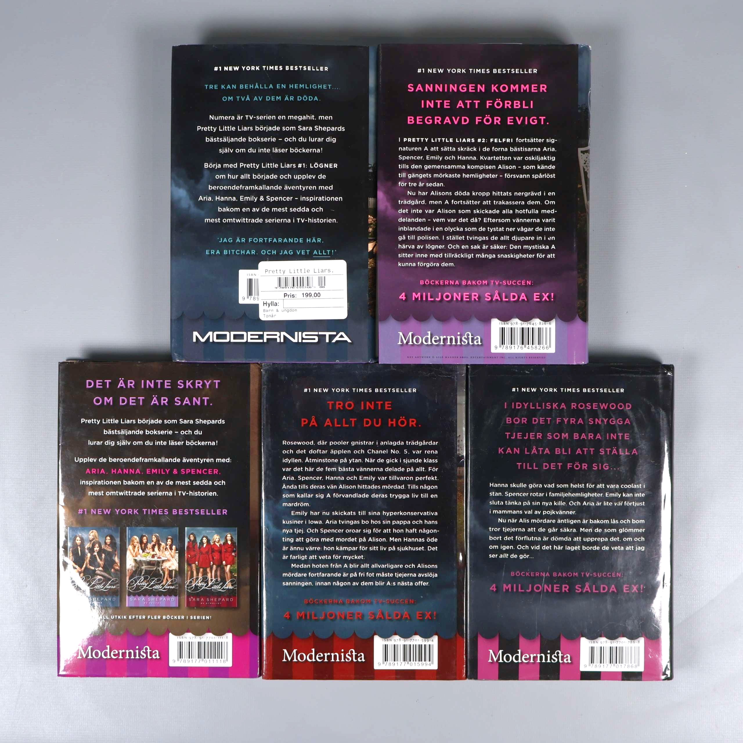 Upptäck ett komplett bokpaket med de fem första delarna av Pretty Little Liars av Sara Shepard. Böckerna har snygga omslag och bjuder på en spännande och ungdomlig vibe, perfekt för dig som gillar mysterier och drama. Inbundna exemplar i gott skick med färgstarka omslag och tydlig numrering på ryggen. Serien är populär bland både nya och gamla fans av genren.
