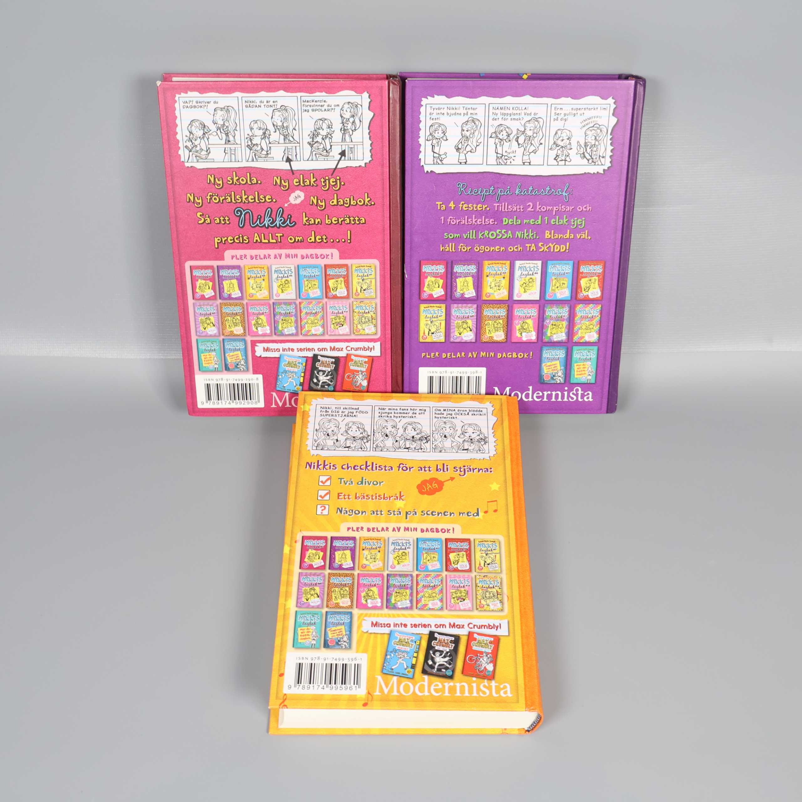 Bokpaket - Rachel Renée Russell - Nikkis dagbok 1-3 199 kr Product variation Antal st Beskrivning Ett färgglatt bokpaket med de första tre delarna av Nikkis dagbok, perfekt för dig som gillar berättelser med en humoristisk och charmig ton. Visa all beskrivning Boktitel Nikkis dagbok #1, Nikkis dagbok #2, Nikkis dagbok #3 Författare Rachel Renée Russell ISBN 978-91-7499-596-1, 978-91-7499-398-1, 978-91-7499-290-8 Skick Mycket gott skick Produkten är sparsamt använd, är av fin kvalitet och ska inte ha några skador eller förslitningar. Läs mer om hur vi bedömer