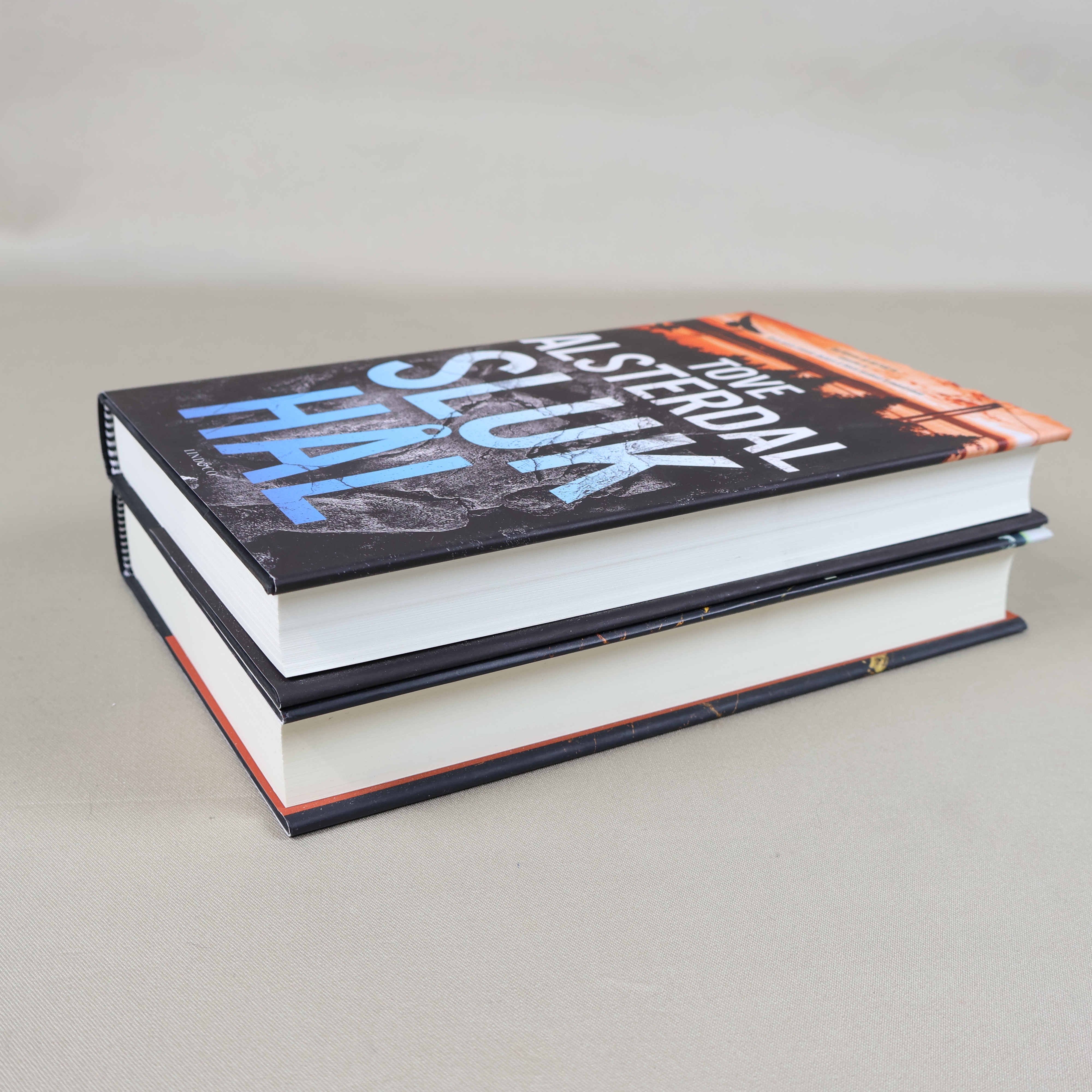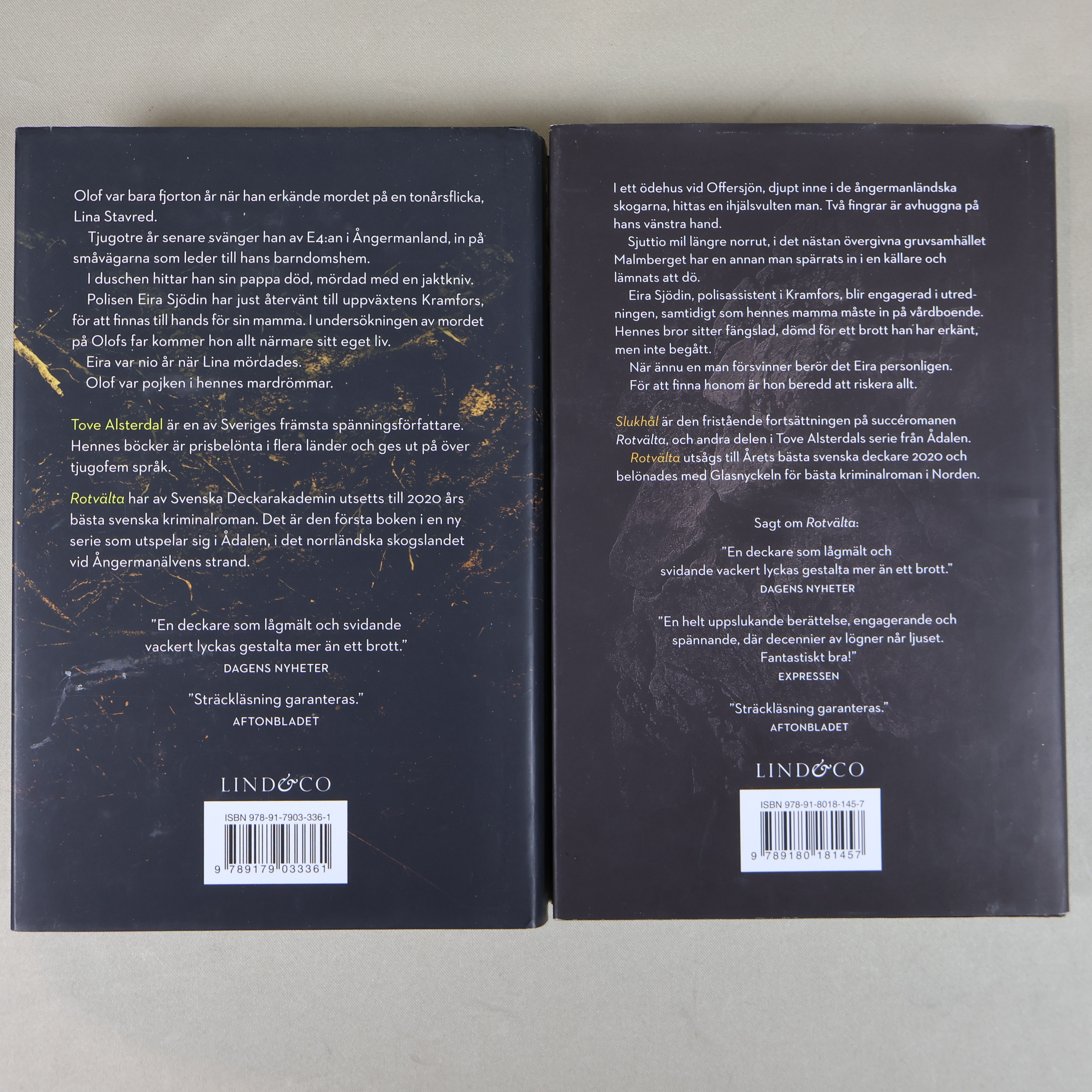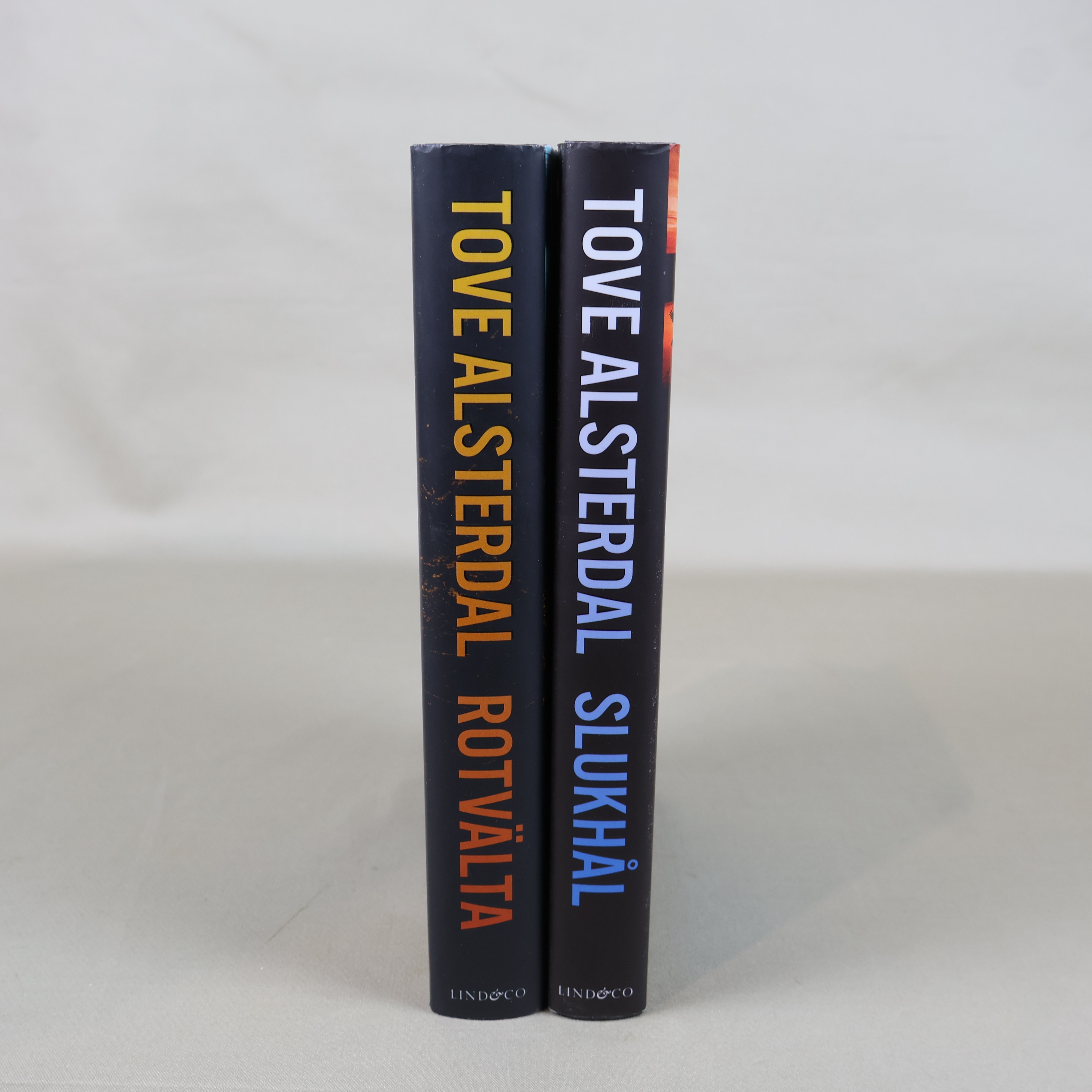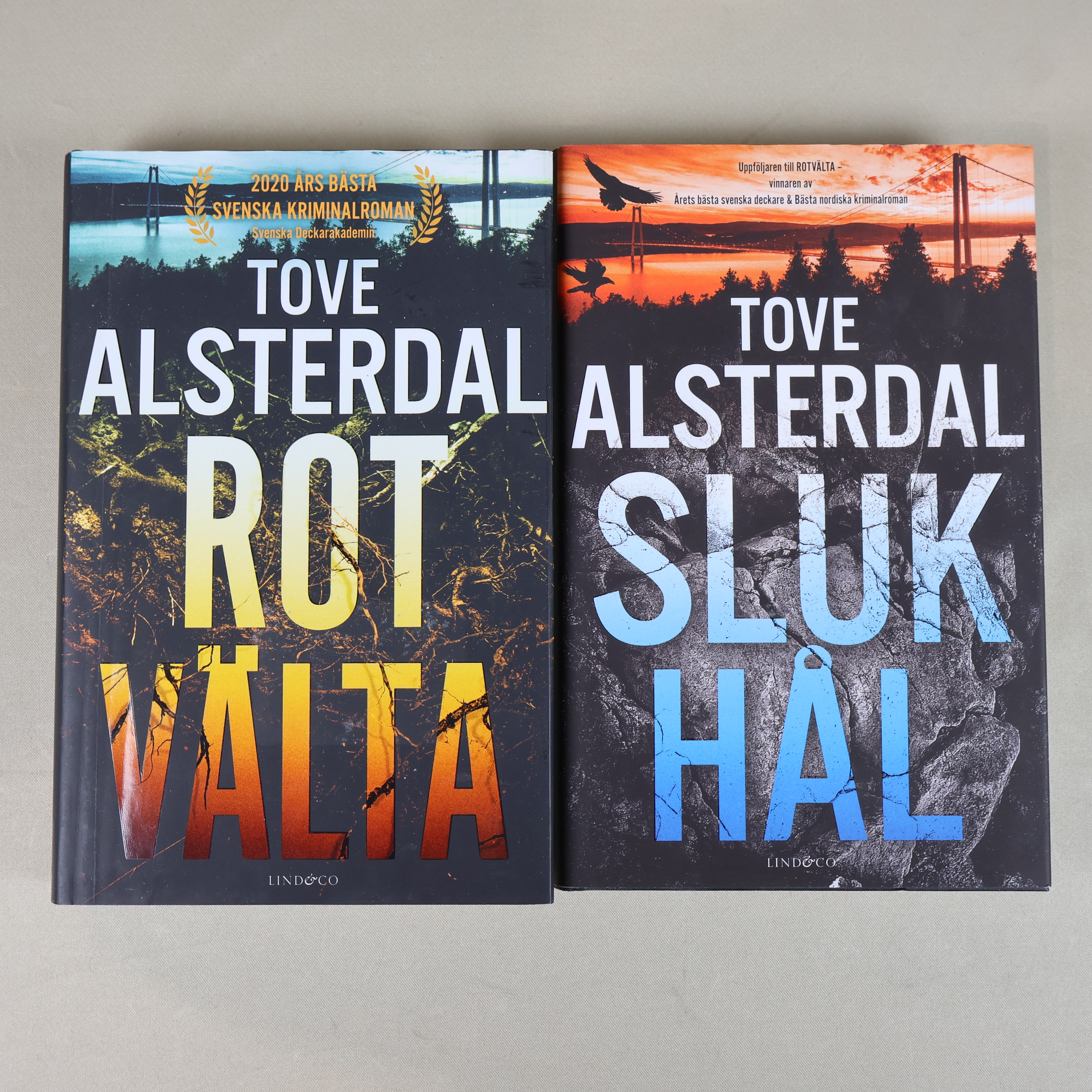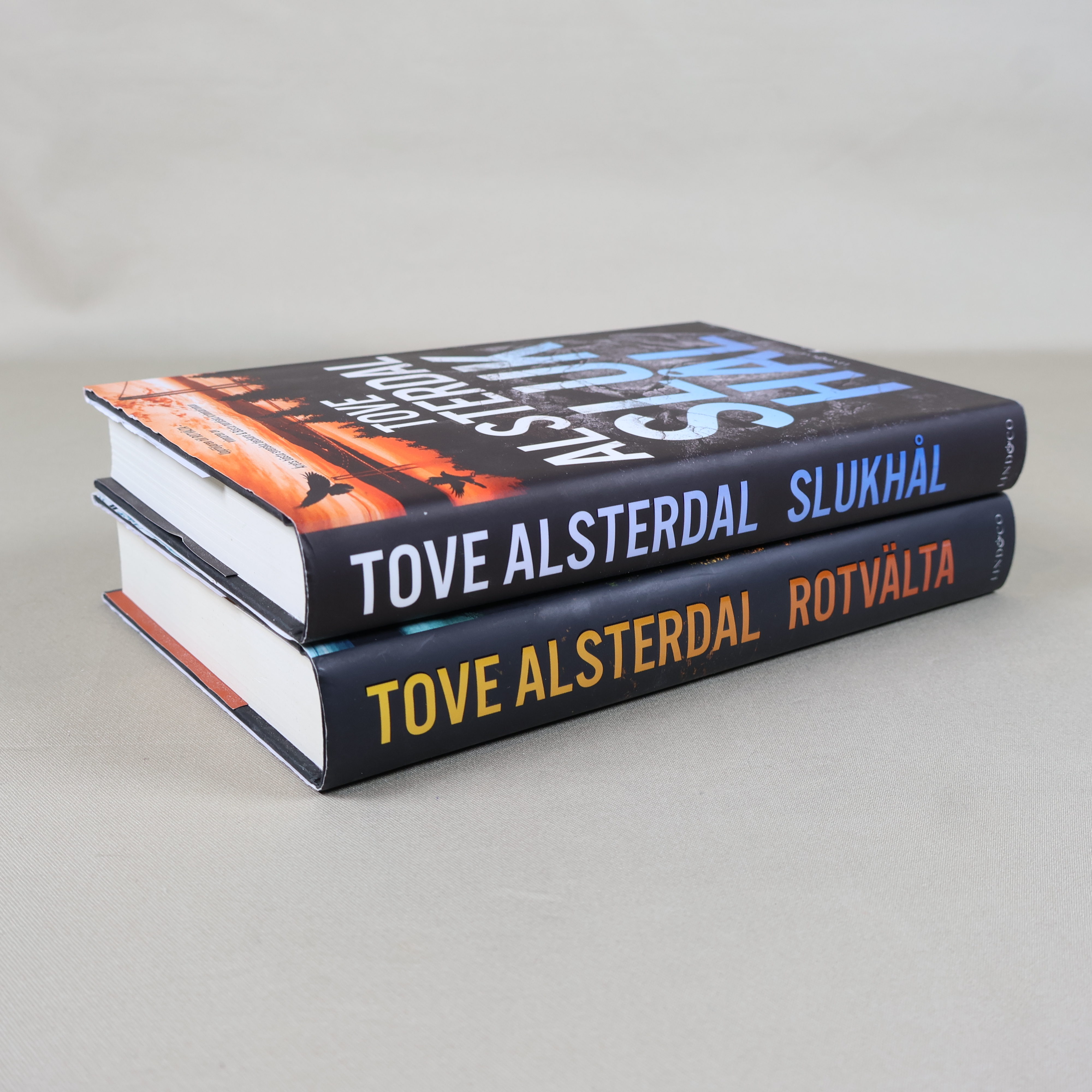 Två spännande kriminalromaner av Tove Alsterdal, Rotvälta och Slukhål, i snygga hårda pärmar. Böckerna bjuder på mörka, suggestiva omslag och ger en riktig nordic noir-känsla. Perfekt för dig som gillar deckare med starka miljöskildringar och detaljerat omslagsarbete.