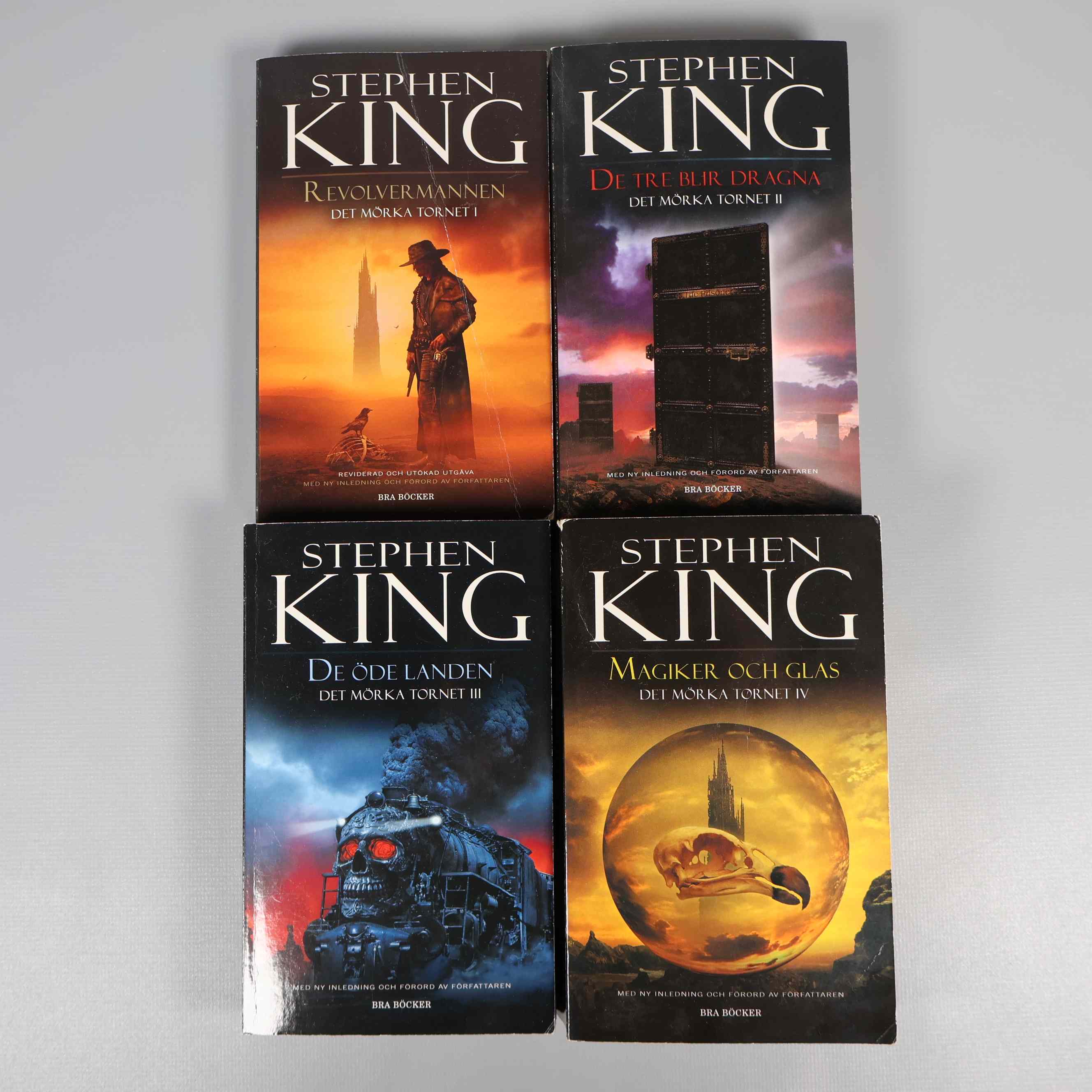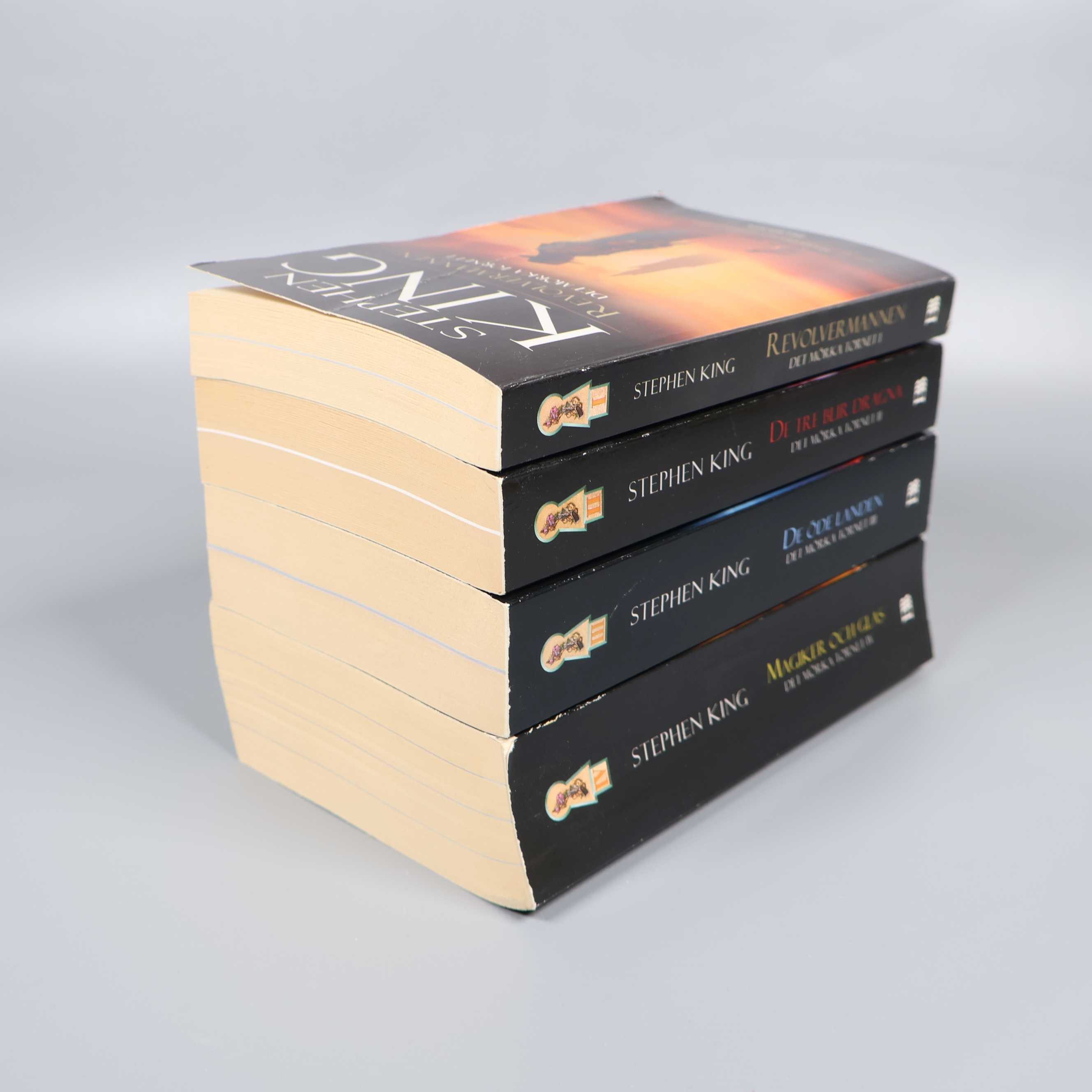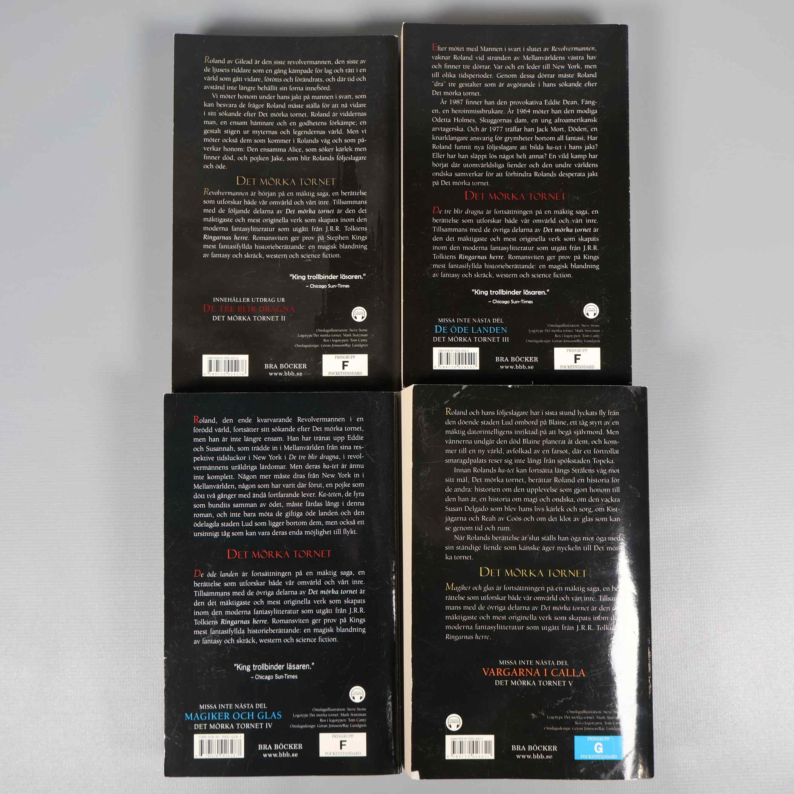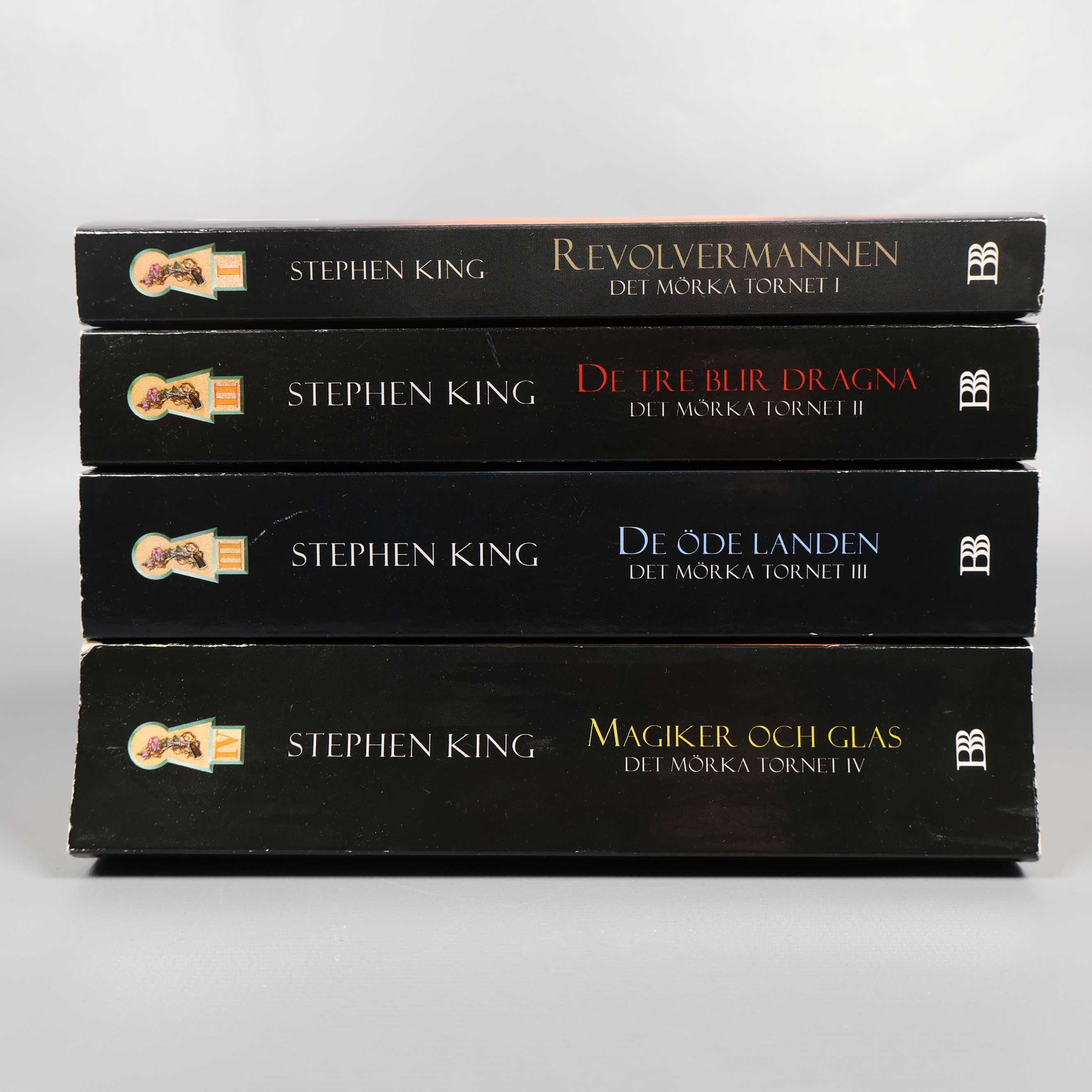 Bokpaket - Stephen King - Det mörka tornet del 1-4 99 kr Product variation Antal st Beskrivning Fyra böcker i serien Det mörka tornet av Stephen King. Visa all beskrivning Boktitel Revolvermannen, De tre blir dragna, De öde landen, Magiker och glas Författare Stephen King ISBN 978-91-7002-427-6, 978-91-7002-454-2, 978-91-7002-628-7, 978-91-7002-662-1 Skick Gott skick Produkten har använts men är av fin kvalitet och ska inte ha några skador eller förslitningar. Läs mer om hur vi bedömer