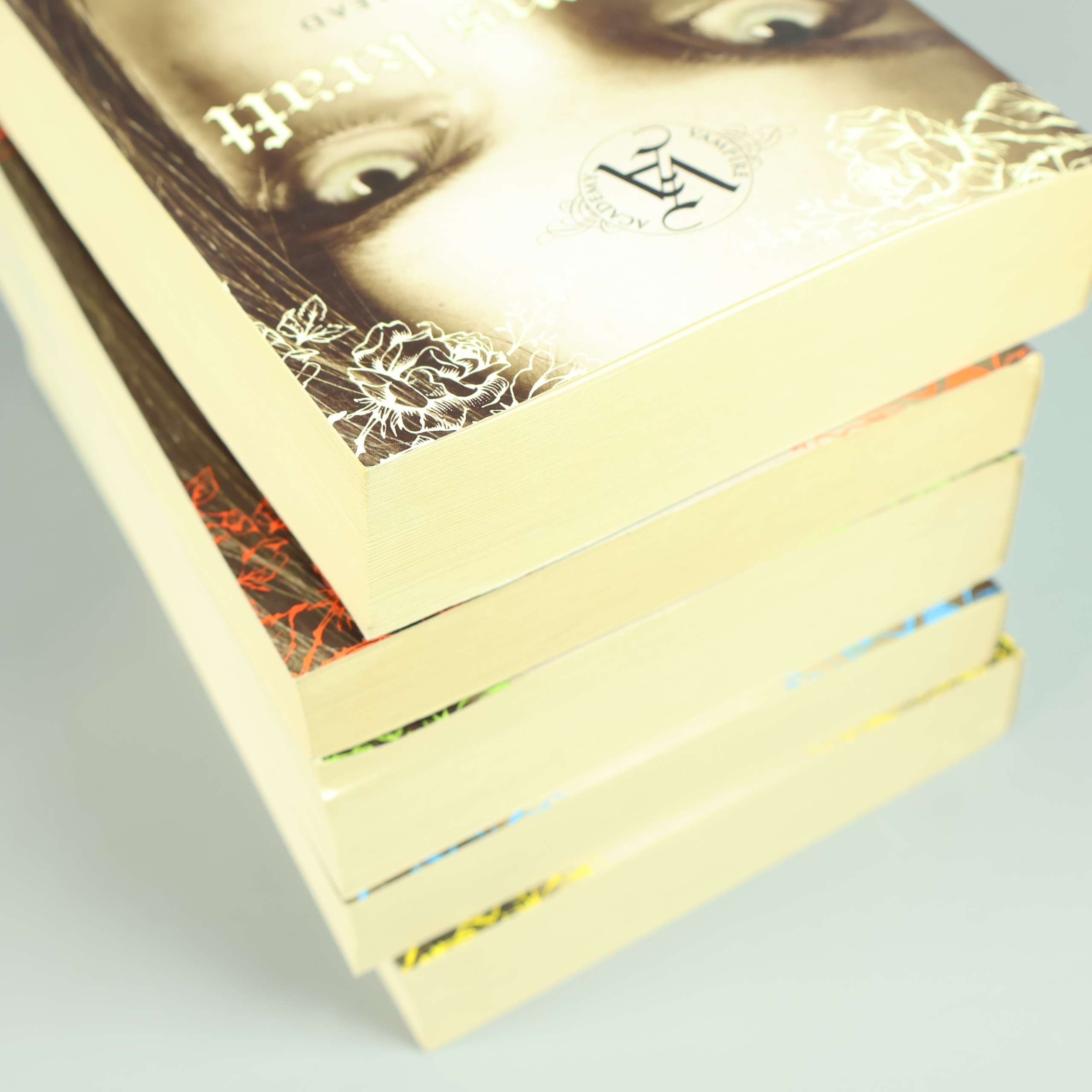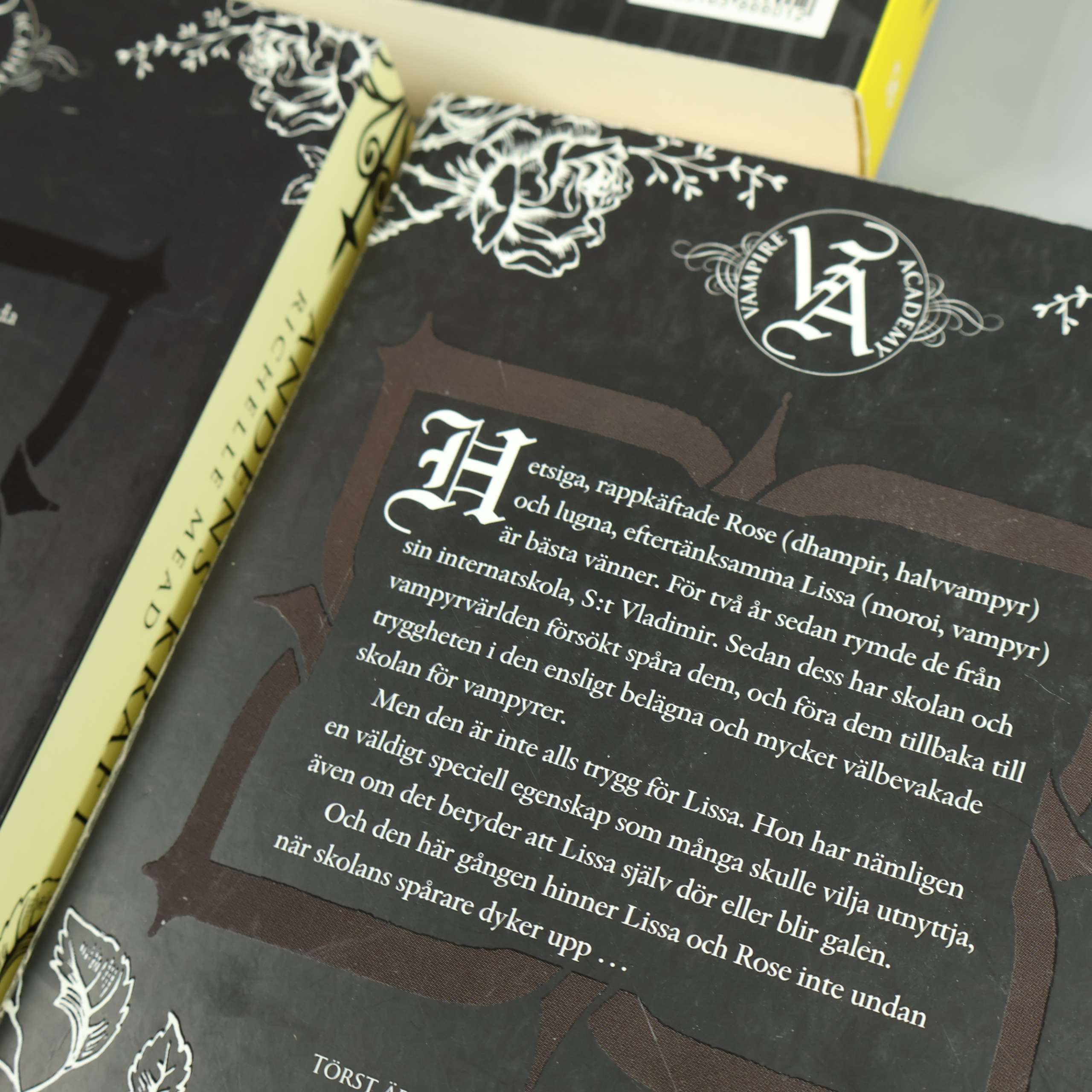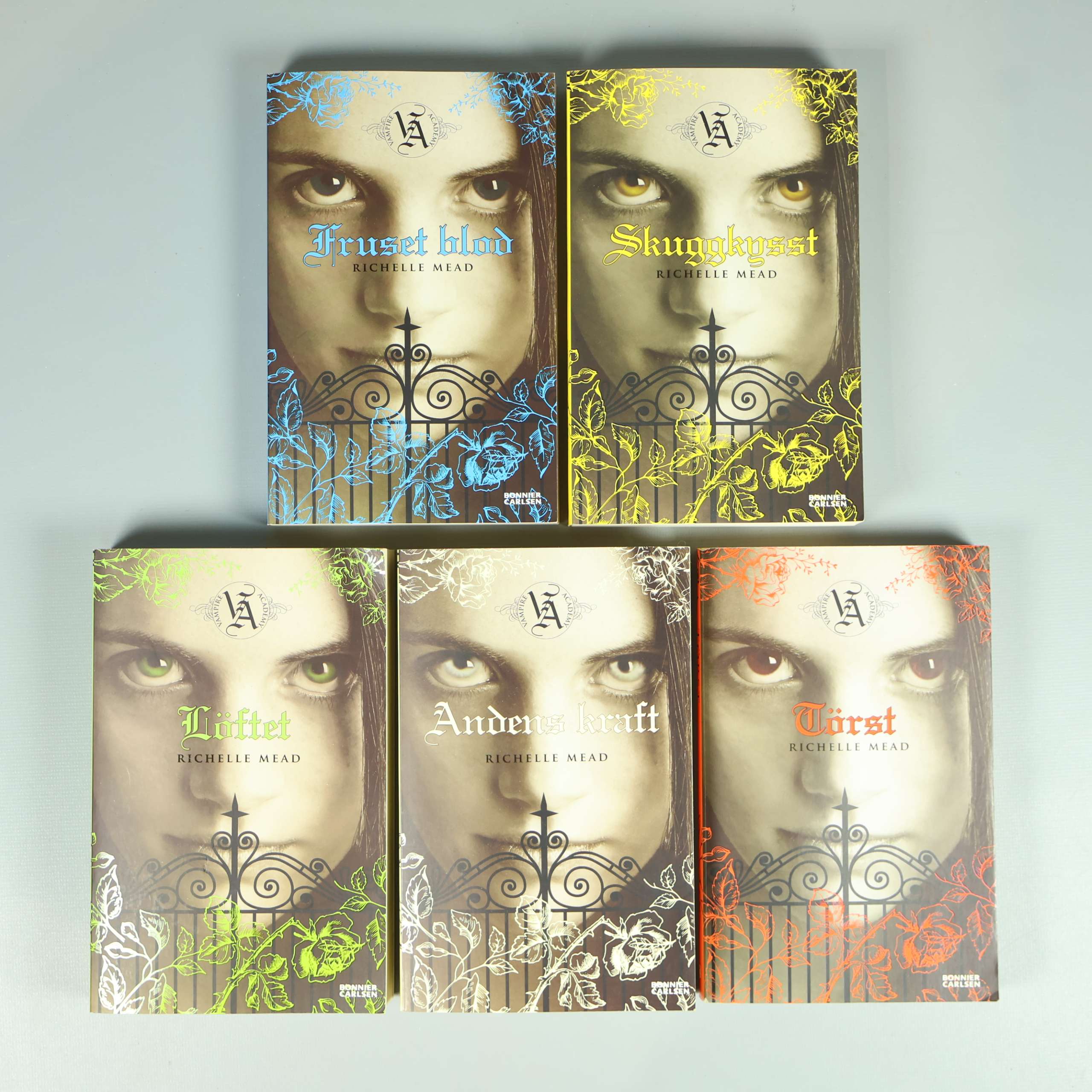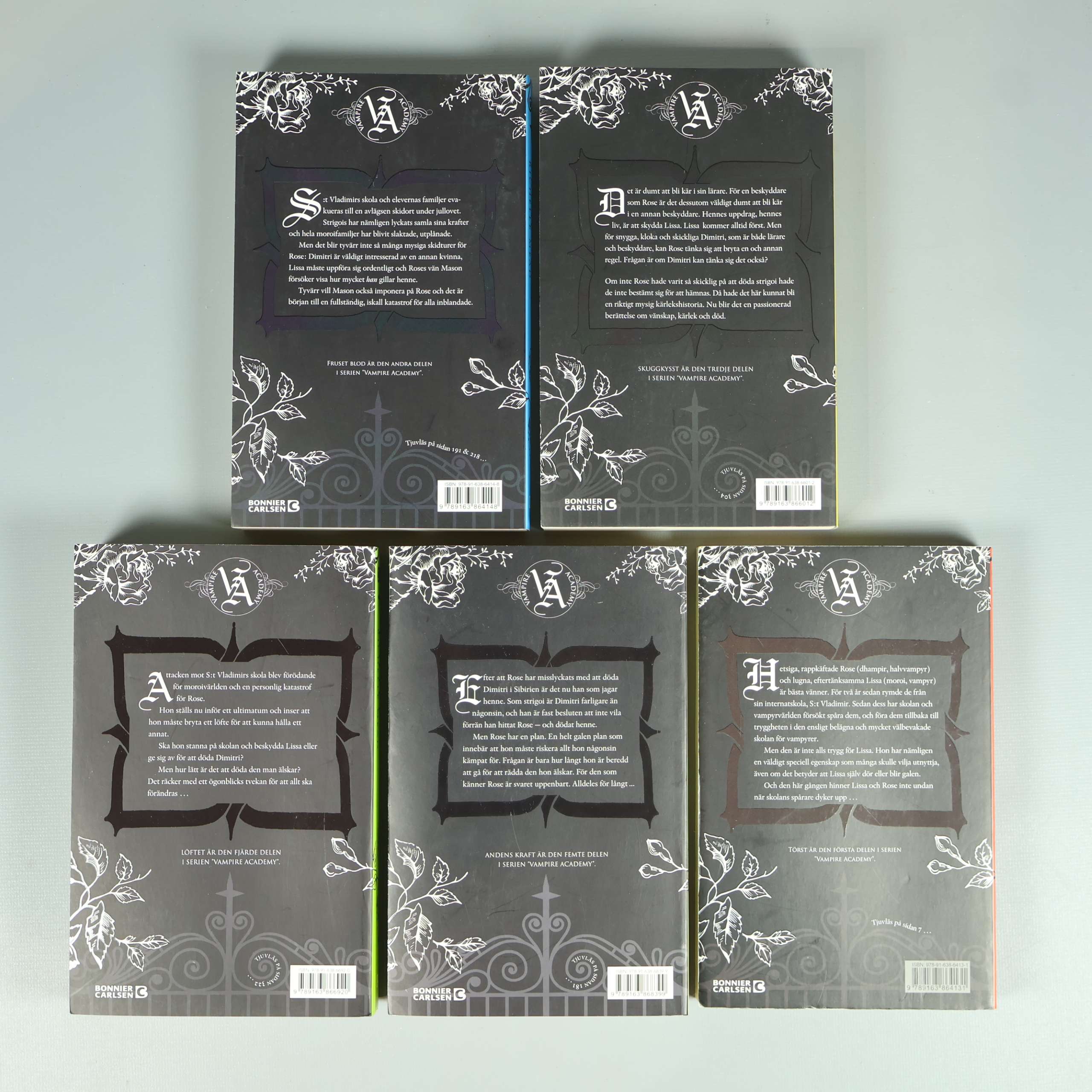Samlat bokpaket med fem böcker från Vampire Academy-serien av Richelle Mead. Färgglada omslag kombineras med stilfull grafisk design och tydliga titlar på ryggen. Perfekt för dig som gillar ungdomsböcker med en touch av fantasy och starka karaktärer. Böckerna känns fräscha och har en snygg, enhetlig look i bokhyllan.