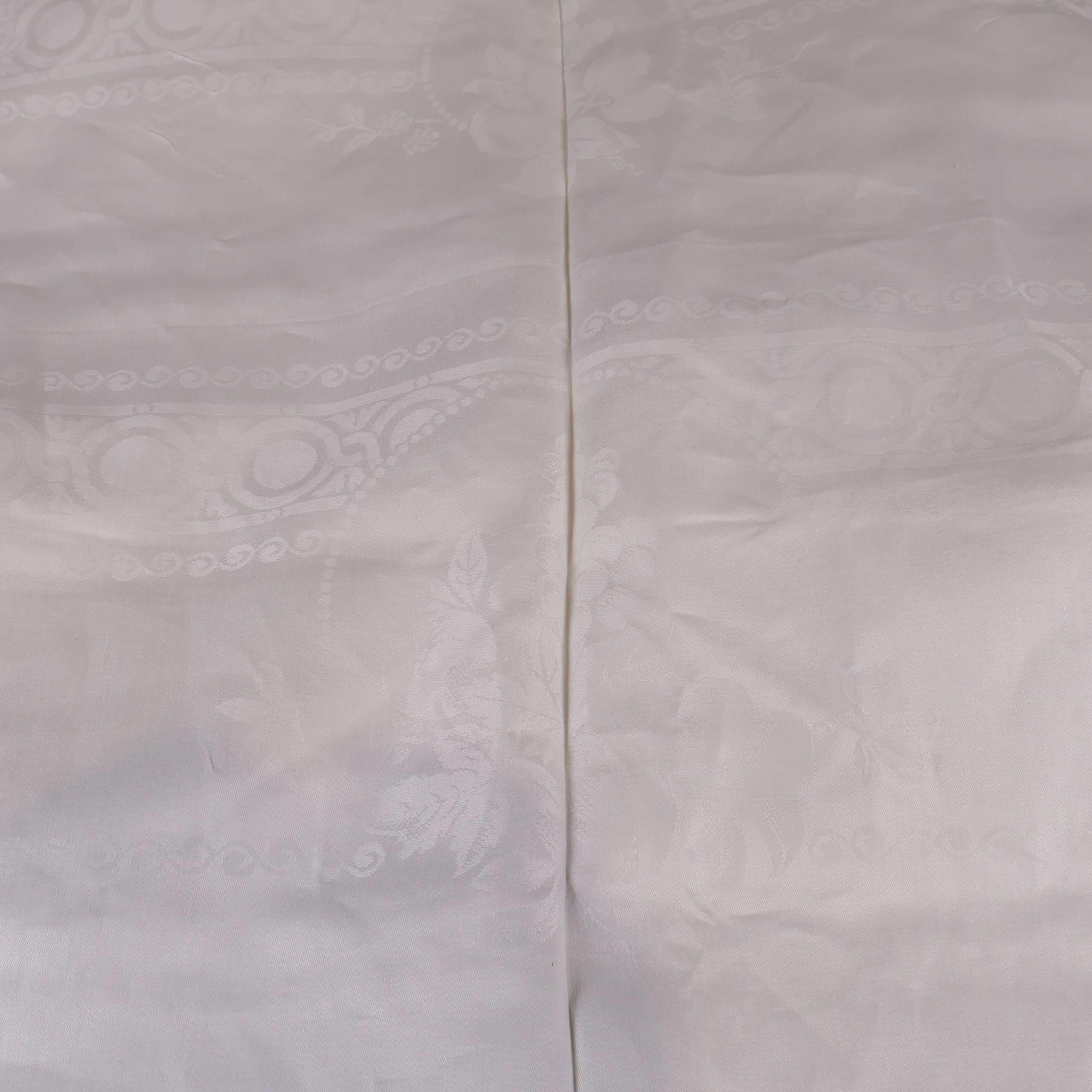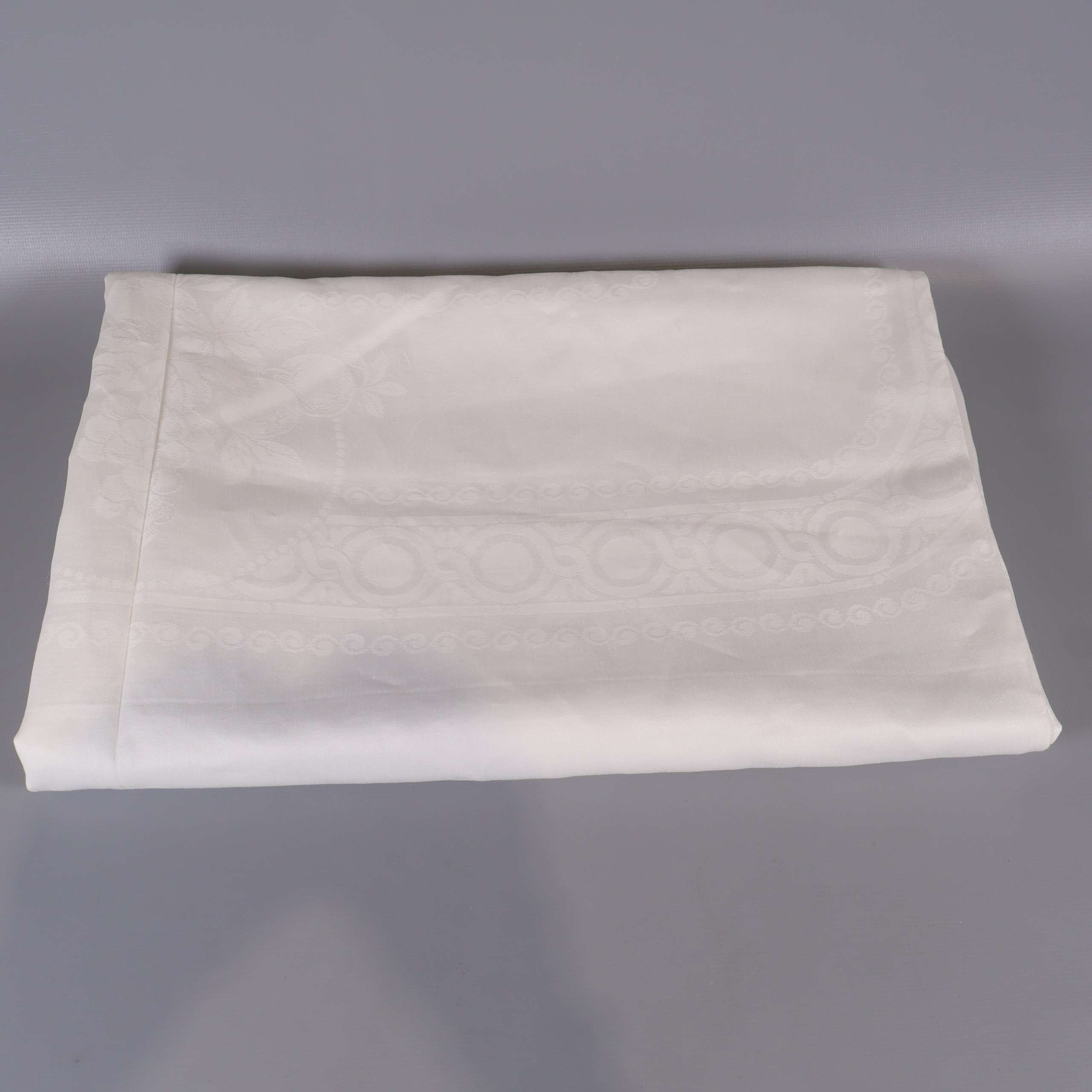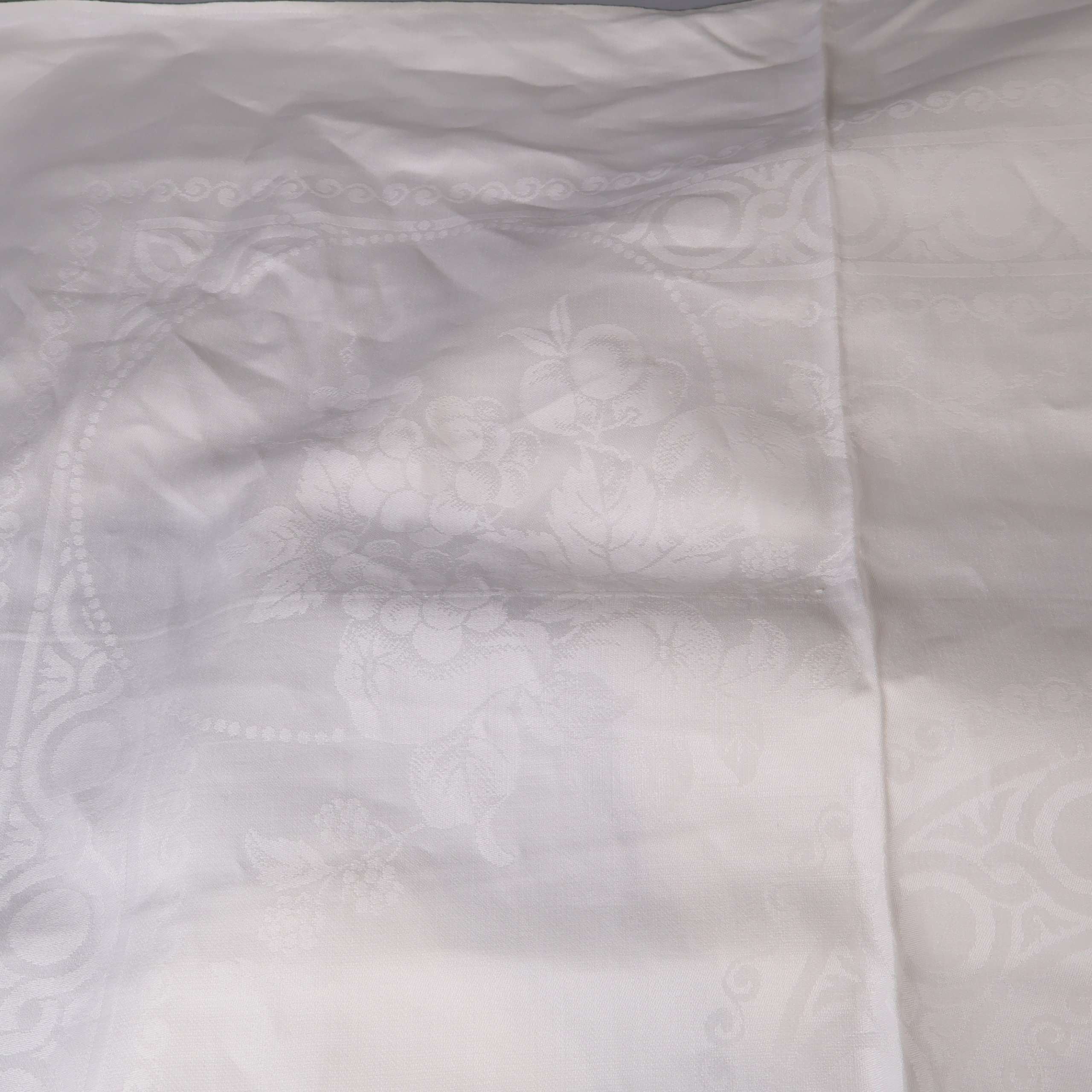 Stor duk i vackert mönstrat tyg med diskreta blommotiv och dekorativa bårder. Den är ljus och ger en klassisk känsla, perfekt för att skapa en inbjudande middagsmiljö. Tidlös design som passar både till vardags och fest.