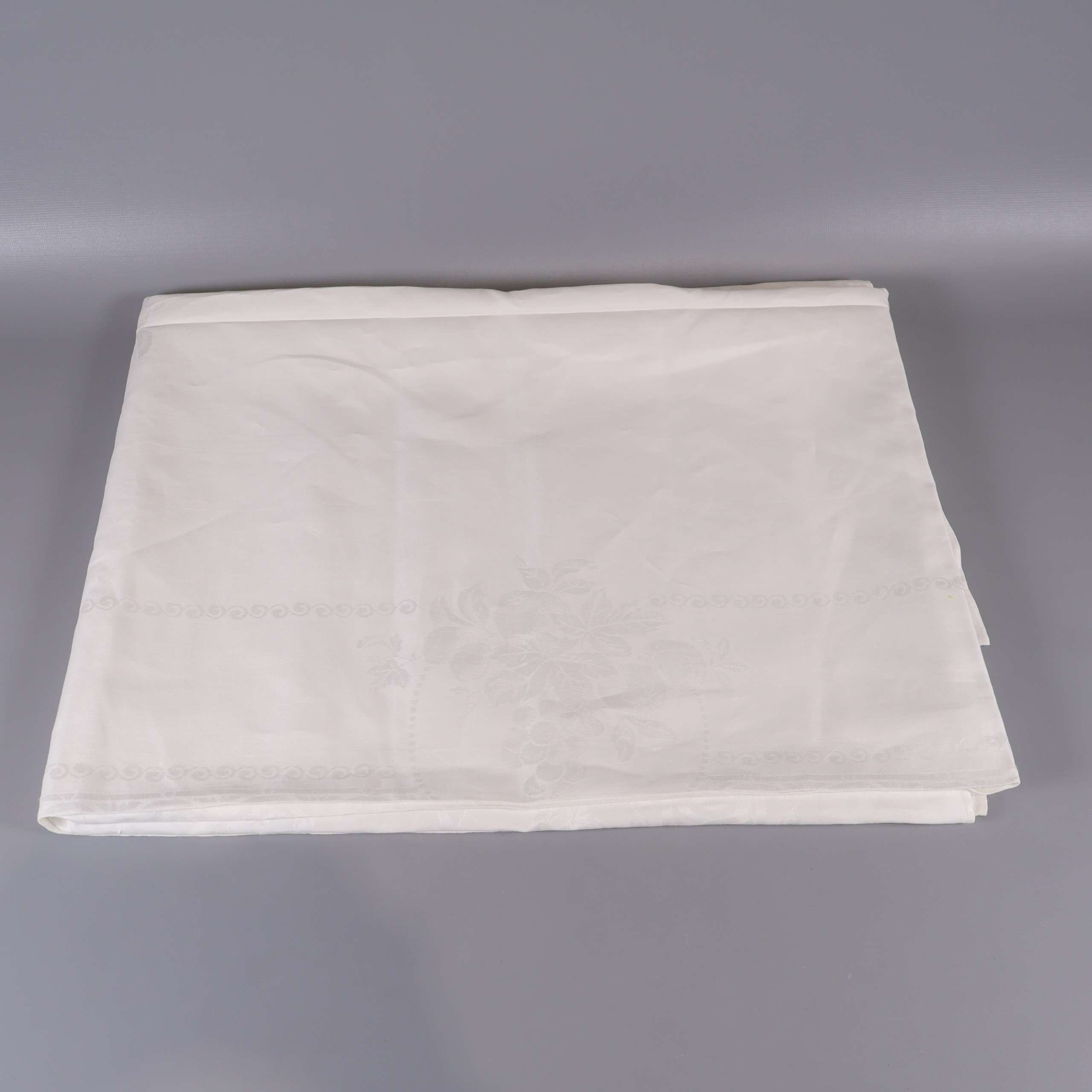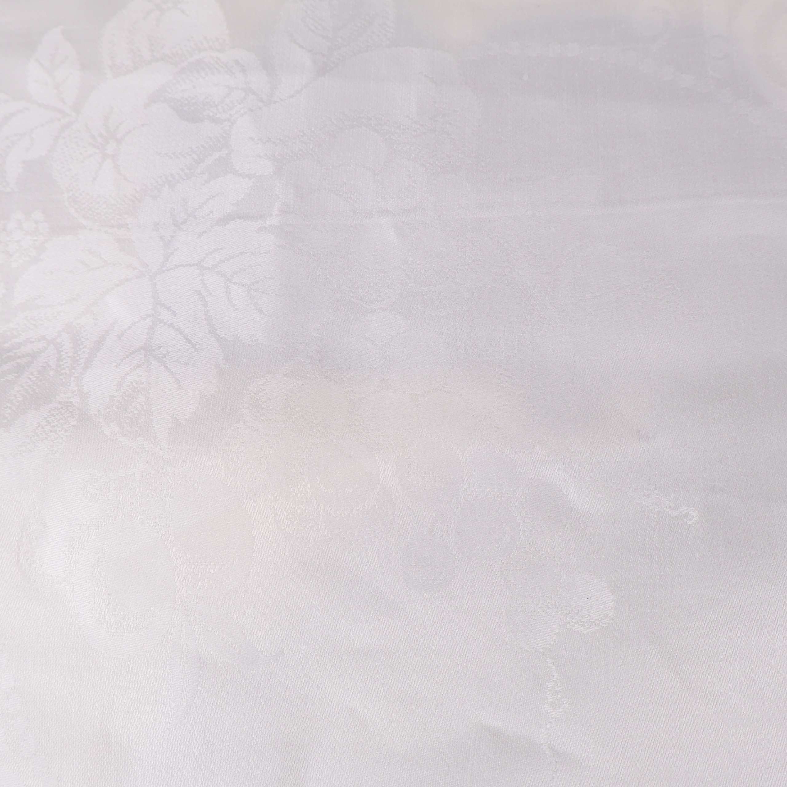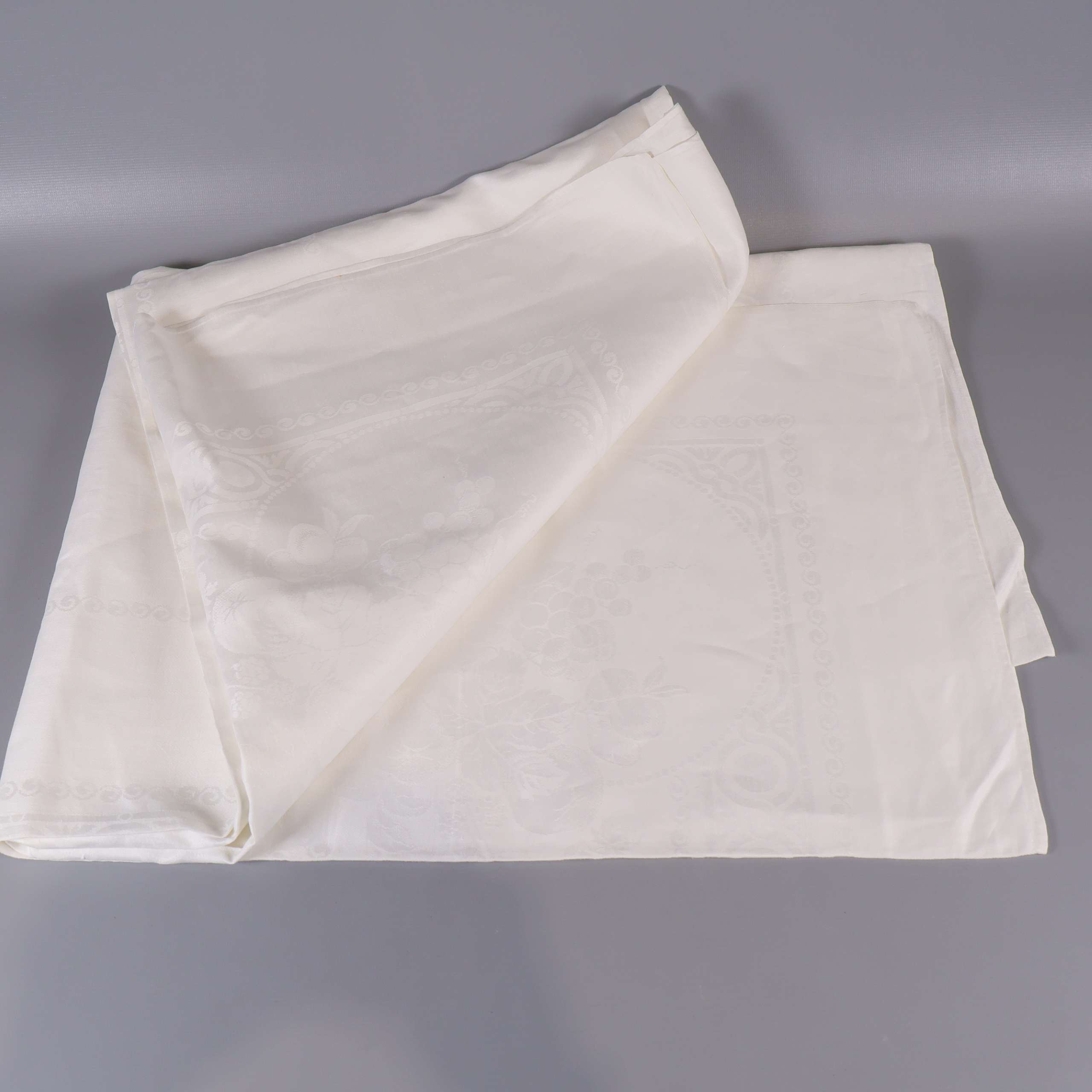Stor duk i vackert mönstrat tyg med diskreta blommotiv och dekorativa bårder. Den är ljus och ger en klassisk känsla, perfekt för att skapa en inbjudande middagsmiljö. Tidlös design som passar både till vardags och fest.
