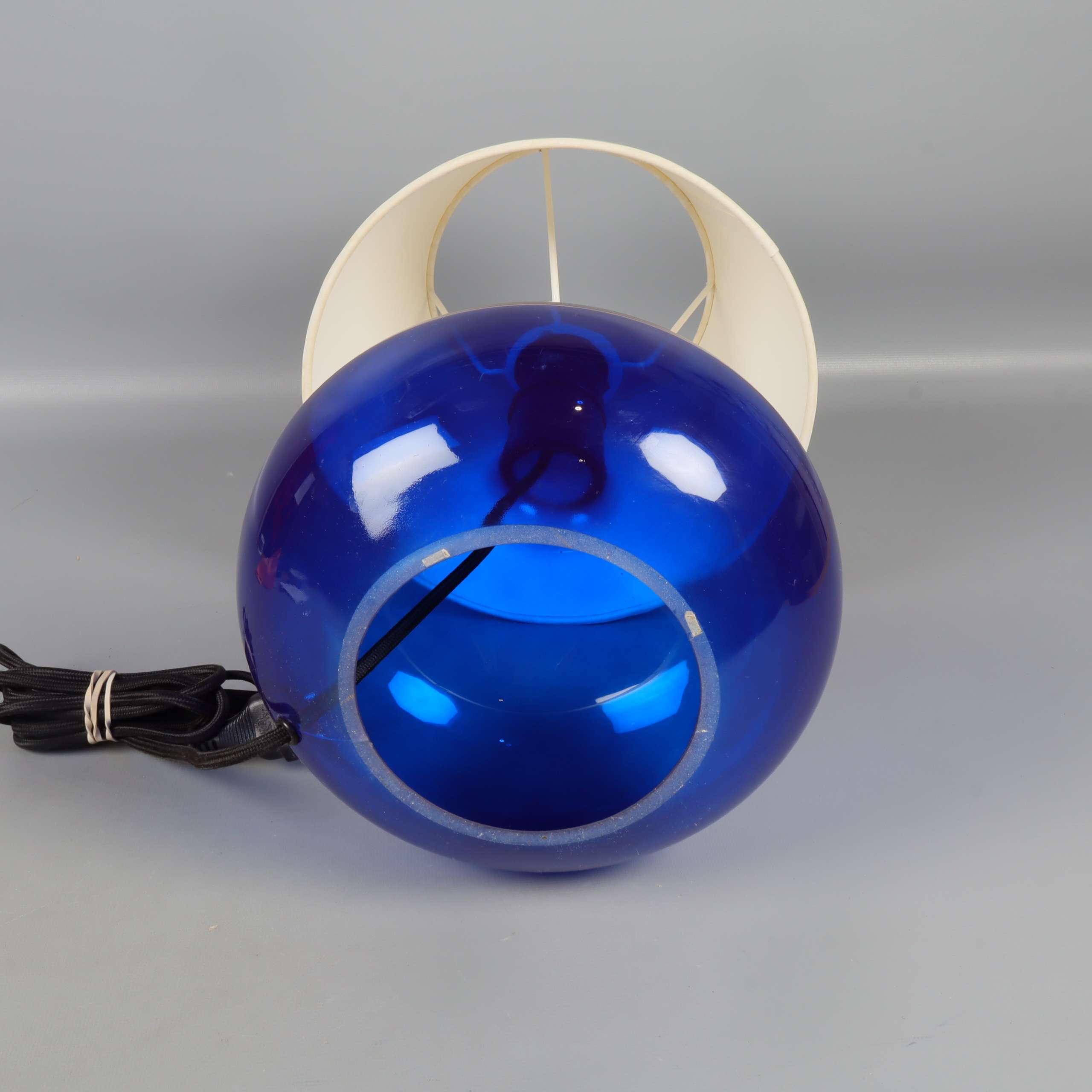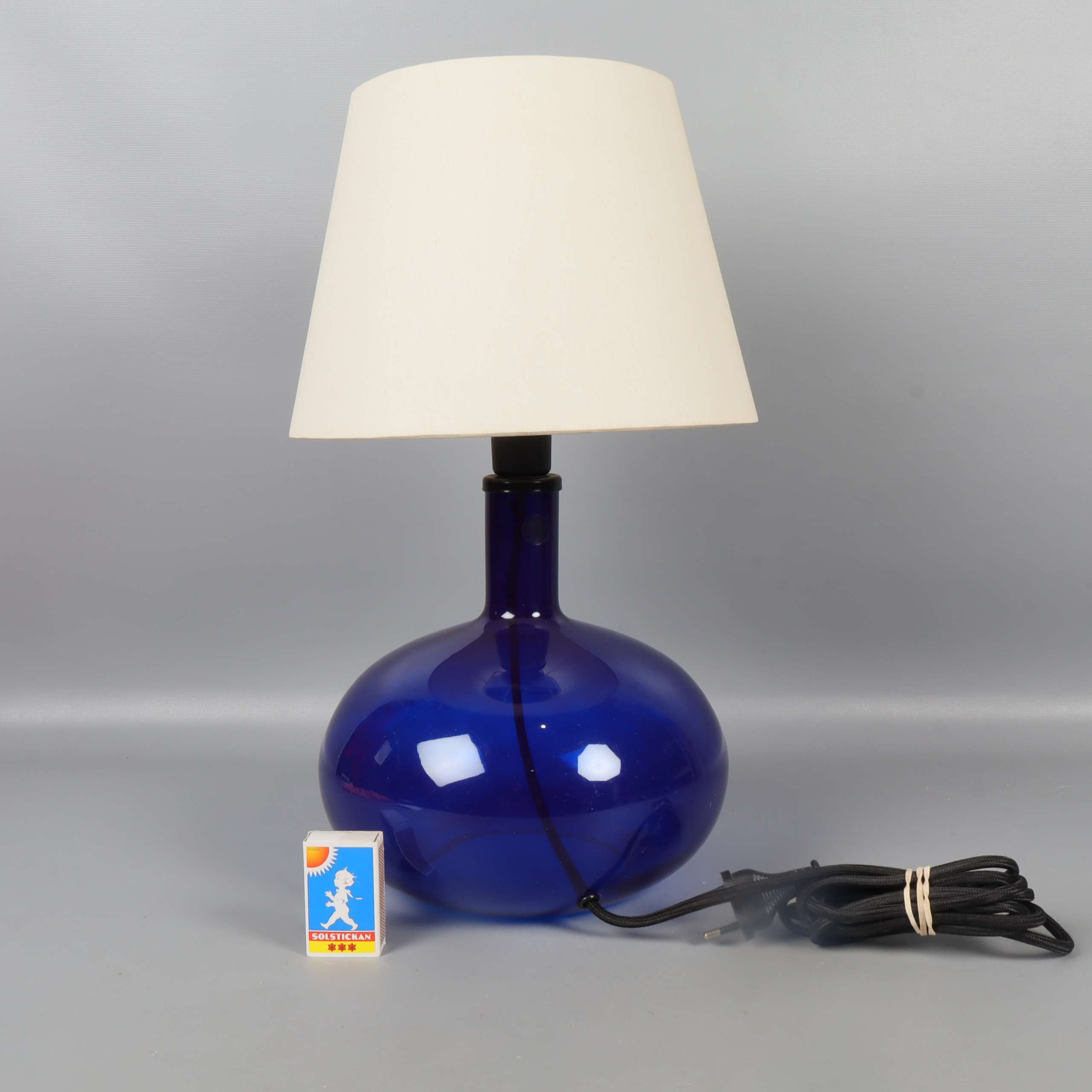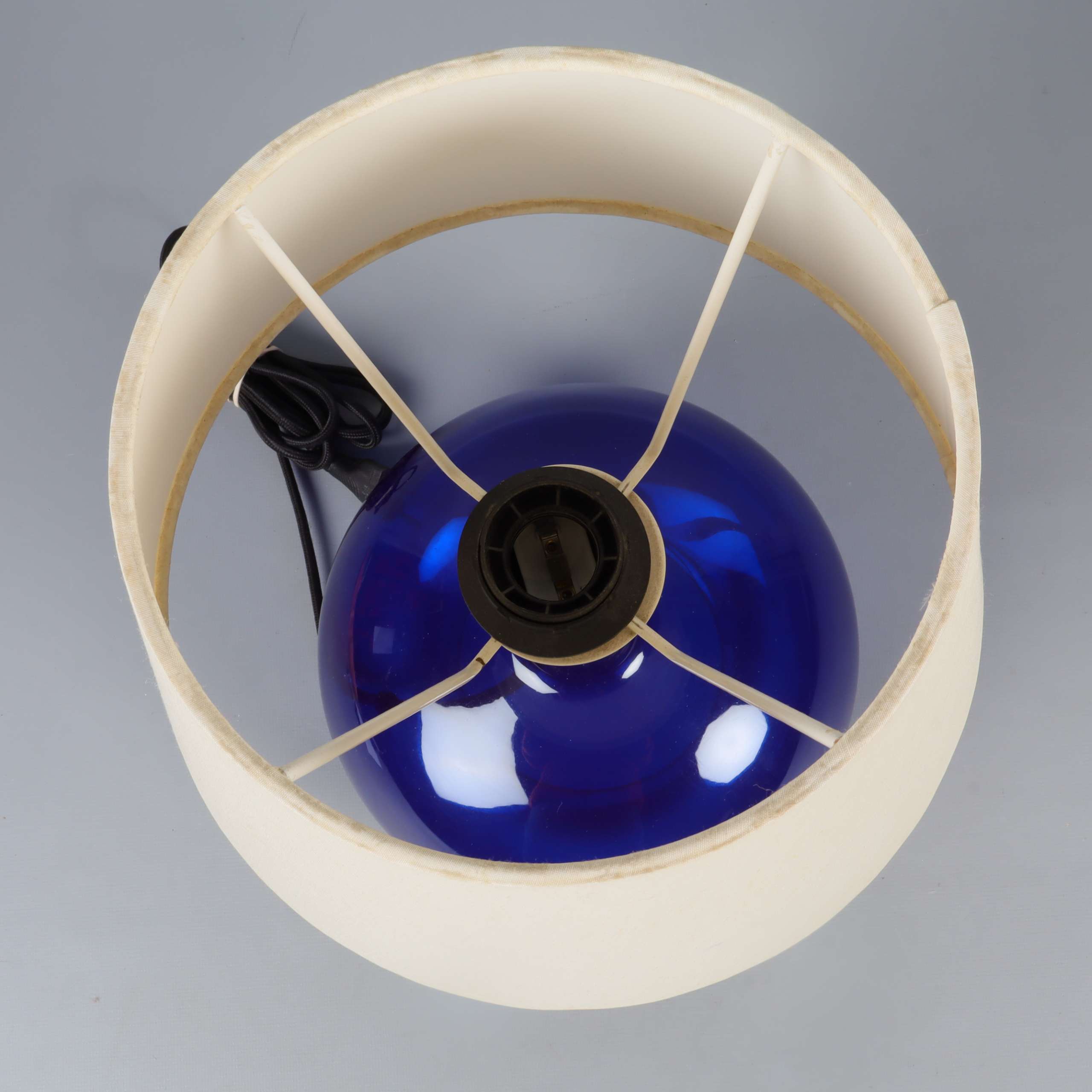 Bordslampa med en djupblå, rund glaskupa och klassisk vit lampskärm som skapar ett modern och stilrent intryck. Lampan har tydliga linjer, svart kabel och passar bra som en färgstark accent i många typer av inredning.