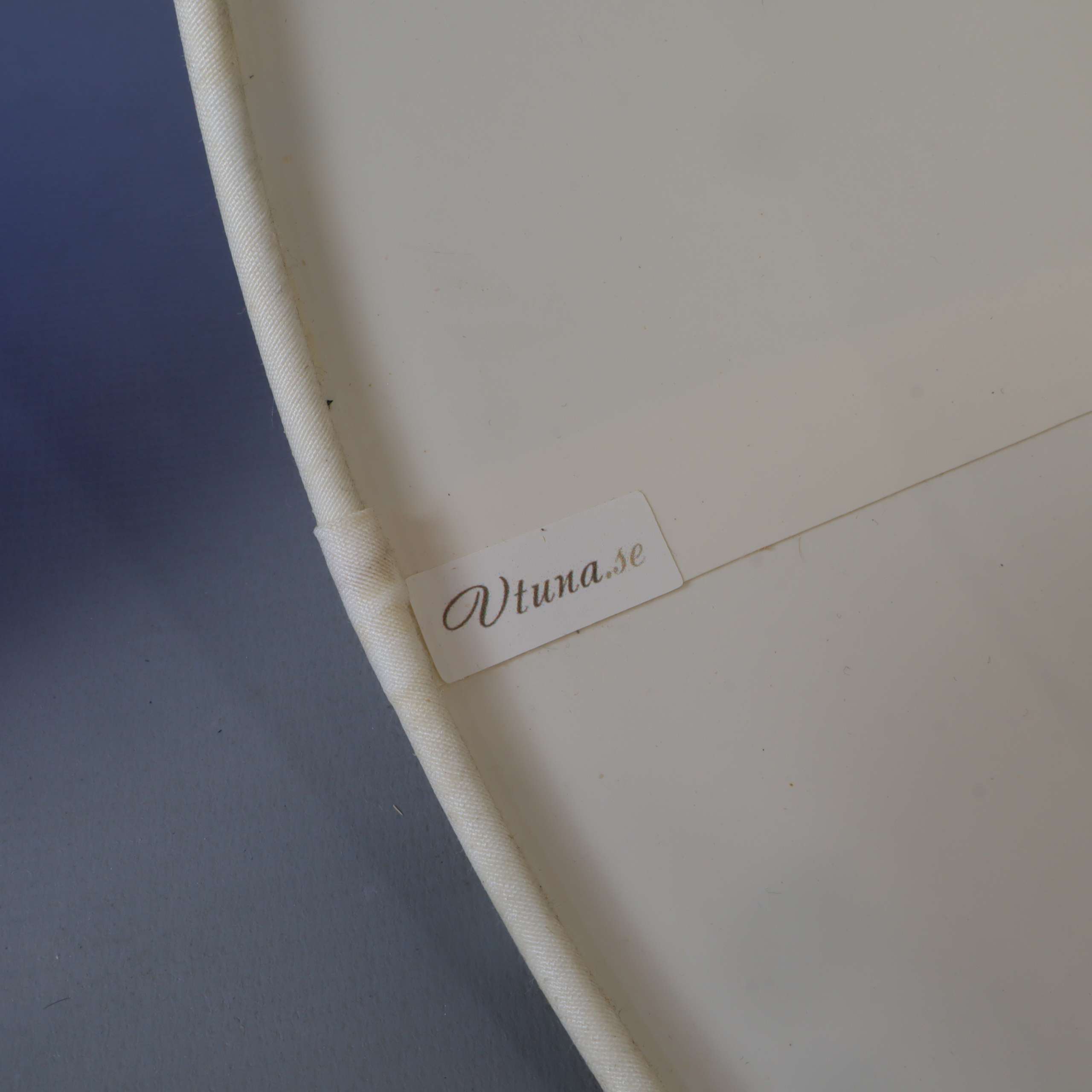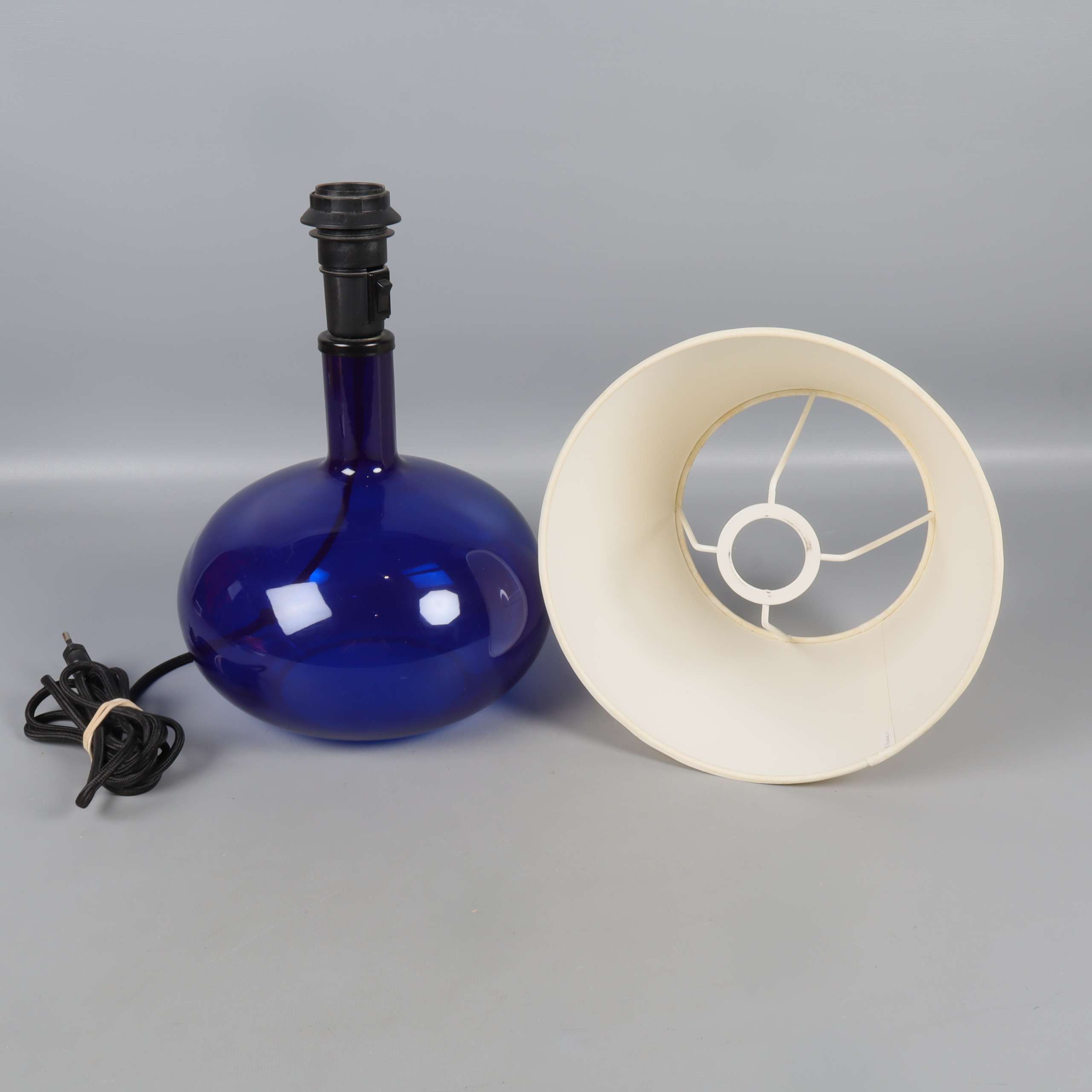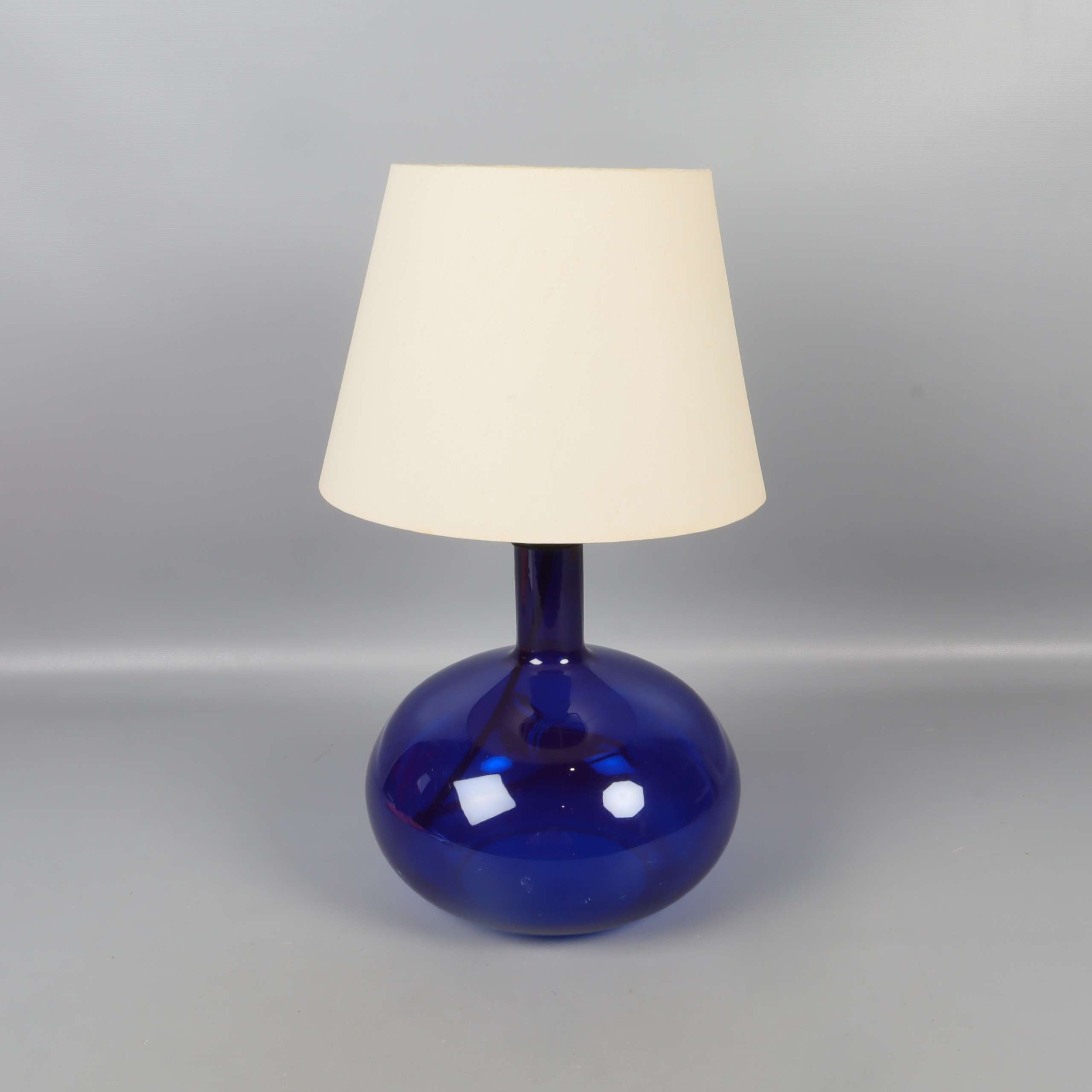 Bordslampa med en djupblå, rund glaskupa och klassisk vit lampskärm som skapar ett modern och stilrent intryck. Lampan har tydliga linjer, svart kabel och passar bra som en färgstark accent i många typer av inredning.