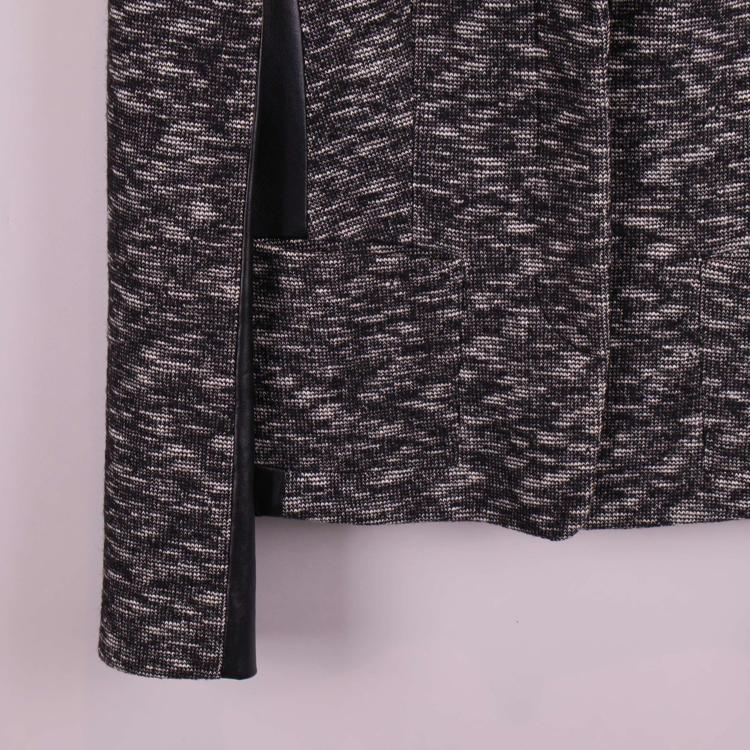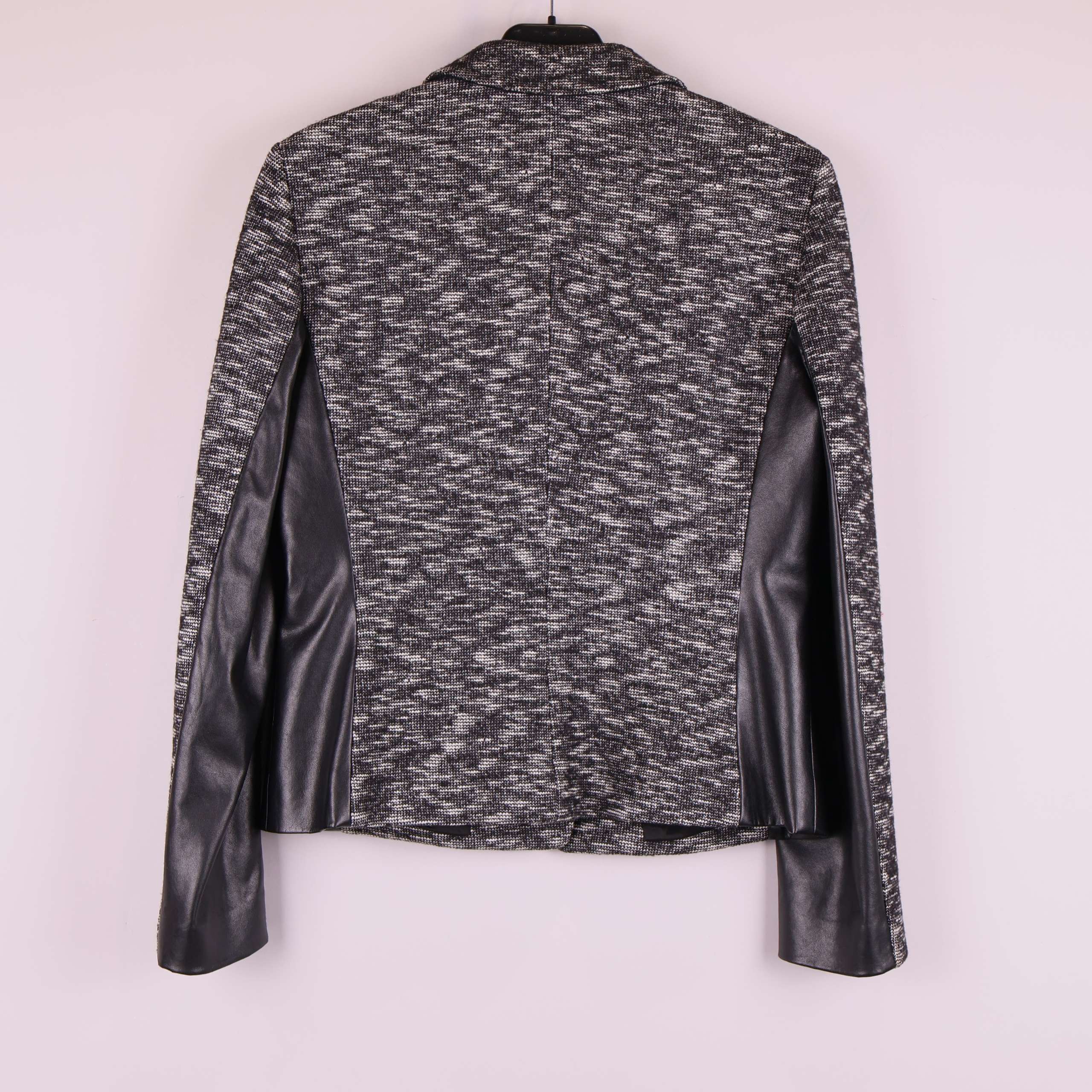 Trendig kavaj med stickad look i svart och grått, kombinerat med snygga skinnliknande paneler längs sidor och ärmar. Figursydd passform och klassisk krage ger en stilren känsla. Praktiska fickor framtill och en mjukt fodrad insida som höjer komforten, perfekt för dig som gillar en modern twist på dressade plagg.