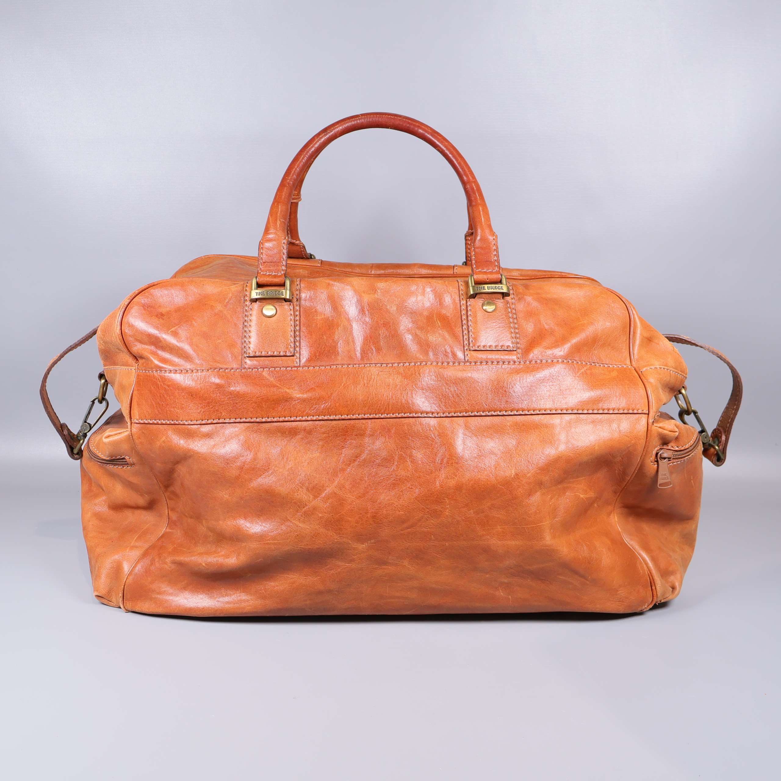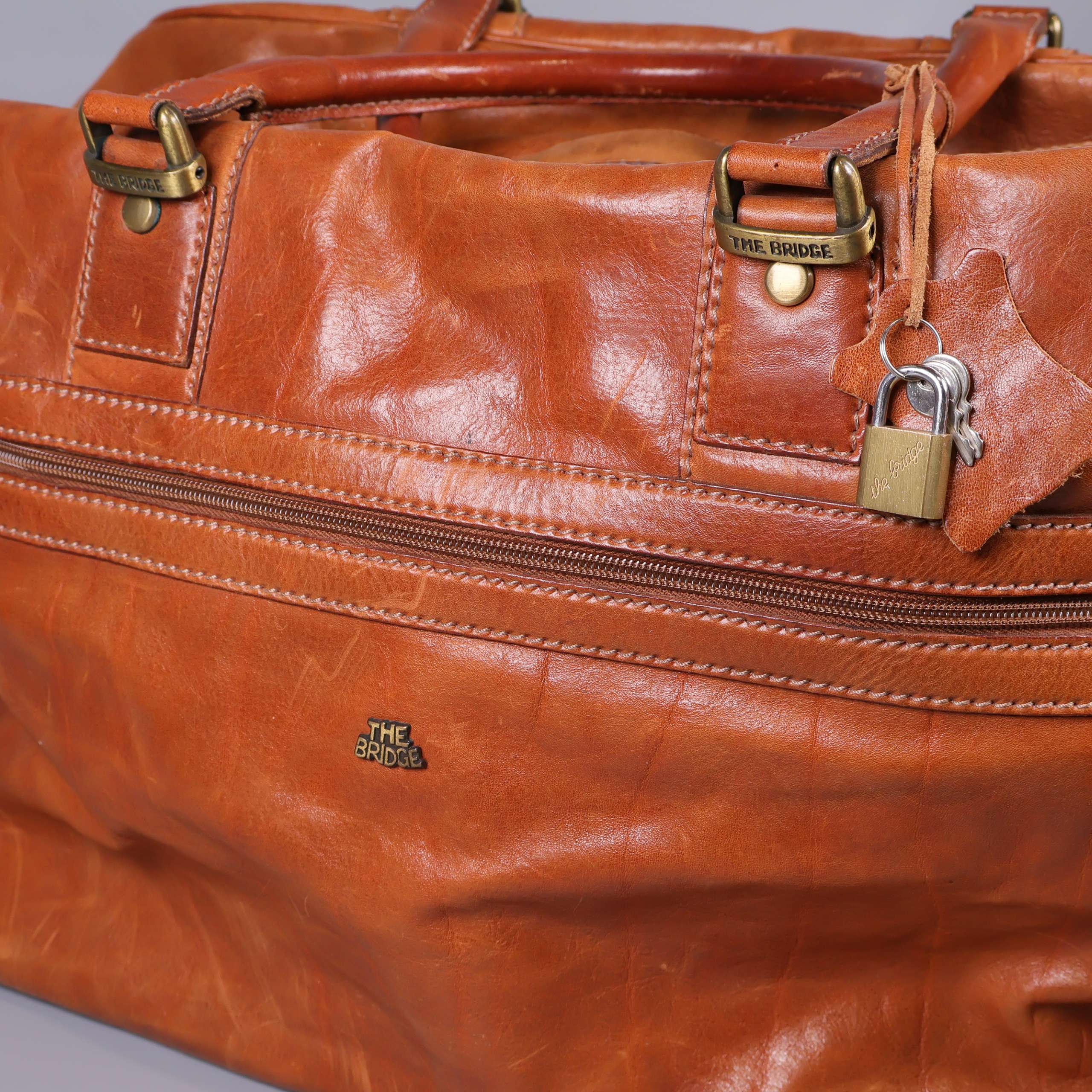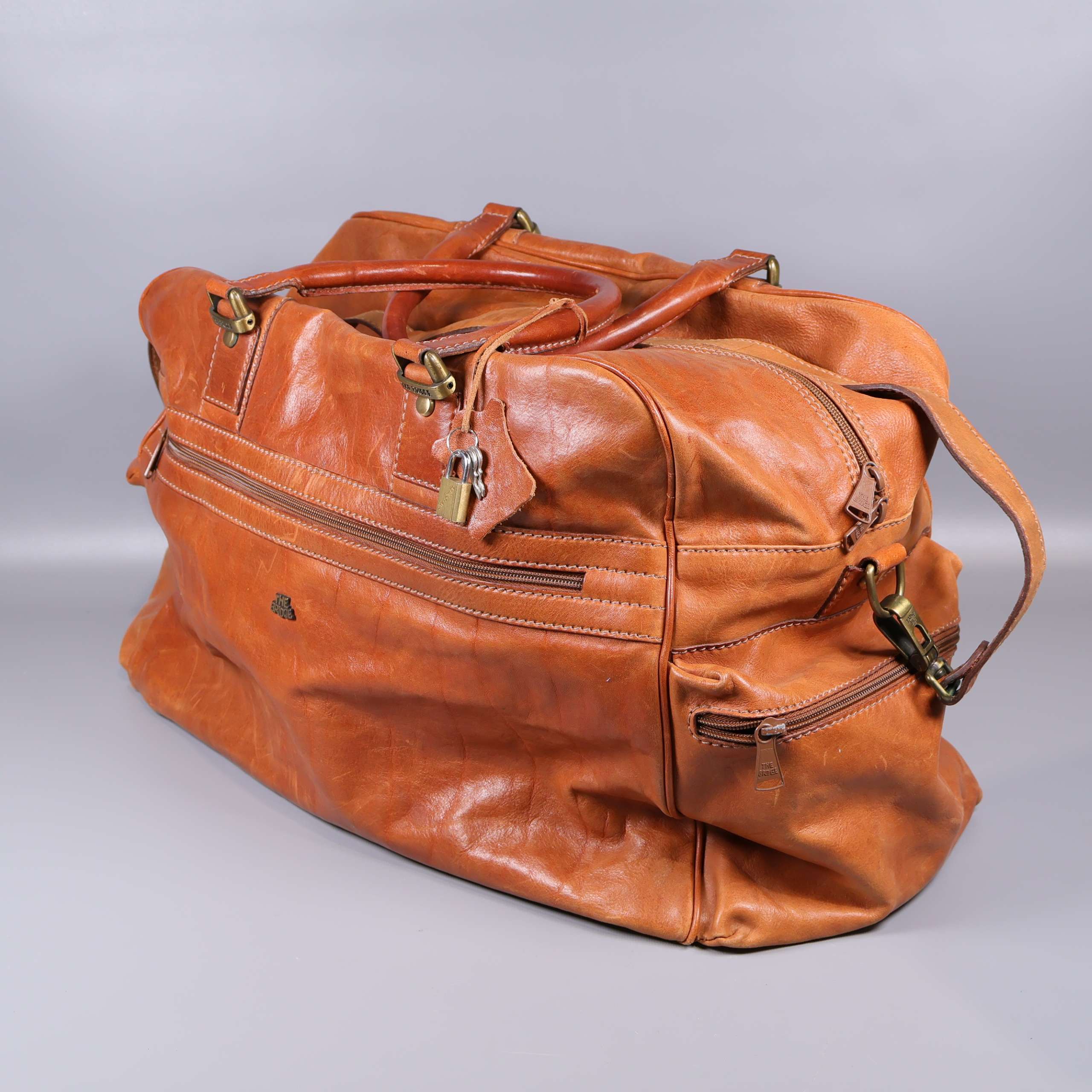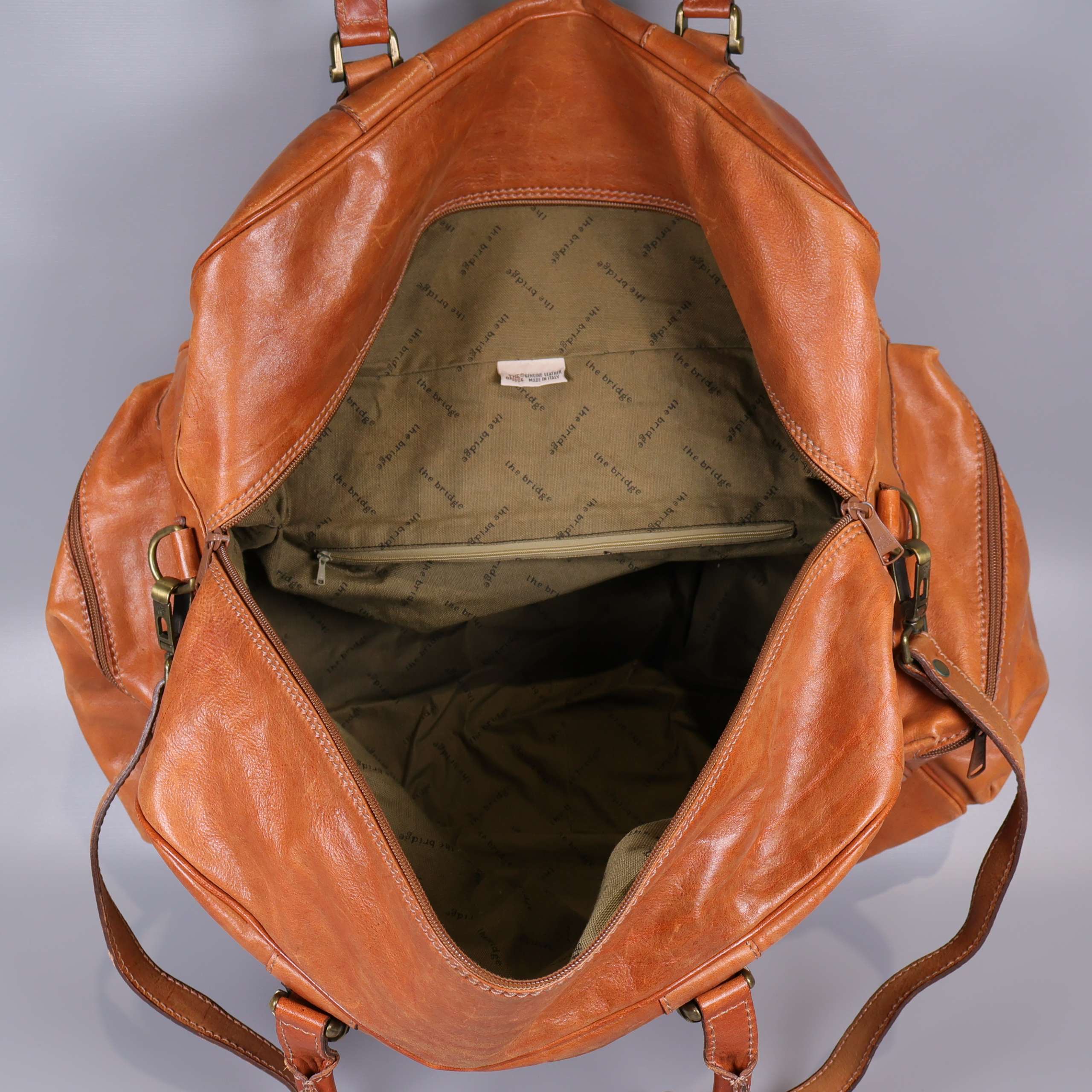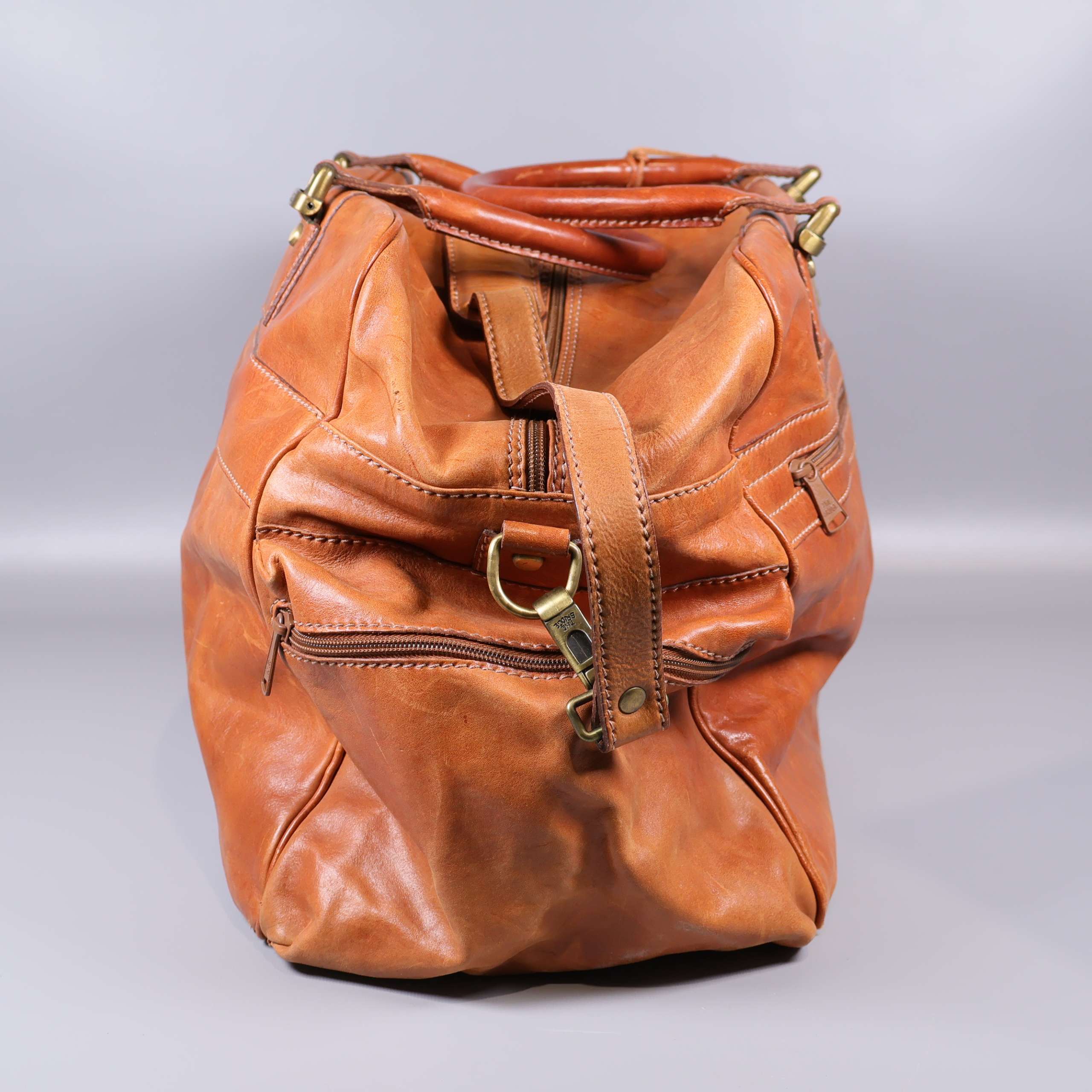 Rymlig weekendbag i cognacsfärgat äkta läder med vacker vintage vibe. Utrustad med robusta handtag, avtagbar axelrem och flera praktiska ytterfack med dragkedja. Inuti finns ett stort huvudfack och extra fickor för smidig organisering. Detaljer i guldfärgad metall och stabil botten med metallfötter ger en exklusiv känsla och extra hållbarhet.