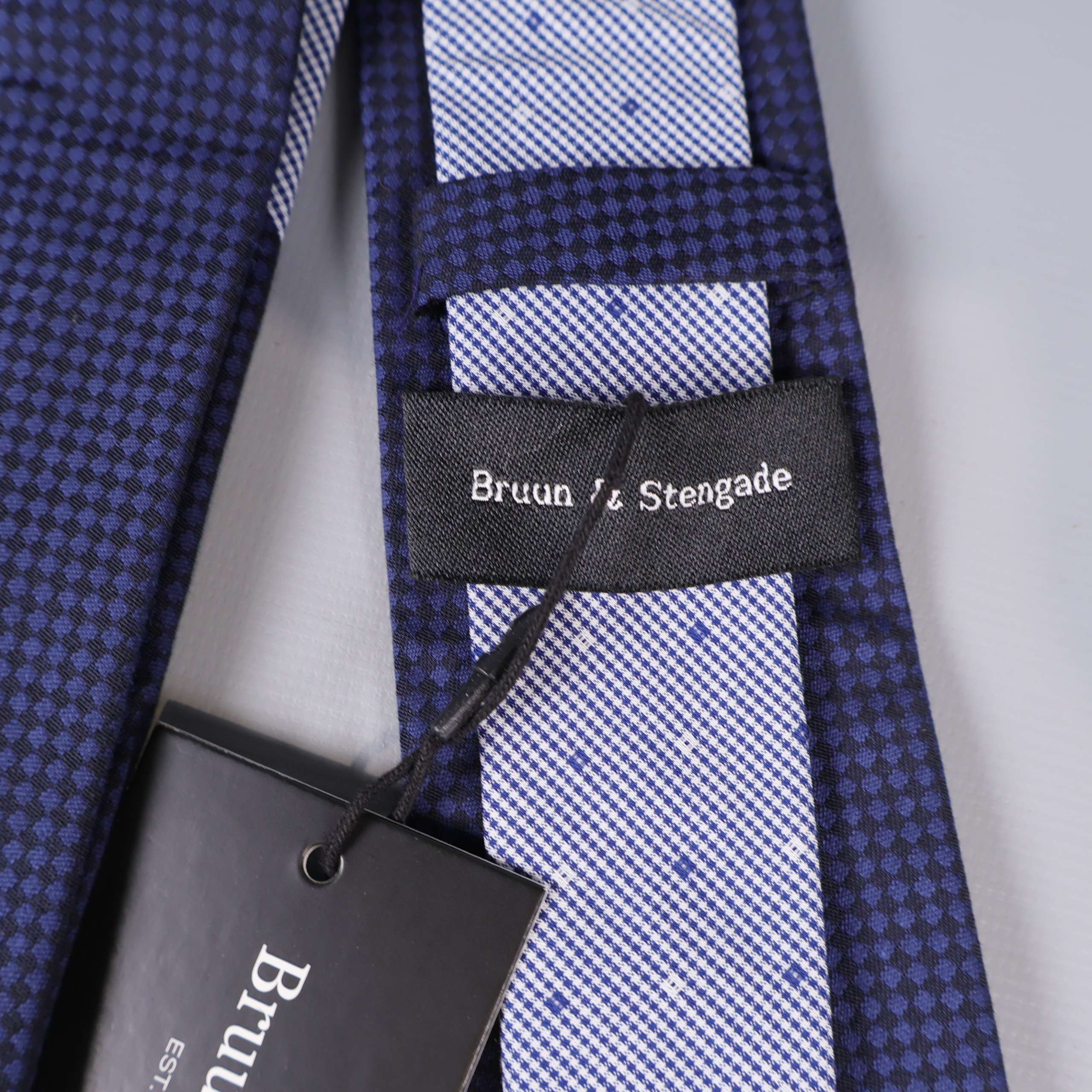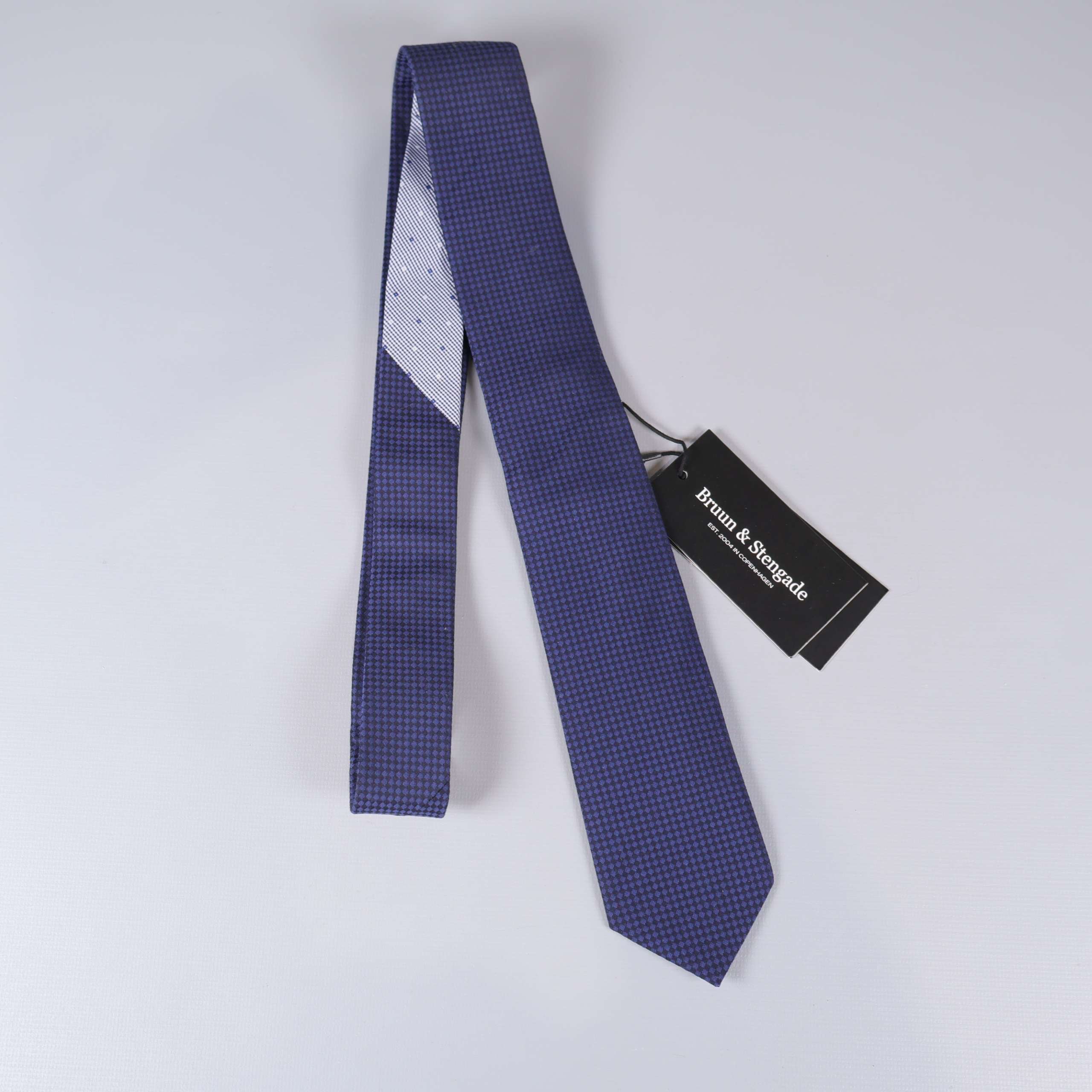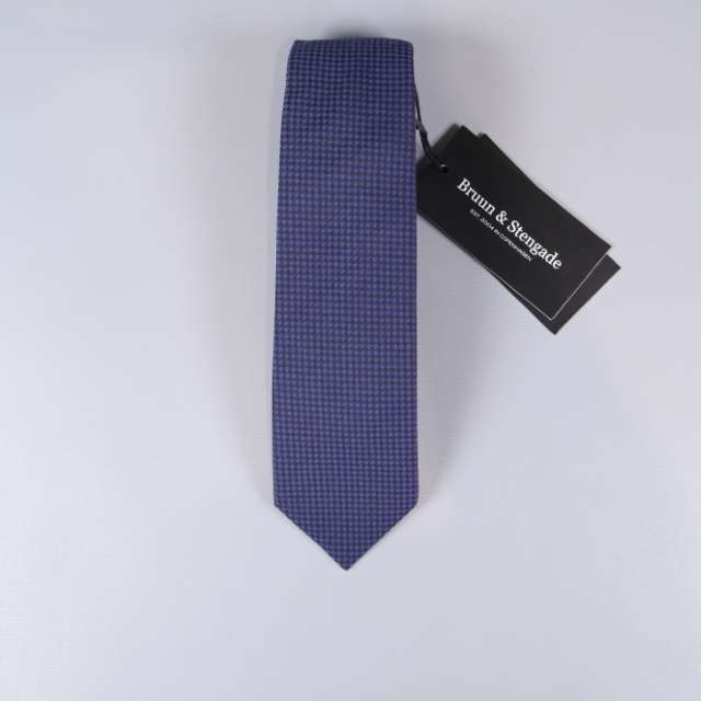 En klassisk slips med små, jämna rutor i kontrasterande färger som ger en elegant look. Designen från Bruun & Stengade ger en sofistikerad och tidlös känsla, perfekt till både vardag och fest. Slipsen har en mörkblå bas med subtil mönsterstruktur för en modern twist.