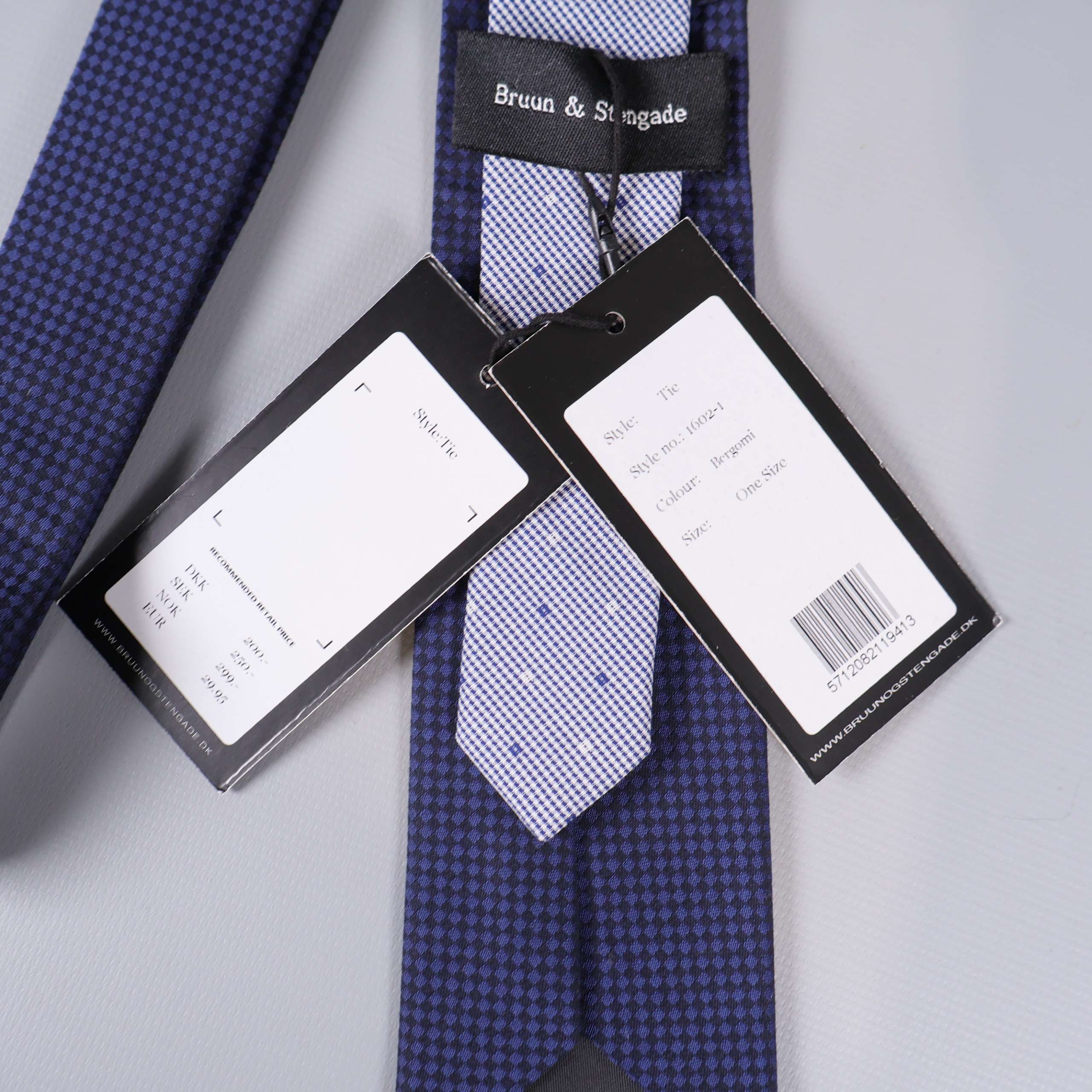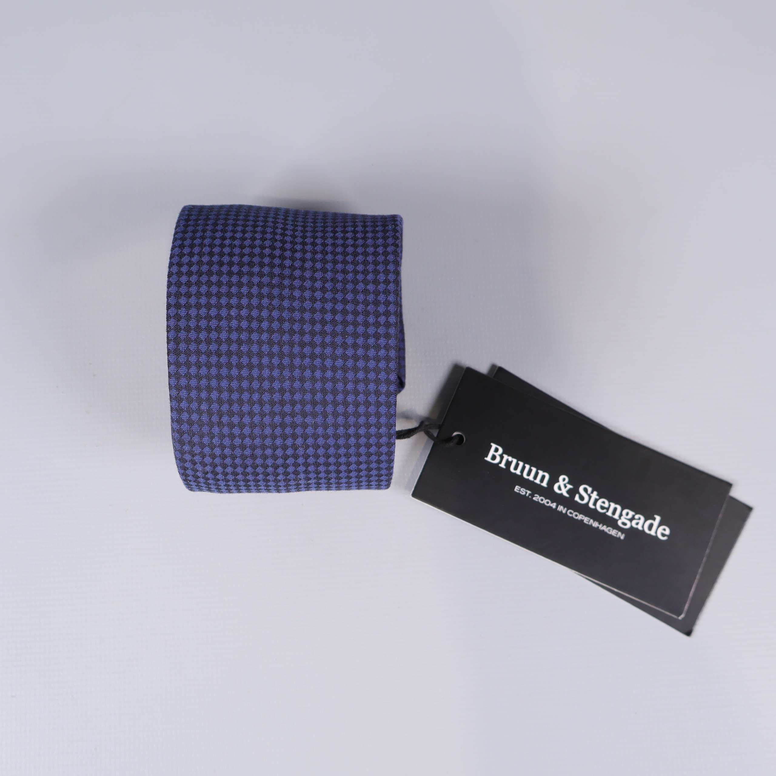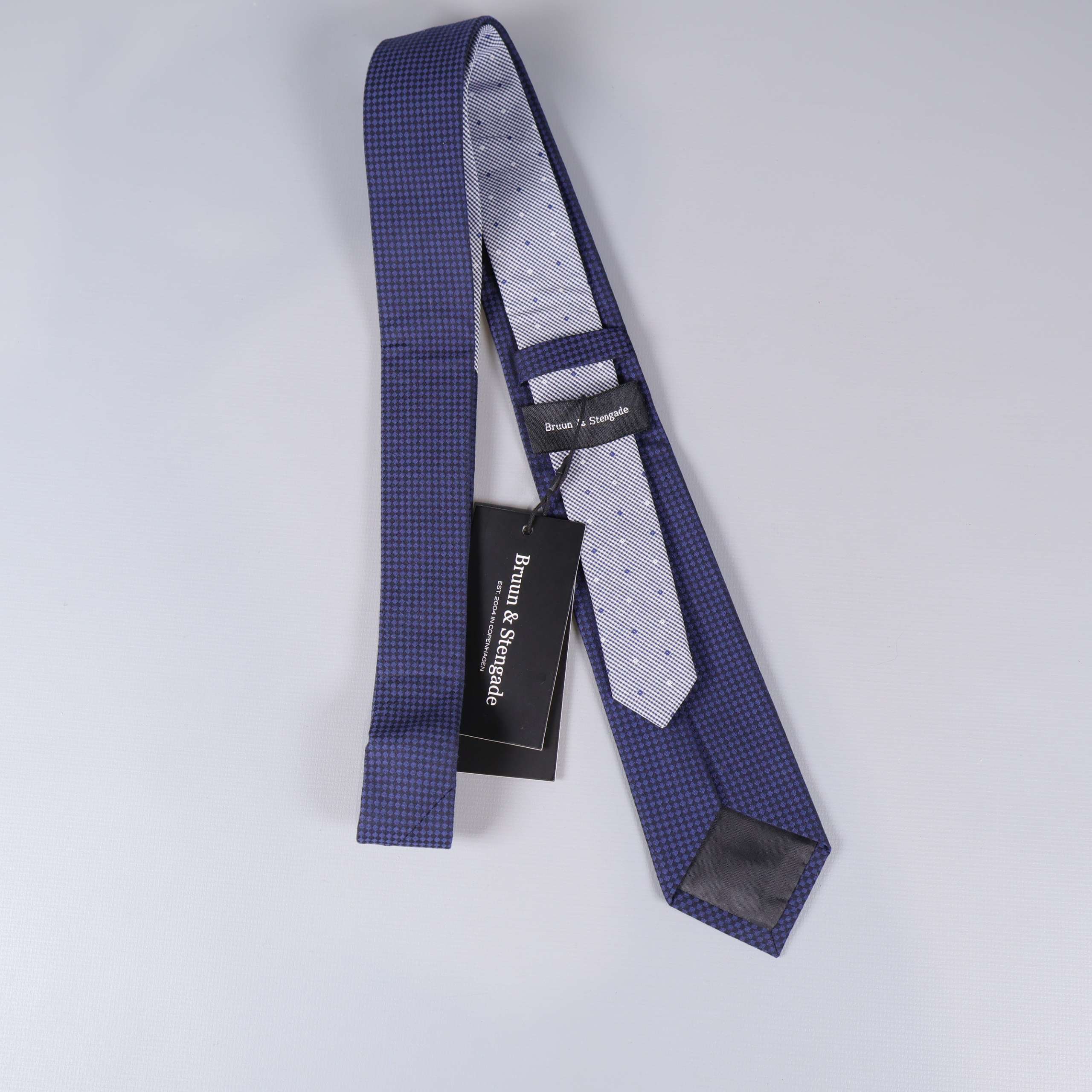 En klassisk slips med små, jämna rutor i kontrasterande färger som ger en elegant look. Designen från Bruun & Stengade ger en sofistikerad och tidlös känsla, perfekt till både vardag och fest. Slipsen har en mörkblå bas med subtil mönsterstruktur för en modern twist.