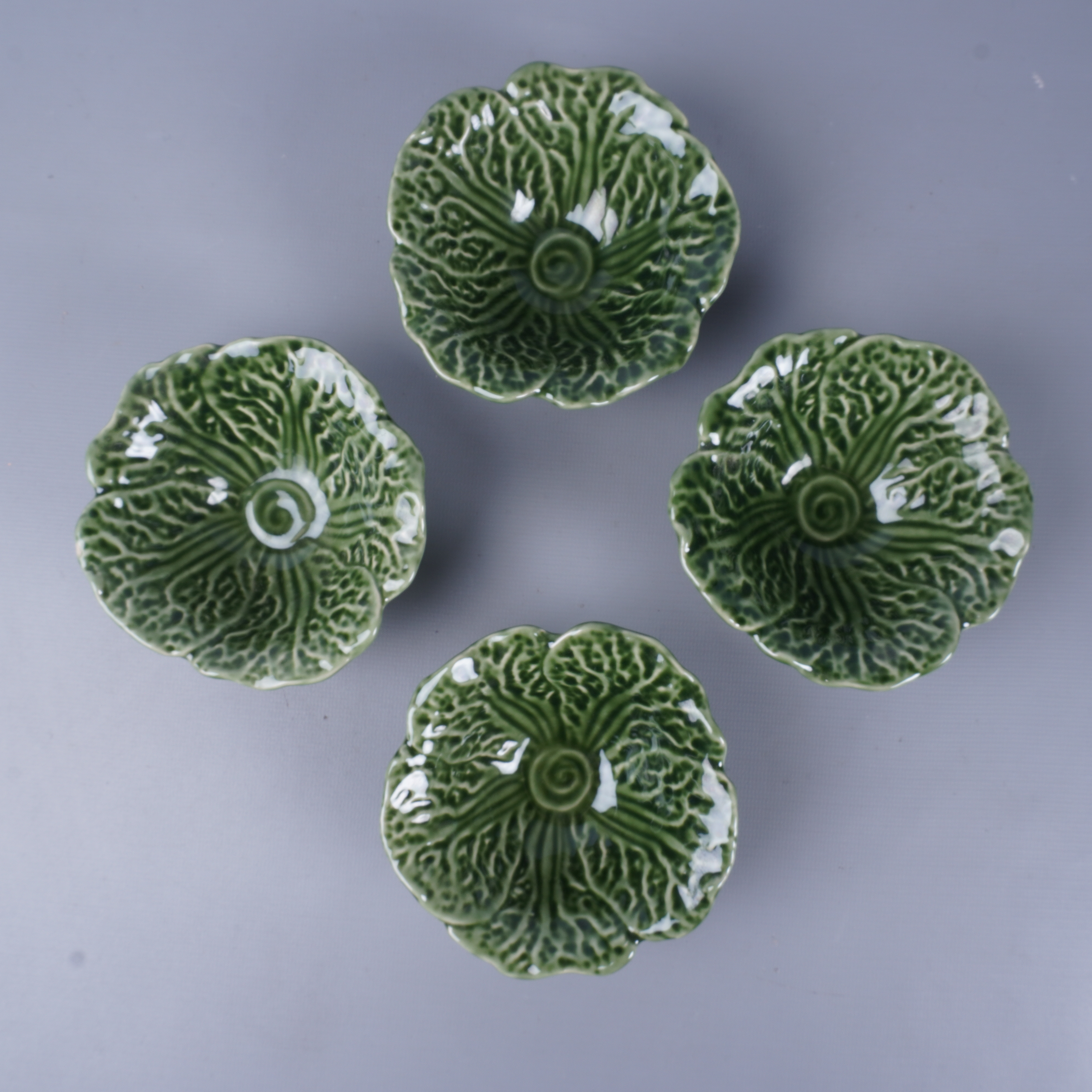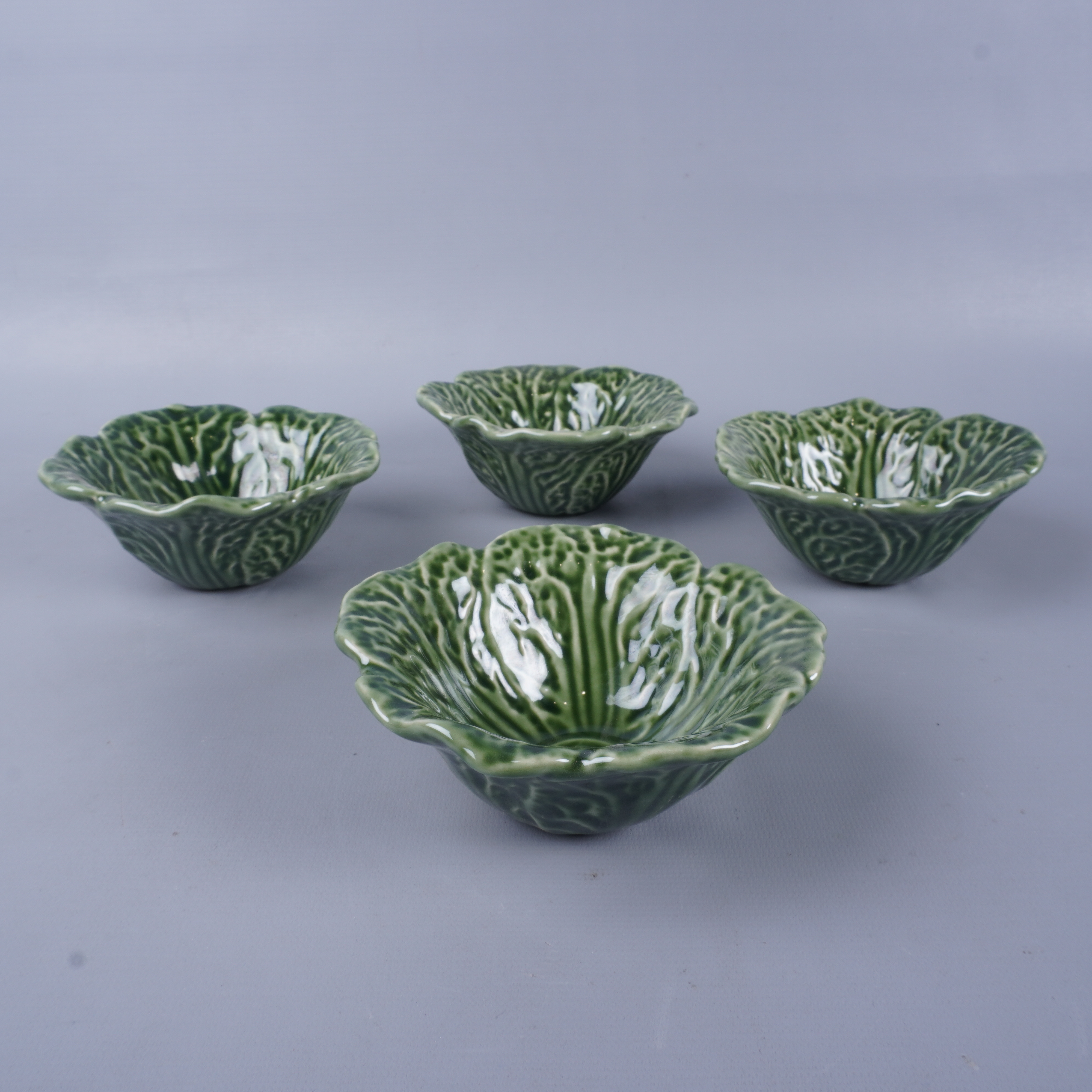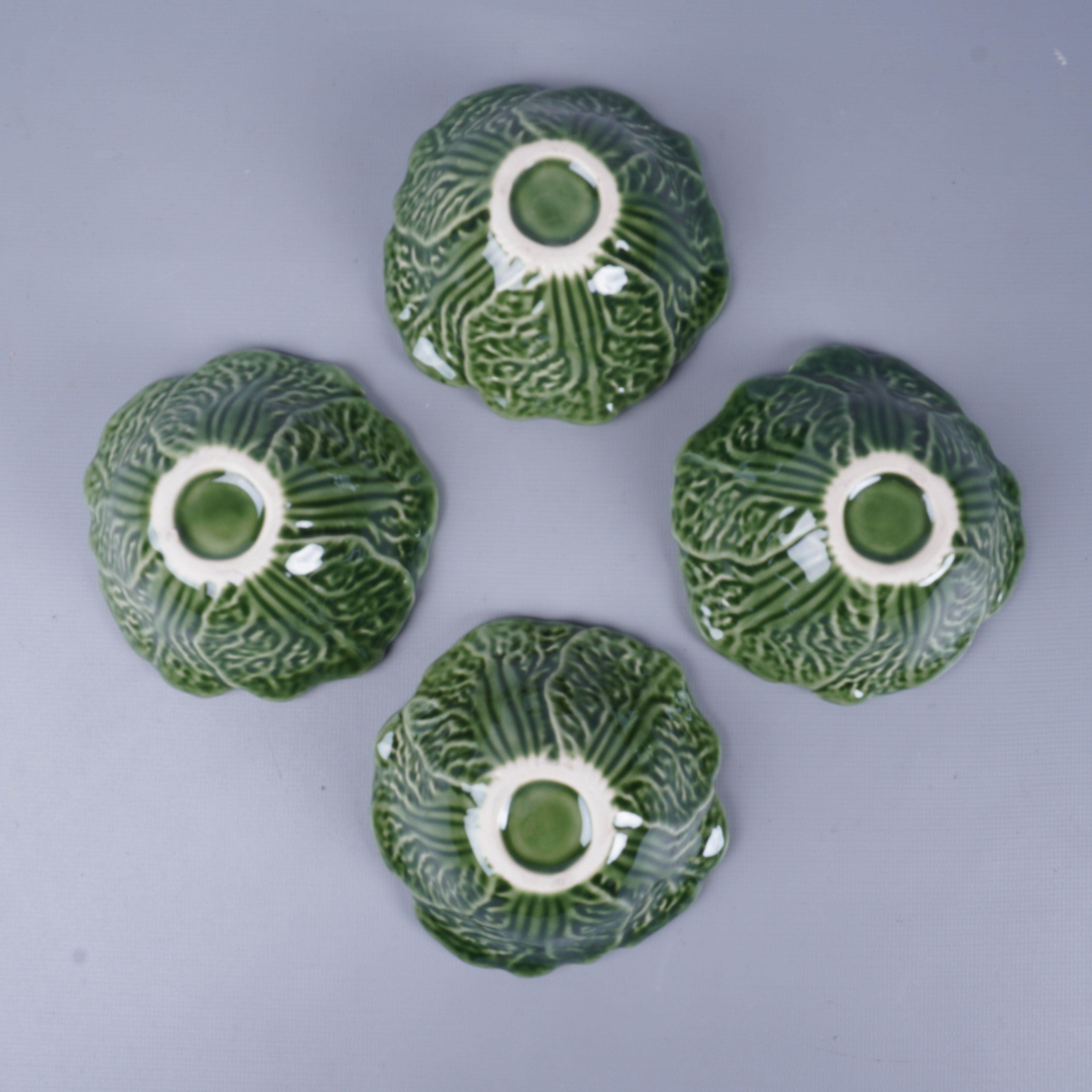 Fyra dekorativa små skålar med grön, glansig yta och organiskt mönster som påminner om bladverk. Setet ger en playful och modern känsla till dukningen, fint både till vardag och fest. Skålarna har rundade kanter och unik struktur.