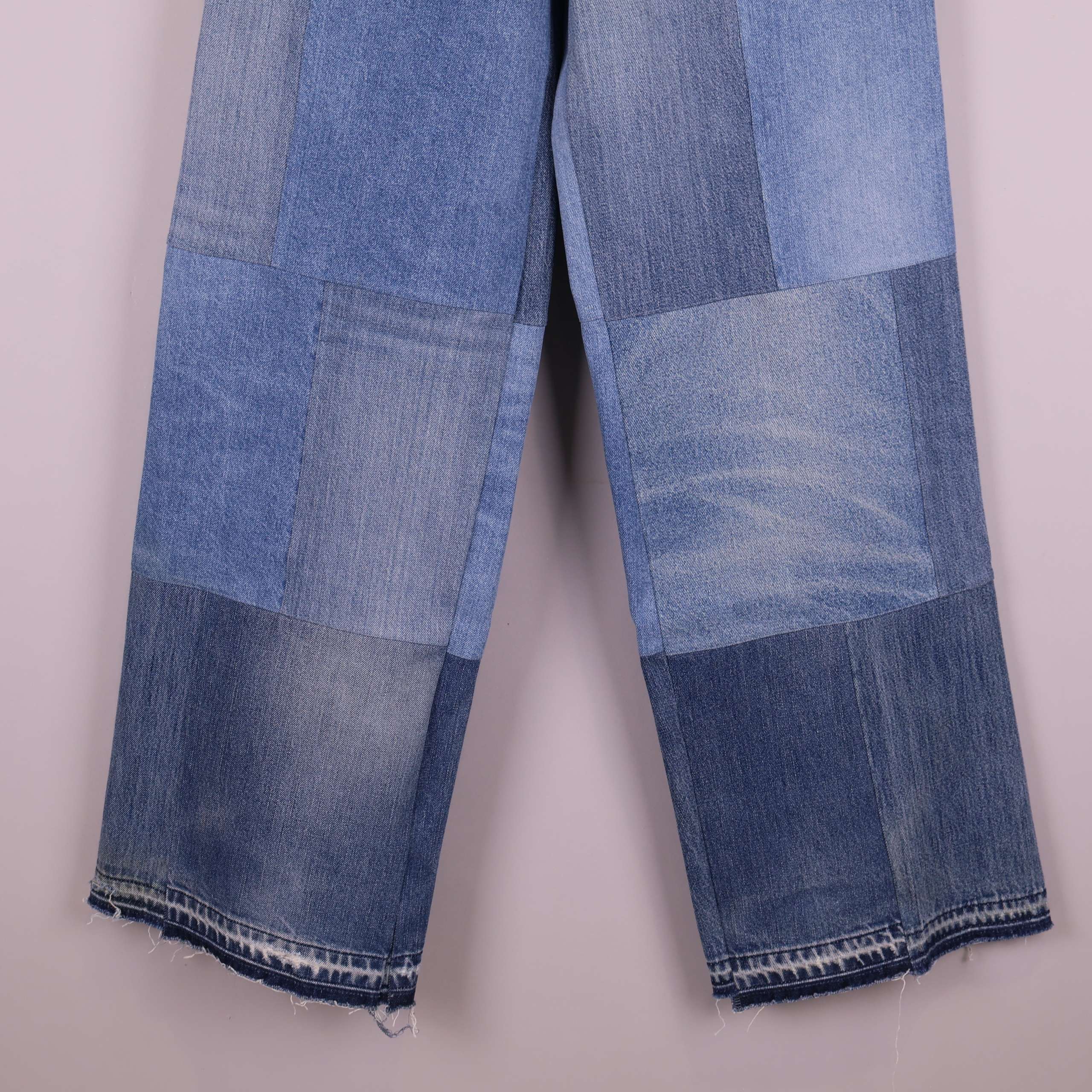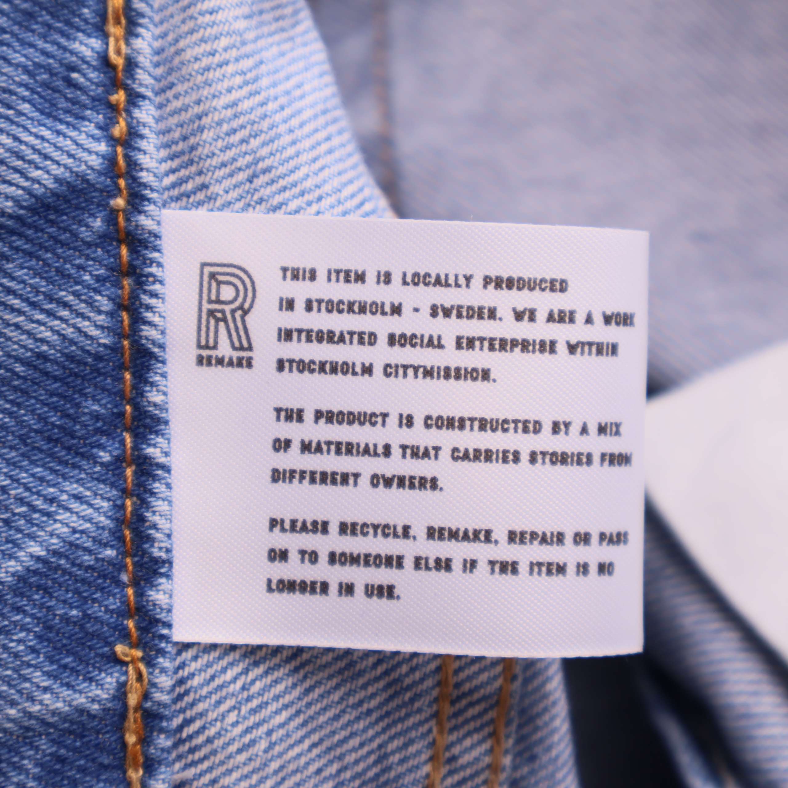 These jeans are crafted from fabric donated to Stockholms Stadsmission. Each pair is carefully cut and repaired with patches made from other upcycled denim pieces in different shades of blue—preserving the original fit while giving new life to discarded fabric. Because every patchwork is different, no two pairs are ever the same.