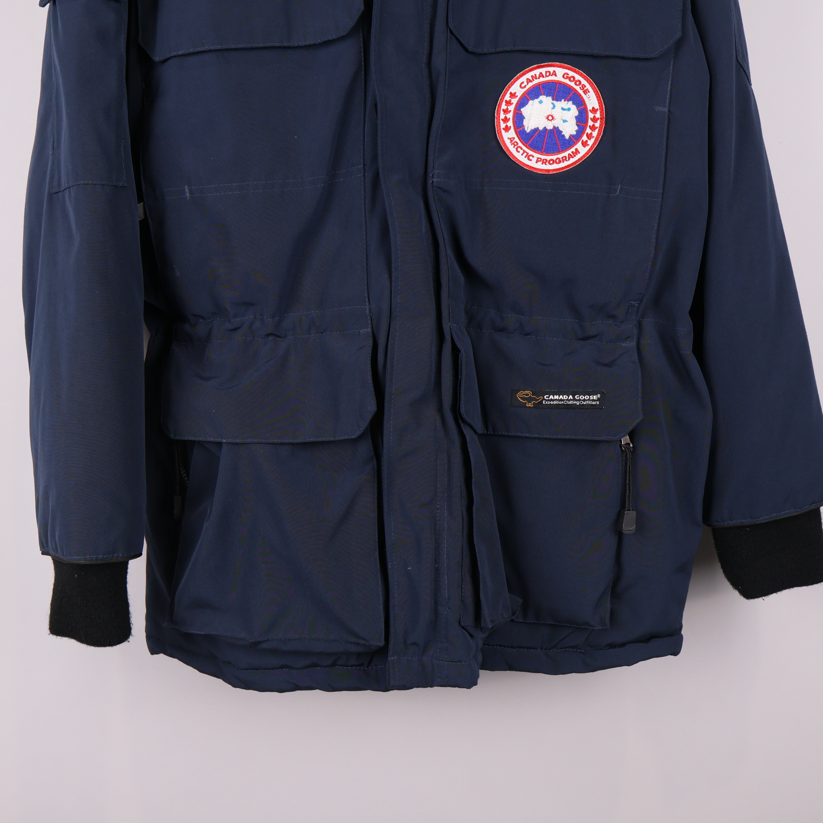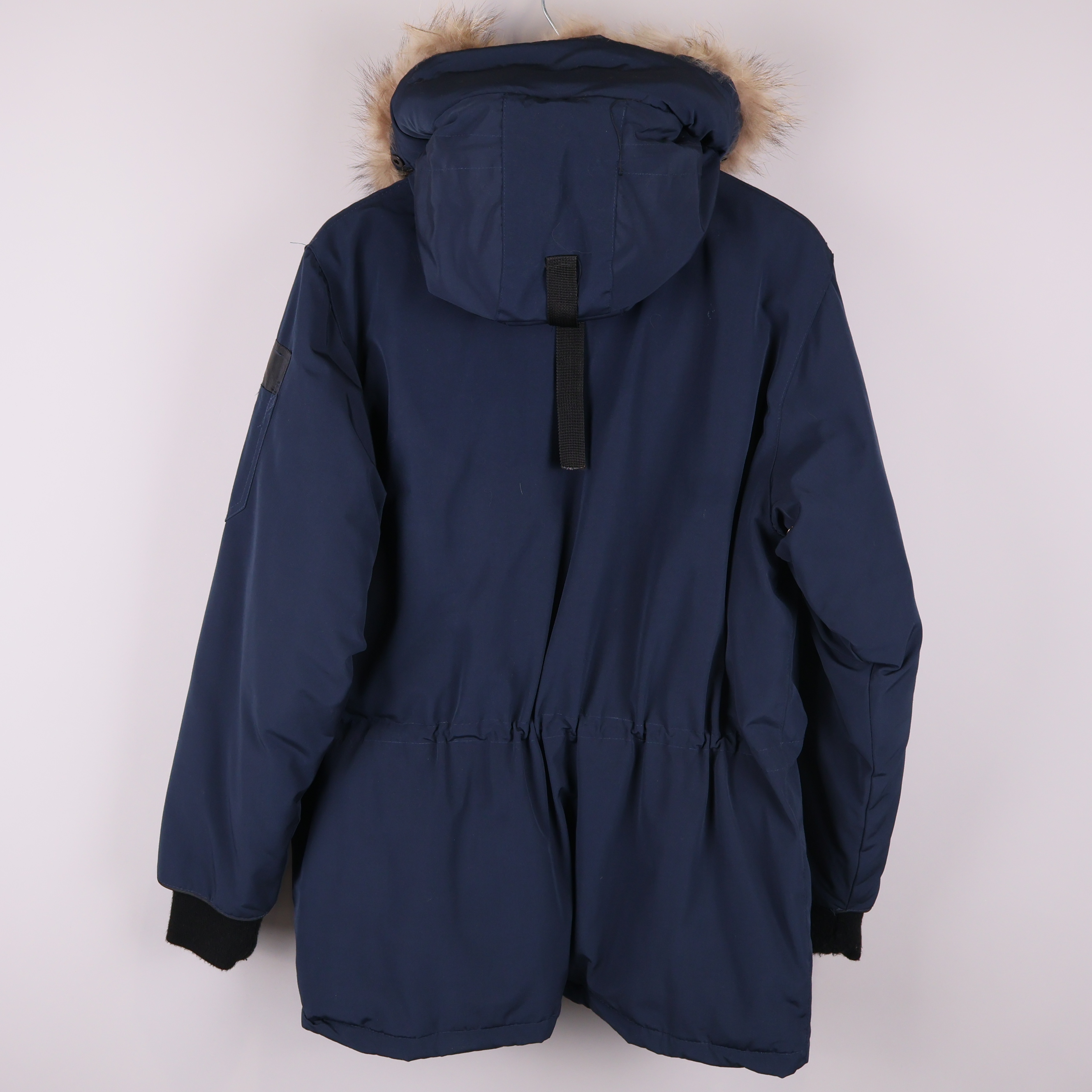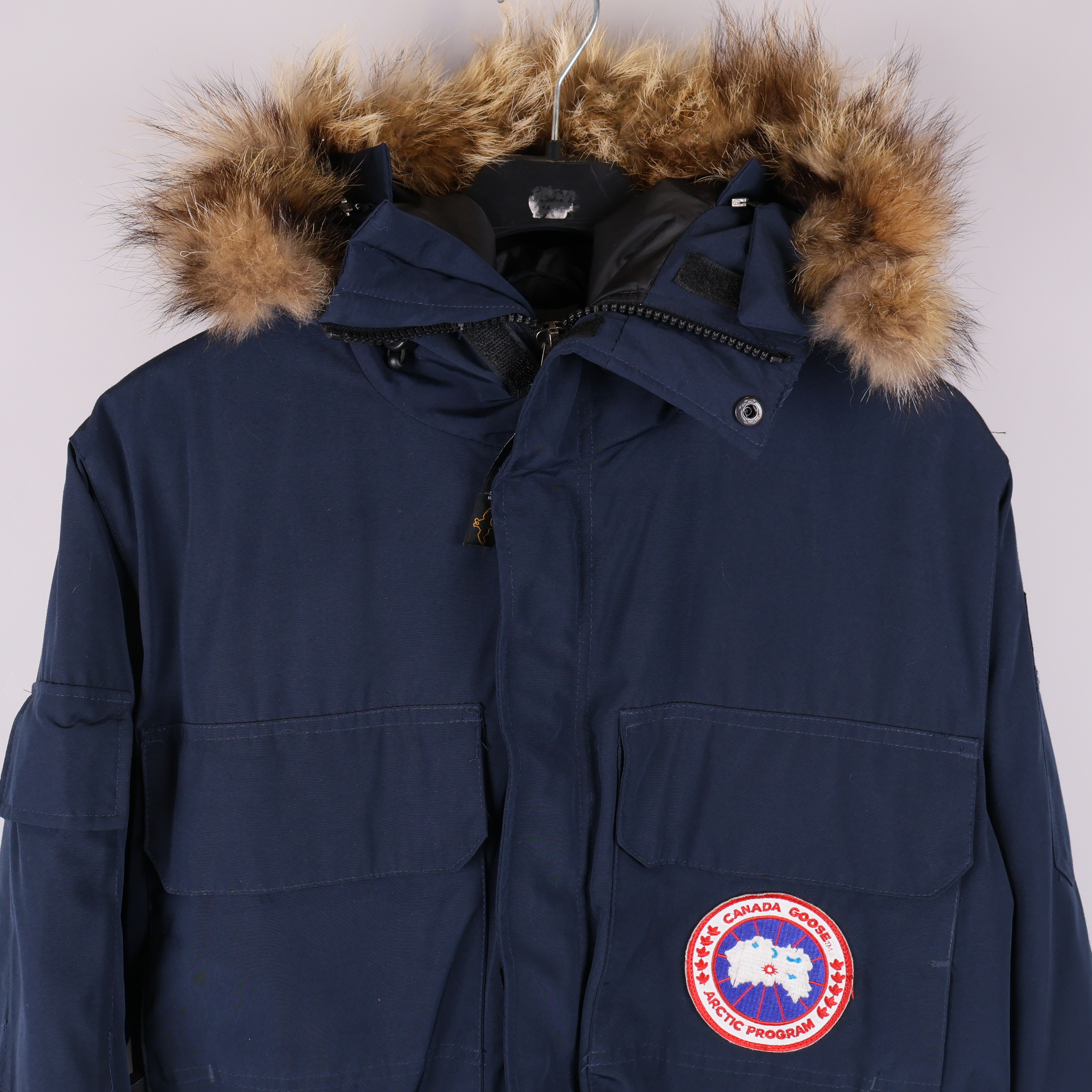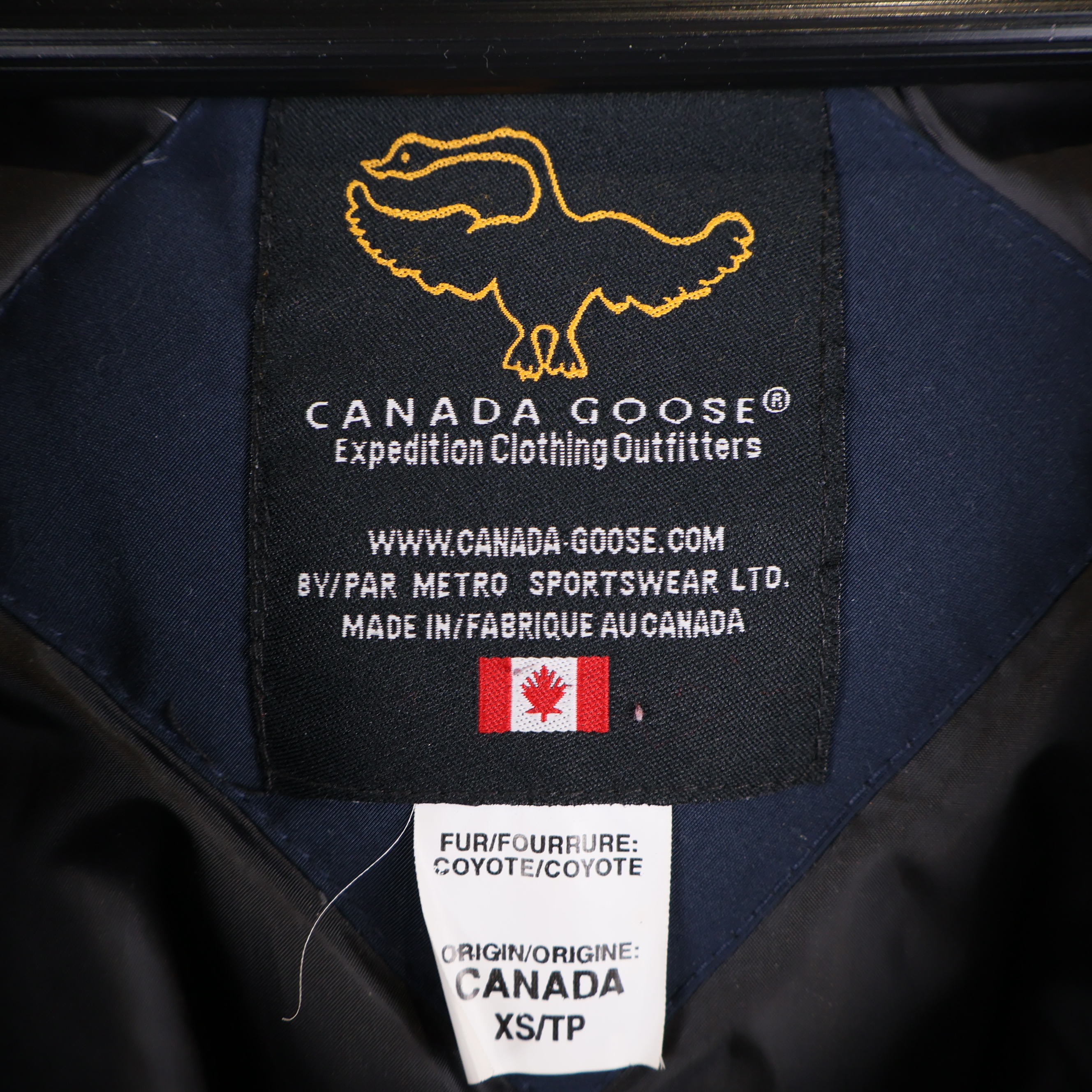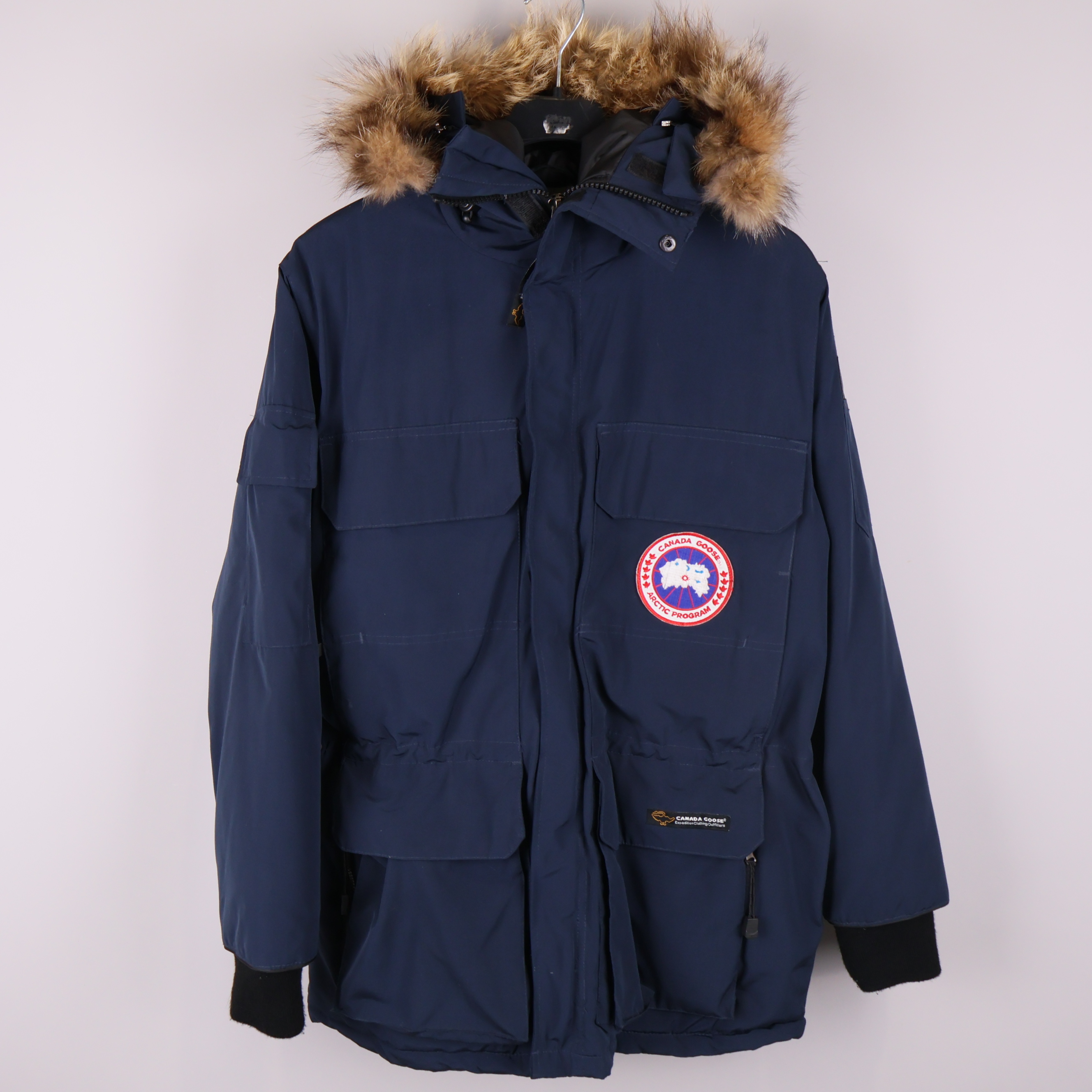 Varm parkas från Canada Goose med detaljerad huva i fuskpäls och klassiskt märke på bröstet. Jackan har flera praktiska fickor och muddar i ärmsluten för extra komfort. Mindre fläckar finns på framsida och rygg.