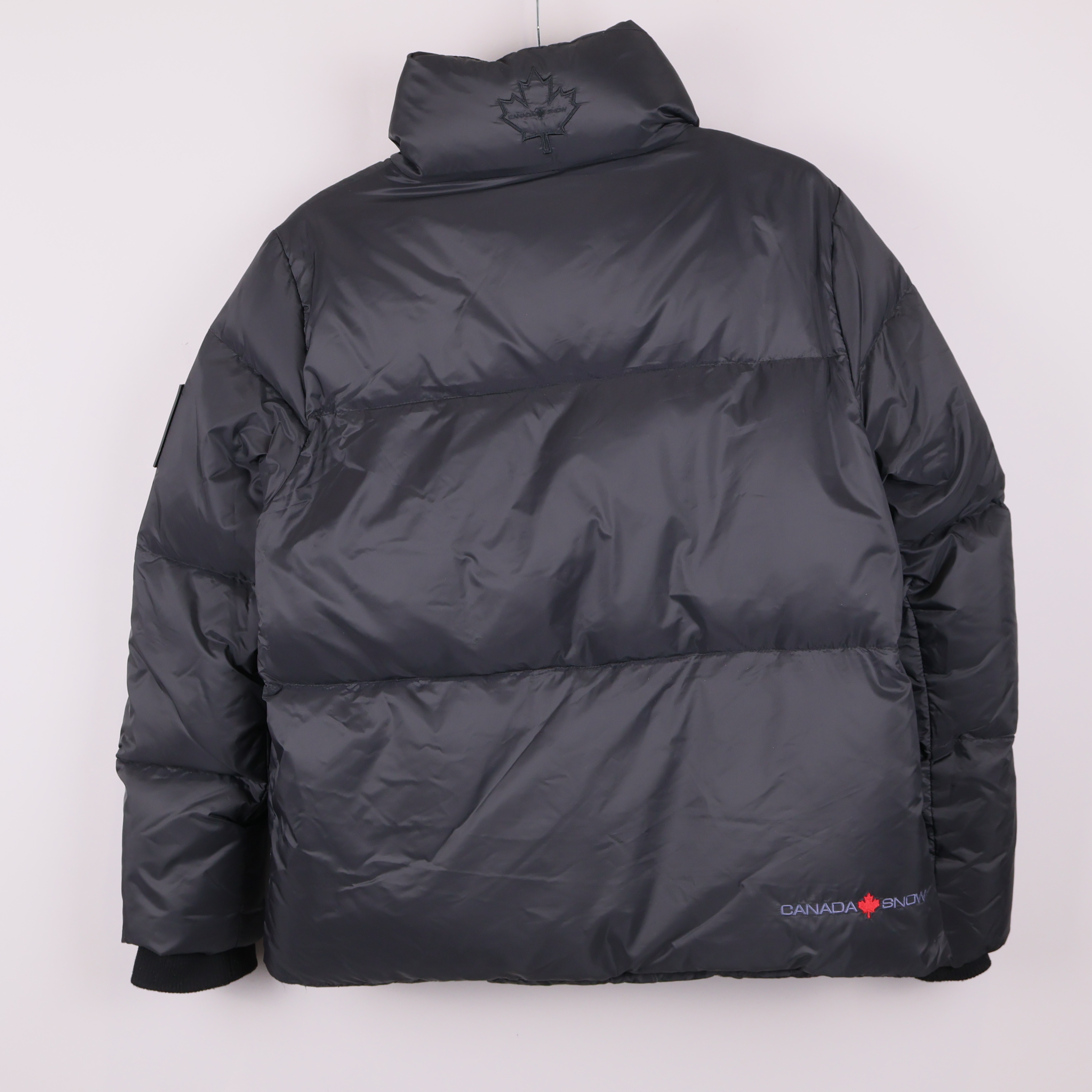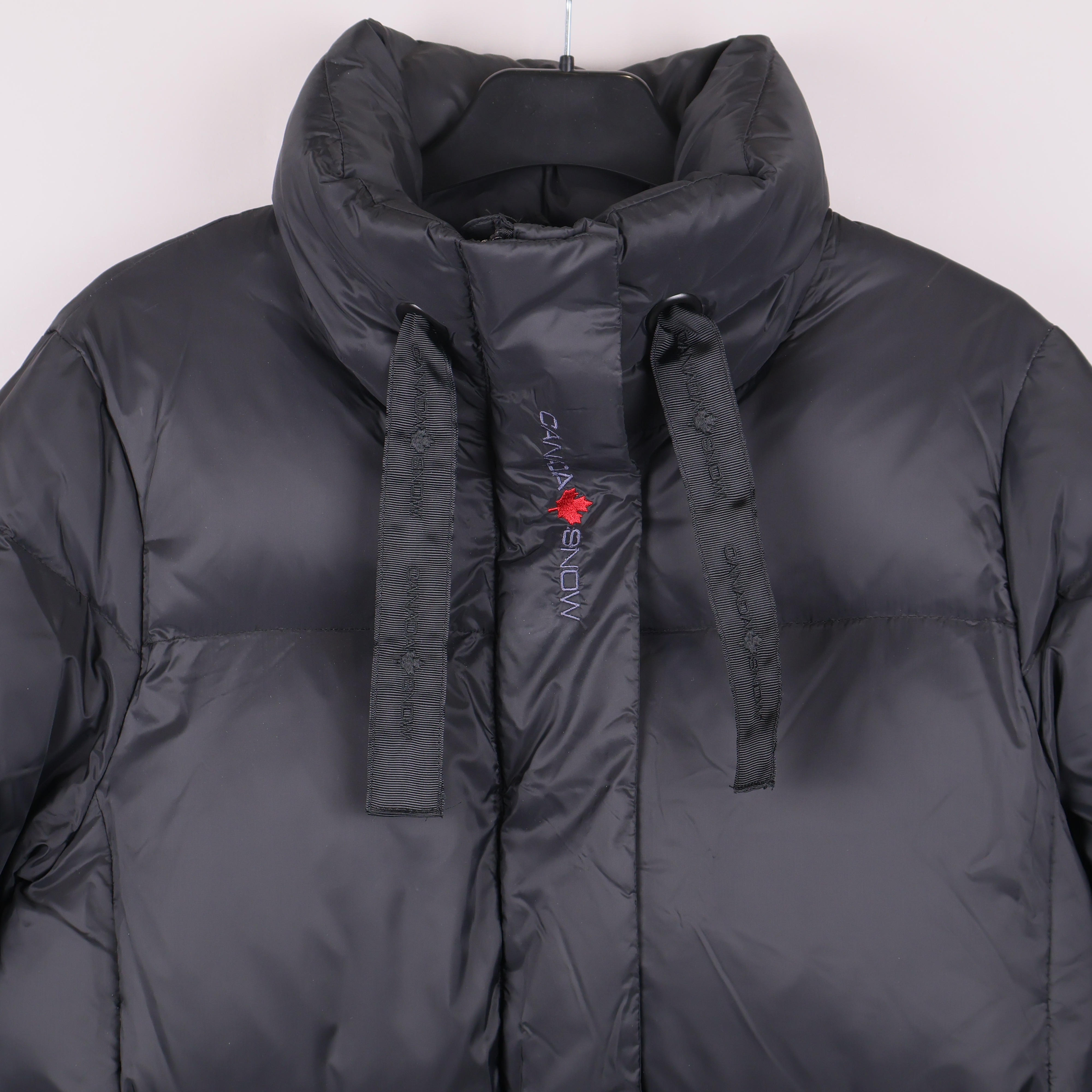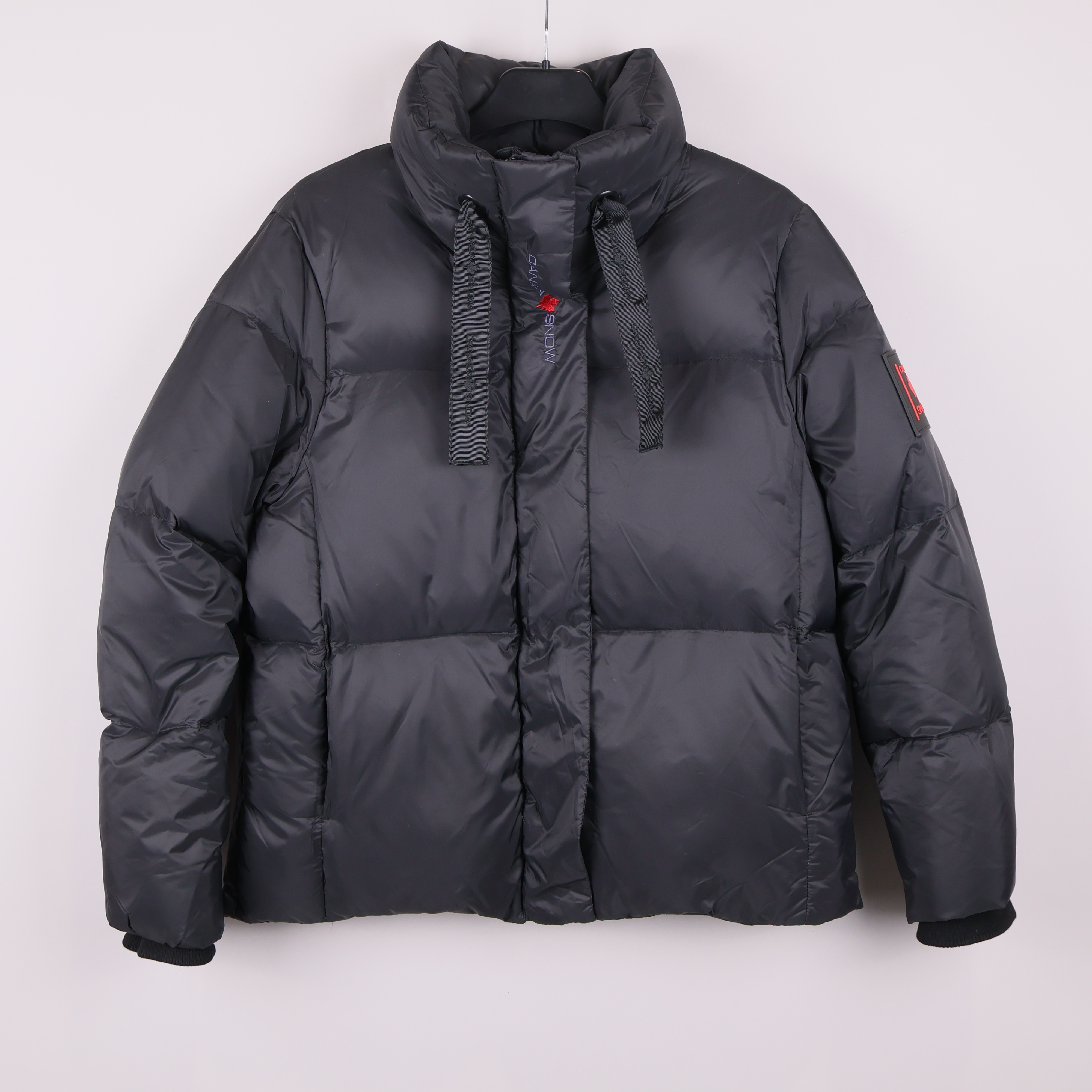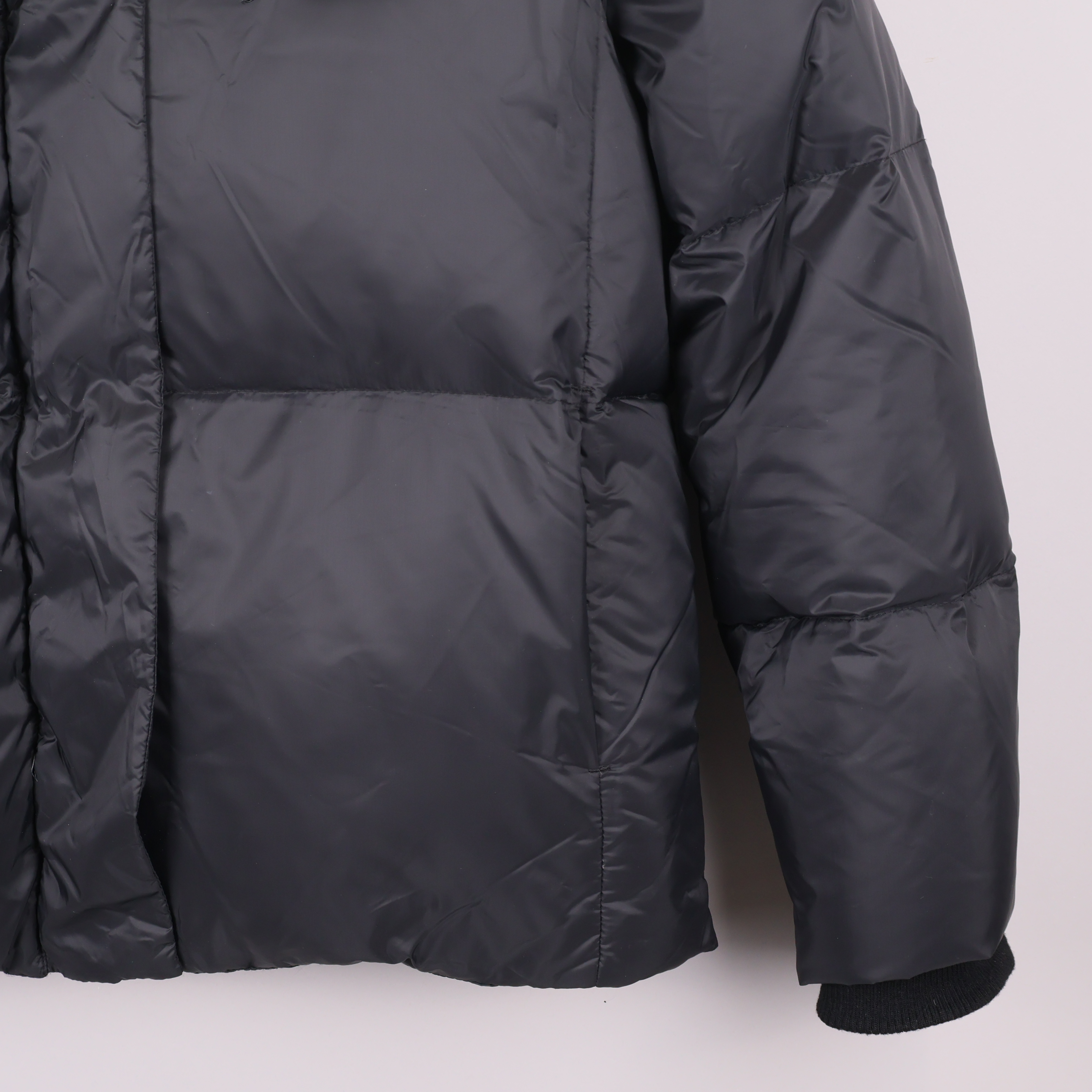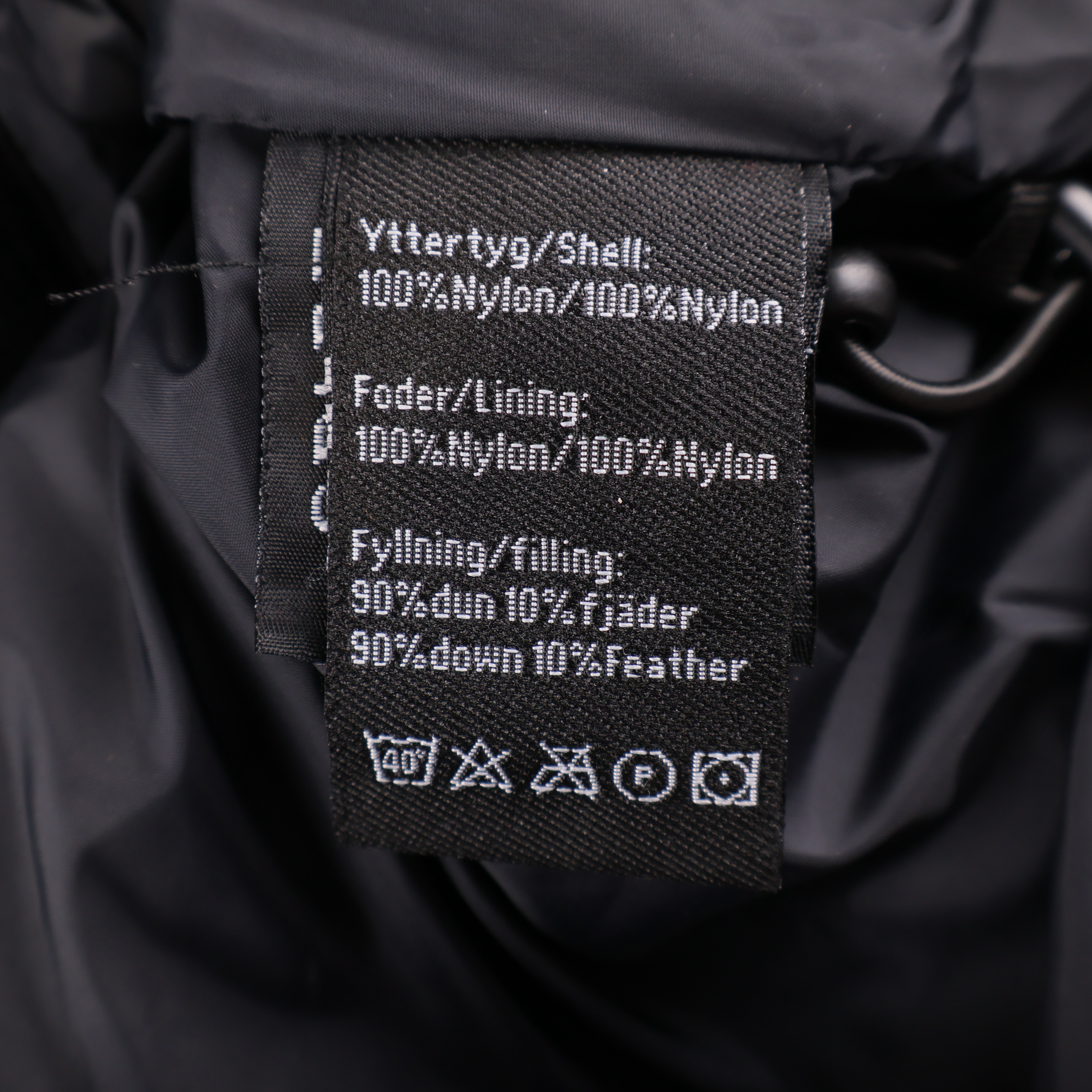 Vadderad jacka med hög krage och justerbara band framtill. Jackan har en boxig passform, ribbade ärmslut och tydliga logodetaljer på både ärm, bröst och nacke. Yttertyg och foder i nylon ger en sportig look samtidigt som dun- och fjäderfyllning håller dig varm.