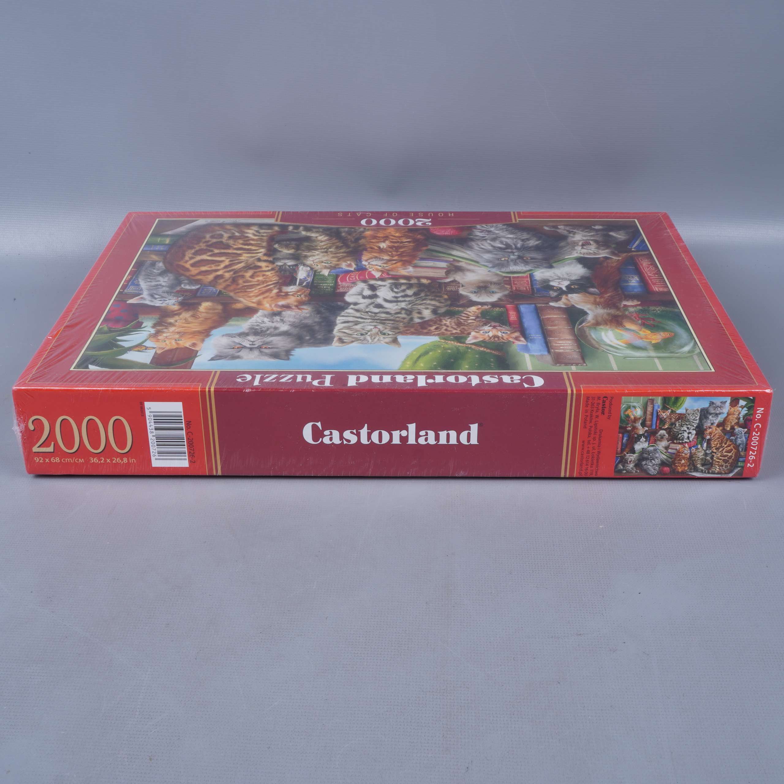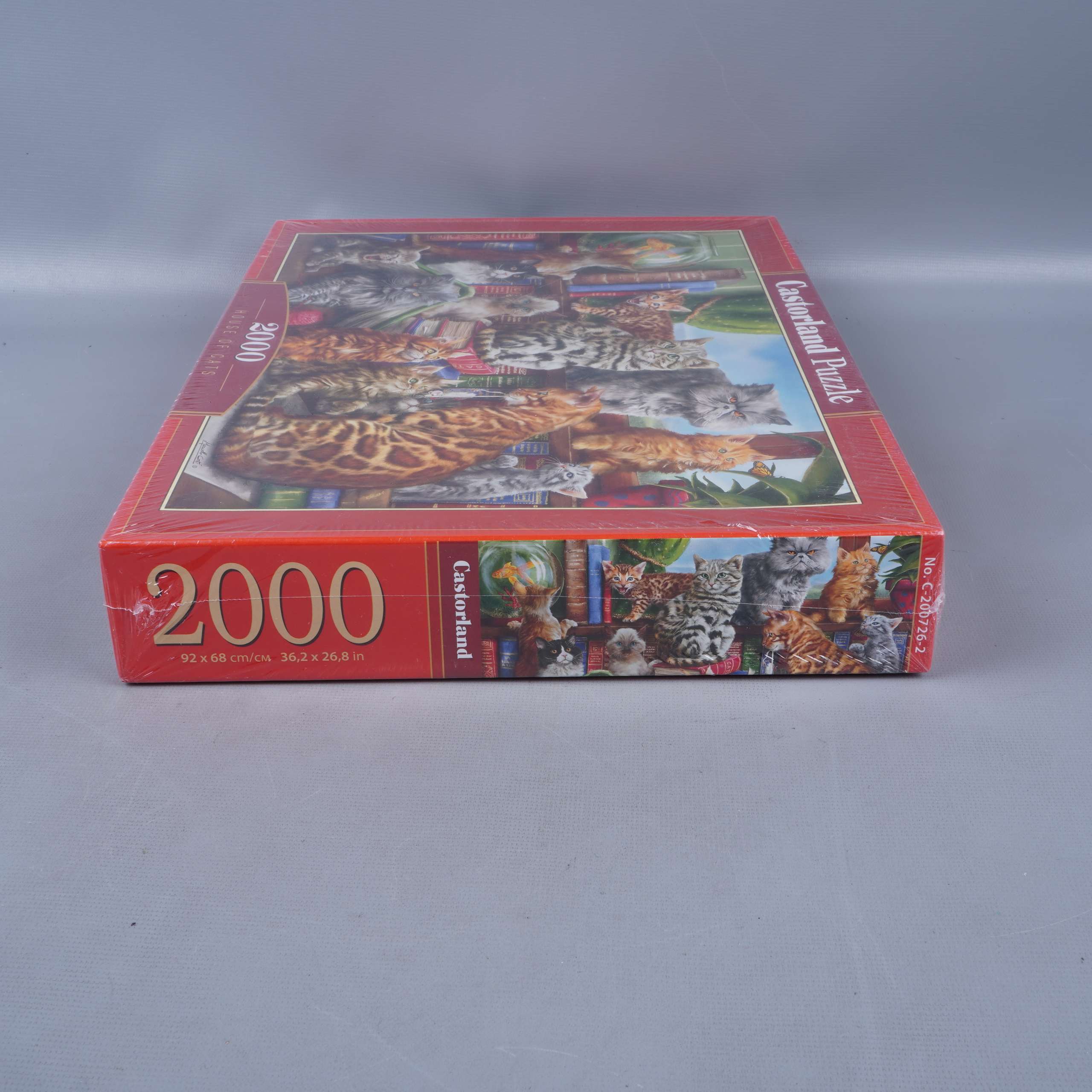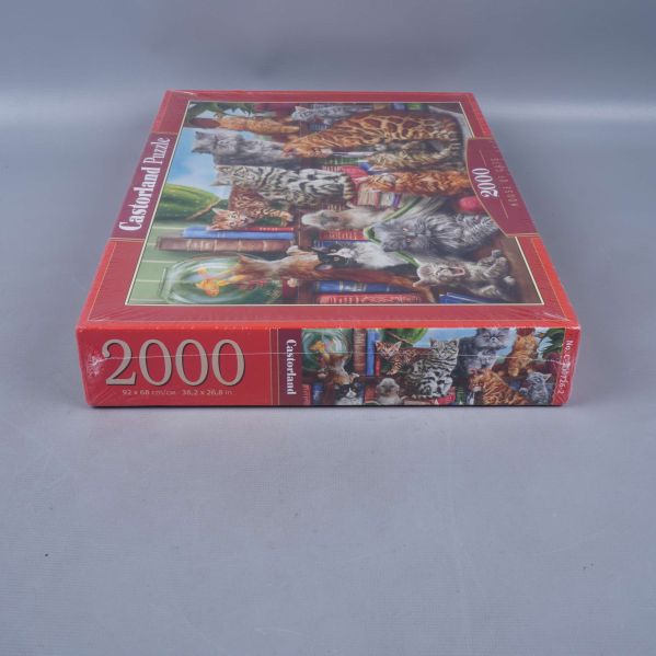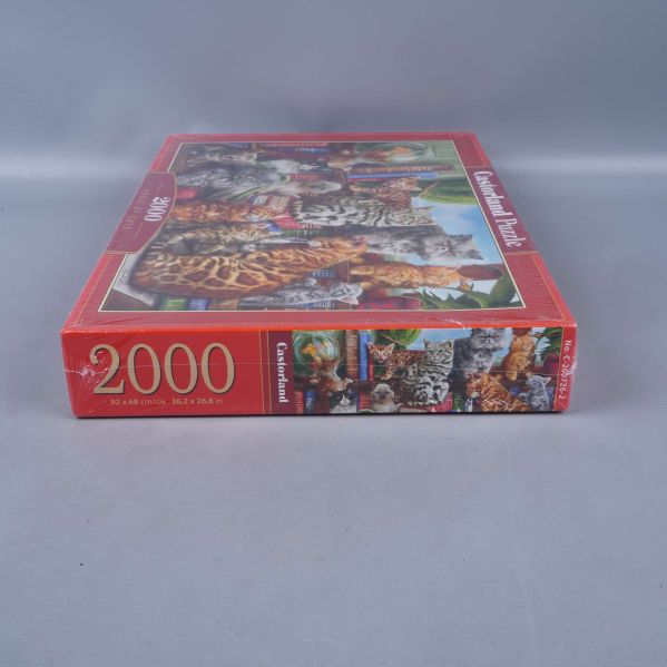 Stor pusselbox från Castorland med färgglatt kattmotiv i ett mysigt hemmabibliotek. 2000 bitar för dig som gillar en utmaning. Klassisk rektangulär kartong med röd ram, frodig och detaljrik design som ger en levande känsla. Perfekt för alla som gillar charmiga djurmotiv och härligt pyssel.