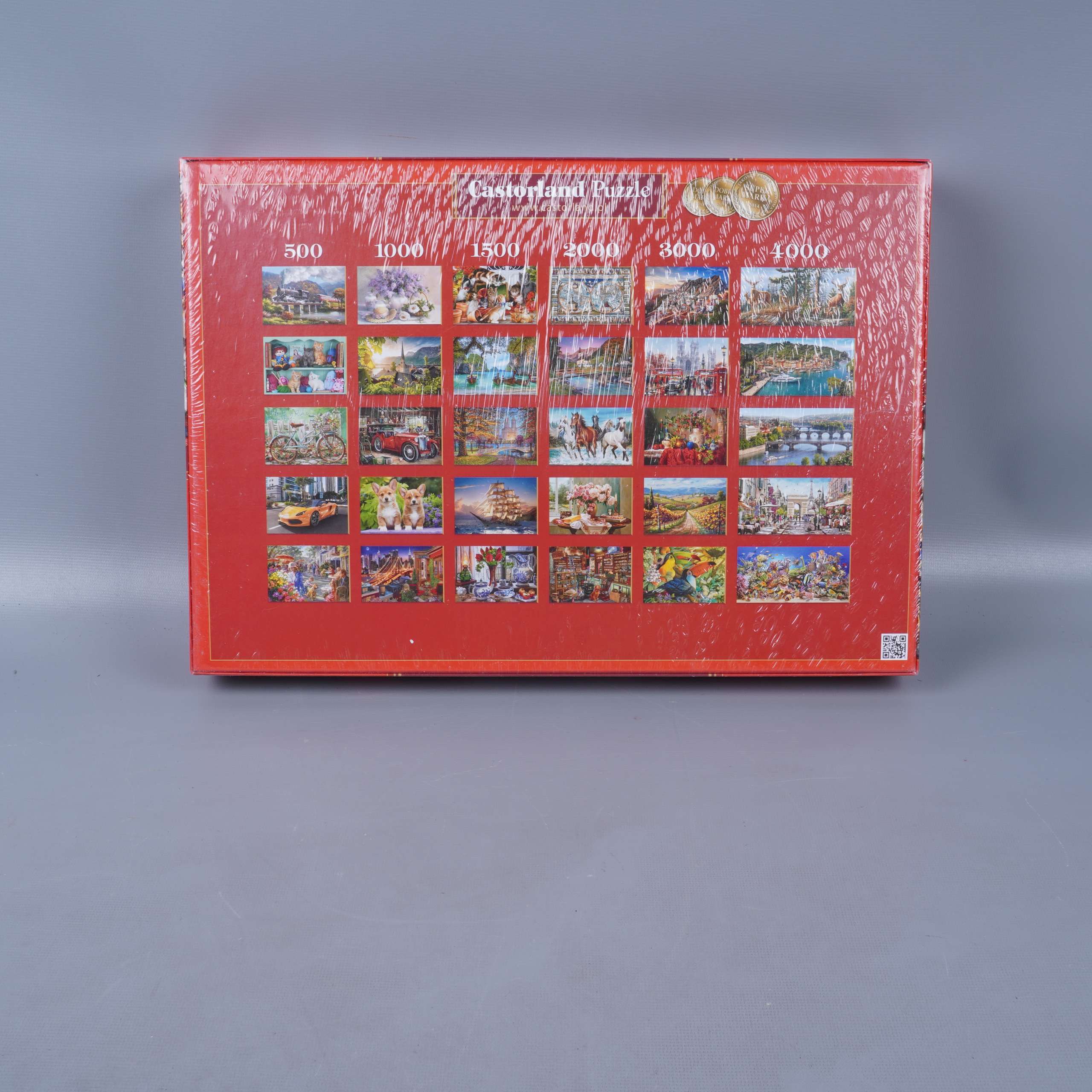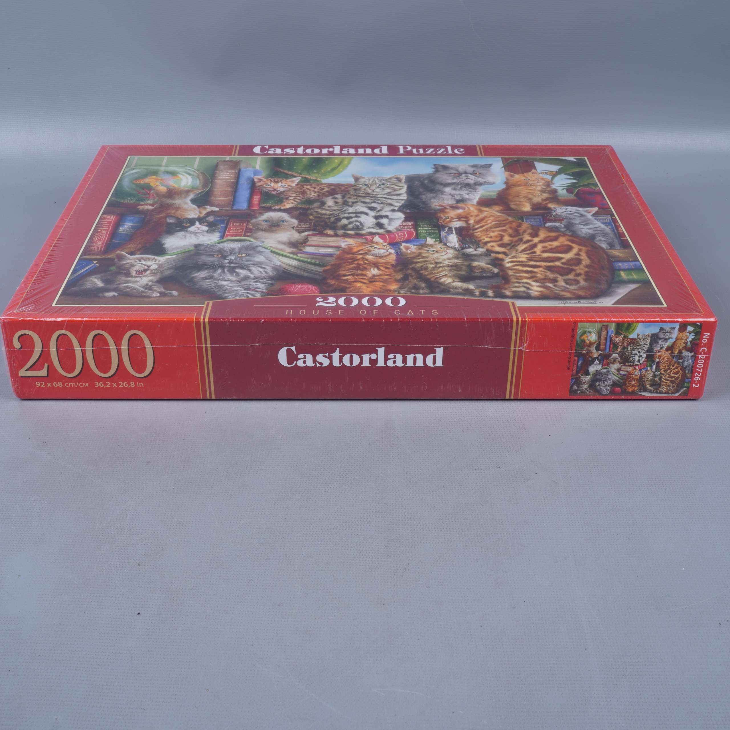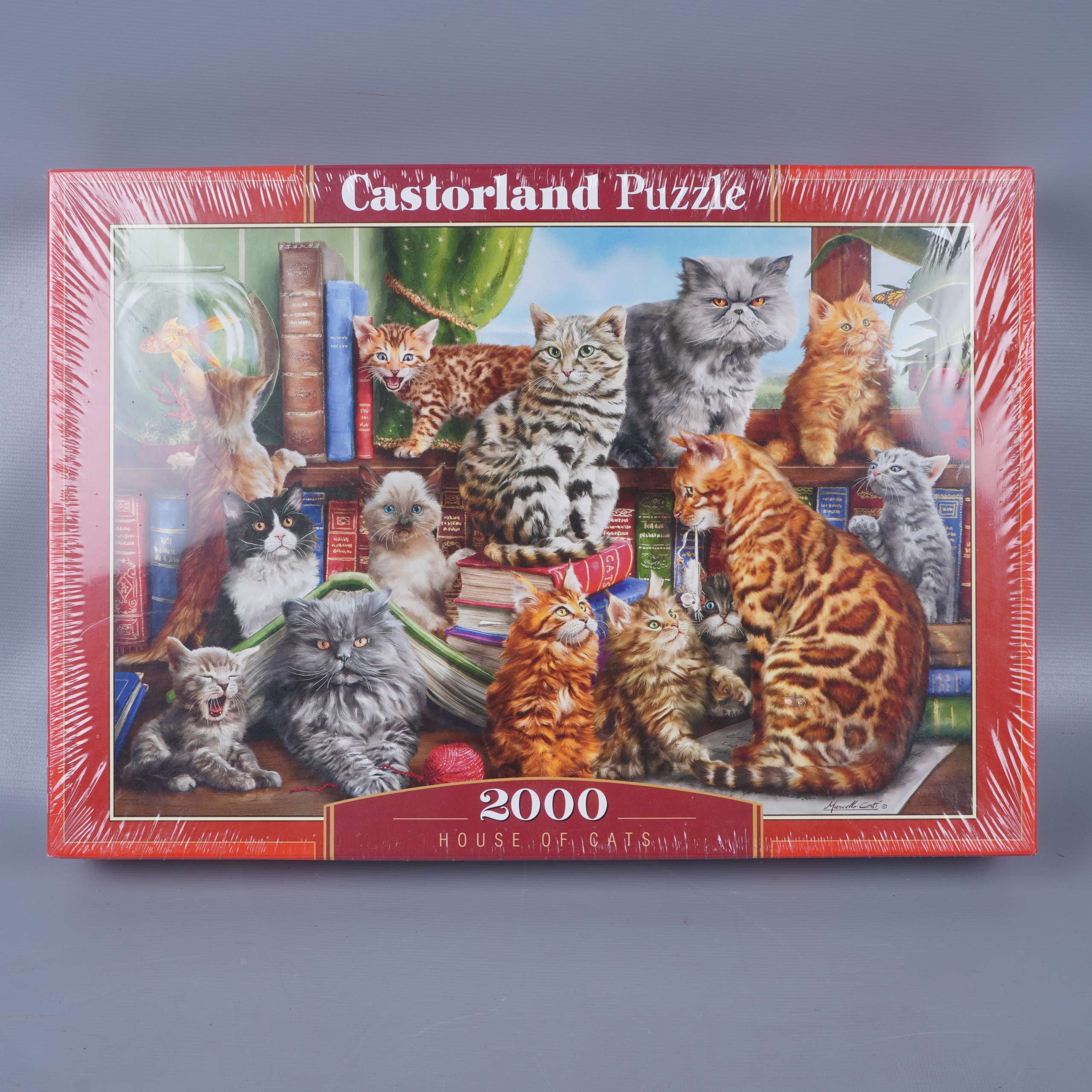 Stor pusselbox från Castorland med färgglatt kattmotiv i ett mysigt hemmabibliotek. 2000 bitar för dig som gillar en utmaning. Klassisk rektangulär kartong med röd ram, frodig och detaljrik design som ger en levande känsla. Perfekt för alla som gillar charmiga djurmotiv och härligt pyssel.