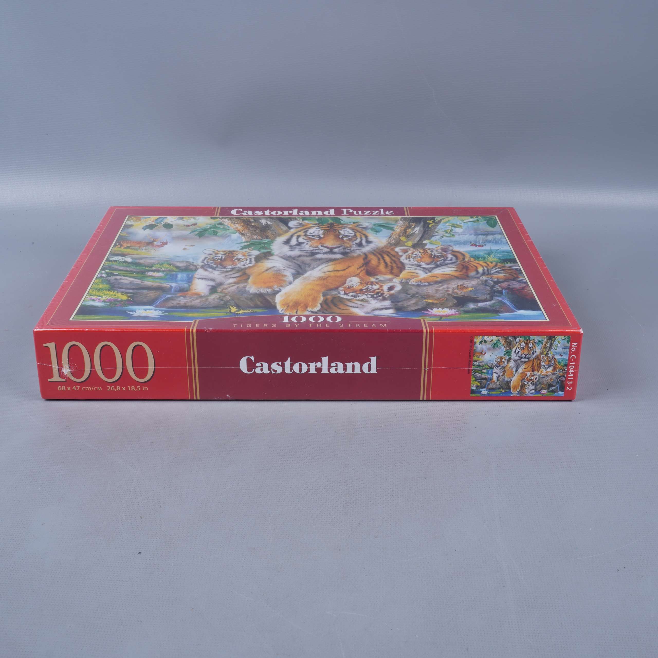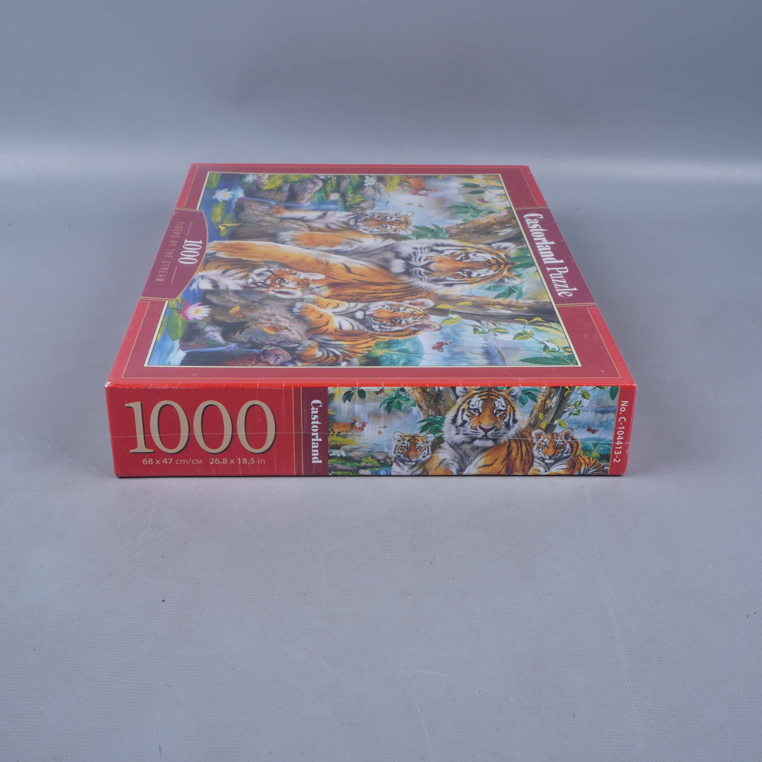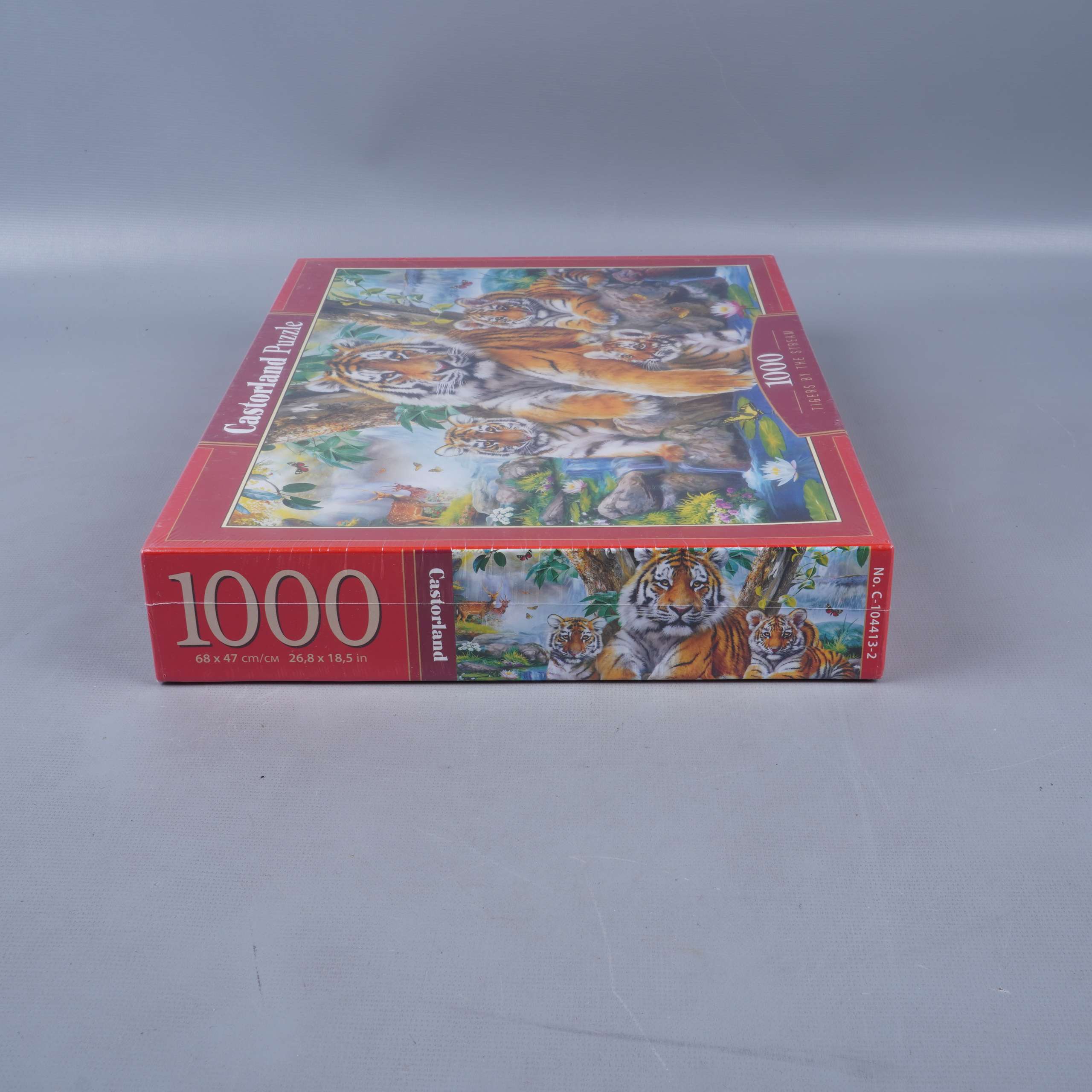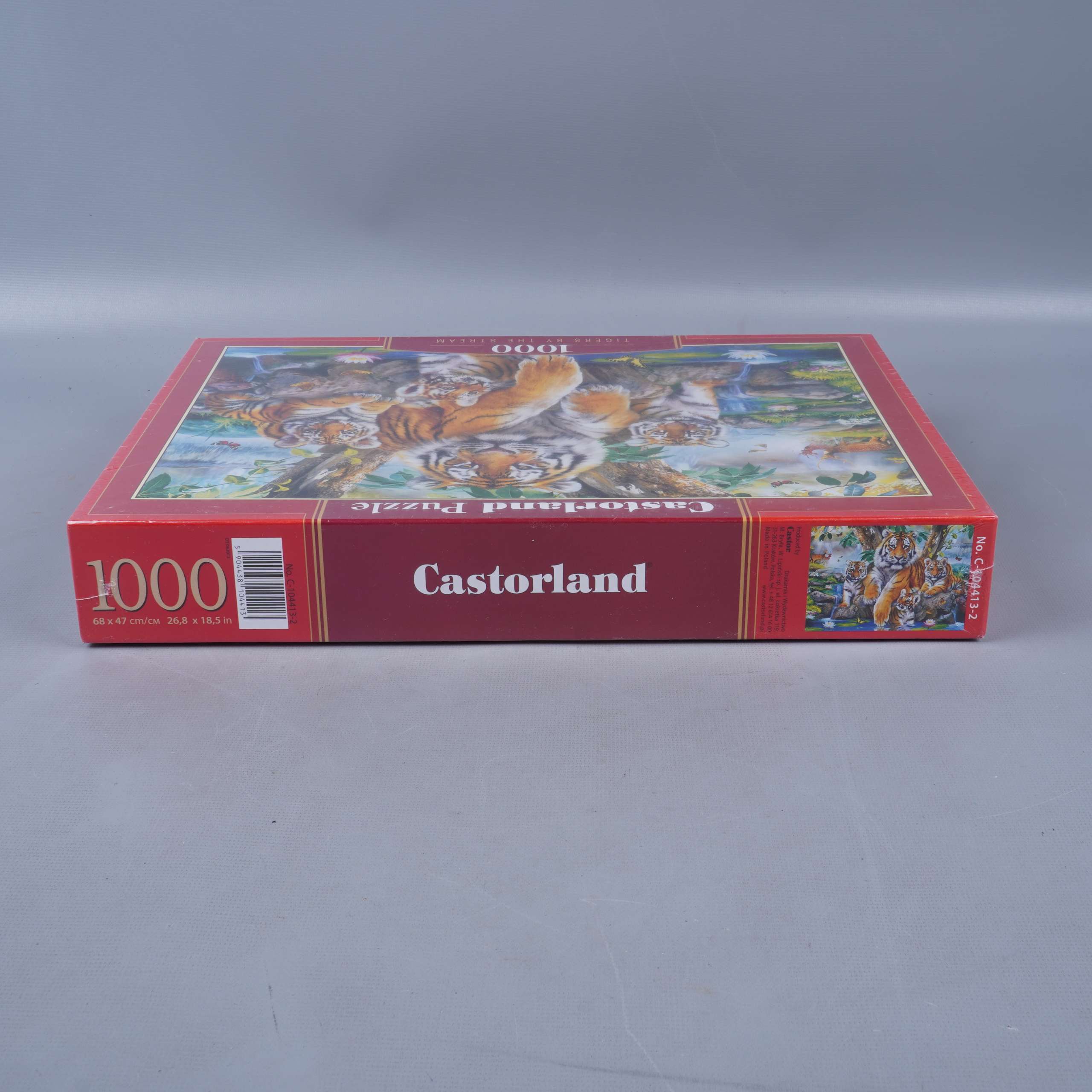Färgstarkt pussel med motiv av majestätiska tigrar vid en ström, perfekt för dig som gillar djurinspirerade motiv och detaljerade illustrationer. Pusslet har 1000 bitar som bjuder på en härlig utmaning och levereras i en klassisk röd låda från Castorland. Boxen har tydlig information och passar lika bra för samlingen som till en mysig pusselkväll.