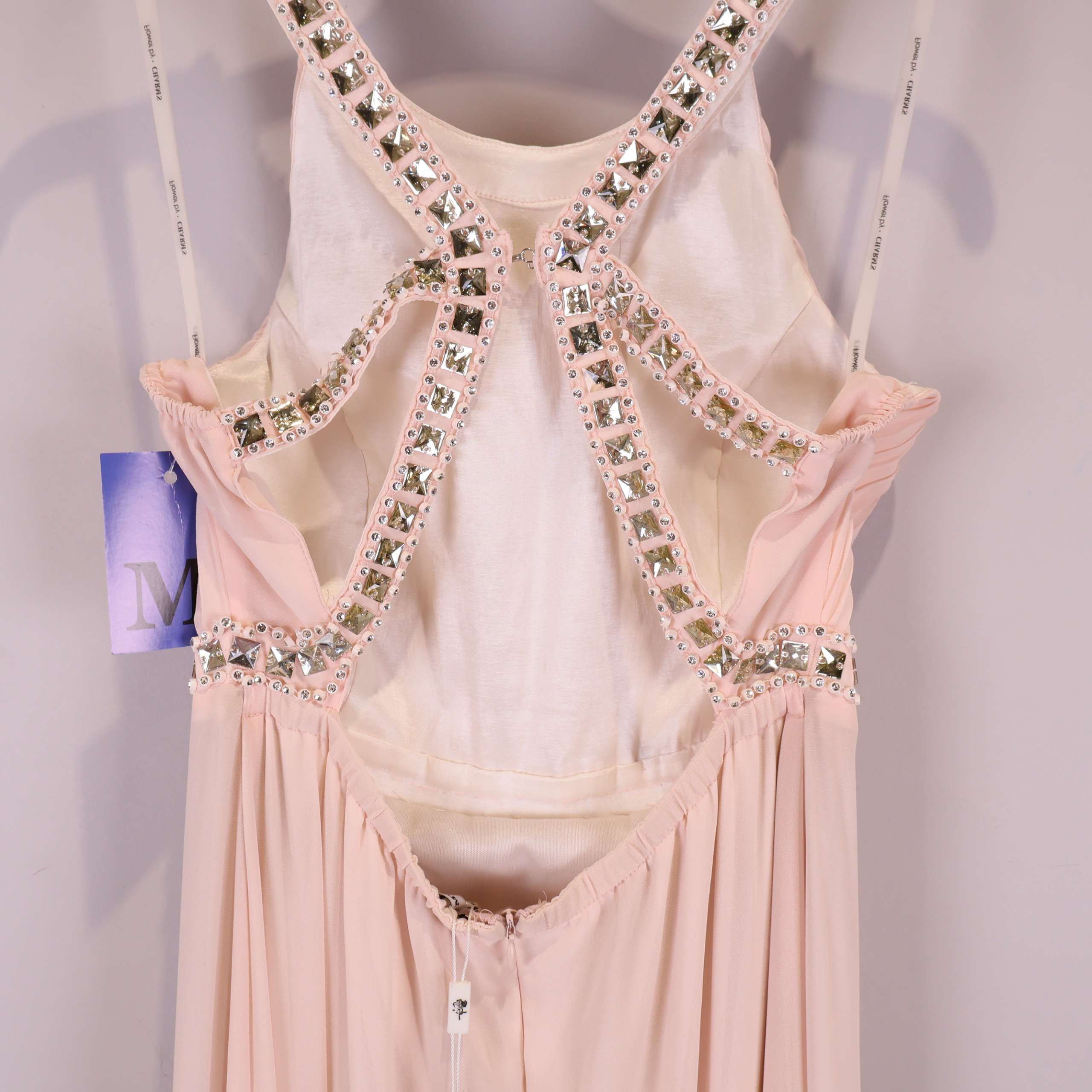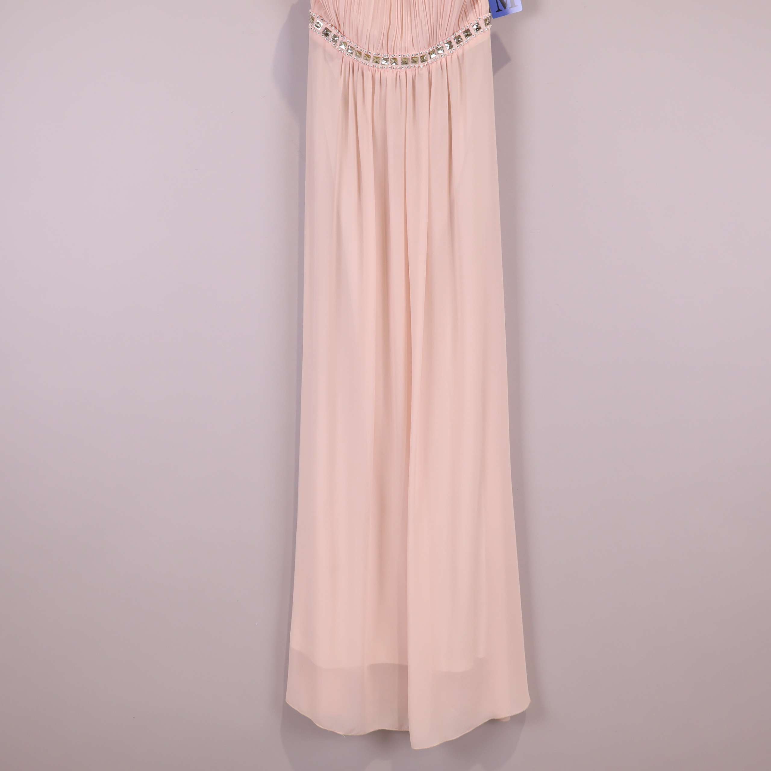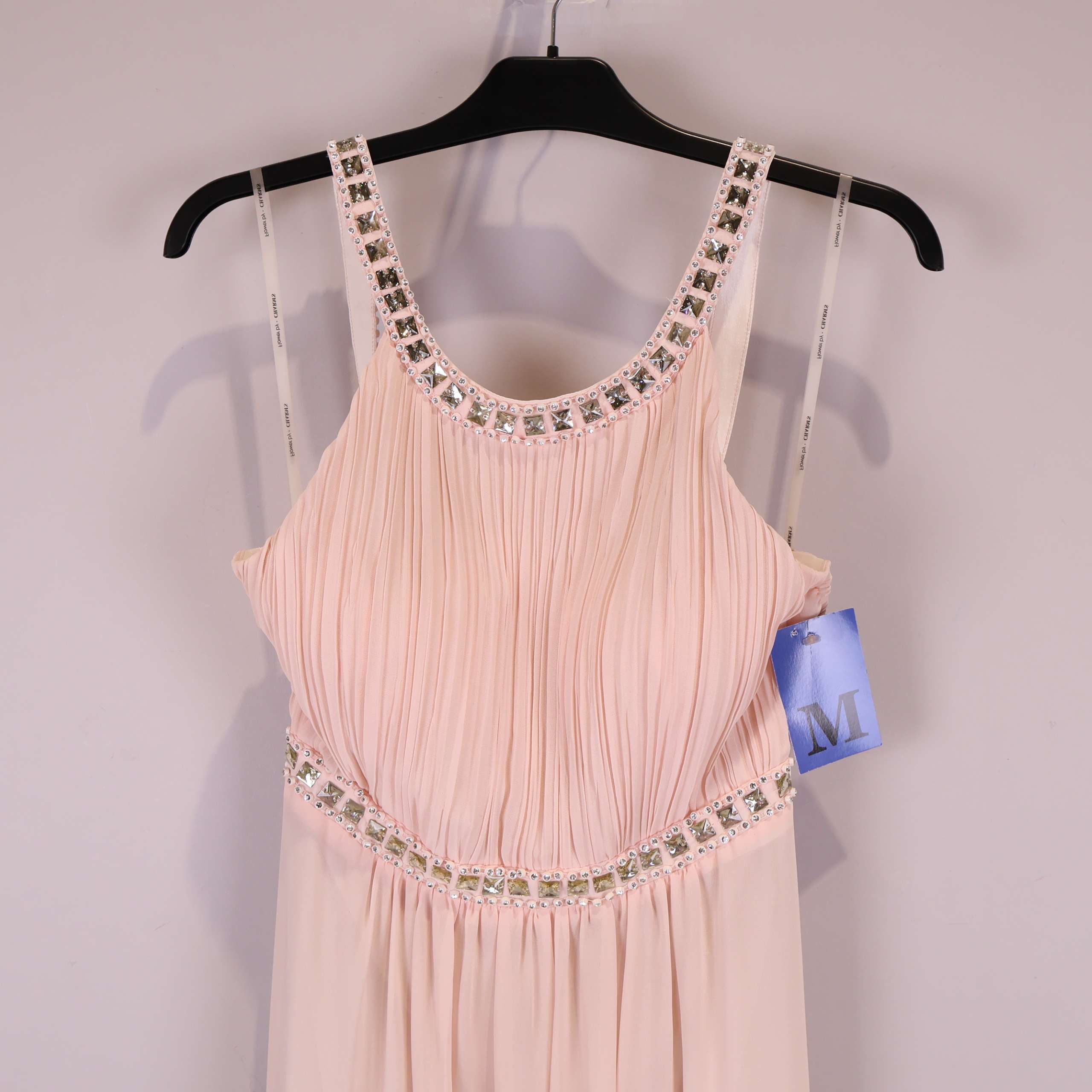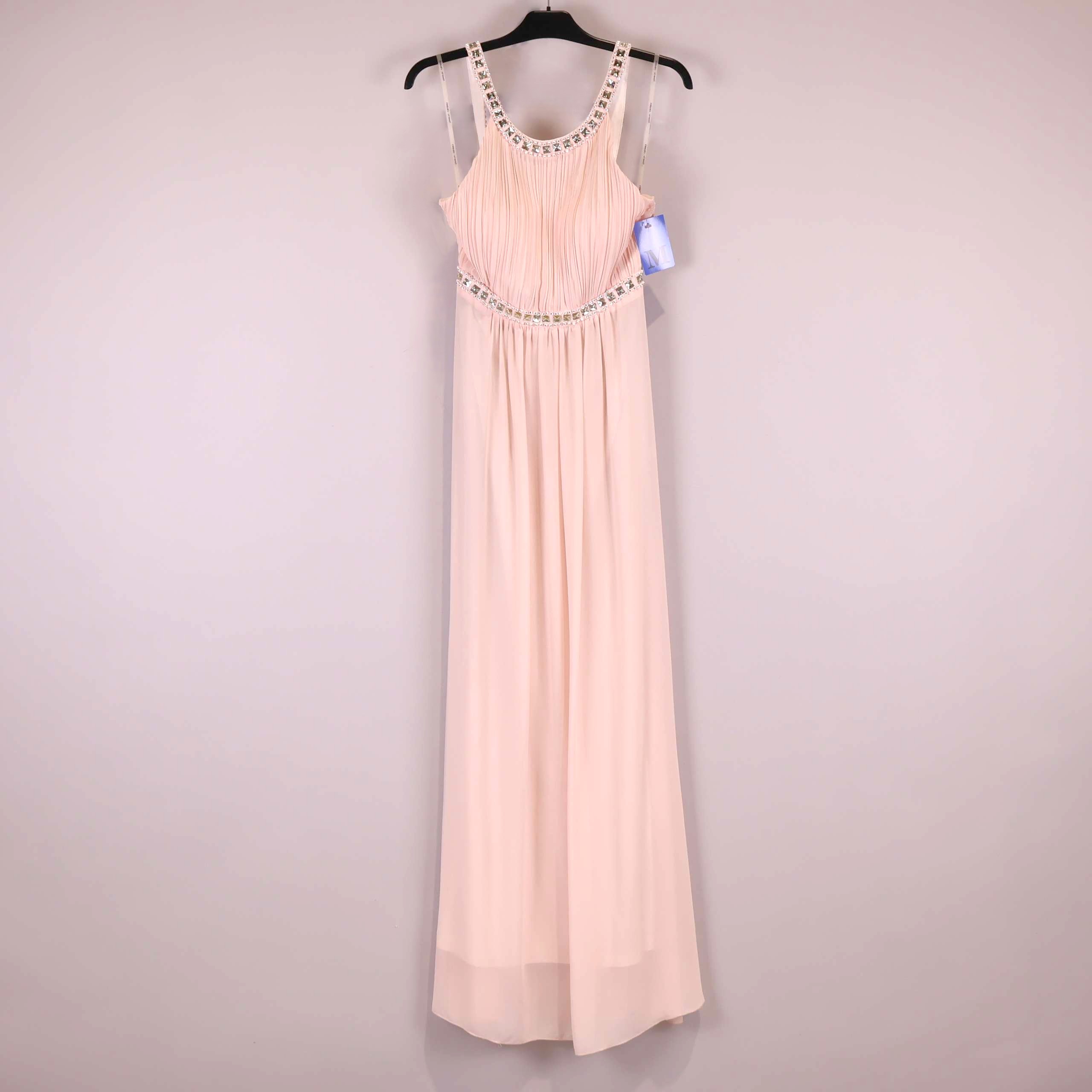 Elegant lång klänning i ljusrosa ton med gnistrande strassdekor vid halsringning och midja. Klänningen har smala axelband och vackert plisserad överdel som ger mjuk och flytande känsla. Baksidan bjuder på unika utskurna detaljer och markerad midja. Mjukt transparant tyg skapar en sofistikerad och festlig look – perfekt för dig som vill sticka ut på event med exklusiv touch.