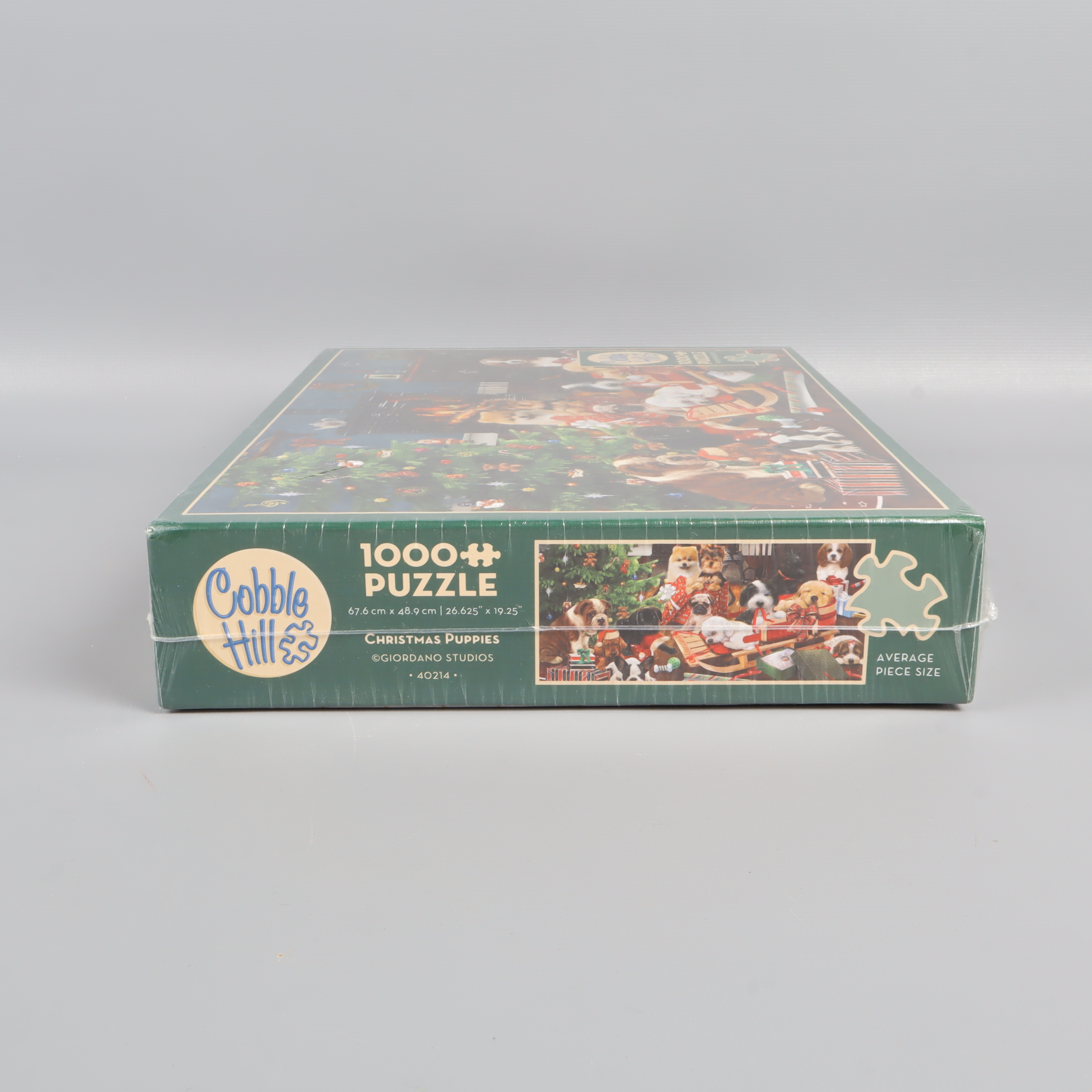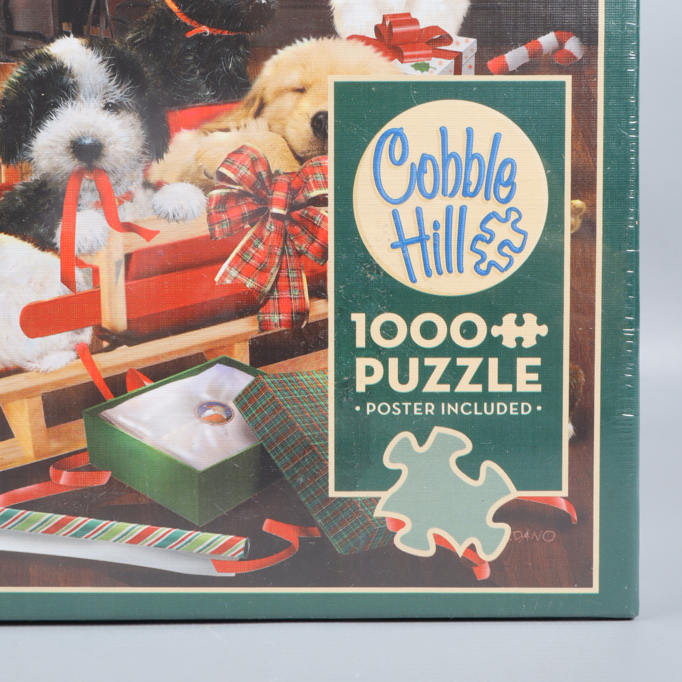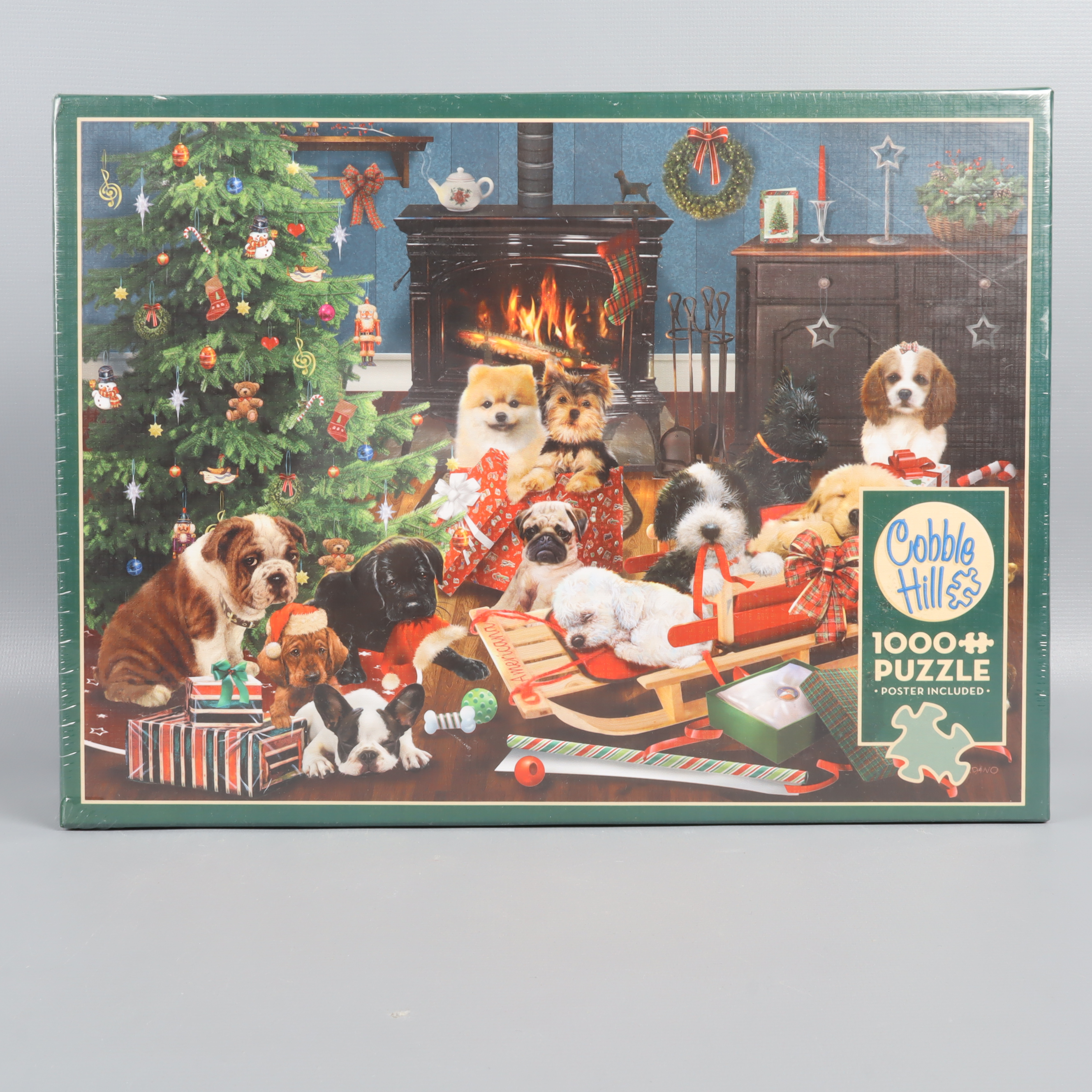 Charmigt pussel med livfullt hundmotiv där flera söta hundar är samlade runt en julgran och presentaskar, vilket ger en varm och mysig känsla. Lådan visar att pusslet har 1000 bitar och inkluderar även en affisch. Perfekt för dig som gillar detaljerade vintermotiv och vill ha en rolig utmaning med ett klassiskt Cobble Hill-utseende.