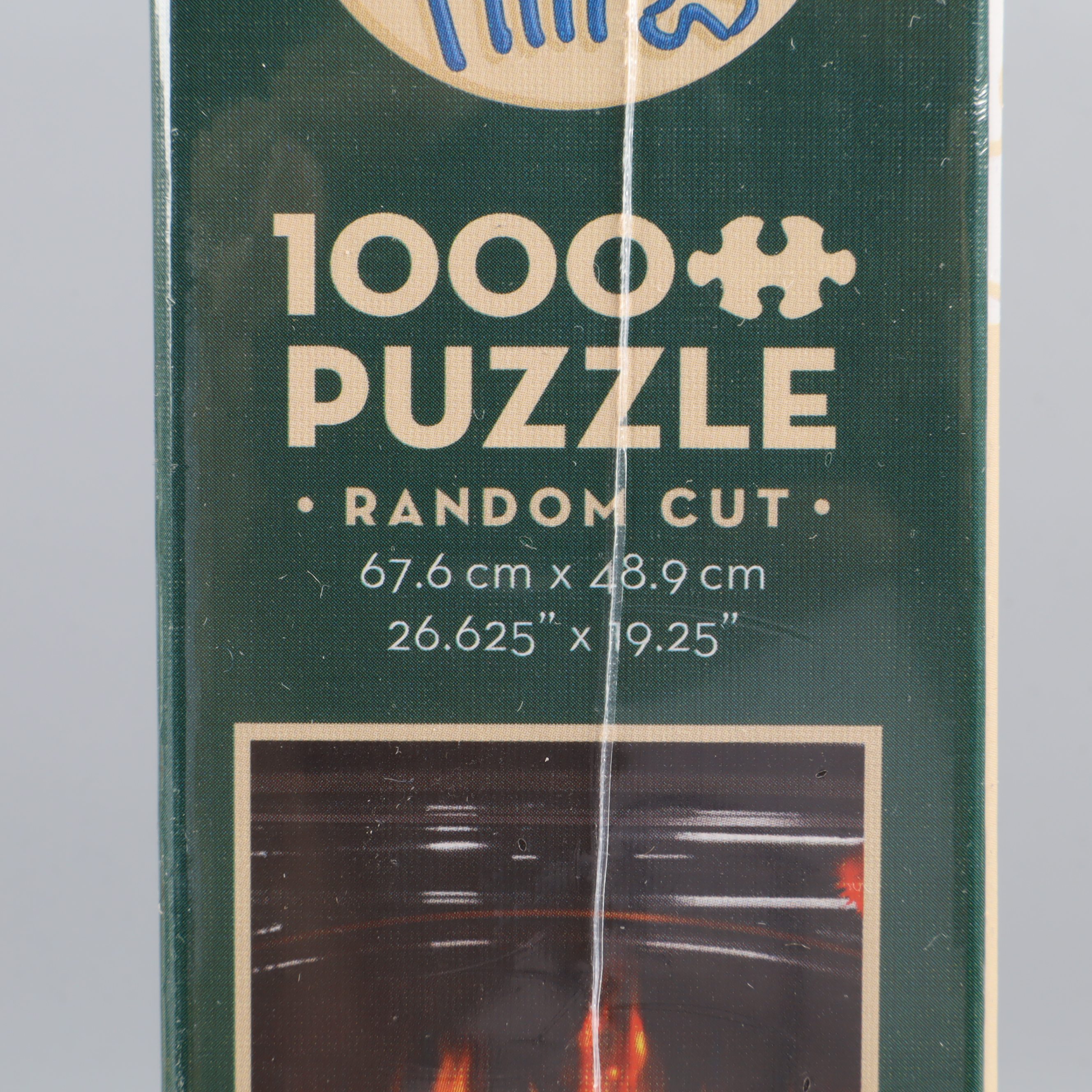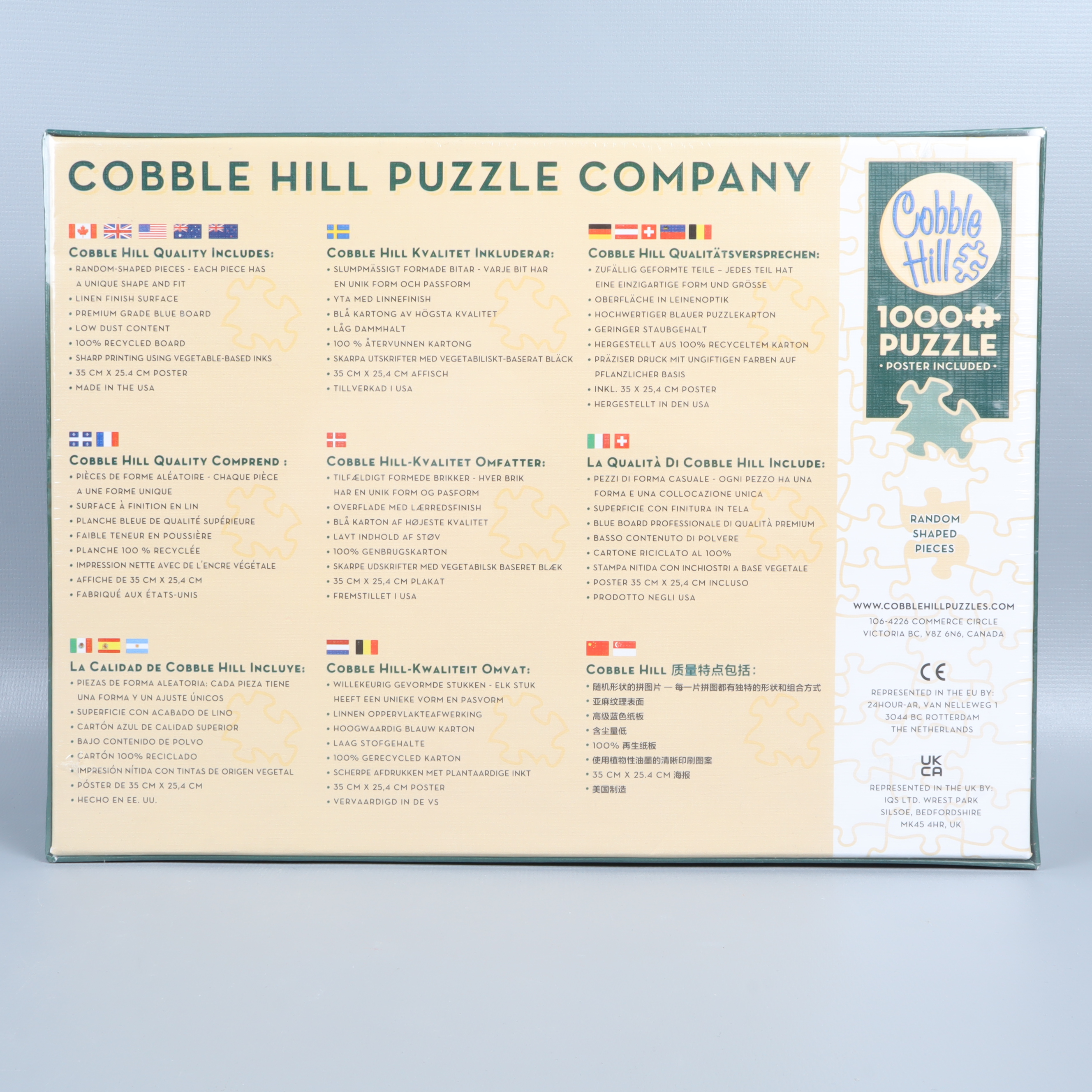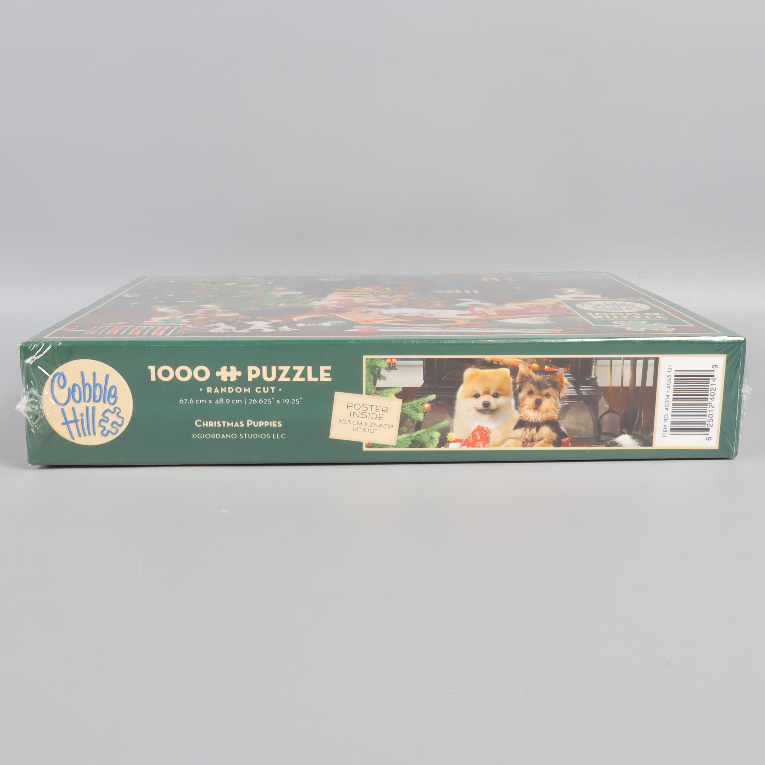Charmigt pussel med livfullt hundmotiv där flera söta hundar är samlade runt en julgran och presentaskar, vilket ger en varm och mysig känsla. Lådan visar att pusslet har 1000 bitar och inkluderar även en affisch. Perfekt för dig som gillar detaljerade vintermotiv och vill ha en rolig utmaning med ett klassiskt Cobble Hill-utseende.