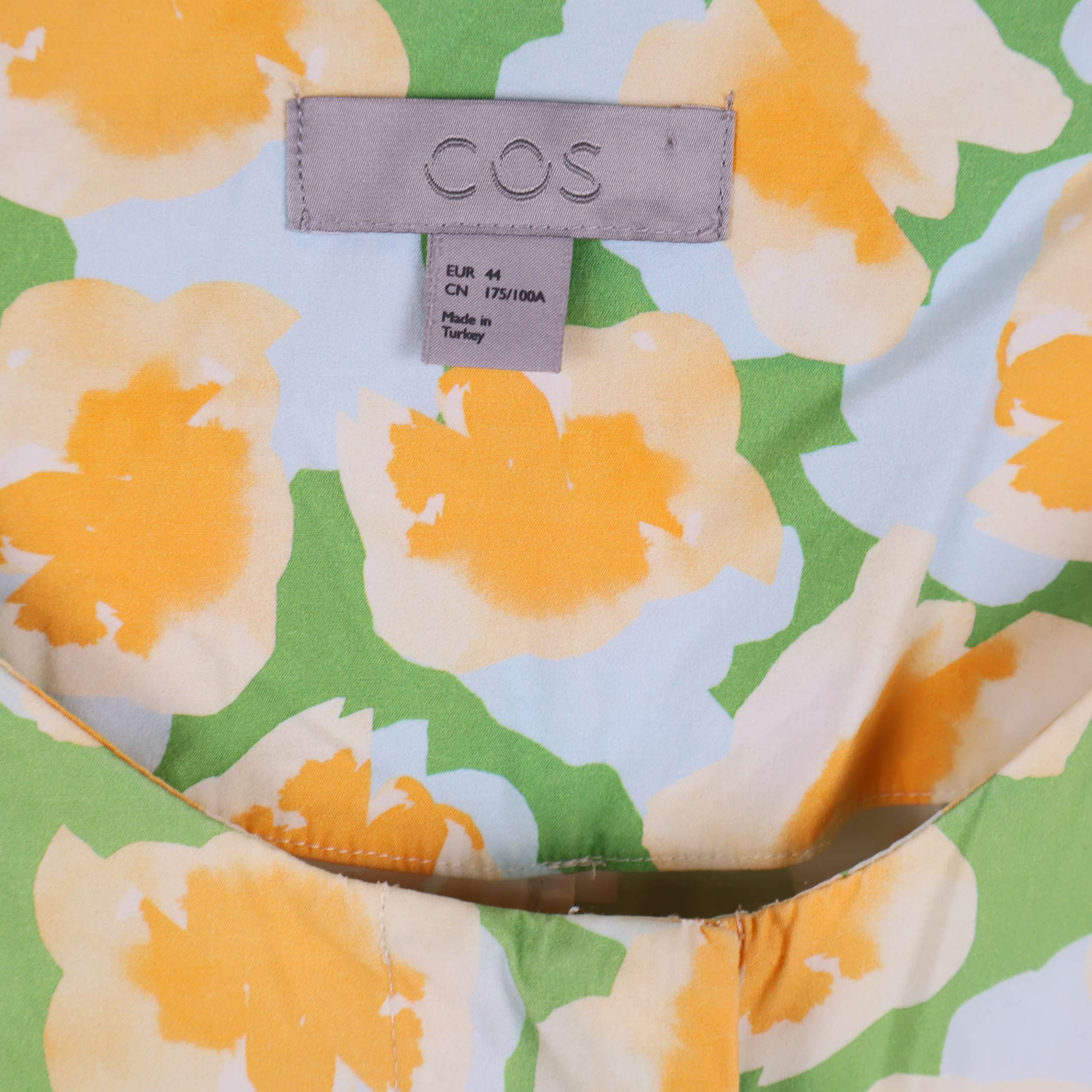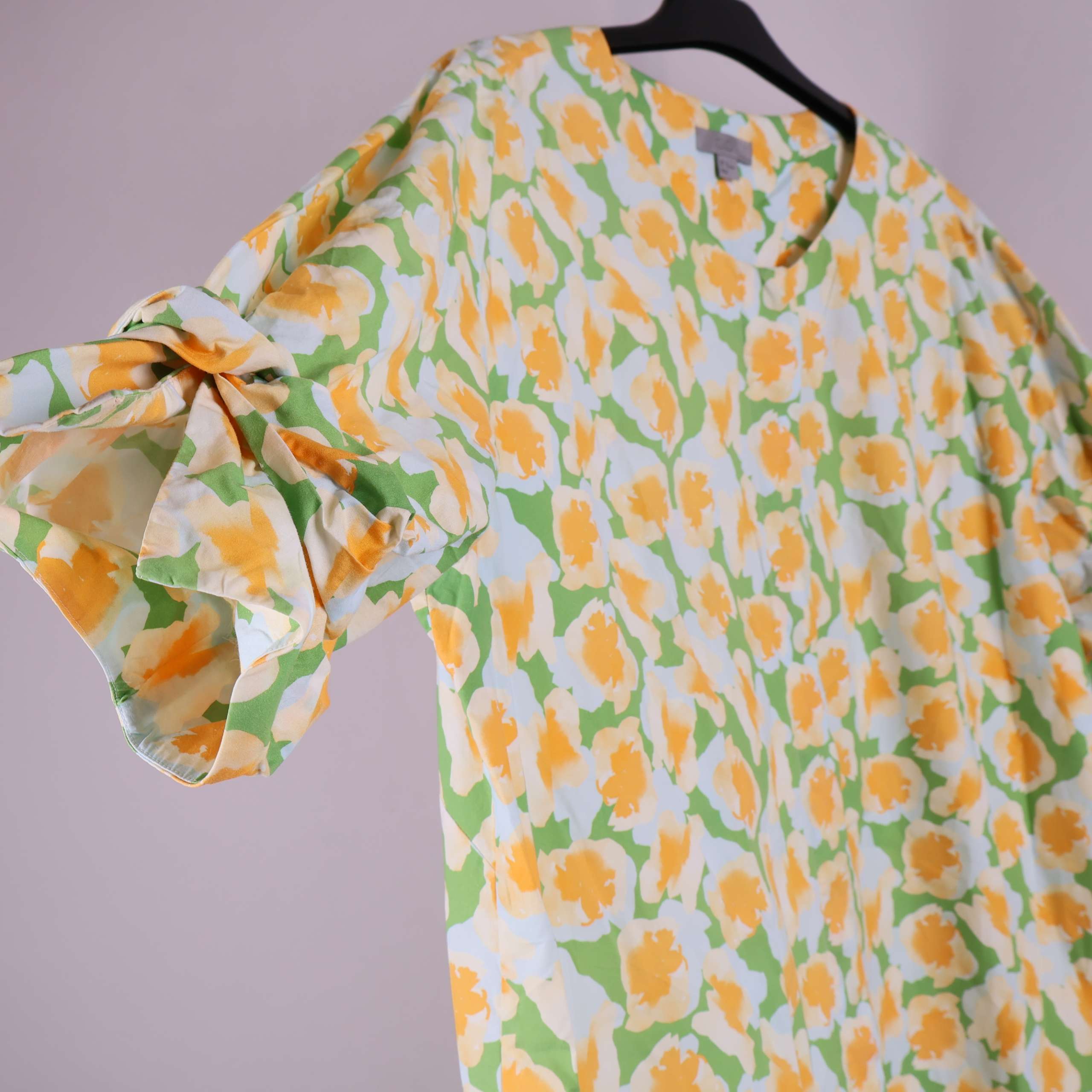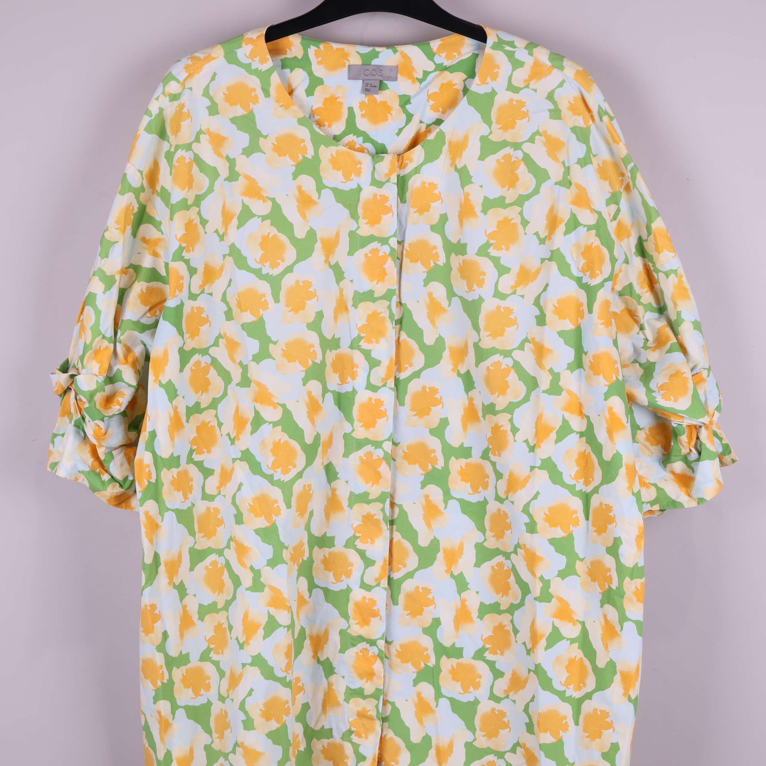 Den här klänningen från COS har en färgstark blommig design i grönt, gult och vitt. Generös och ledig passform med feminina volymärmar och knytband som detalj. Materialet känns mjukt och lätt, perfekt för ett lekfullt och bekvämt uttryck. Den är öppen framtill med knappar och har en modern siluett med en avslappnad, contemporary vibe.