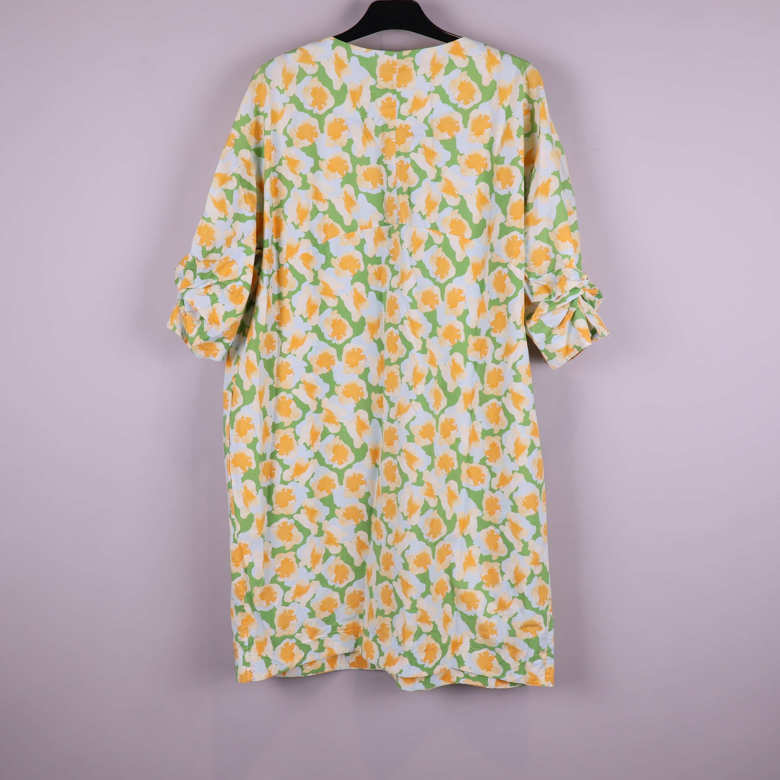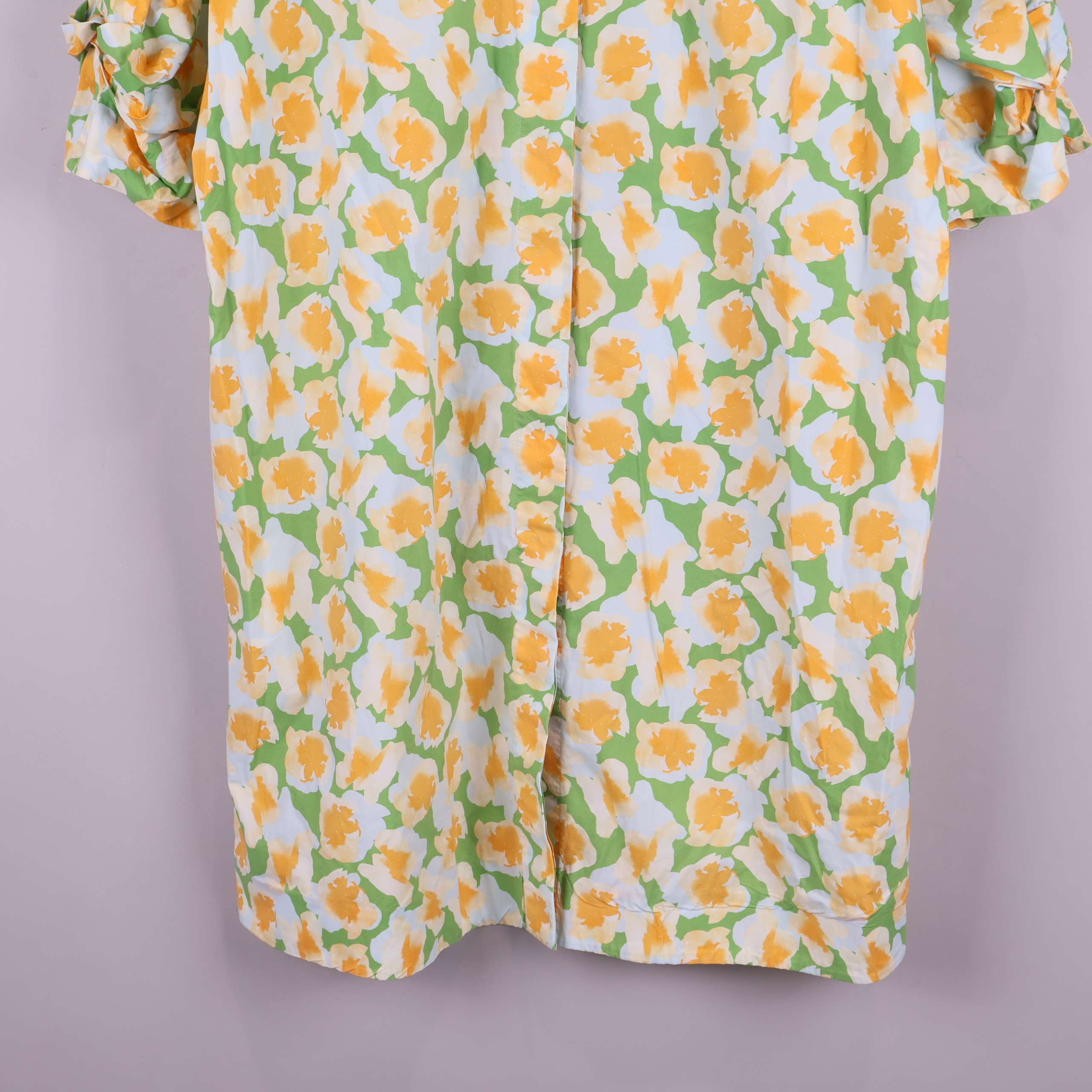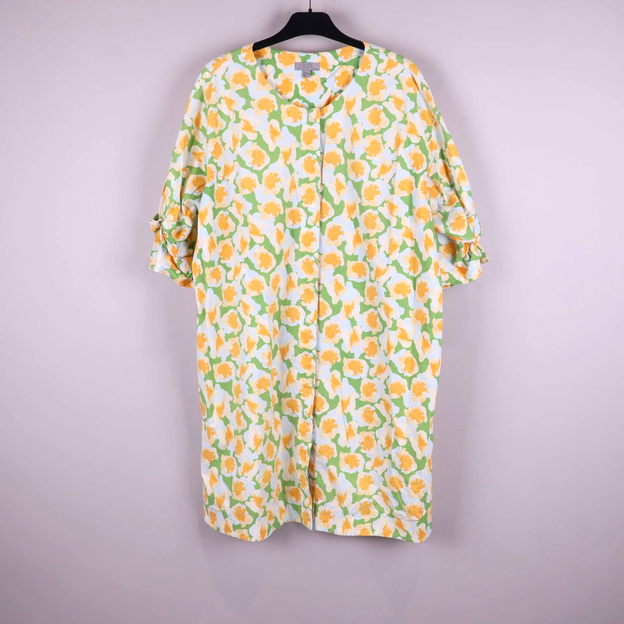 Den här klänningen från COS har en färgstark blommig design i grönt, gult och vitt. Generös och ledig passform med feminina volymärmar och knytband som detalj. Materialet känns mjukt och lätt, perfekt för ett lekfullt och bekvämt uttryck. Den är öppen framtill med knappar och har en modern siluett med en avslappnad, contemporary vibe.