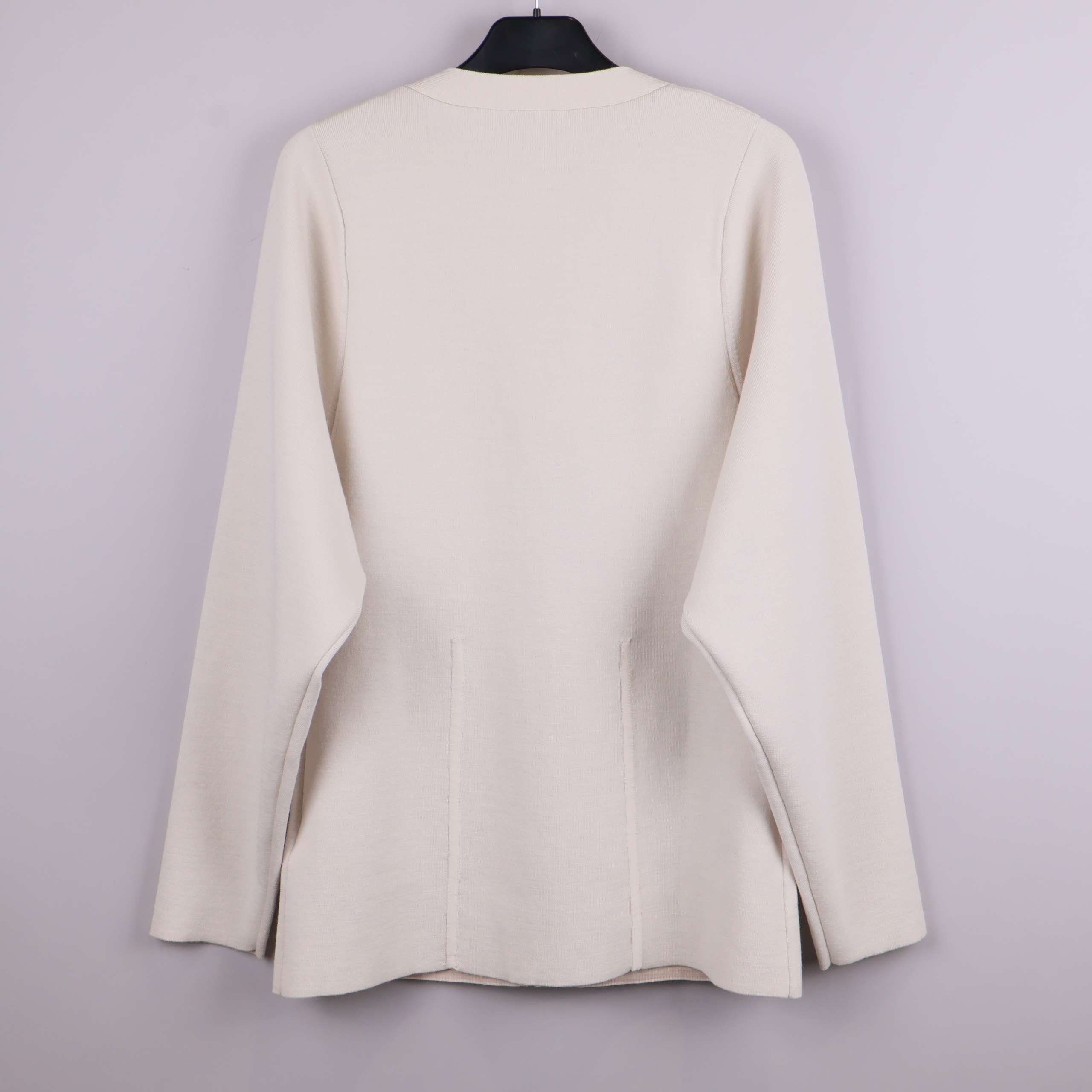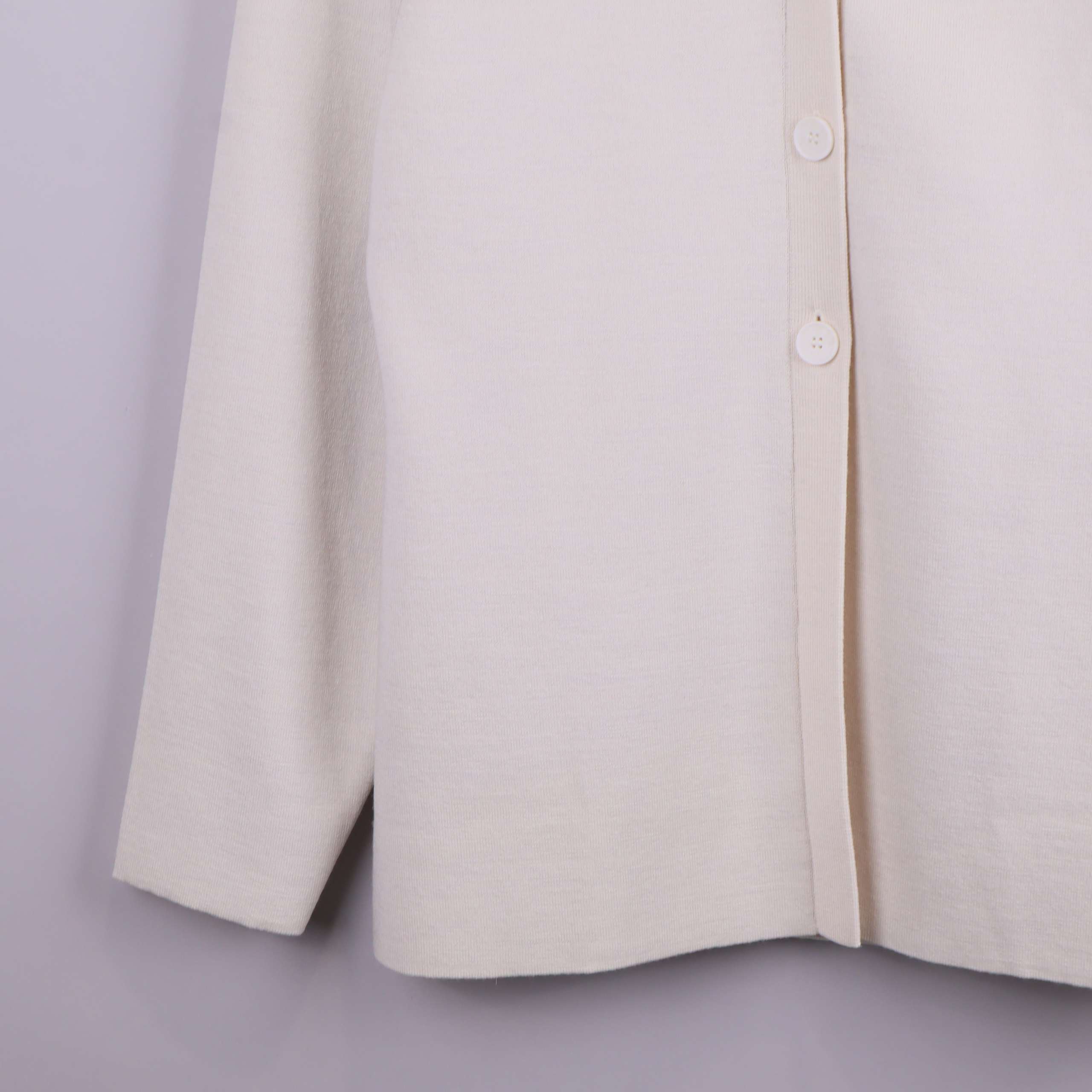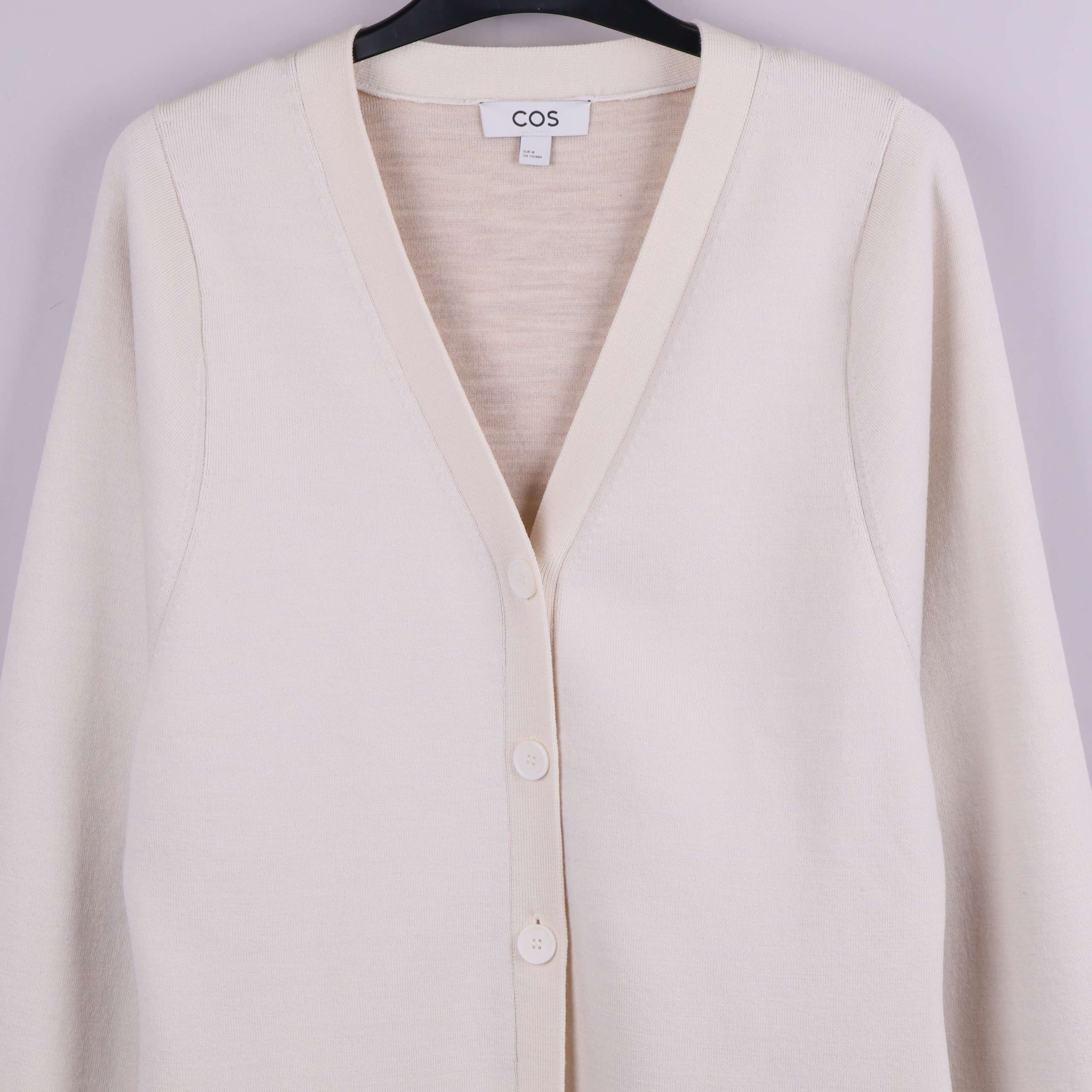 Mjuk, stickad cardigan från COS i en ljus beige ton med klassisk V-ringning och tre matchande knappar framtill. Modellen har lång ärm och stilrena detaljer för en clean och tidlös look. Rak passform och minimalistisk känsla gör den enkel att styla både till vardags och jobb.