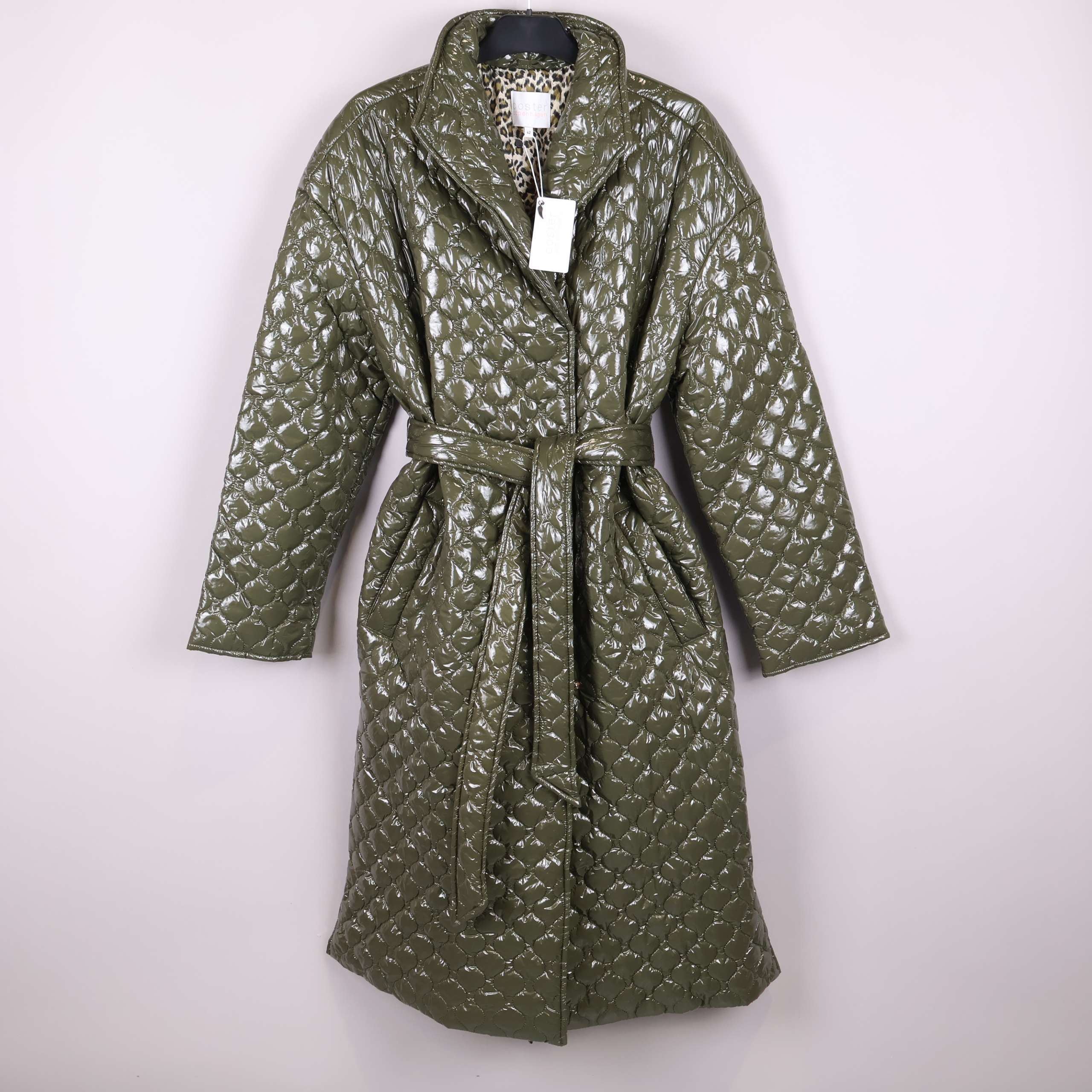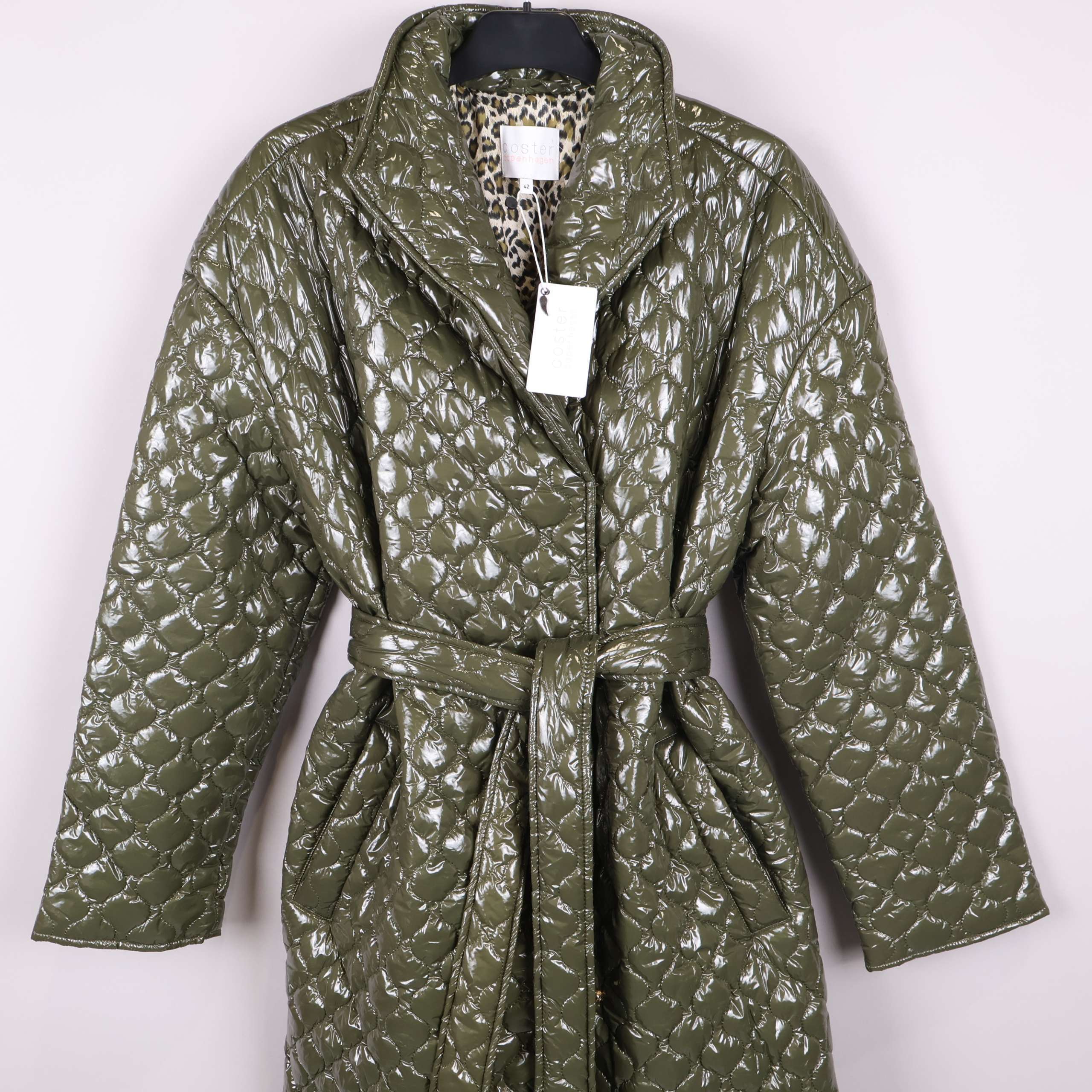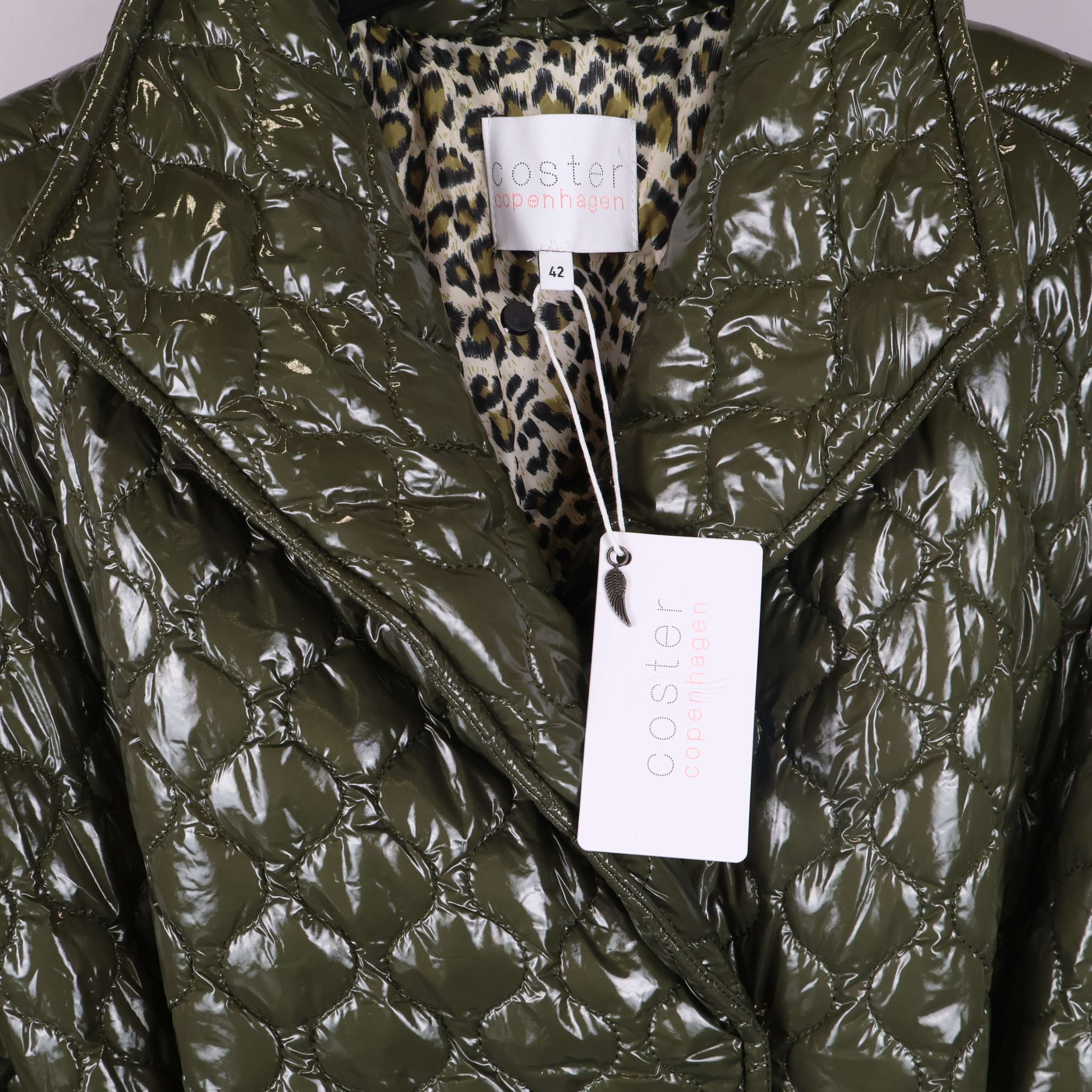 Glänsande quiltad lång jacka med markerad krage och bälte i midjan som ger en snygg siluett. Utsidan har en effektiv rutig struktur medan insidan överraskar med ett färgstarkt leopardmönster.