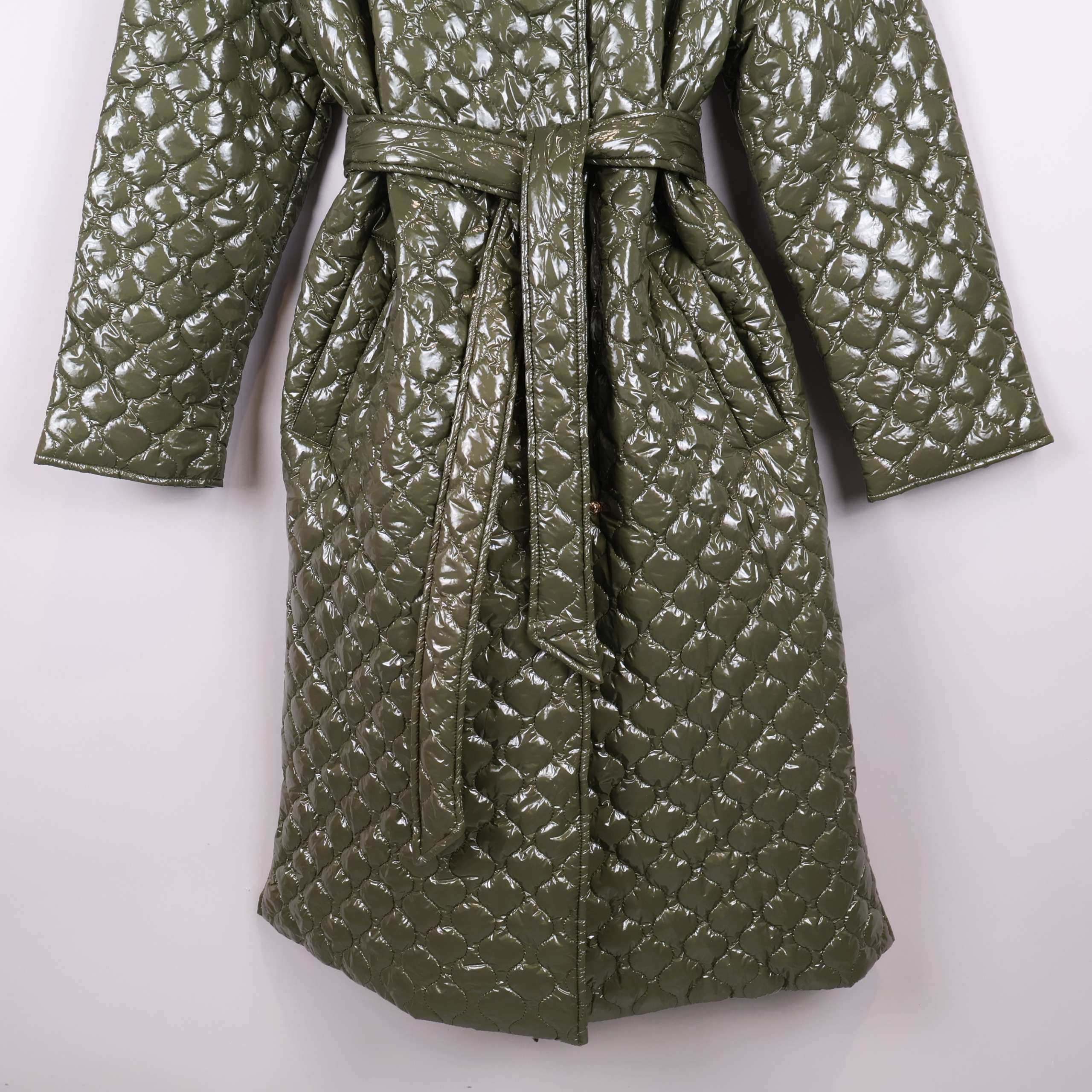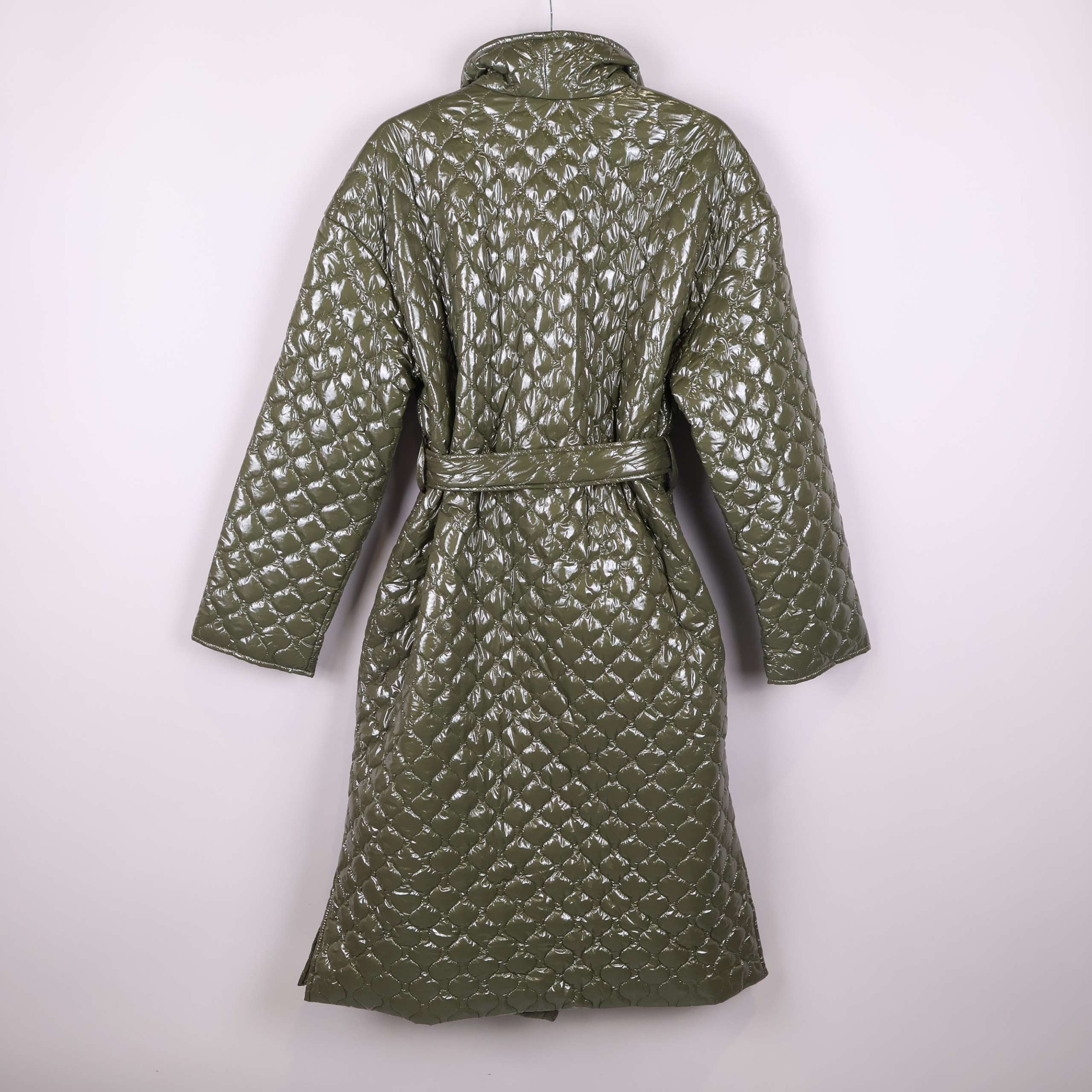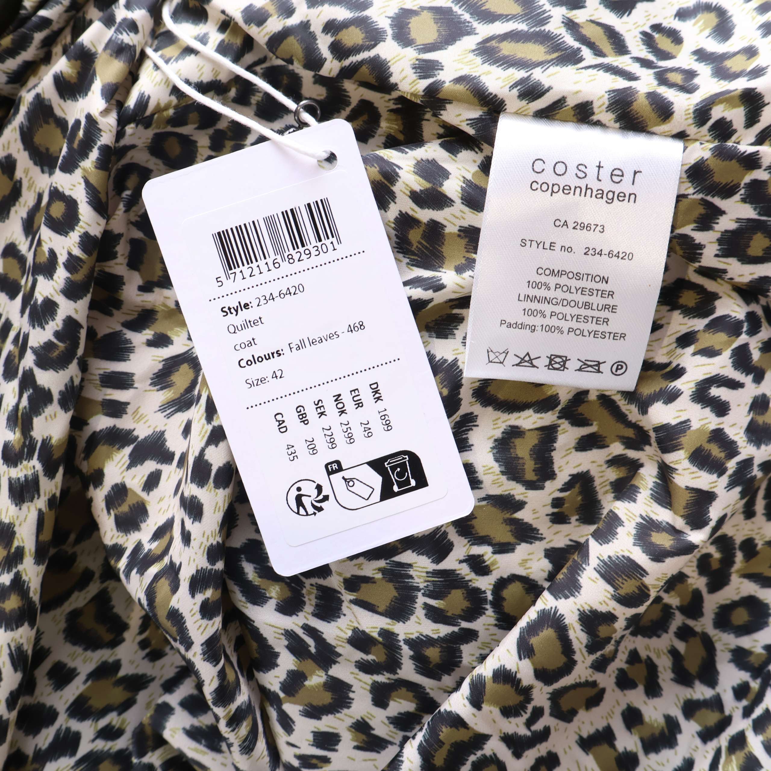 Glänsande quiltad lång jacka med markerad krage och bälte i midjan som ger en snygg siluett. Utsidan har en effektiv rutig struktur medan insidan överraskar med ett färgstarkt leopardmönster.
