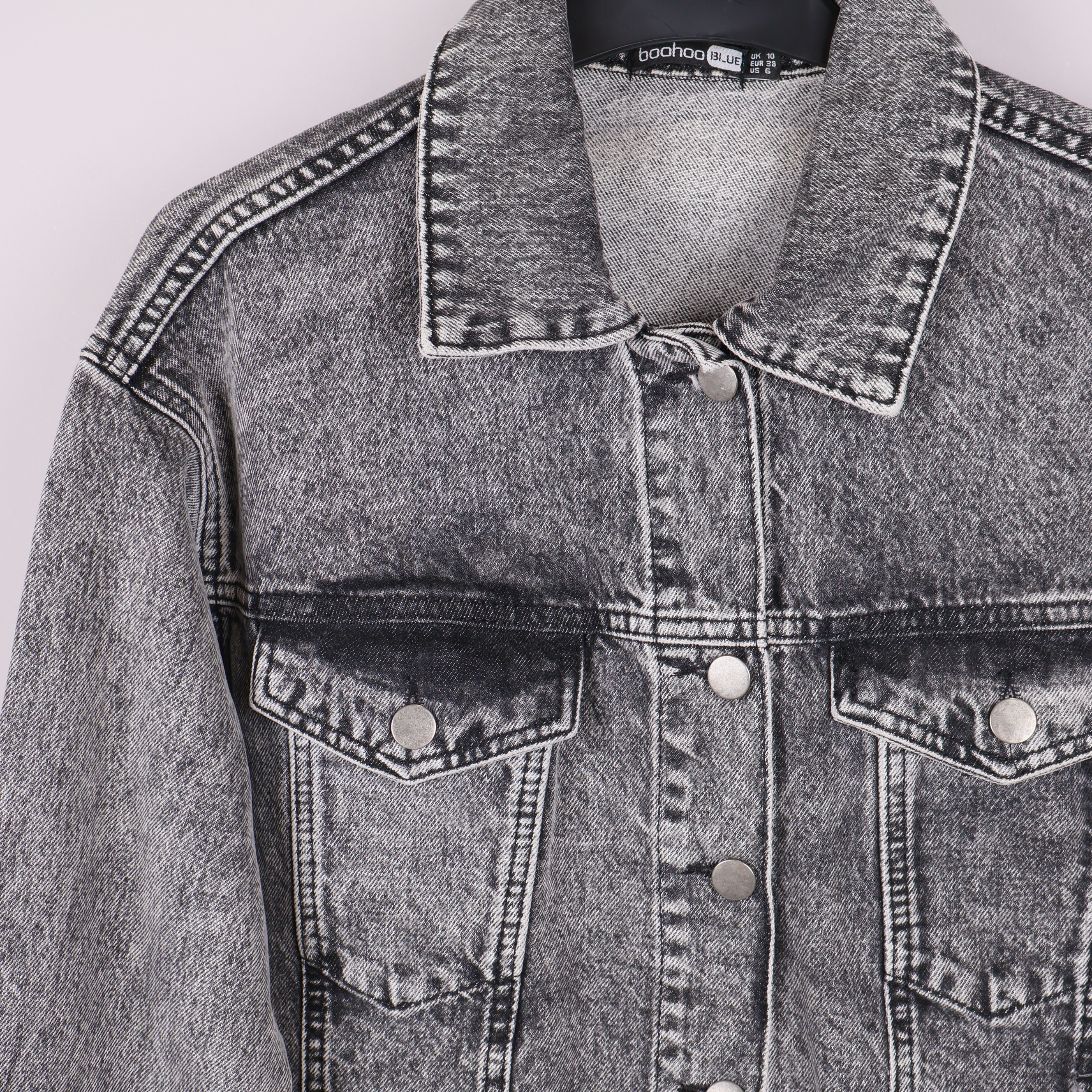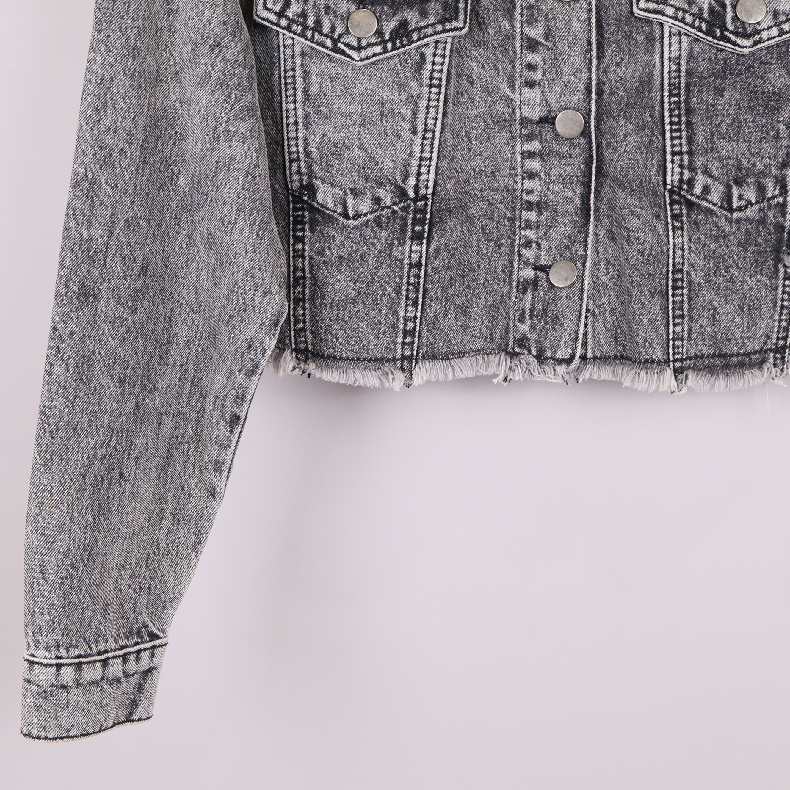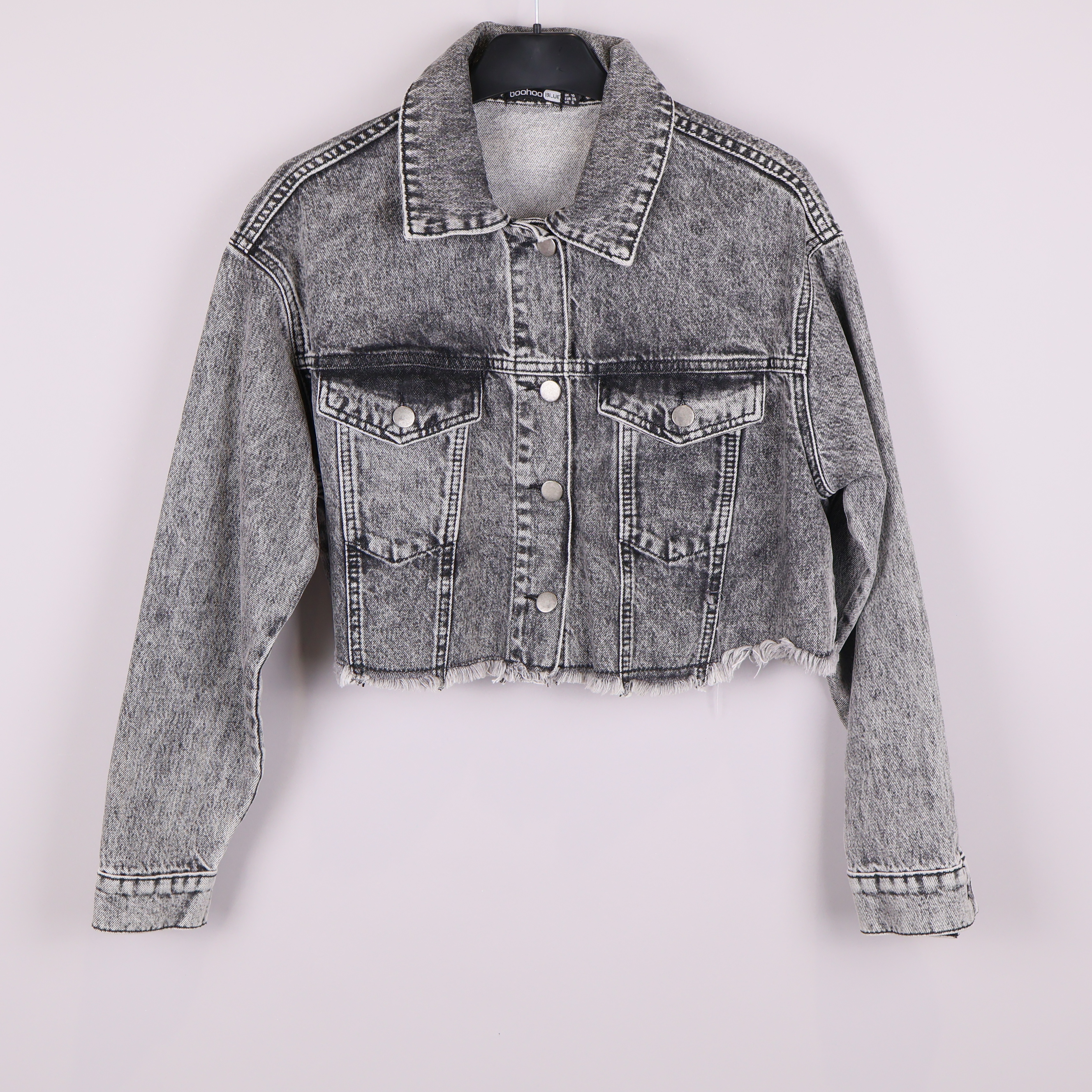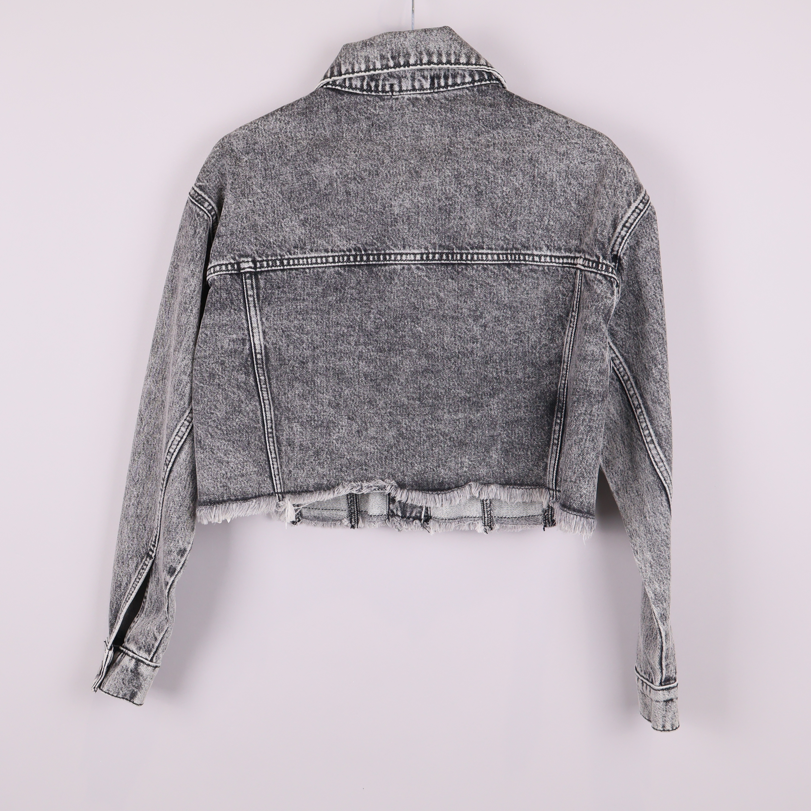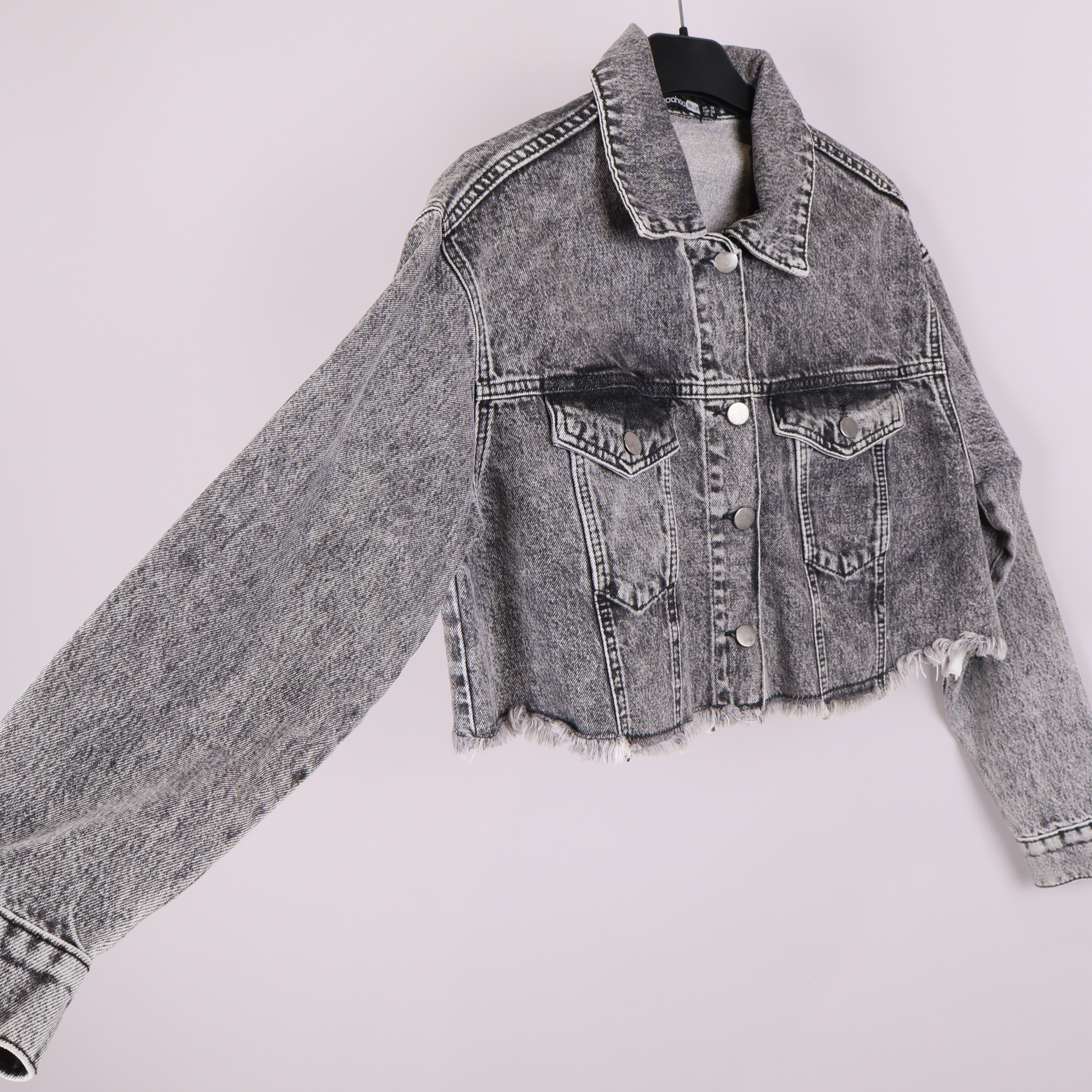 Tuff cropped jeansjacka i gråtvättad denim med markerad rå kant nedtill för en modern look. Jackan har klassisk krage, knappstängning och två bröstfickor med lock. Den gråsvarta tvätten ger en tydlig vintage vibe och gör det lätt att matcha jackan med olika outfits. Oversized ärmar och robust känsla i materialet för en avslappnat cool stil.