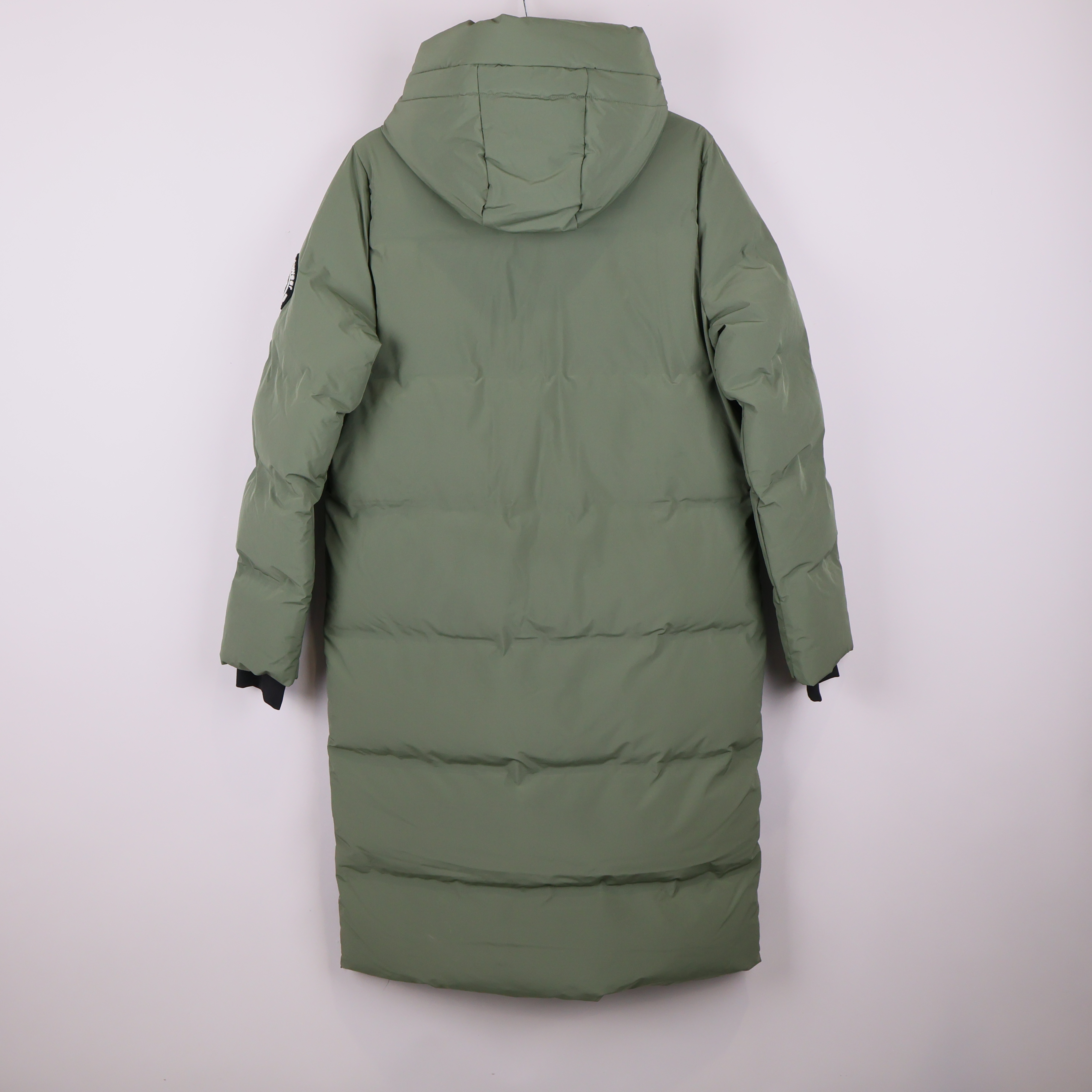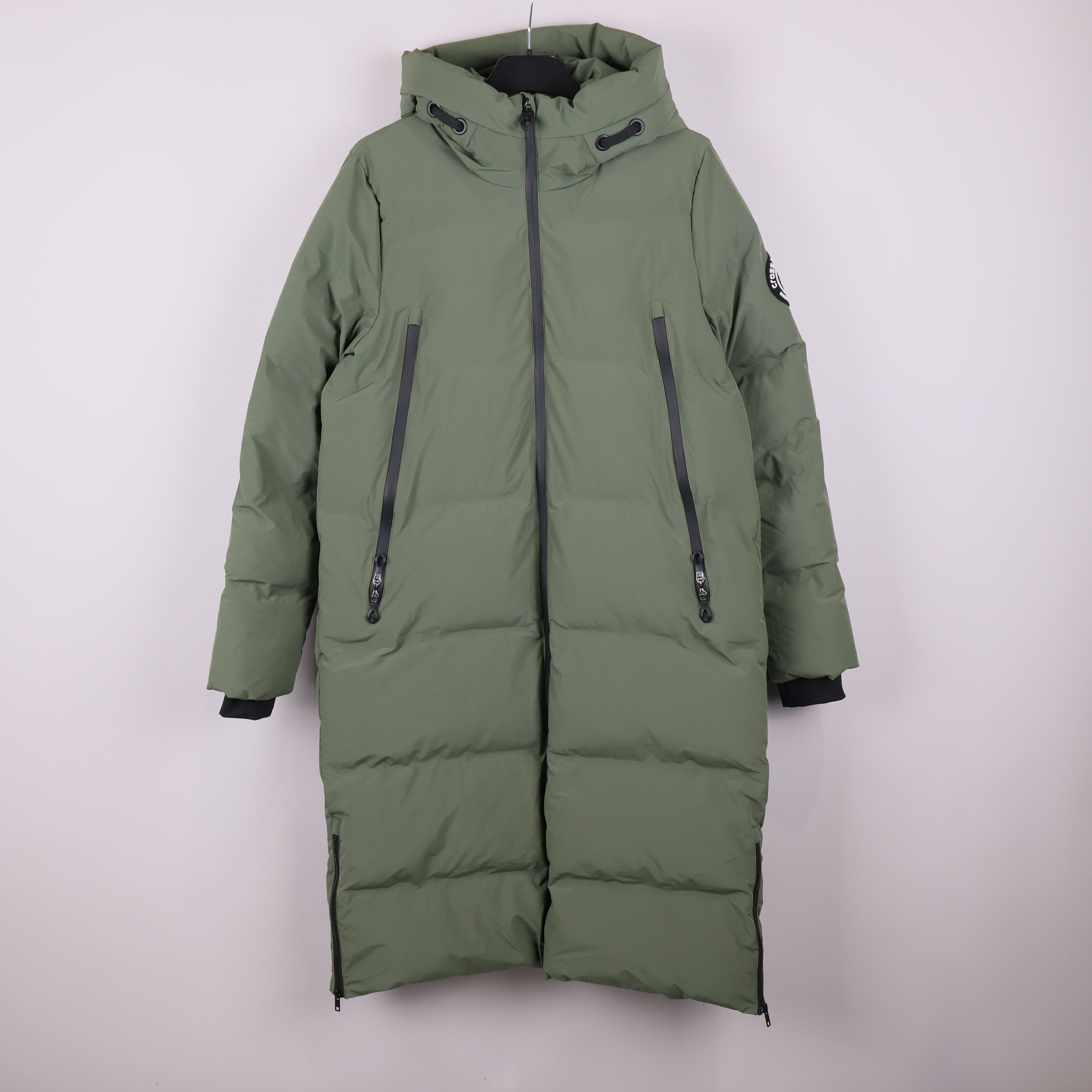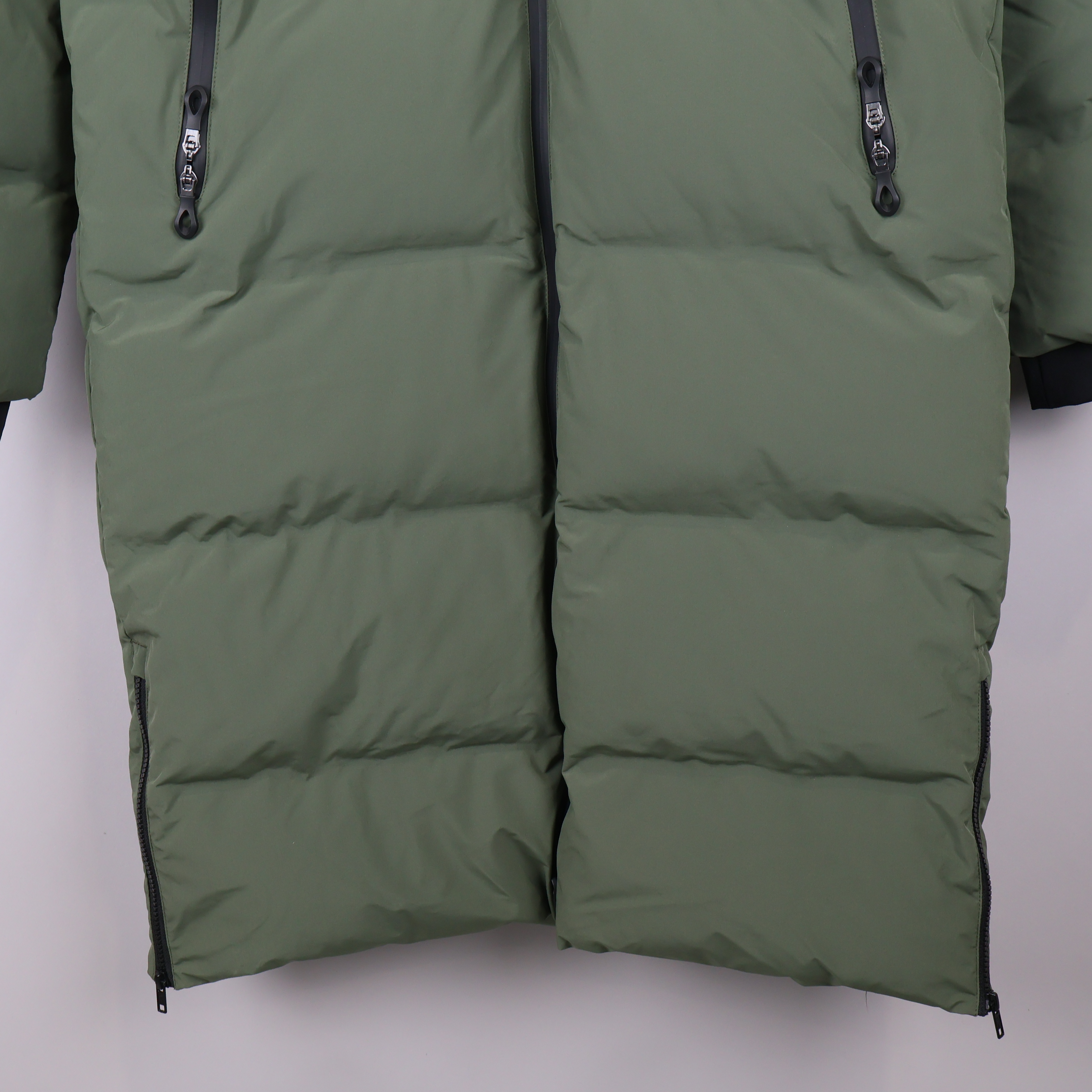 Lång, vadderad parkas med huva i en matt grön ton. Jackan har två stora framfickor med svarta dragkedjor och dekorativ patch på ena ärmen. Synliga muddar vid ärmslut och långa dragkedjor i sidorna ger en modern och funktionell look.