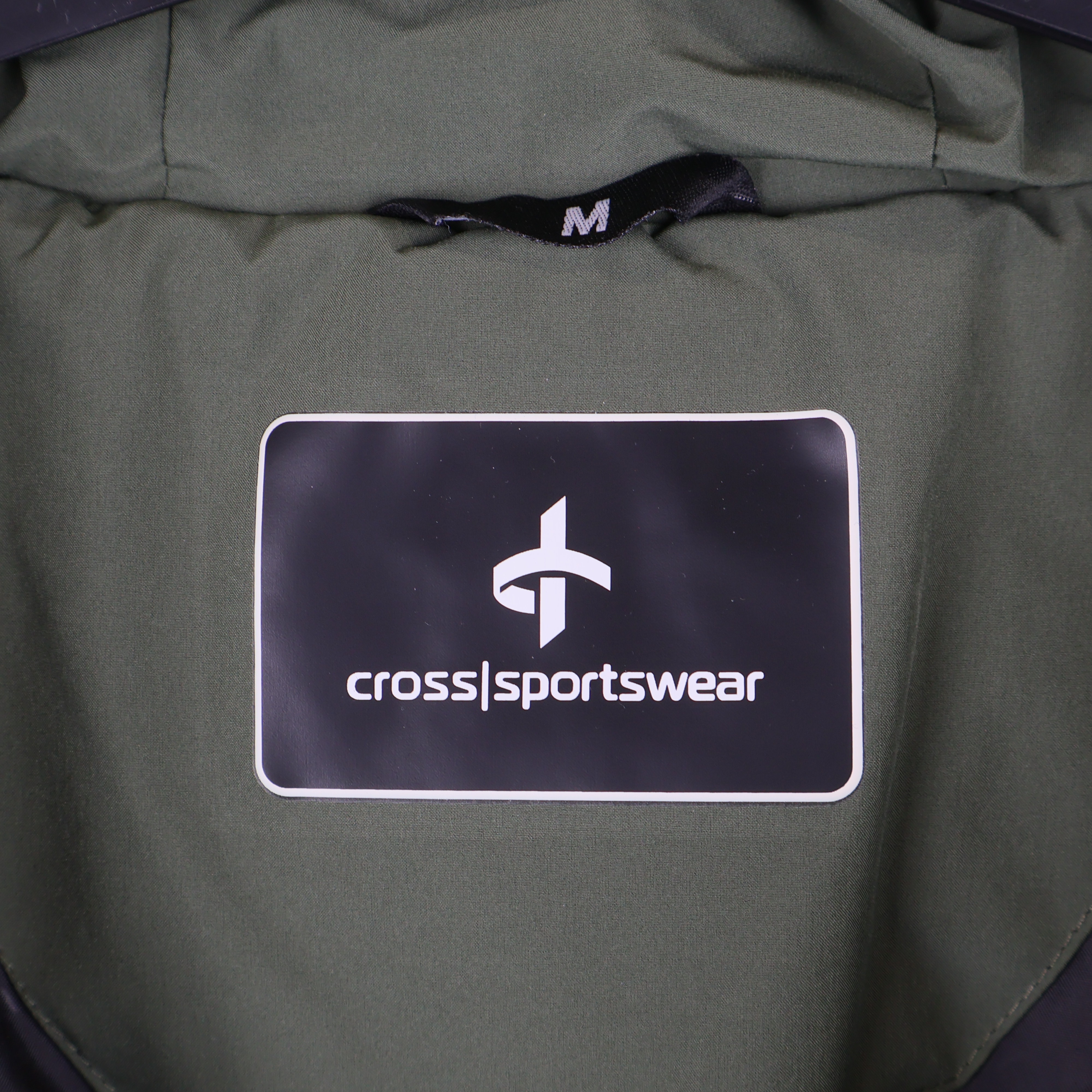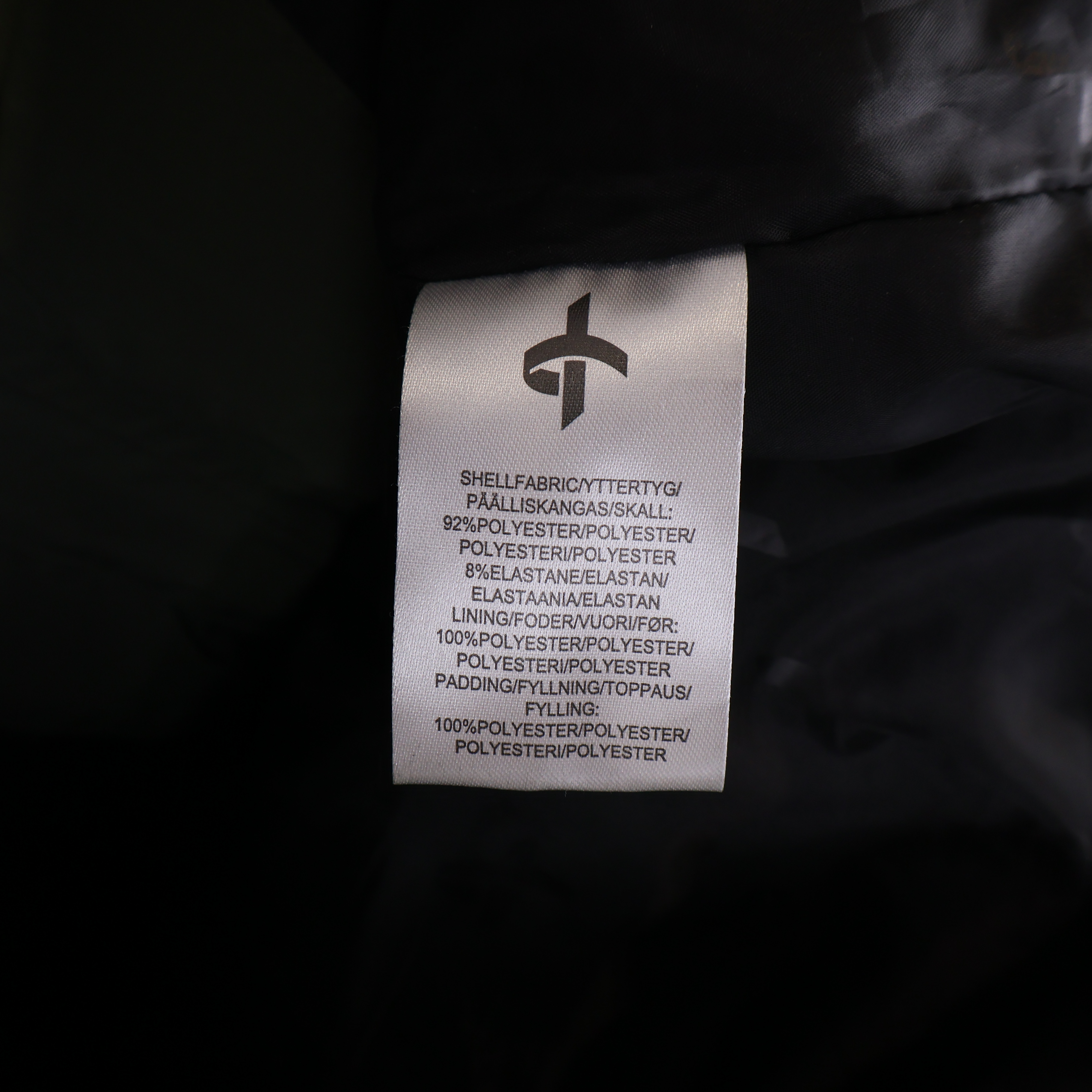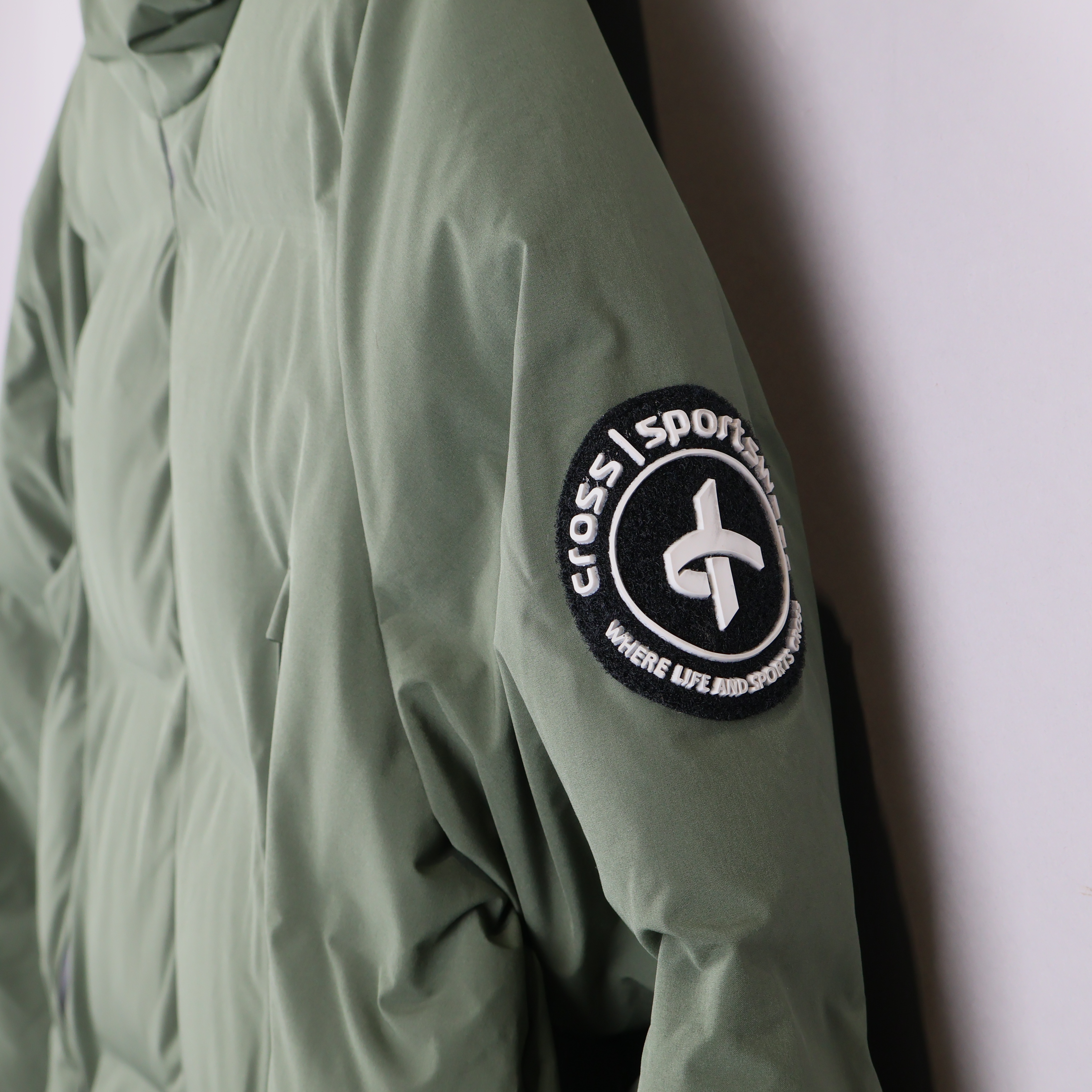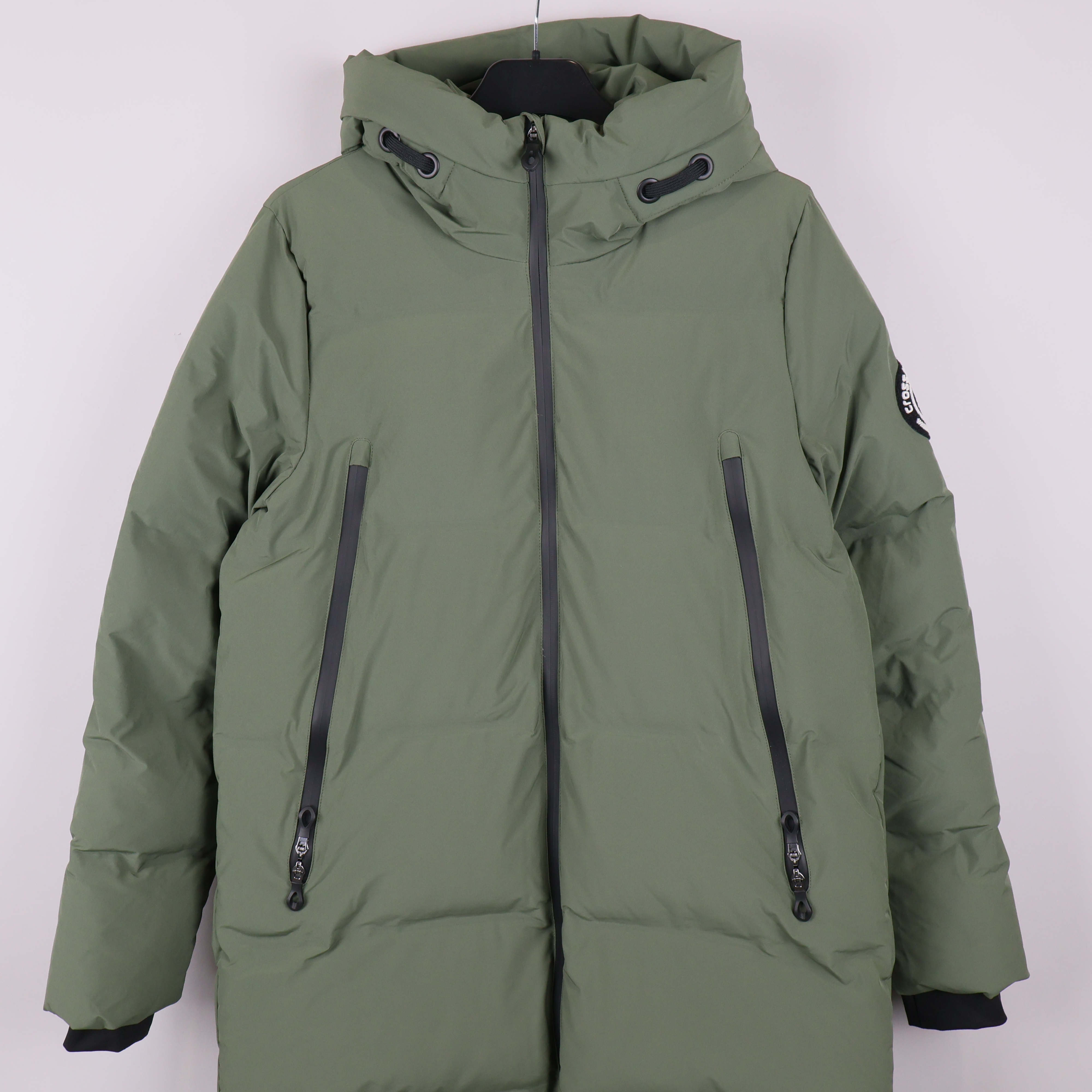 Lång, vadderad parkas med huva i en matt grön ton. Jackan har två stora framfickor med svarta dragkedjor och dekorativ patch på ena ärmen. Synliga muddar vid ärmslut och långa dragkedjor i sidorna ger en modern och funktionell look.
