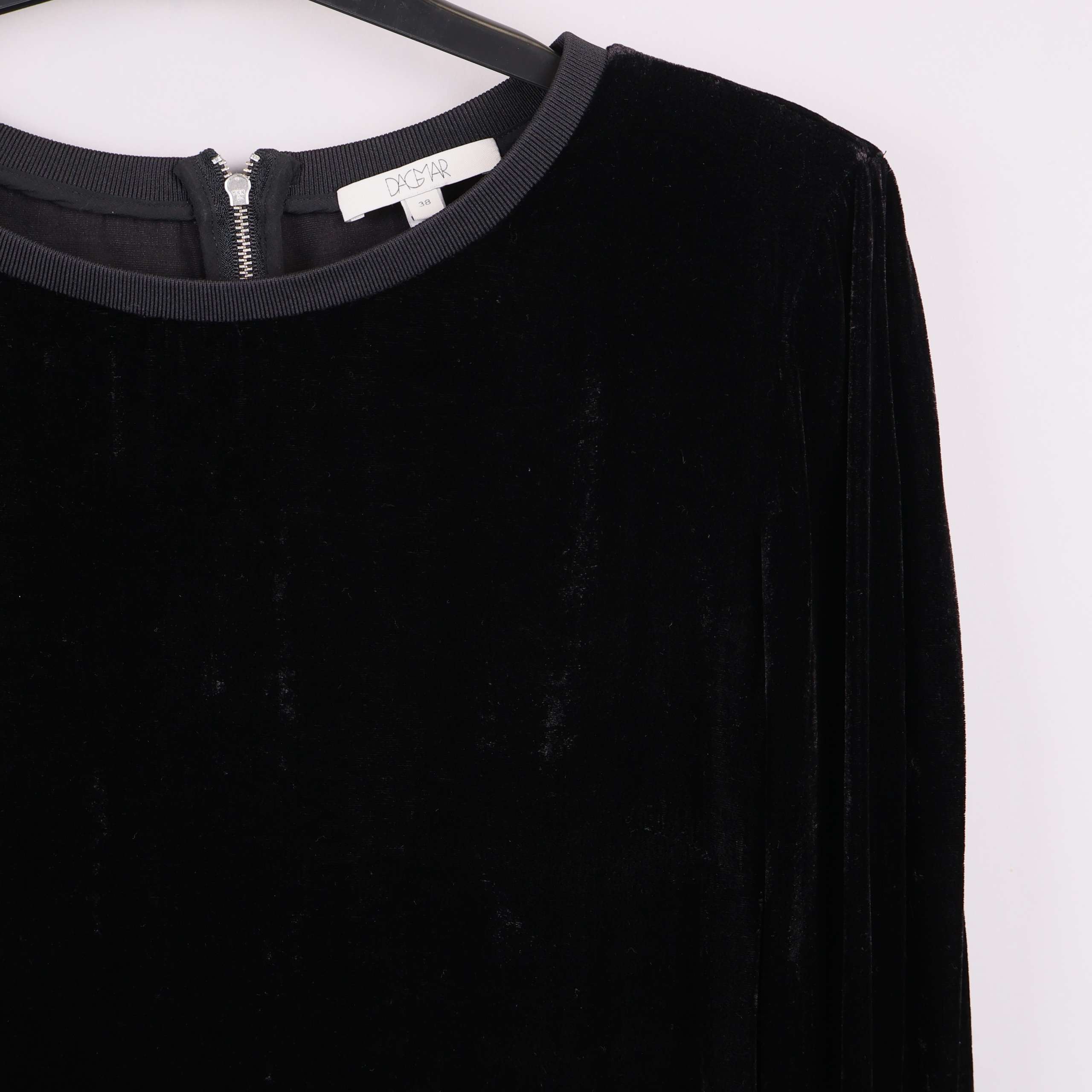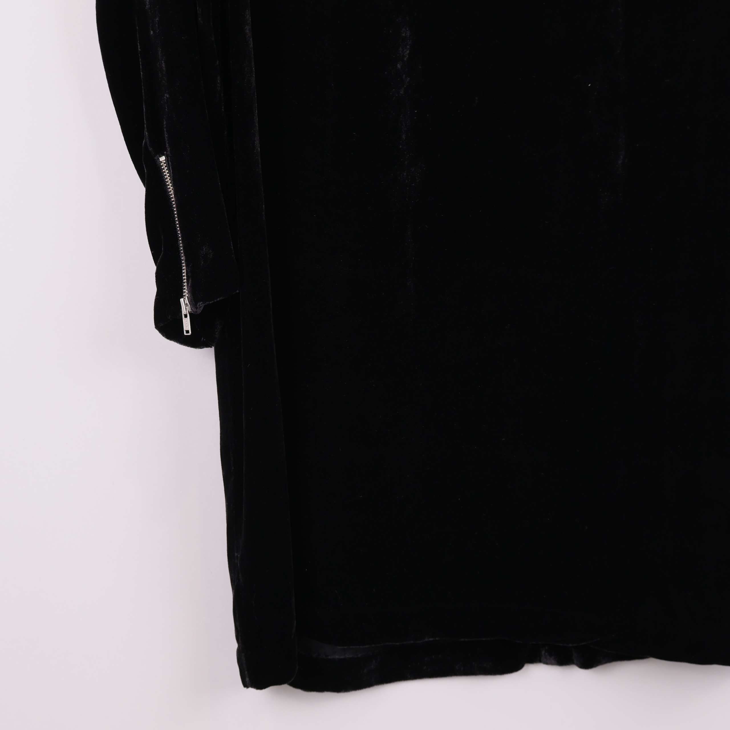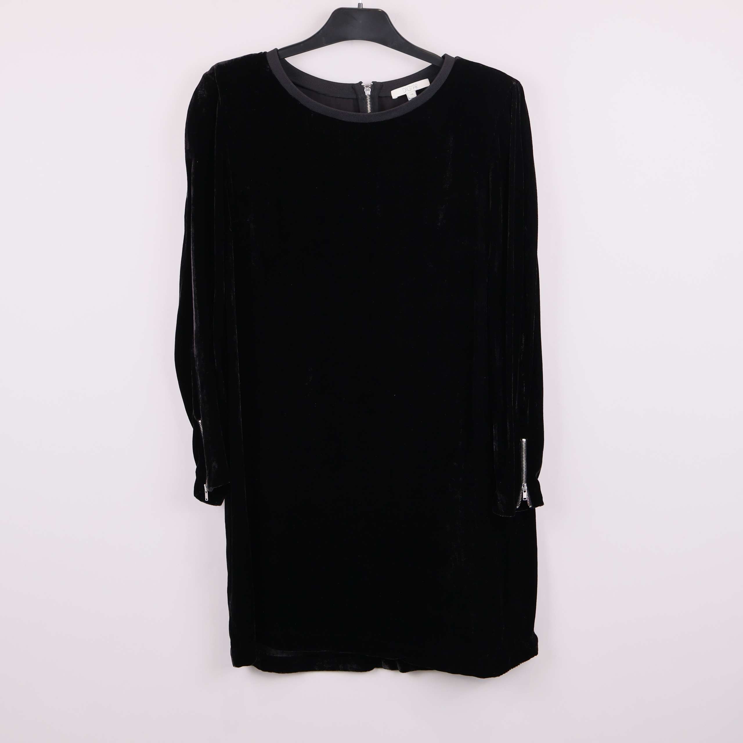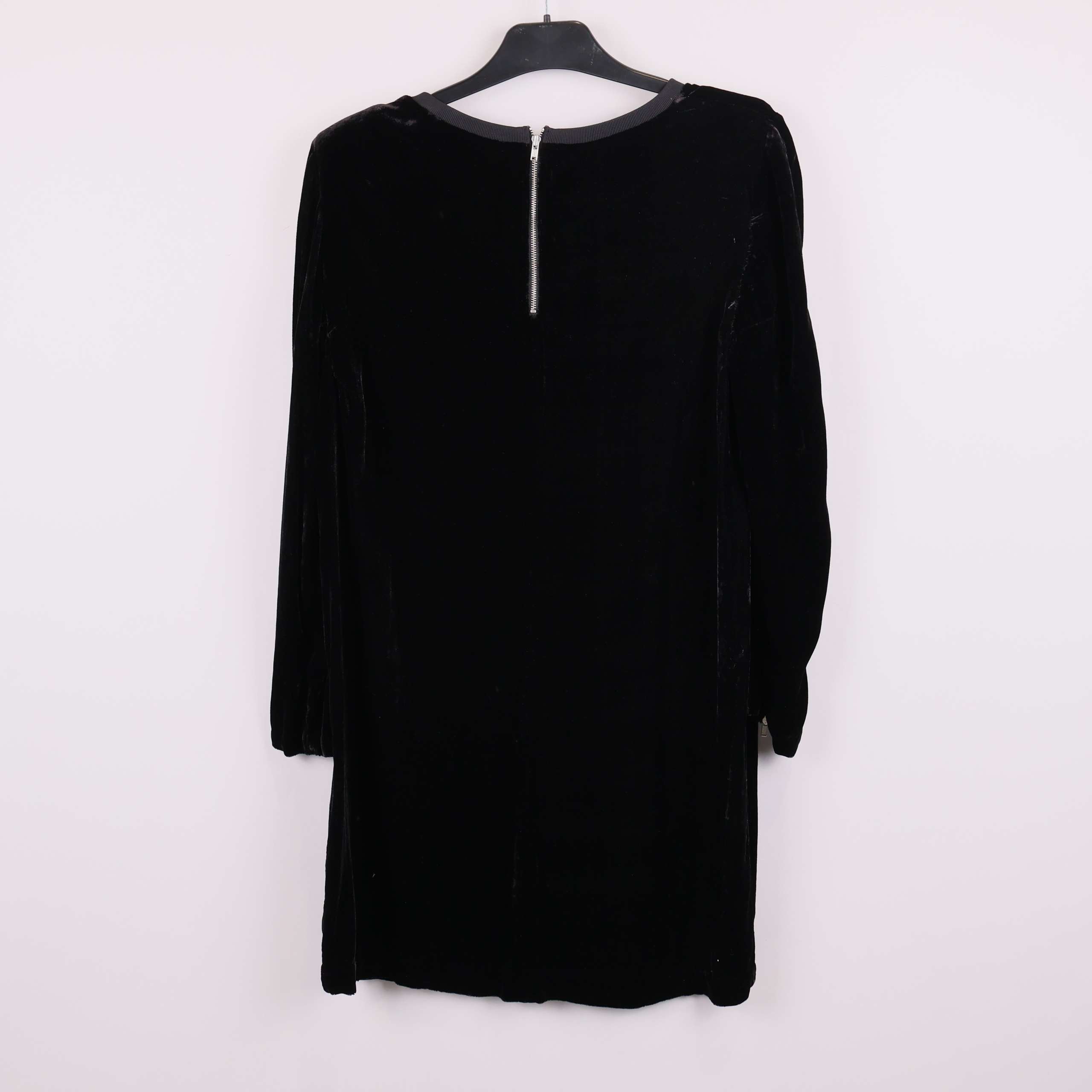 Elegant brun/svart klänning i sammetsliknande material med rund halsringning och dekorativ dragkedja bak. Modellen har långa ärmar och mjukt skimrande yta för en sofistikerad känsla. Dold dragkedja vid ärmslut ger en modern touch.