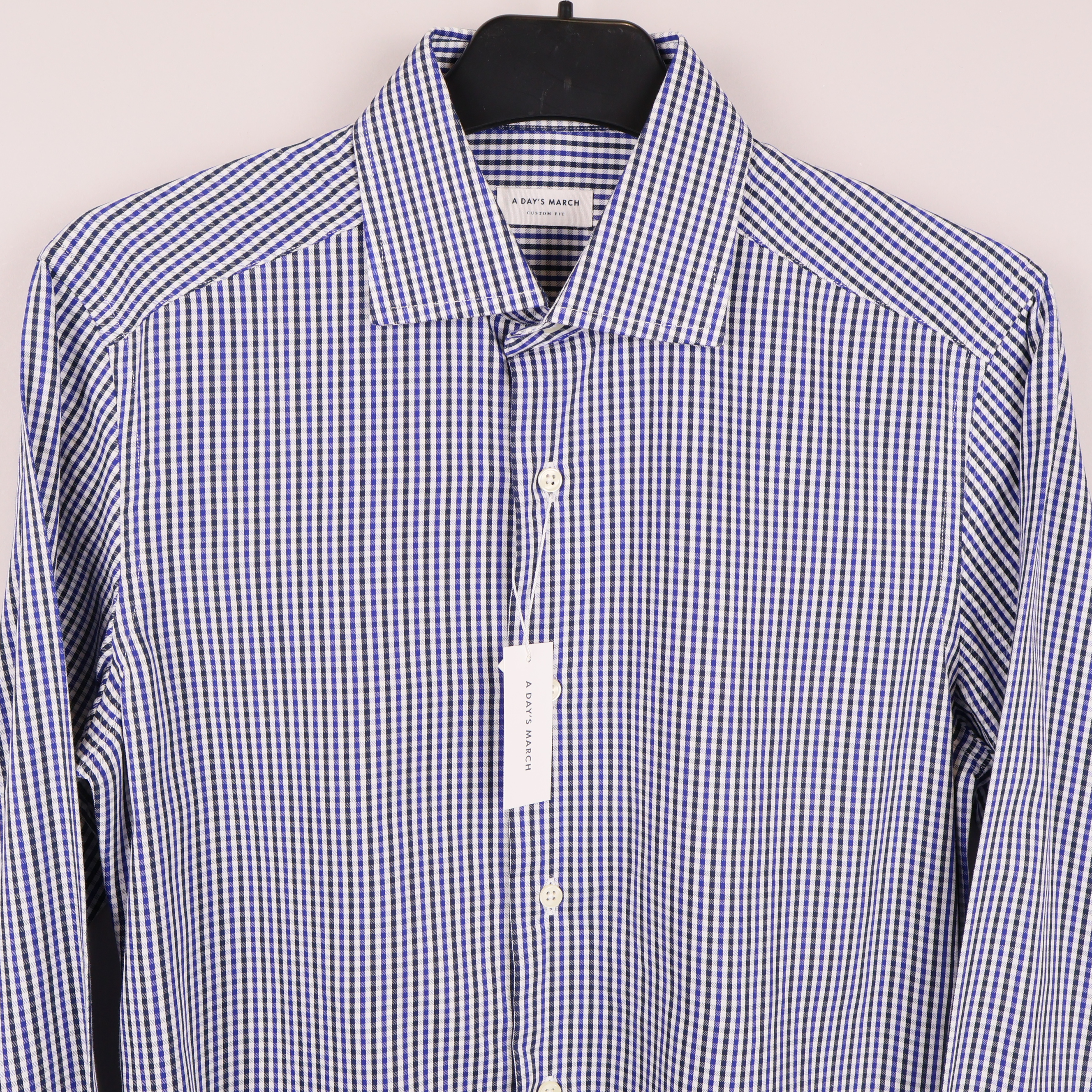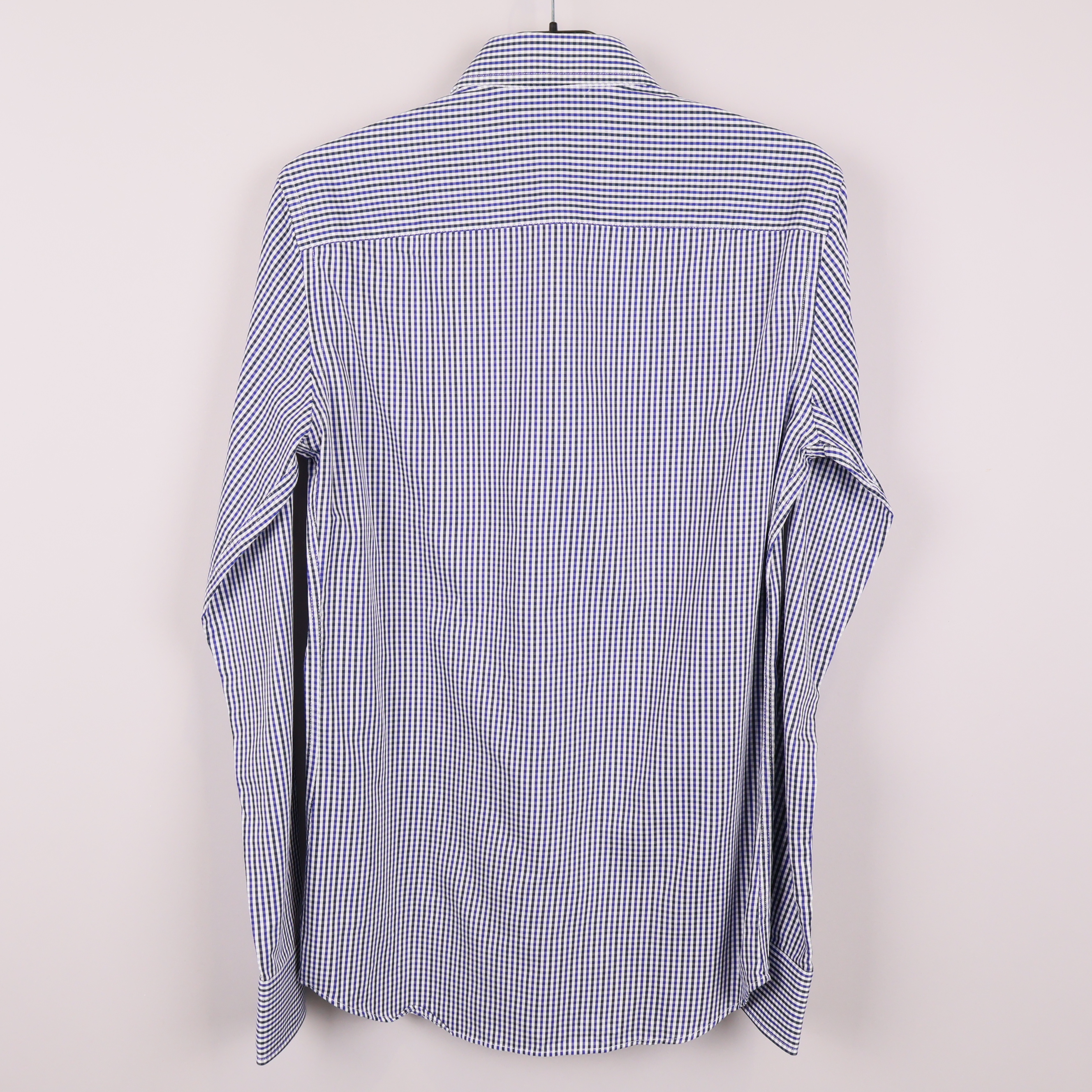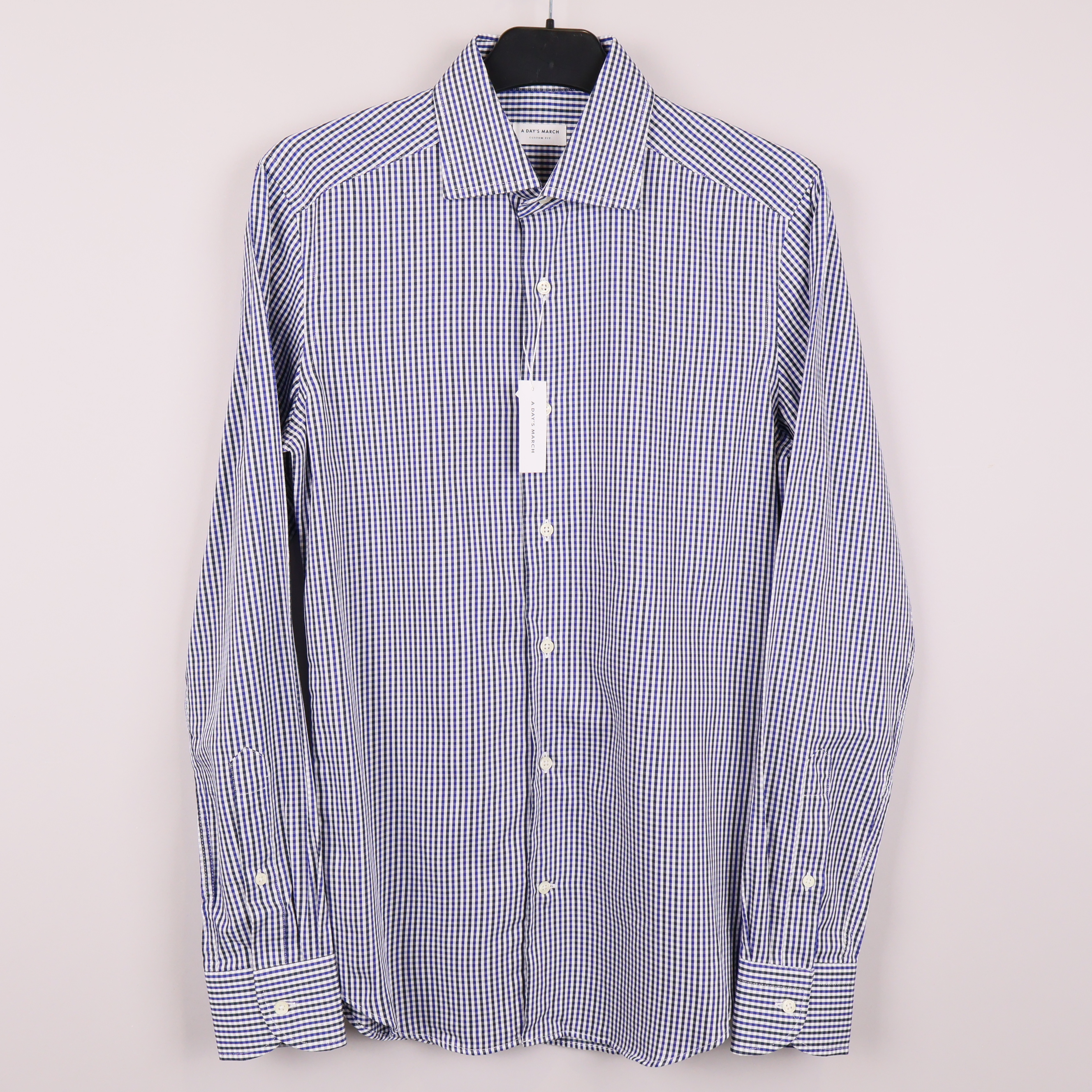 Klassisk skjorta med rutigt mönster i blått och vitt. Modellen har en stilren cutaway-krage och vita knappar som ger en tidlös känsla.